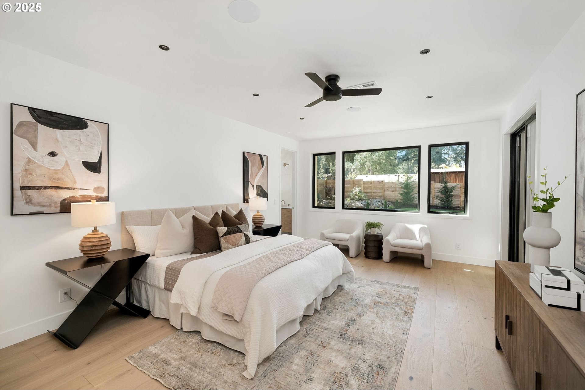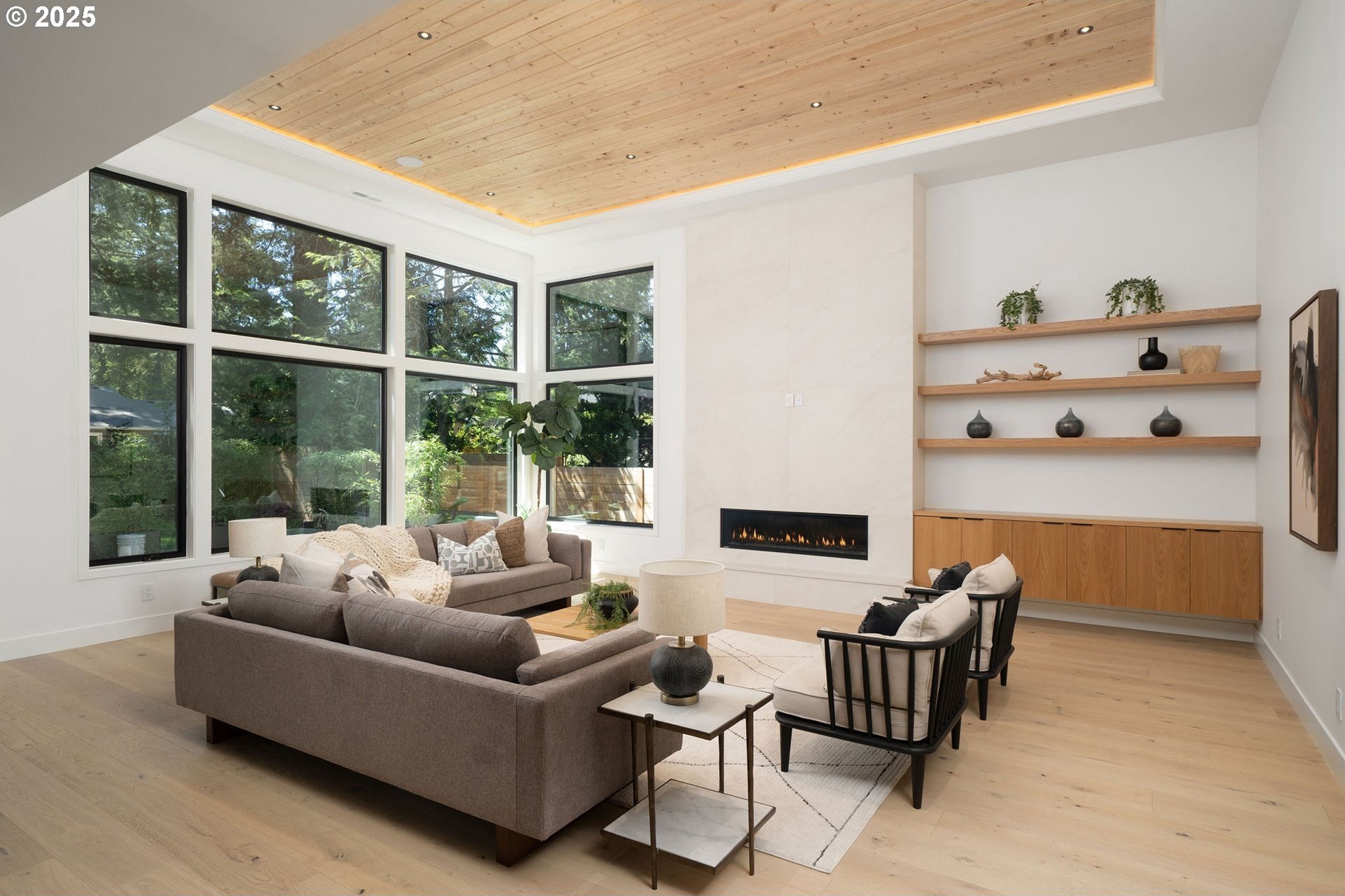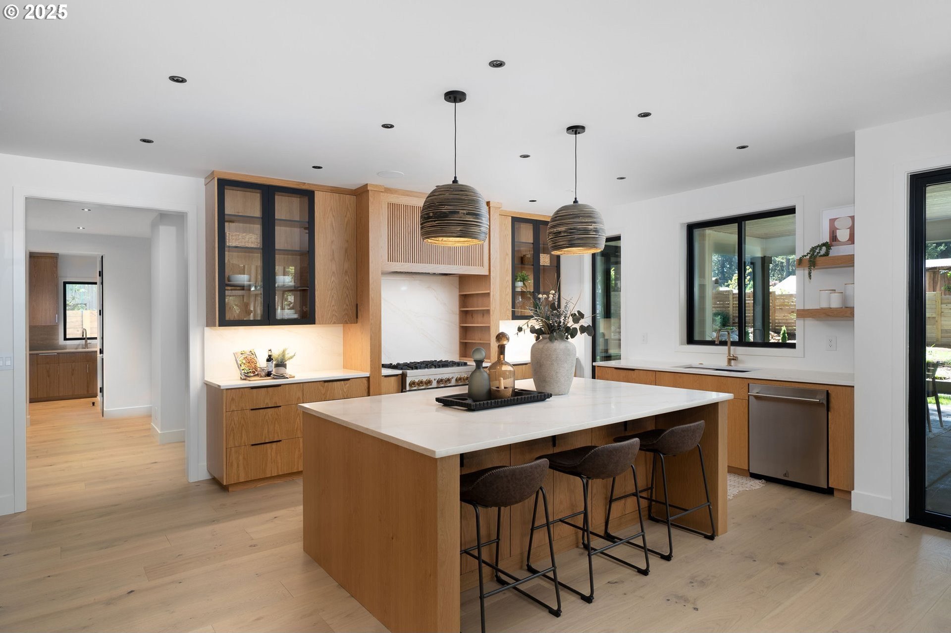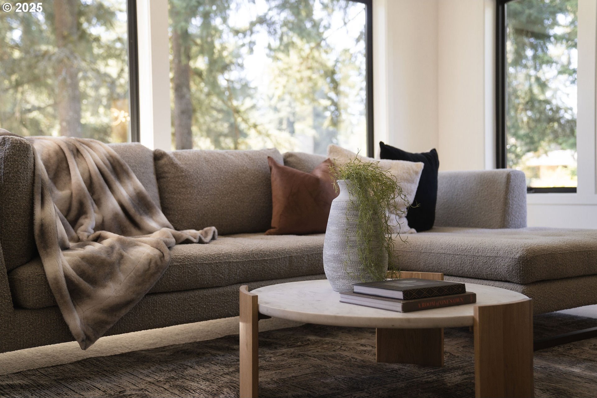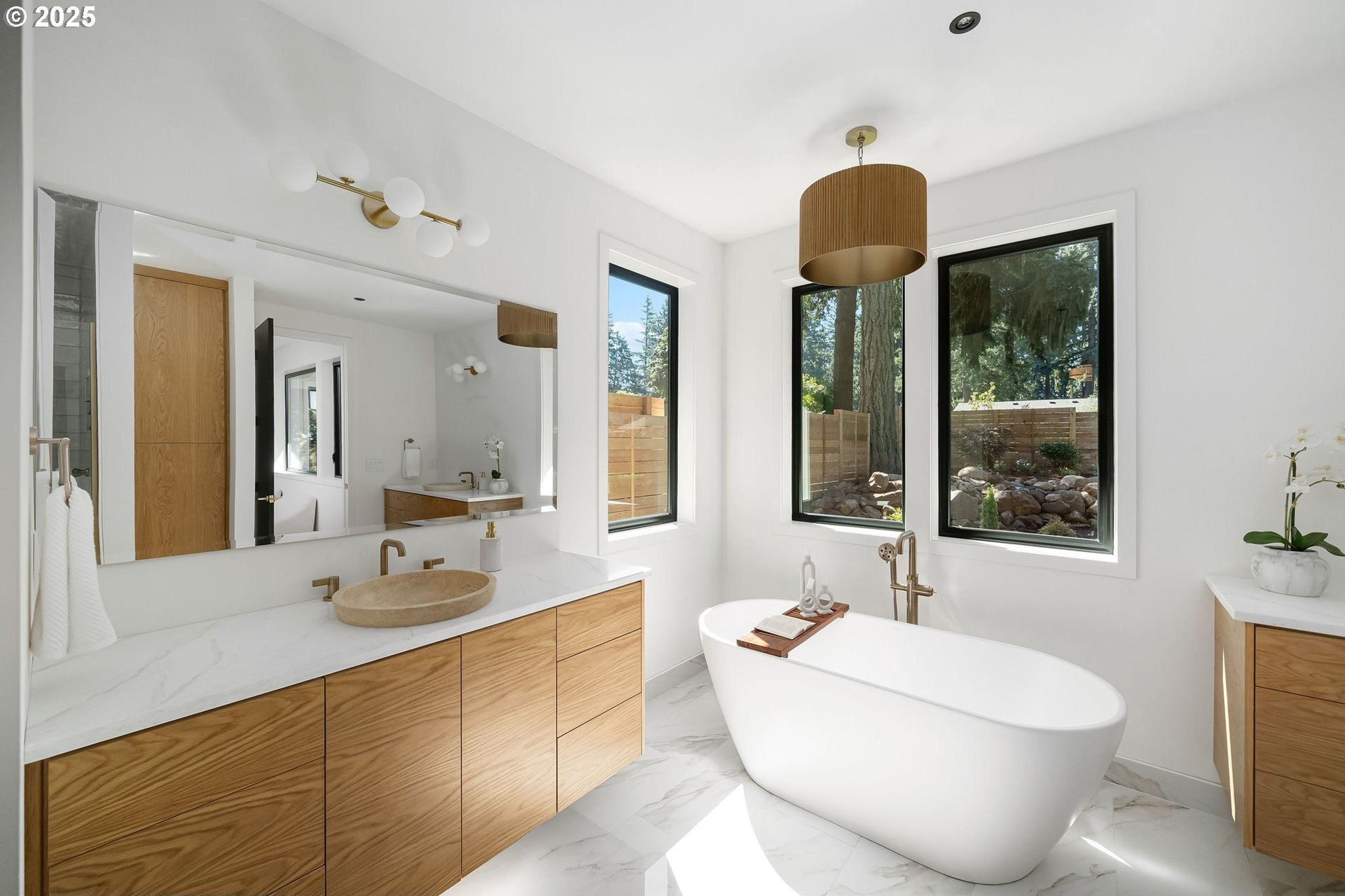 Anchored by mature trees in Lake Oswego’s Bryant neighborhood, 4340 Chapman Way is a newly constructed 4,100-square-foot home that embraces warmth, simplicity, and material integrity. The facade pairs black die sand–finish concrete with cedar soffits, ledger stone, and a custom pivot door scaled for quiet impact. Inside, wide-plank engineered hardwoods ground an open floor plan where natural light moves easily through curated spaces. Custom white oak cabinetry, quartz surfaces, and smooth wall finishes define the kitchen and great room, which connect seamlessly to a wine cellar and covered outdoor area with gas fireplace. The main level includes a generous primary suite, a second full bath, and a flexible office or guest bedroom. Every detail supports comfort: blown-in insulation, a 40-year roof, Navien tankless water heater, dual Bryant high-efficiency furnaces and A/C units, Cat6 wiring, and integrated ceiling audio. Glass and aluminum garage doors open to a fully irrigated landscape, illuminated by architectural lighting and supported by underground stormwater management. Just minutes from Bridgeport Village, Zupan’s, neighborhood parks, and trails, the home sits within one of Oregon’s top-rated school districts—with direct access I-5.