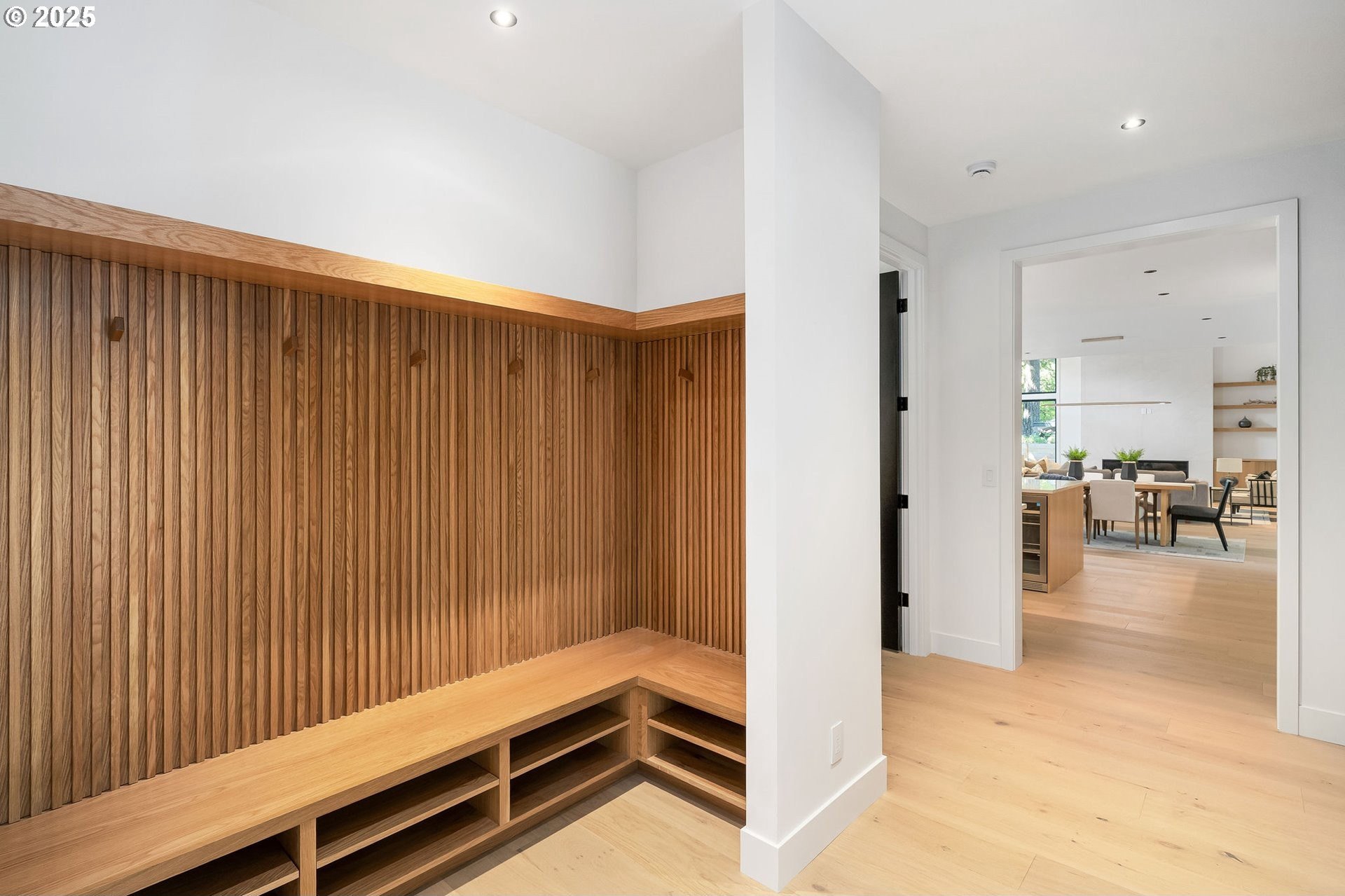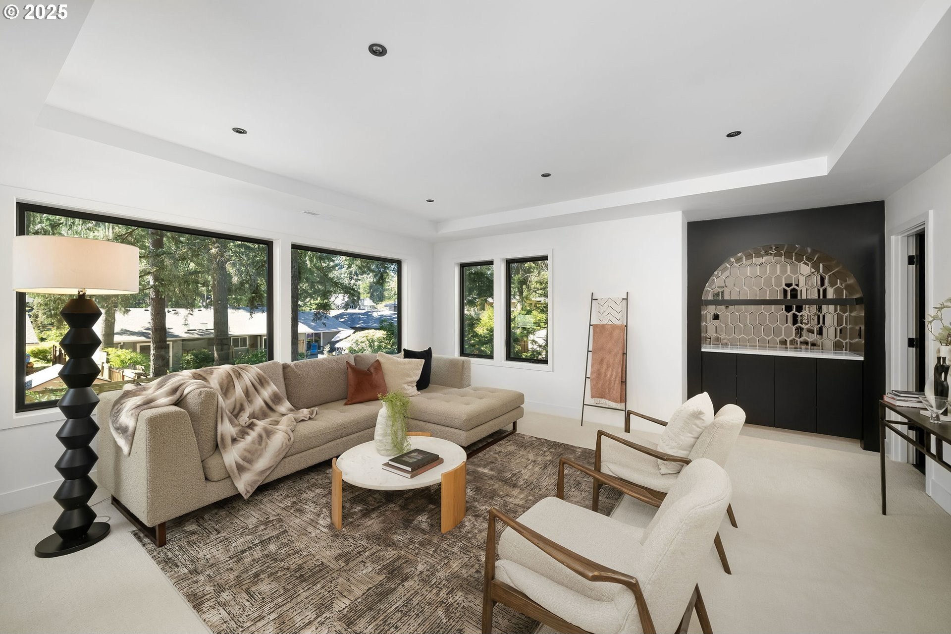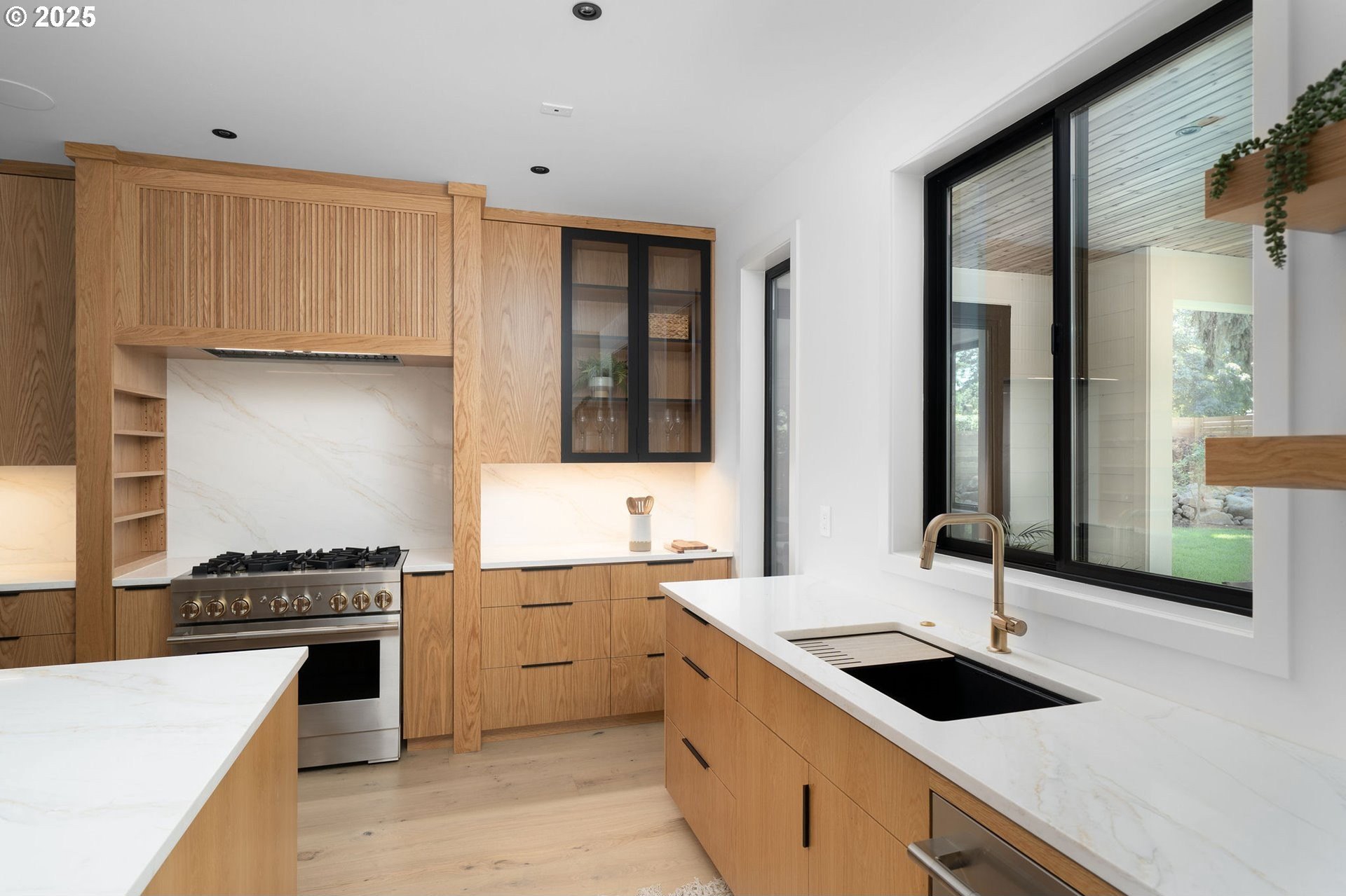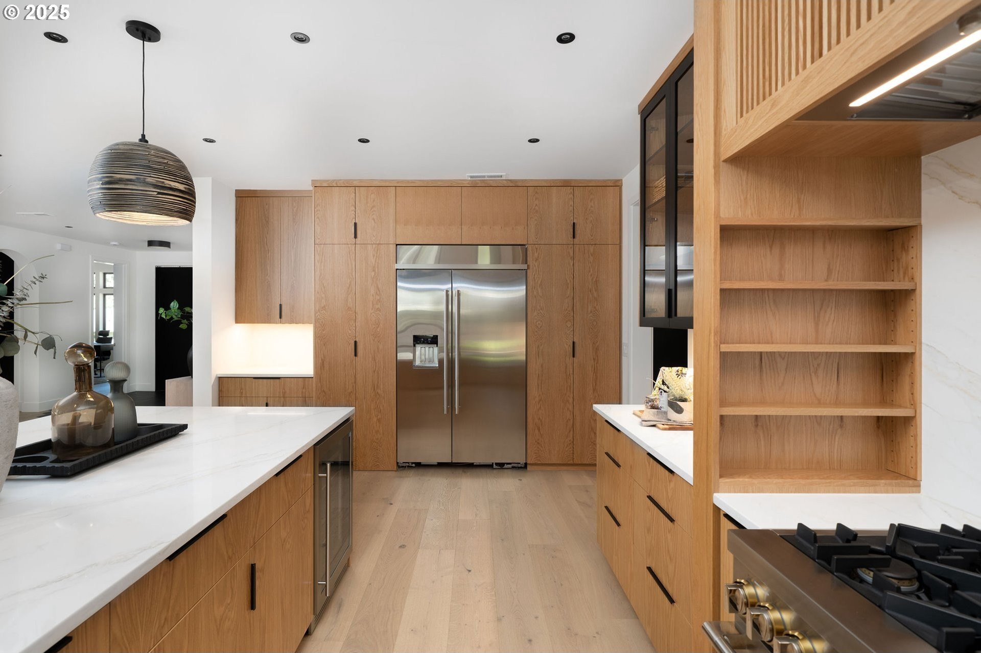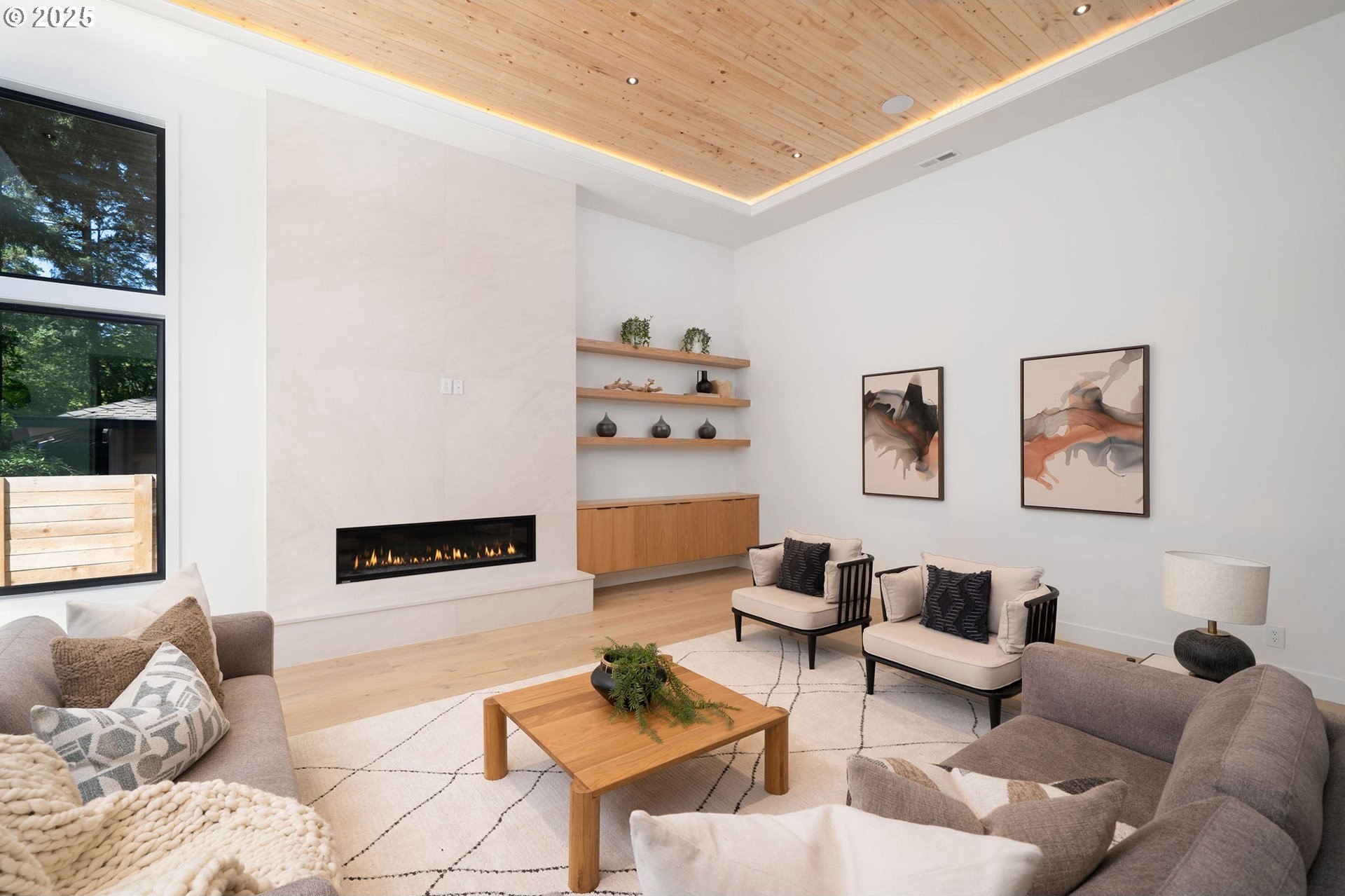Anchored by mature trees in Lake Oswego’s Bryant neighborhood, 4340 Chapman Way is a newly constructed 4,100-square-foot home that embraces warmth, simplicity, and material integrity. The facade pairs black die sand–finish concrete with cedar soffits, ledger stone, and a custom pivot door scaled for quiet impact. Inside, wide-plank engineered hardwoods ground an open floor plan where natural light moves easily through curated spaces. Custom white oak cabinetry, quartz surfaces, and smooth wall finishes define the kitchen and great room, which connect seamlessly to a wine cellar and covered outdoor area with gas fireplace. The main level includes a generous primary suite, a second full bath, and a flexible office or guest bedroom. Every detail supports comfort: blown-in insulation, a 40-year roof, Navien tankless water heater, dual Bryant high-efficiency furnaces and A/C units, Cat6 wiring, and integrated ceiling audio. Glass and aluminum garage doors open to a fully irrigated landscape, illuminated by architectural lighting and supported by underground stormwater management. Just minutes from Bridgeport Village, Zupan’s, neighborhood parks, and trails, the home sits within one of Oregon’s top-rated school districts—with direct access I-5.