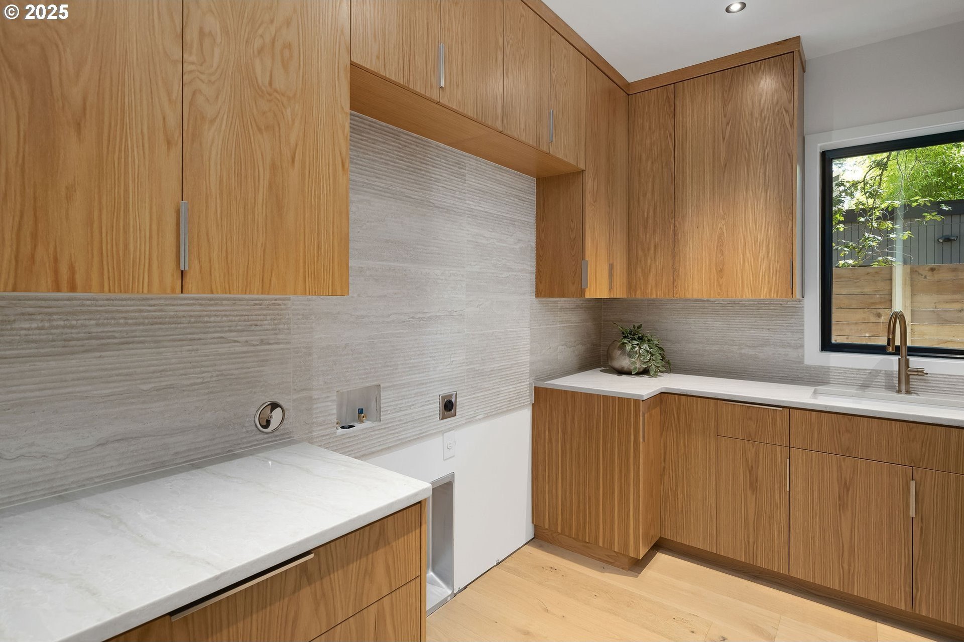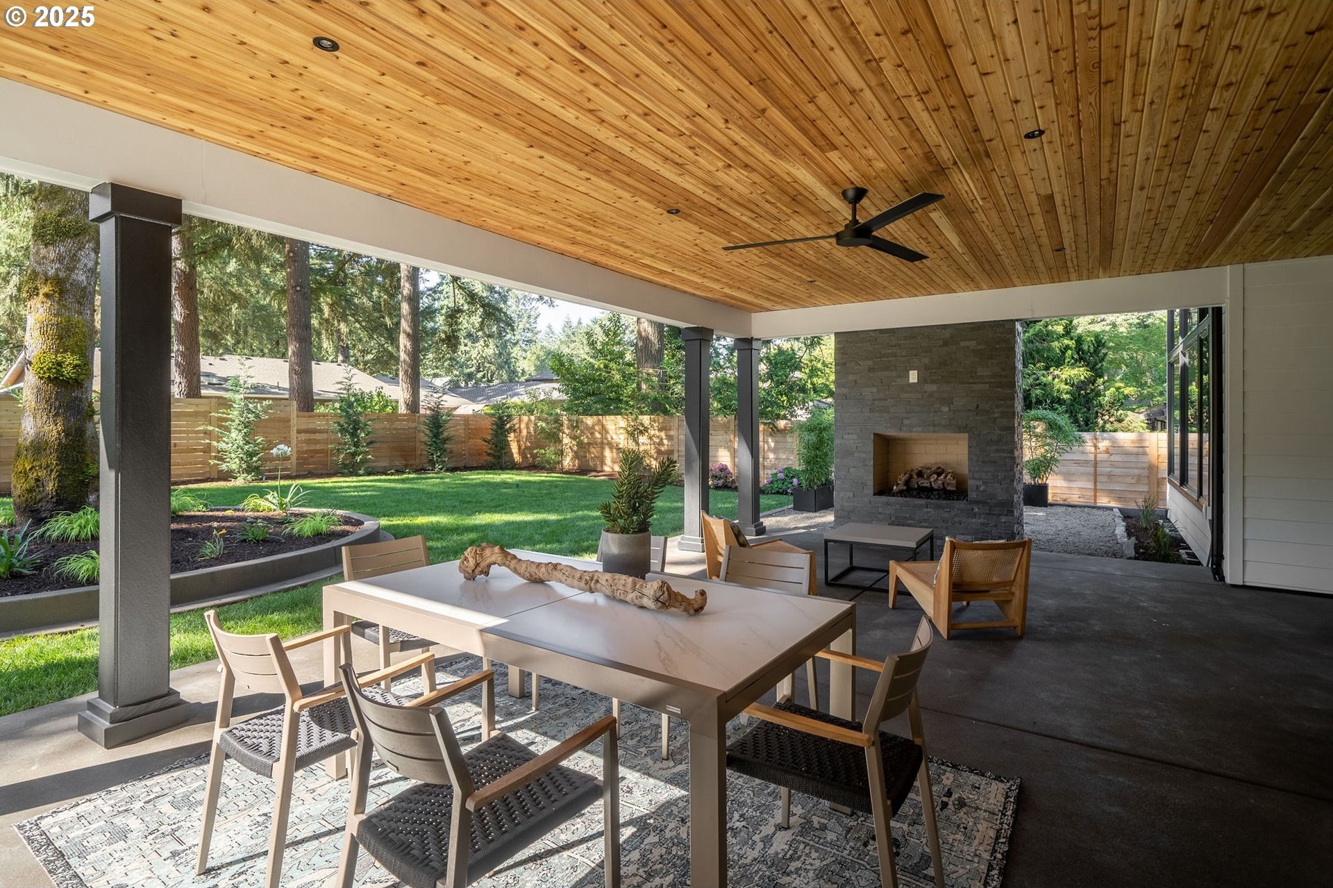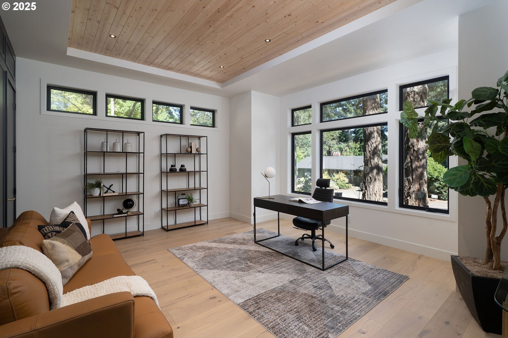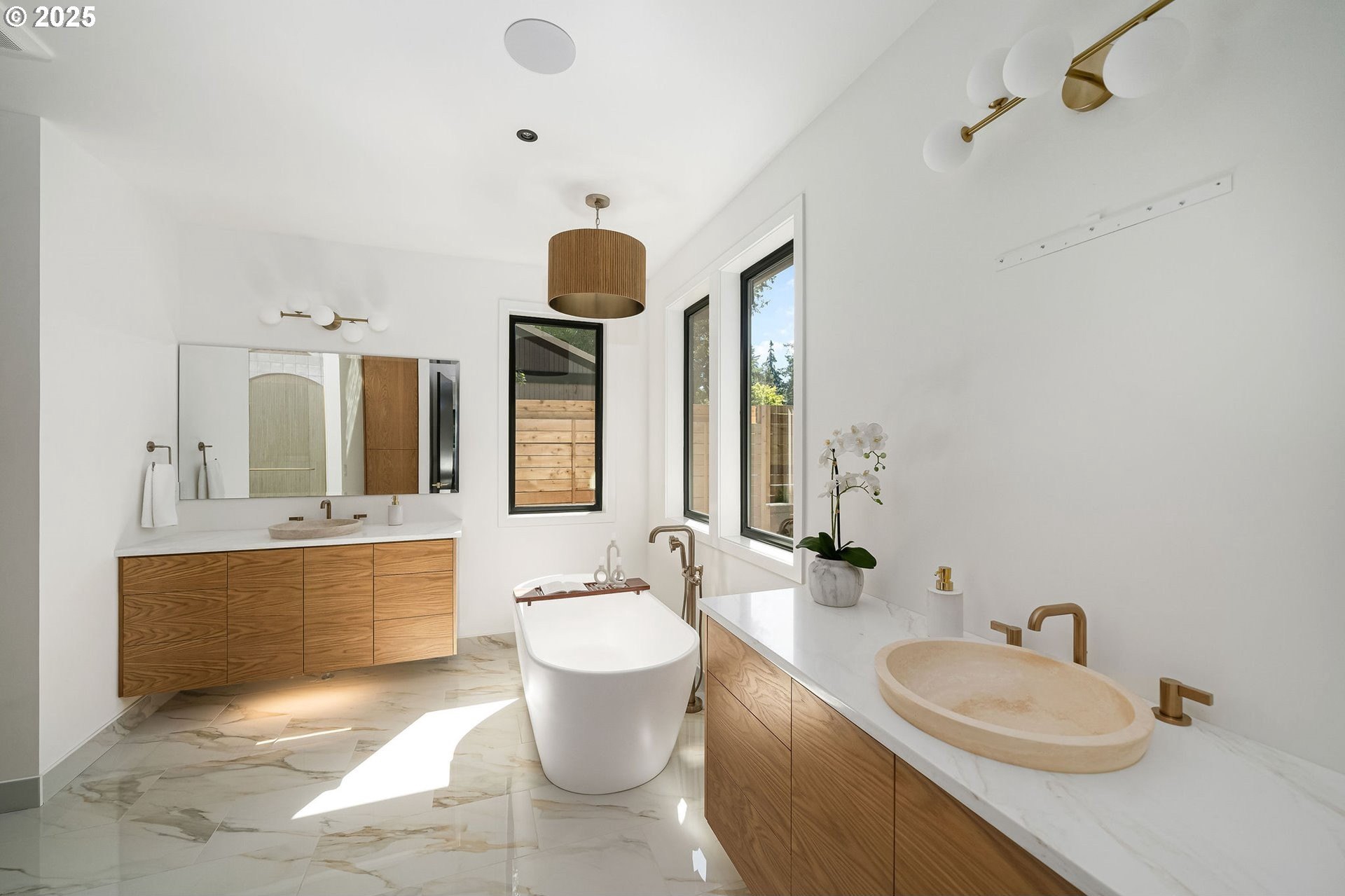 Anchored by mature trees in Lake Oswego’s Bryant neighborhood, 4340 Chapman Way is a newly constructed 4,100-square-foot home that embraces warmth, simplicity, and material integrity. The facade pairs black die sand–finish concrete with cedar soffits, ledger stone, and a custom pivot door scaled for quiet impact. Inside, wide-plank engineered hardwoods ground an open floor plan where natural light moves easily through curated spaces. Custom white oak cabinetry, quartz surfaces, and smooth wall finishes define the kitchen and great room, which connect seamlessly to a wine cellar and covered outdoor area with gas fireplace. The main level includes a generous primary suite, a second full bath, and a flexible office or guest bedroom. Every detail supports comfort: blown-in insulation, a 40-year roof, Navien tankless water heater, dual Bryant high-efficiency furnaces and A/C units, Cat6 wiring, and integrated ceiling audio. Glass and aluminum garage doors open to a fully irrigated landscape, illuminated by architectural lighting and supported by underground stormwater management. Just minutes from Bridgeport Village, Zupan’s, neighborhood parks, and trails, the home sits within one of Oregon’s top-rated school districts—with direct access I-5.