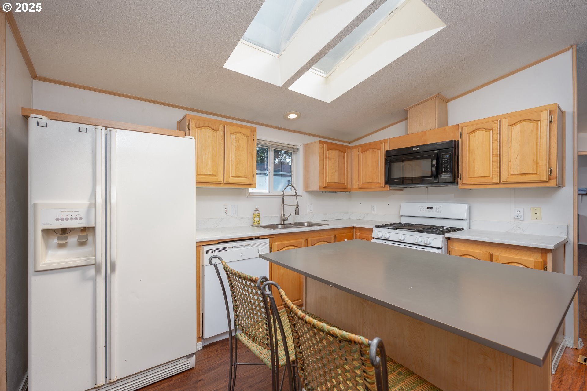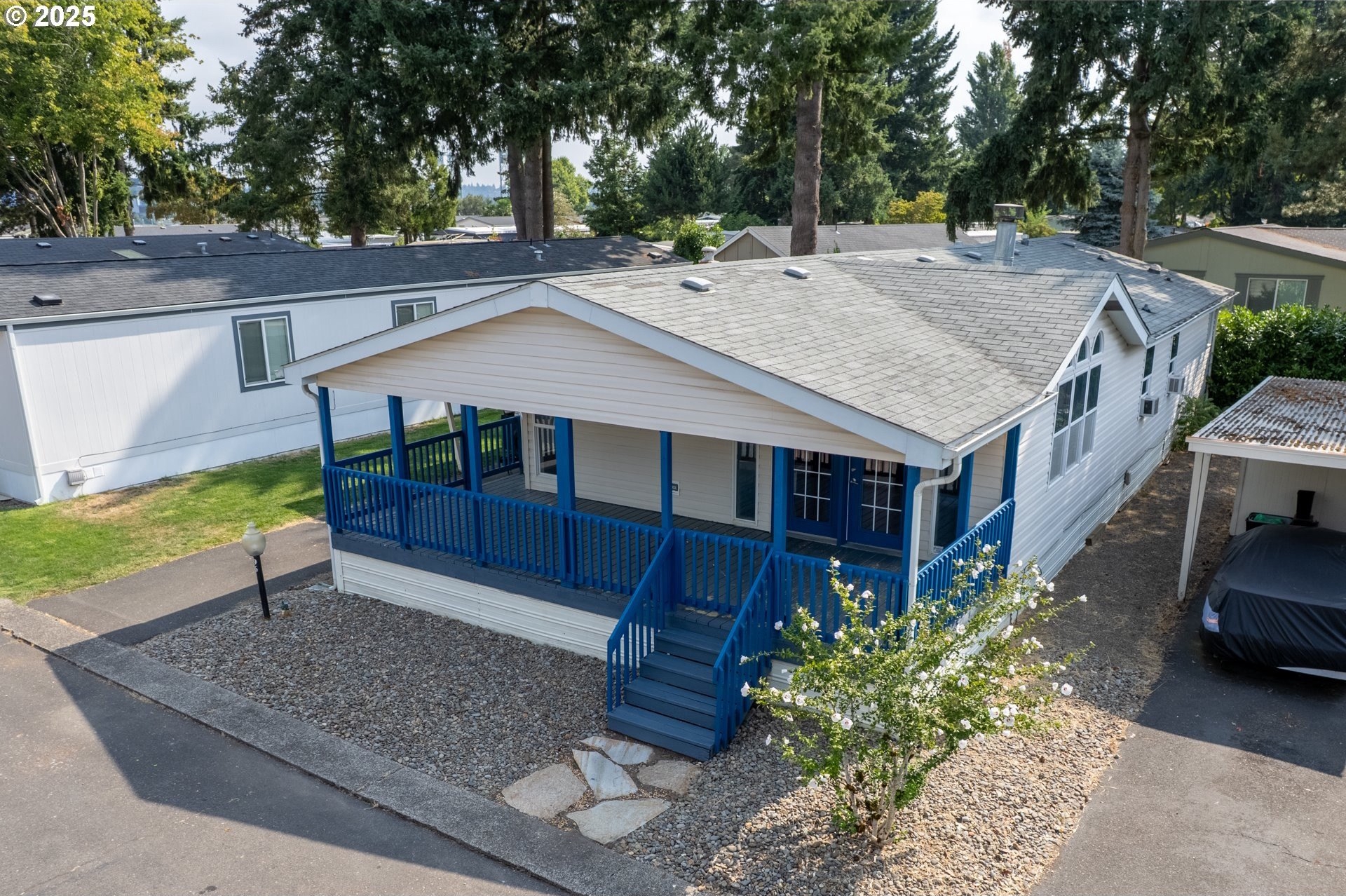 Welcome to this light-filled 3-bedroom, 2-bath home with an office, ideally located near the Columbia River with exceptional community amenities. The spacious kitchen features a breakfast nook, two skylights, a center island, and opens to both the dining and living rooms. Adjacent laundry room adds convenience. The living room offers abundant windows, great natural light, and a cozy wood-burning fireplace, with French doors leading to a large covered front deck—perfect for relaxing or entertaining.The versatile office includes a solar tube and porthole windows, while additional solar tubes in the hallway and primary bathroom bring in natural daylight throughout the home. Primary suite offers comfort and privacy and an ensuite bathroom. All appliances are included: washer/dryer, kitchen appliances, and window A/C units. Carport with shed provides extra storage.Community amenities include a fitness center, four pools (including a kid pool), playgrounds, clubhouses, basketball court, and a scenic nature trail. Bike and walking trails along the Columbia River are just steps away. Conveniently located near Jantzen Beach Shopping Center with Target, Home Depot, Best Buy, and exciting new retail and dining developments. Easy access to freeways, plus just across the bridge you’ll find The Waterfront Vancouver with trendy restaurants, boutique shops, and riverside parks. Monthly space rent is $966, includes garbage service.This home combines abundant natural light, comfortable living spaces, and an unbeatable location with resort-style amenities.
