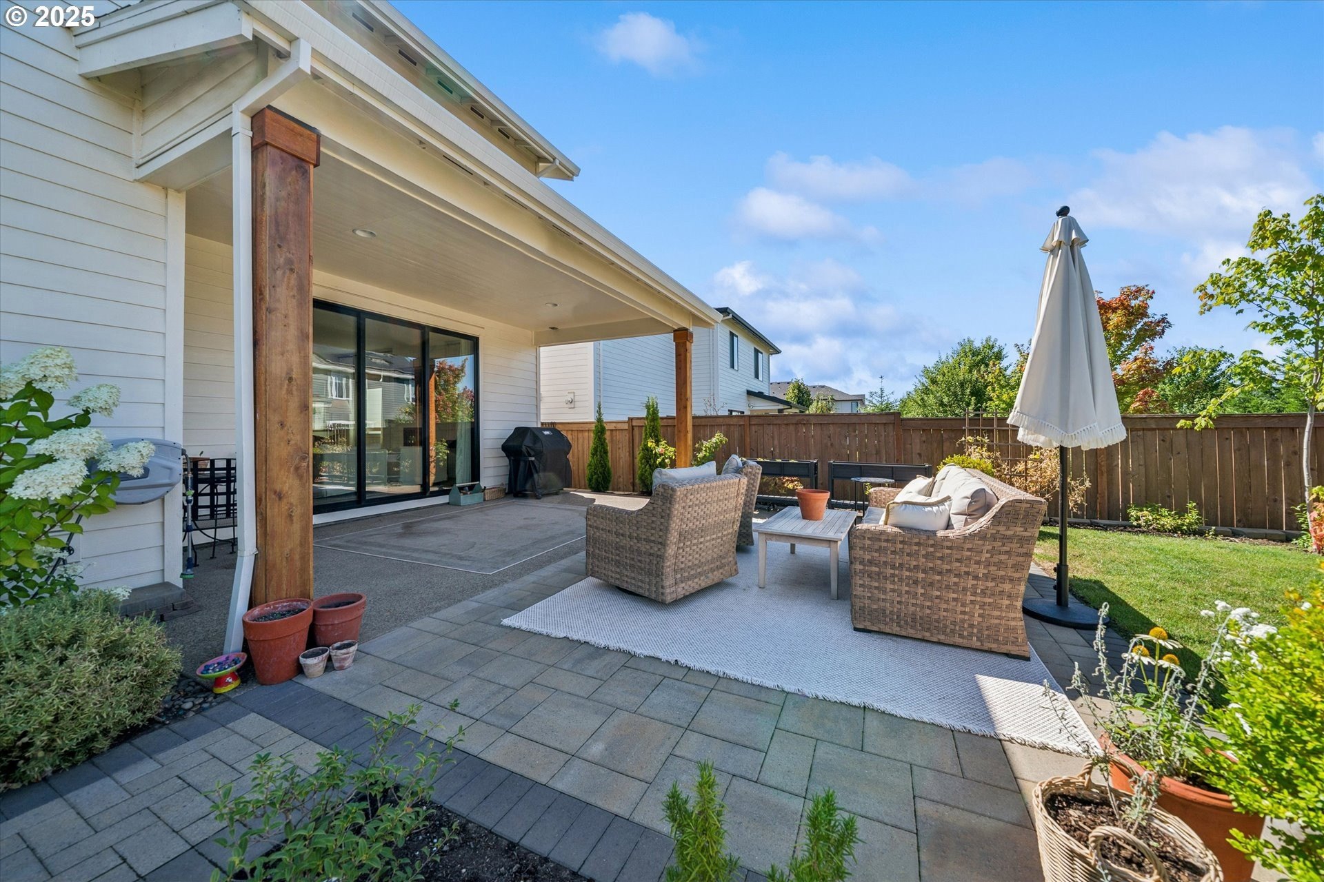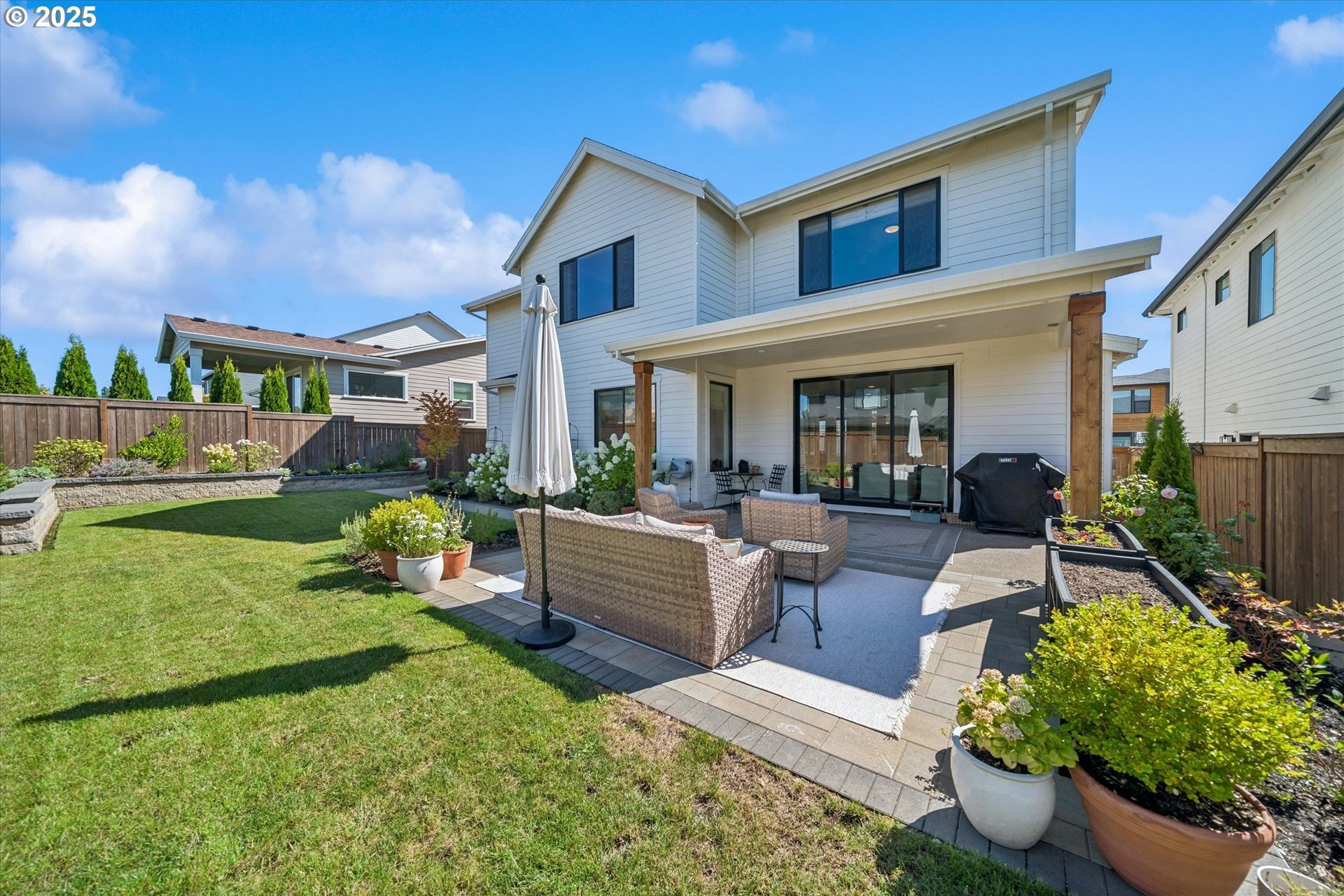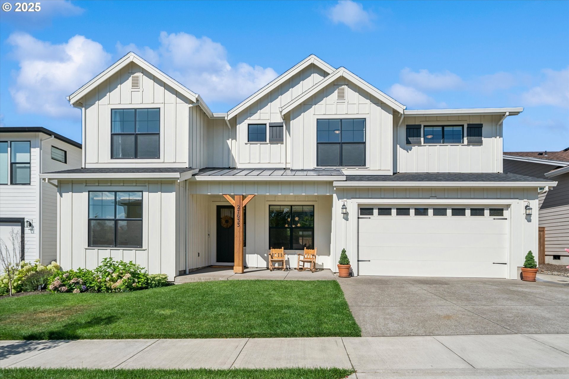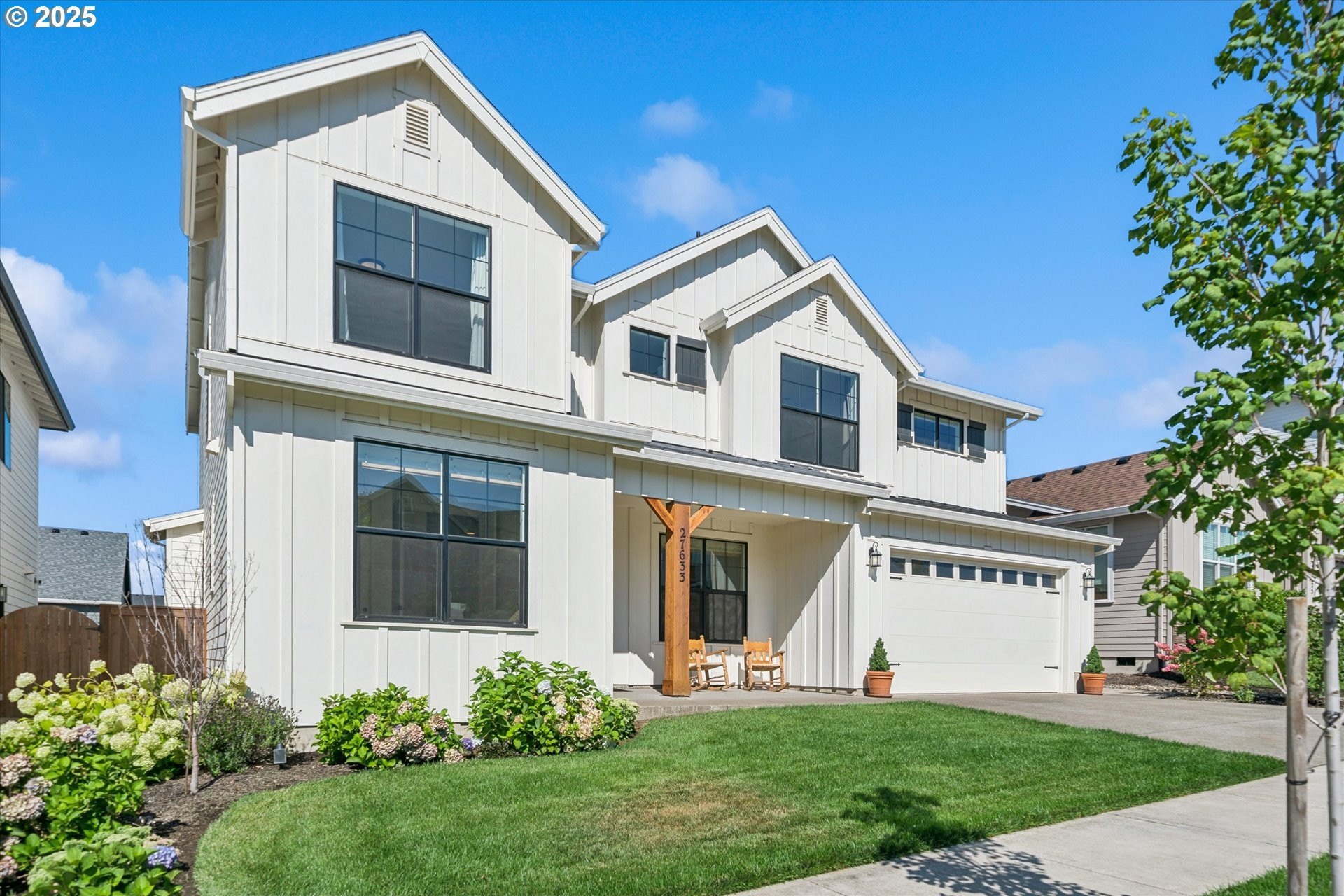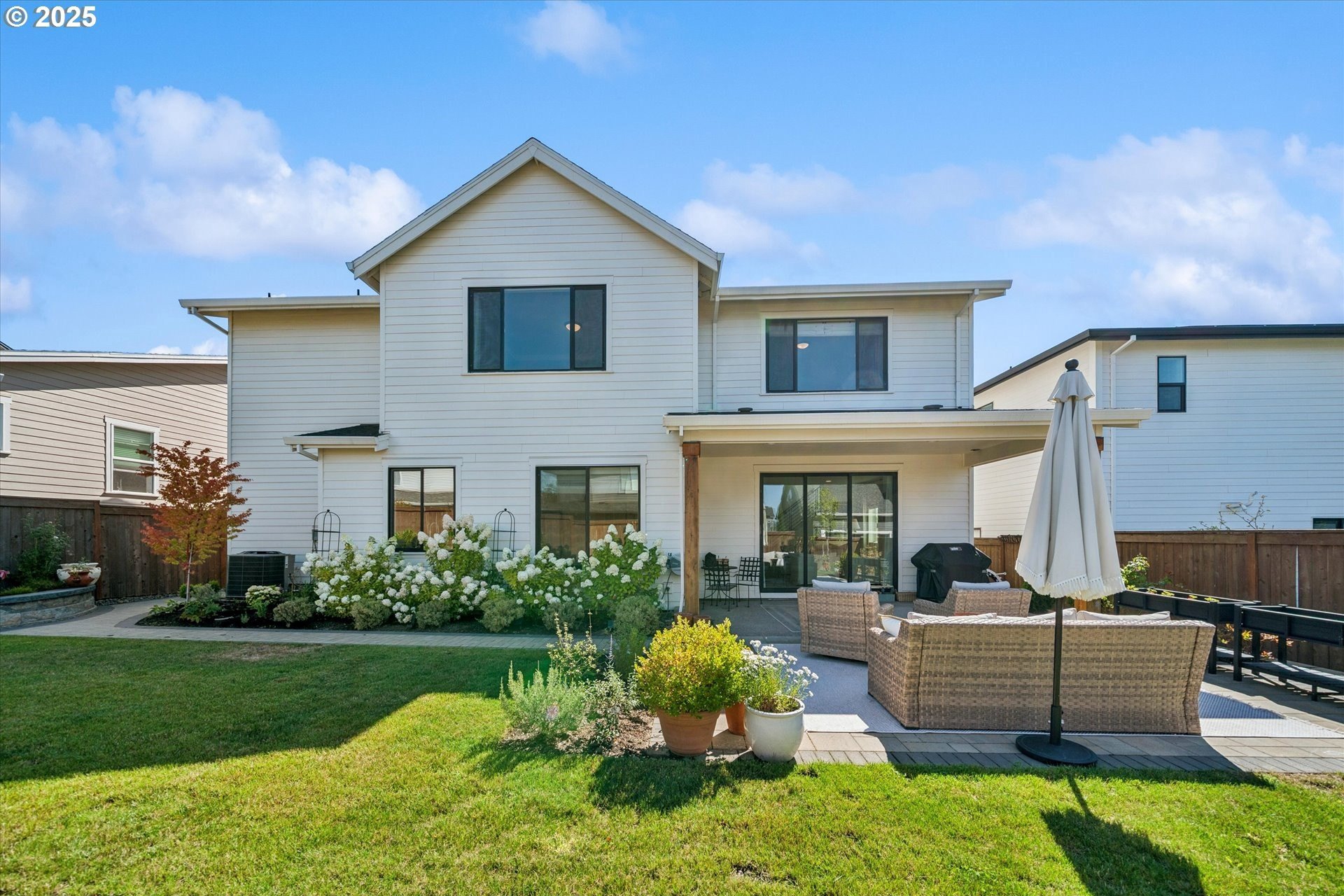 This stunning home blends modern sophistication, thoughtful design, and Northwest charm. An oversized entryway welcomes you into light-filled spaces with high ceilings and elegant wainscoting. The main level offers a formal dining room, a spacious office (or bedroom) with an adjacent full bath, and a bright great room with a gas fireplace. The gourmet kitchen features white shaker-style cabinetry, premium slab quartz countertops, top-of-the-line stainless steel appliances—including a 5-burner gas cooktop, dishwasher, and Broan hood—and a large pantry. An upgraded wall-to-wall slider opens to the expansive patio for true indoor/outdoor living. Upstairs, the serene primary suite offers a spa-inspired bath with a 5’x4’ tiled shower, freestanding soaking tub, and oversized walk-in closet. Four additional bedrooms, including a generous bonus room with a large walk-in closet, plus a well-appointed laundry room with cabinets and a sink, complete the upper level. Luxury finishes include upgraded LVP flooring throughout both levels (tile in master bath and laundry), slab quartz in all baths, central A/C, and EA Gold Certification. The fully landscaped yard has been extensively upgraded with a custom paver patio extension, leveled lawn, raised garden beds, landscape lighting, cedar fencing, irrigation, and a gas hookup for grilling. Located in a growing neighborhood with a brand new elementary school opening next fall and a large city park coming just blocks away, this home offers unmatched comfort, style, and convenience.