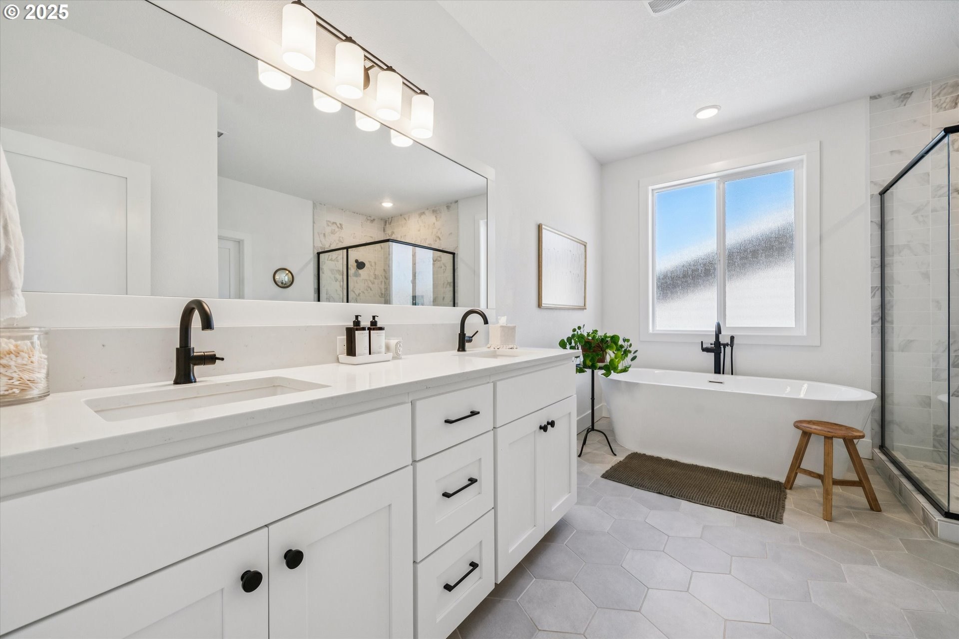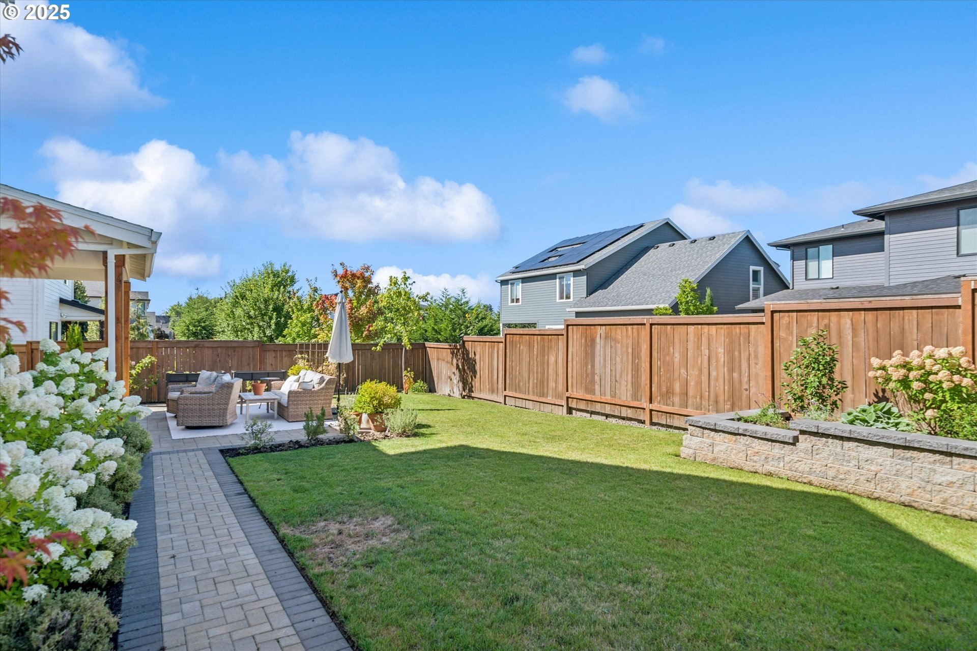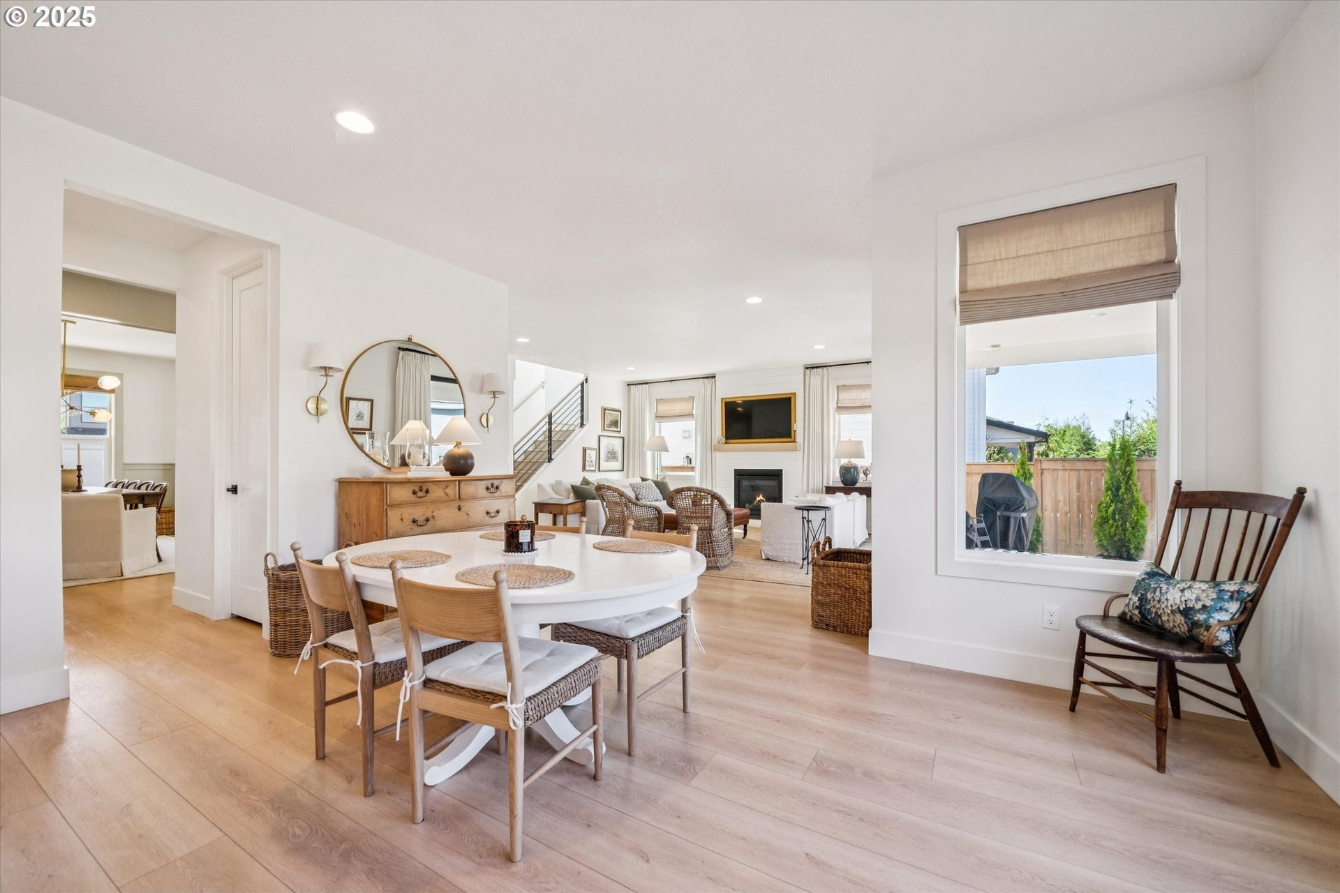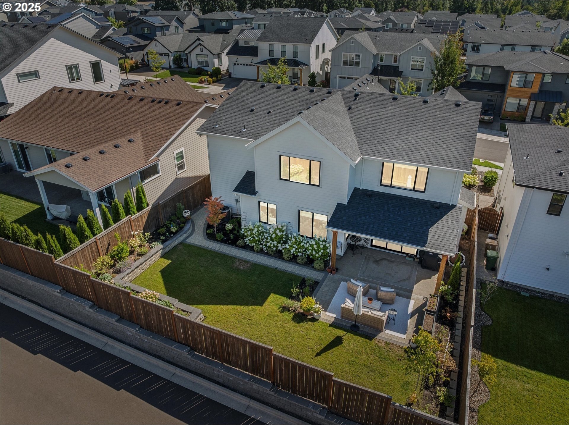 This stunning home blends modern sophistication, thoughtful design, and Northwest charm. An oversized entryway welcomes you into light-filled spaces with high ceilings and elegant wainscoting. The main level offers a formal dining room, a spacious office (or bedroom) with an adjacent full bath, and a bright great room with a gas fireplace. The gourmet kitchen features white shaker-style cabinetry, premium slab quartz countertops, top-of-the-line stainless steel appliances—including a 5-burner gas cooktop, dishwasher, and Broan hood—and a large pantry. An upgraded wall-to-wall slider opens to the expansive patio for true indoor/outdoor living. Upstairs, the serene primary suite offers a spa-inspired bath with a 5’x4’ tiled shower, freestanding soaking tub, and oversized walk-in closet. Four additional bedrooms, including a generous bonus room with a large walk-in closet, plus a well-appointed laundry room with cabinets and a sink, complete the upper level. Luxury finishes include upgraded LVP flooring throughout both levels (tile in master bath and laundry), slab quartz in all baths, central A/C, and EA Gold Certification. The fully landscaped yard has been extensively upgraded with a custom paver patio extension, leveled lawn, raised garden beds, landscape lighting, cedar fencing, irrigation, and a gas hookup for grilling. Located in a growing neighborhood with a brand new elementary school opening next fall and a large city park coming just blocks away, this home offers unmatched comfort, style, and convenience.