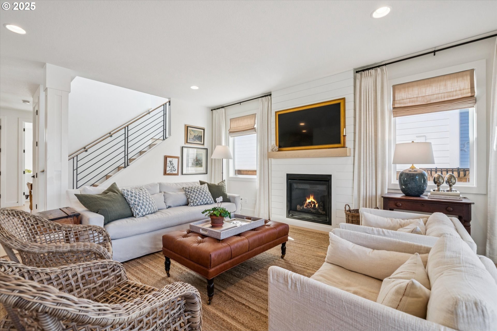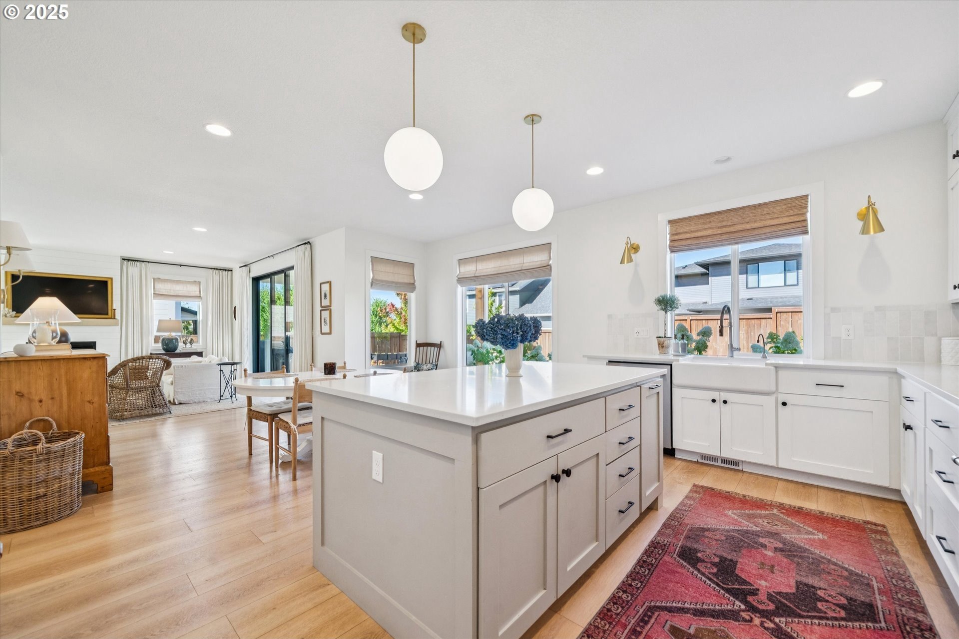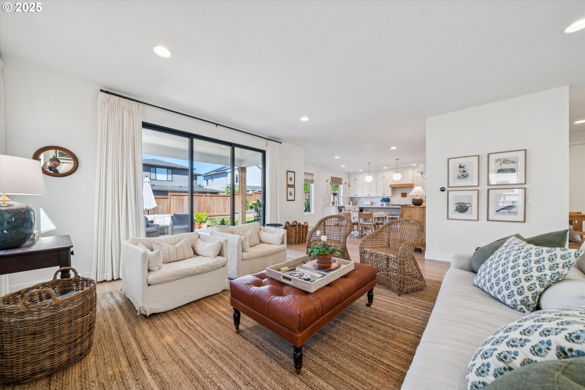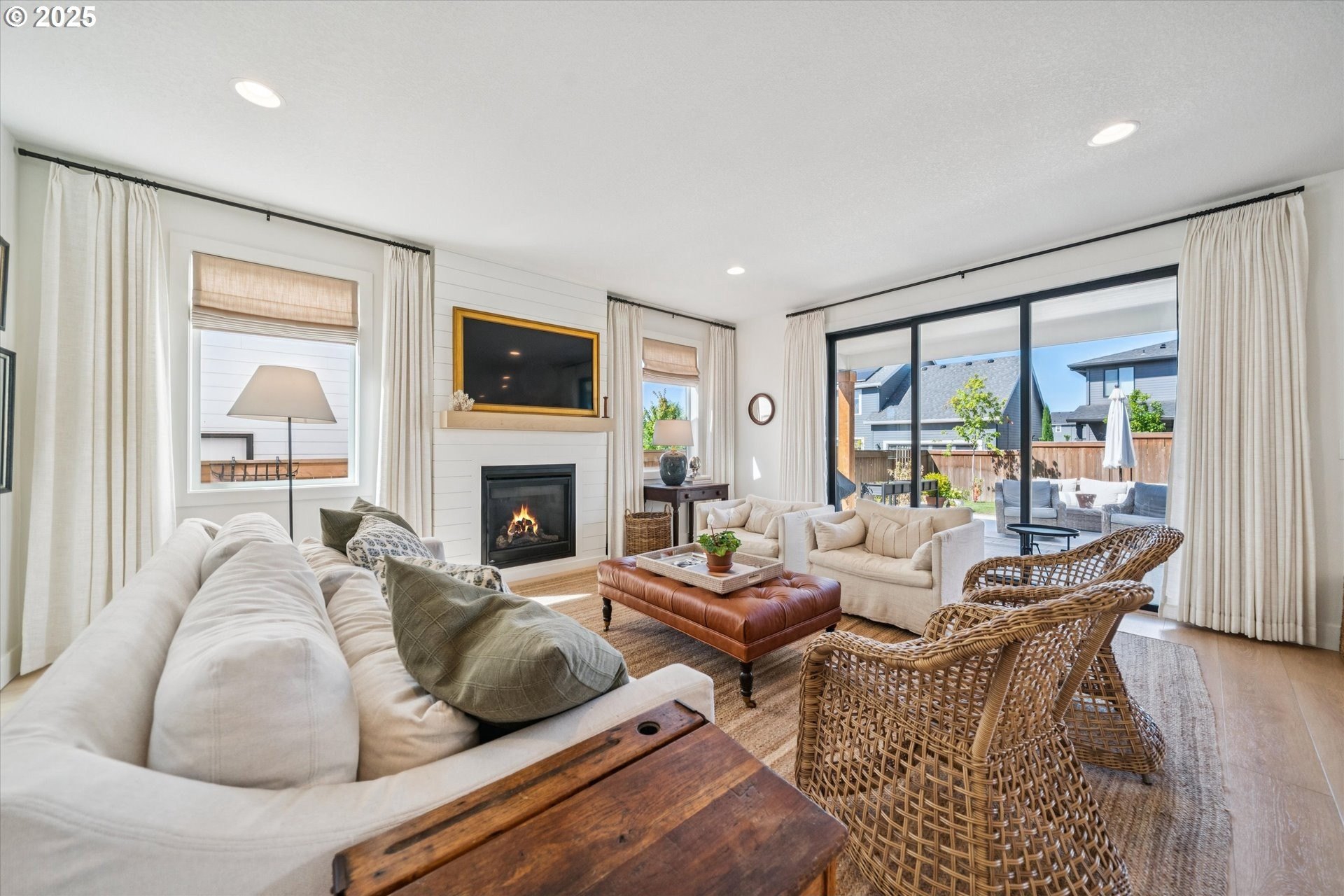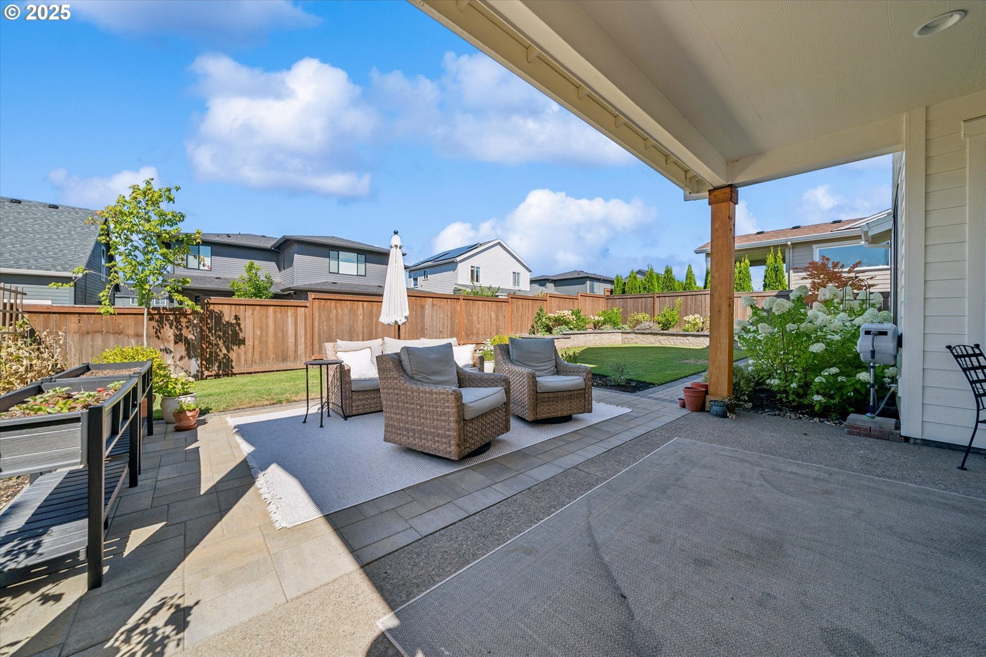 This stunning home blends modern sophistication, thoughtful design, and Northwest charm. An oversized entryway welcomes you into light-filled spaces with high ceilings and elegant wainscoting. The main level offers a formal dining room, a spacious office (or bedroom) with an adjacent full bath, and a bright great room with a gas fireplace. The gourmet kitchen features white shaker-style cabinetry, premium slab quartz countertops, top-of-the-line stainless steel appliances—including a 5-burner gas cooktop, dishwasher, and Broan hood—and a large pantry. An upgraded wall-to-wall slider opens to the expansive patio for true indoor/outdoor living. Upstairs, the serene primary suite offers a spa-inspired bath with a 5’x4’ tiled shower, freestanding soaking tub, and oversized walk-in closet. Four additional bedrooms, including a generous bonus room with a large walk-in closet, plus a well-appointed laundry room with cabinets and a sink, complete the upper level. Luxury finishes include upgraded LVP flooring throughout both levels (tile in master bath and laundry), slab quartz in all baths, central A/C, and EA Gold Certification. The fully landscaped yard has been extensively upgraded with a custom paver patio extension, leveled lawn, raised garden beds, landscape lighting, cedar fencing, irrigation, and a gas hookup for grilling. Located in a growing neighborhood with a brand new elementary school opening next fall and a large city park coming just blocks away, this home offers unmatched comfort, style, and convenience.