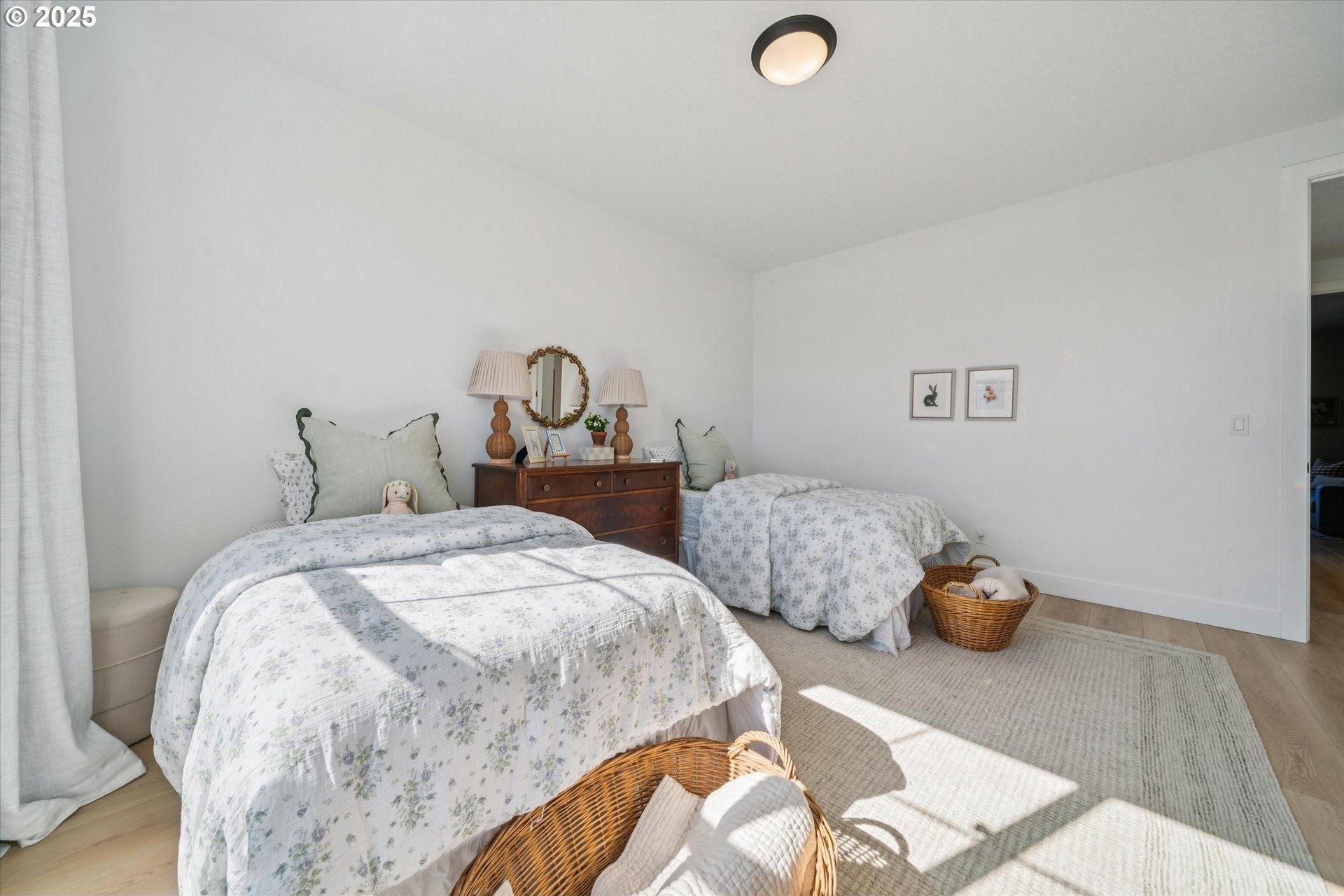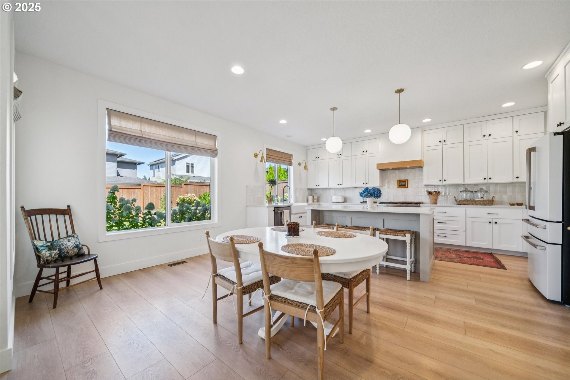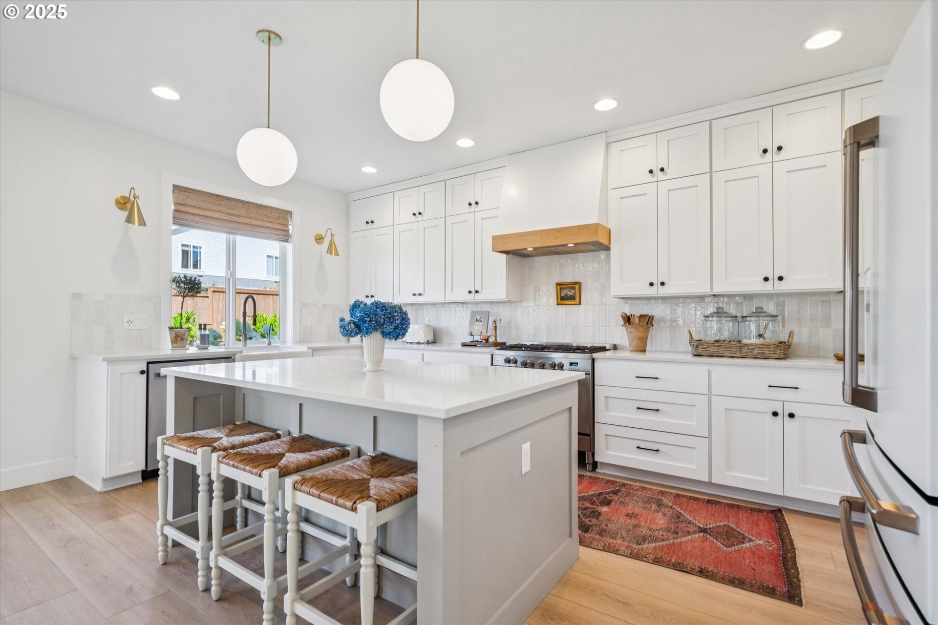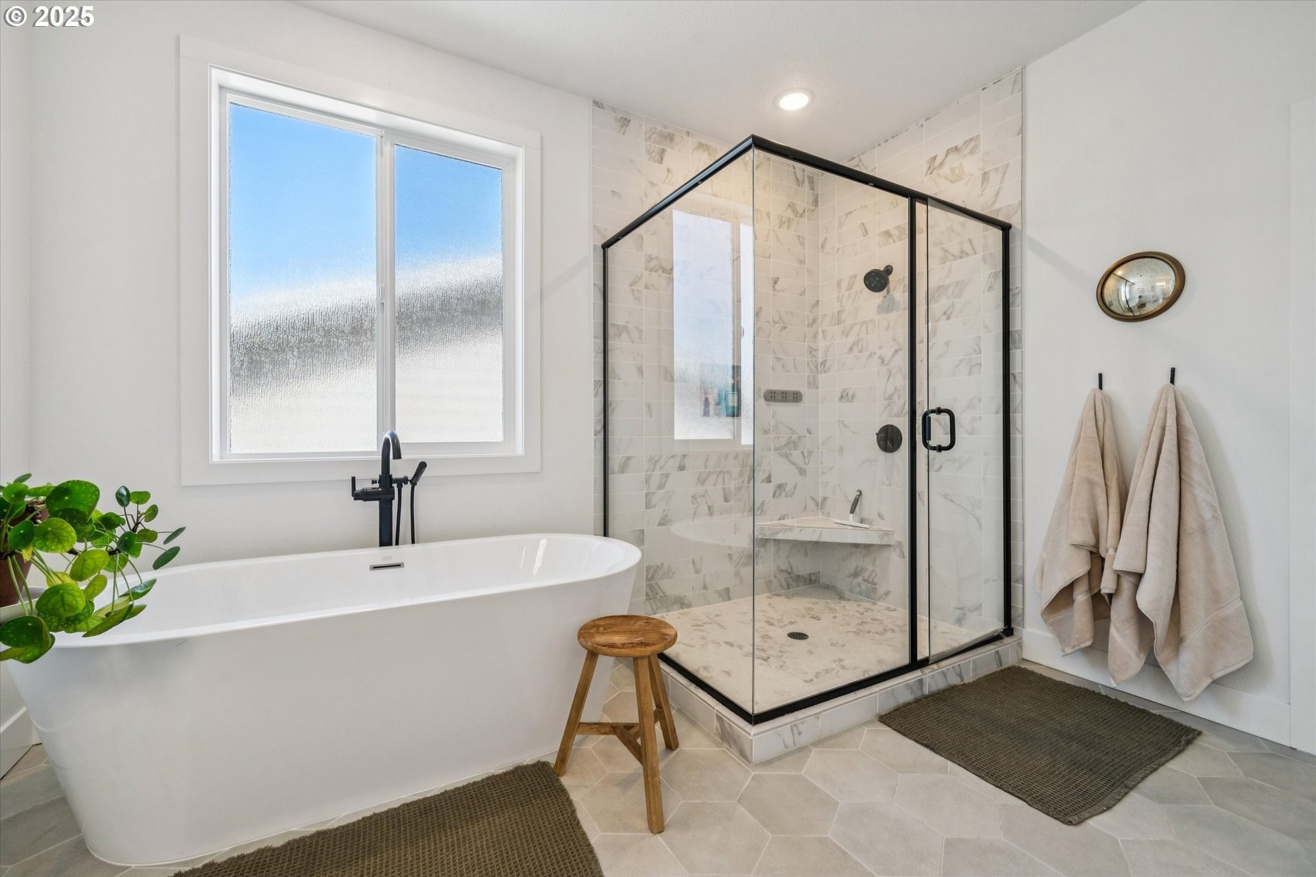 This stunning home blends modern sophistication, thoughtful design, and Northwest charm. An oversized entryway welcomes you into light-filled spaces with high ceilings and elegant wainscoting. The main level offers a formal dining room, a spacious office (or bedroom) with an adjacent full bath, and a bright great room with a gas fireplace. The gourmet kitchen features white shaker-style cabinetry, premium slab quartz countertops, top-of-the-line stainless steel appliances—including a 5-burner gas cooktop, dishwasher, and Broan hood—and a large pantry. An upgraded wall-to-wall slider opens to the expansive patio for true indoor/outdoor living. Upstairs, the serene primary suite offers a spa-inspired bath with a 5’x4’ tiled shower, freestanding soaking tub, and oversized walk-in closet. Four additional bedrooms, including a generous bonus room with a large walk-in closet, plus a well-appointed laundry room with cabinets and a sink, complete the upper level. Luxury finishes include upgraded LVP flooring throughout both levels (tile in master bath and laundry), slab quartz in all baths, central A/C, and EA Gold Certification. The fully landscaped yard has been extensively upgraded with a custom paver patio extension, leveled lawn, raised garden beds, landscape lighting, cedar fencing, irrigation, and a gas hookup for grilling. Located in a growing neighborhood with a brand new elementary school opening next fall and a large city park coming just blocks away, this home offers unmatched comfort, style, and convenience.