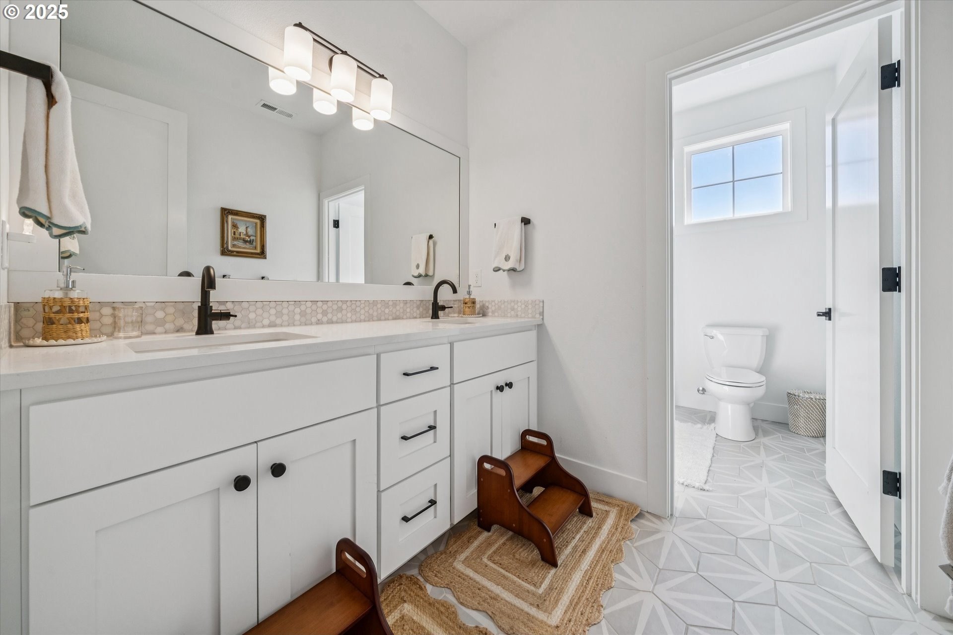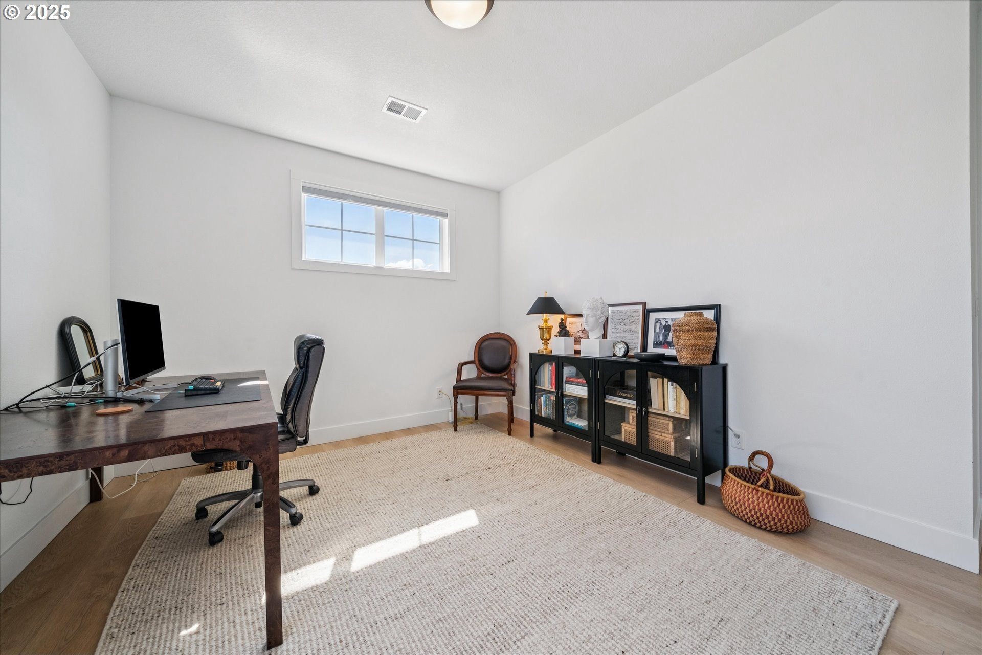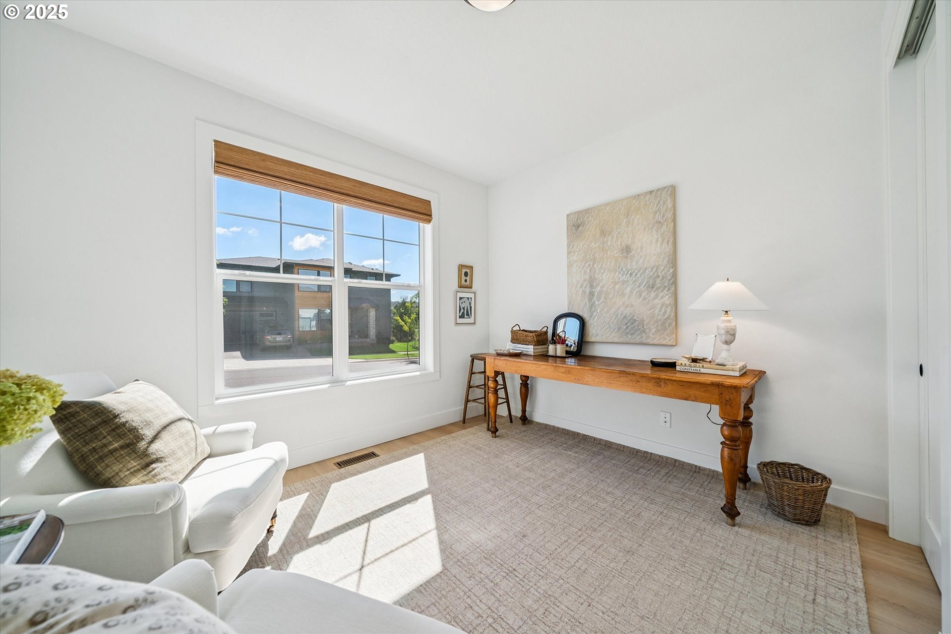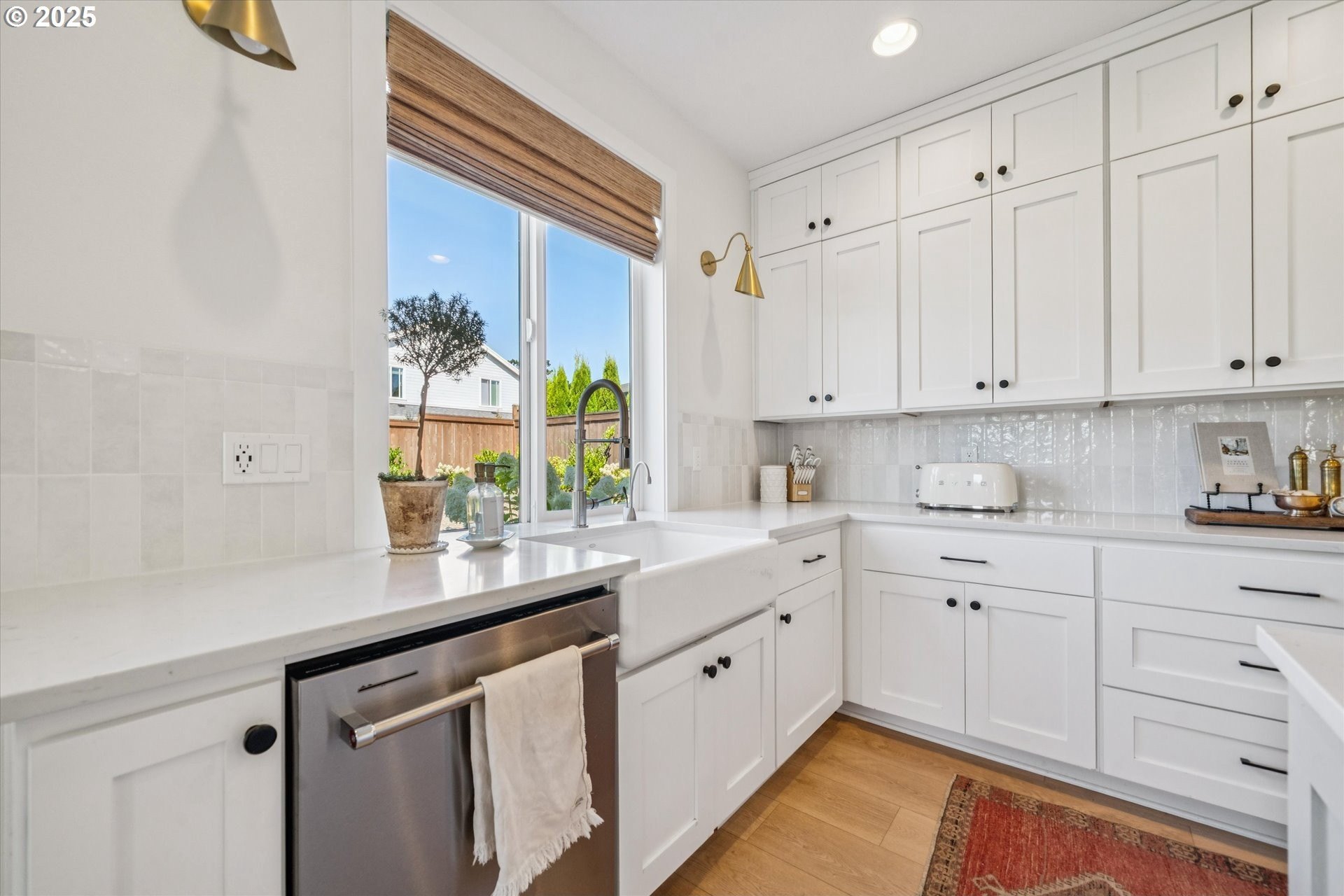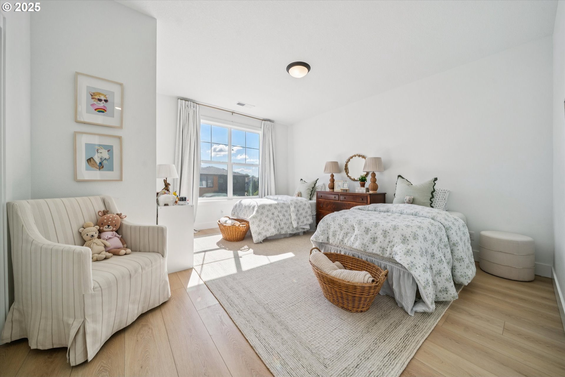 This stunning home blends modern sophistication, thoughtful design, and Northwest charm. An oversized entryway welcomes you into light-filled spaces with high ceilings and elegant wainscoting. The main level offers a formal dining room, a spacious office (or bedroom) with an adjacent full bath, and a bright great room with a gas fireplace. The gourmet kitchen features white shaker-style cabinetry, premium slab quartz countertops, top-of-the-line stainless steel appliances—including a 5-burner gas cooktop, dishwasher, and Broan hood—and a large pantry. An upgraded wall-to-wall slider opens to the expansive patio for true indoor/outdoor living. Upstairs, the serene primary suite offers a spa-inspired bath with a 5’x4’ tiled shower, freestanding soaking tub, and oversized walk-in closet. Four additional bedrooms, including a generous bonus room with a large walk-in closet, plus a well-appointed laundry room with cabinets and a sink, complete the upper level. Luxury finishes include upgraded LVP flooring throughout both levels (tile in master bath and laundry), slab quartz in all baths, central A/C, and EA Gold Certification. The fully landscaped yard has been extensively upgraded with a custom paver patio extension, leveled lawn, raised garden beds, landscape lighting, cedar fencing, irrigation, and a gas hookup for grilling. Located in a growing neighborhood with a brand new elementary school opening next fall and a large city park coming just blocks away, this home offers unmatched comfort, style, and convenience.