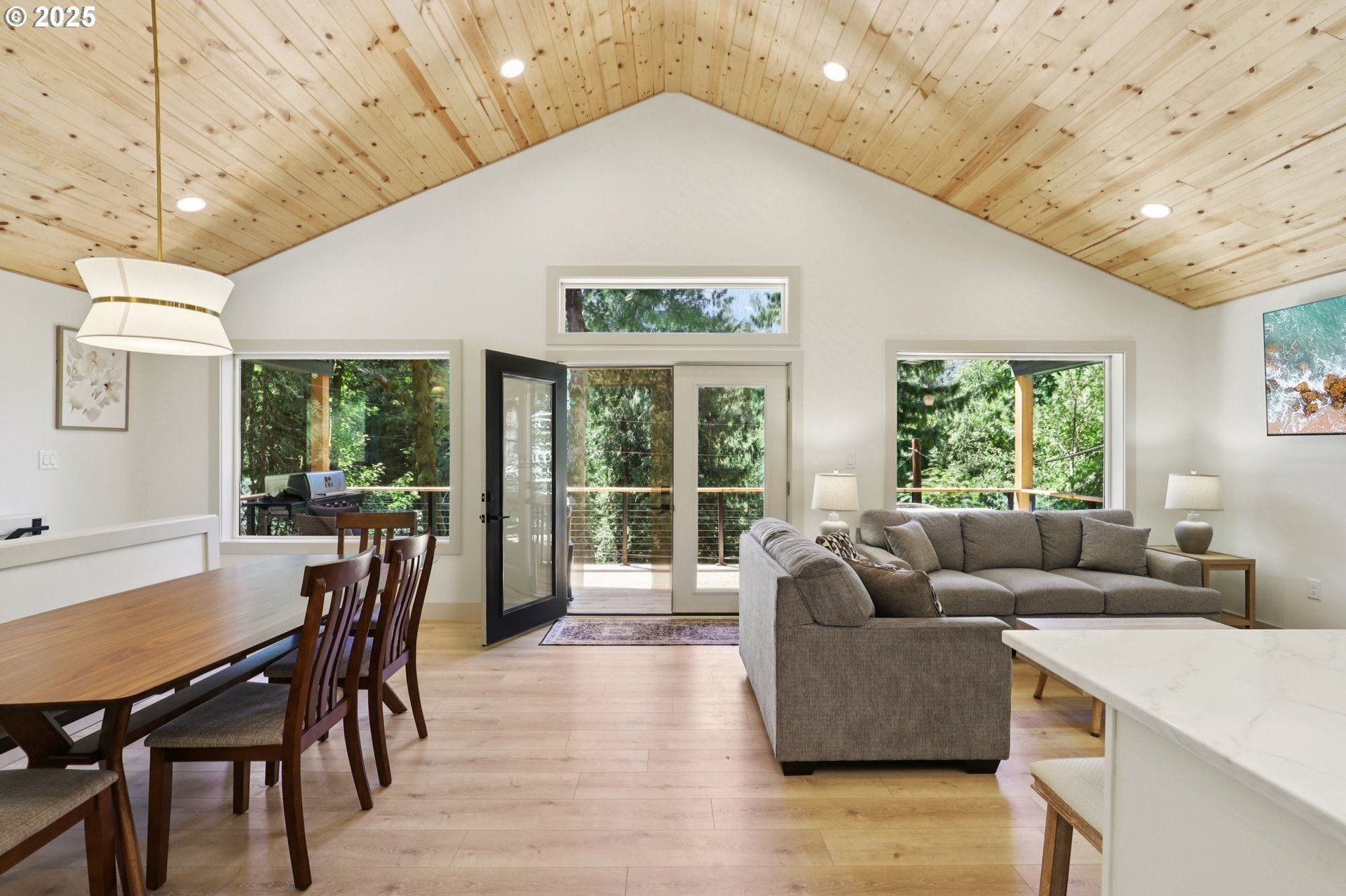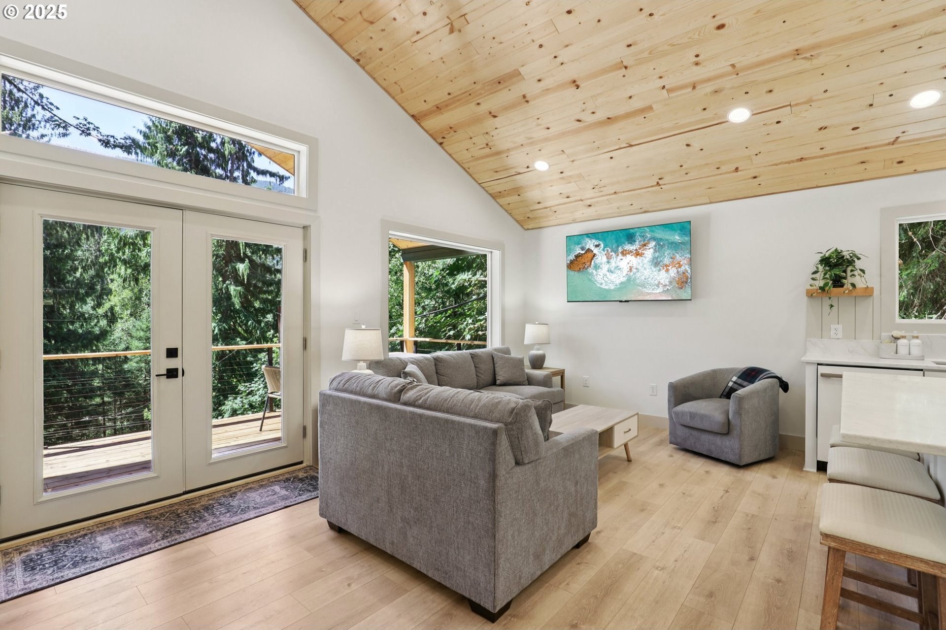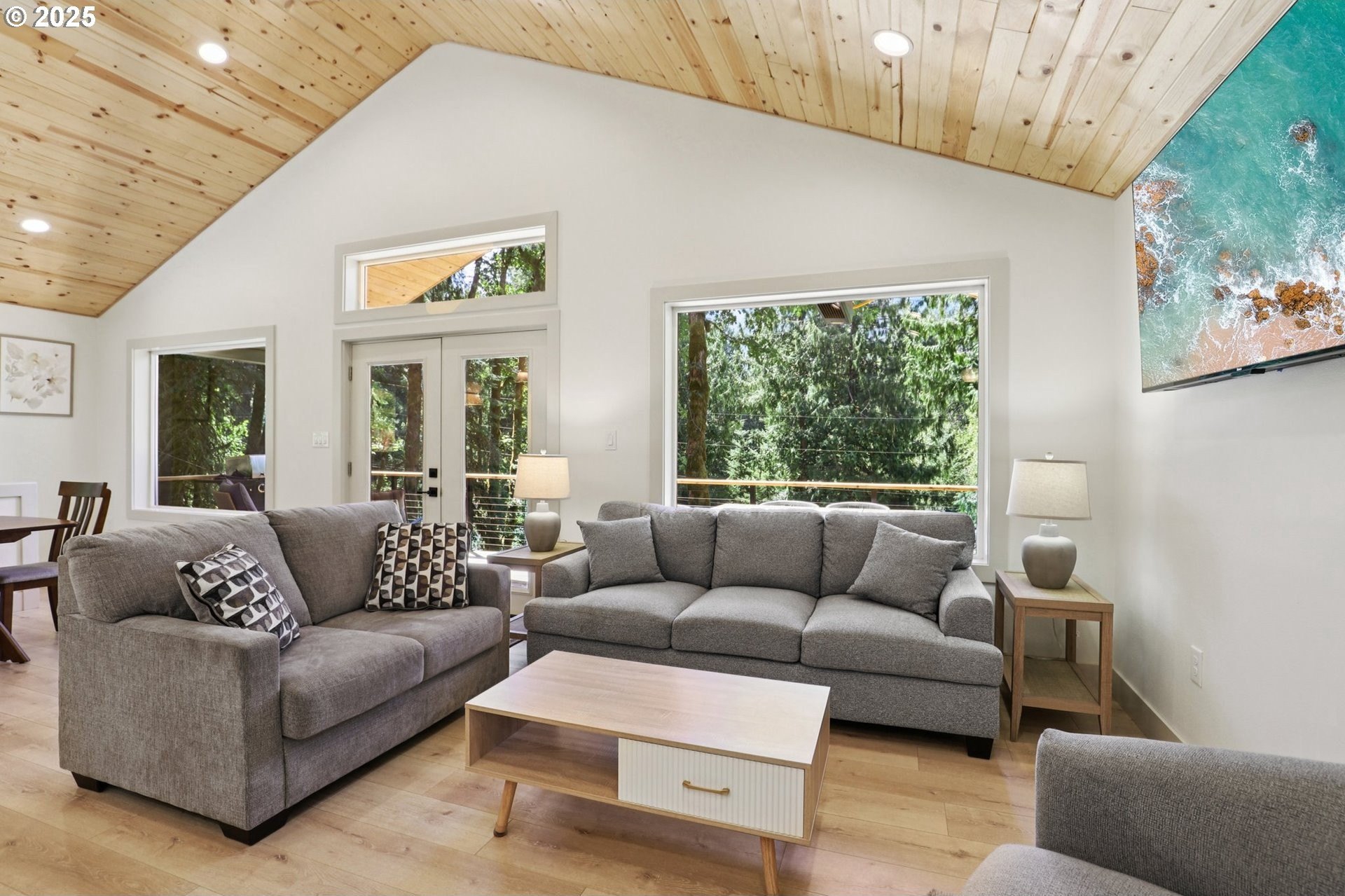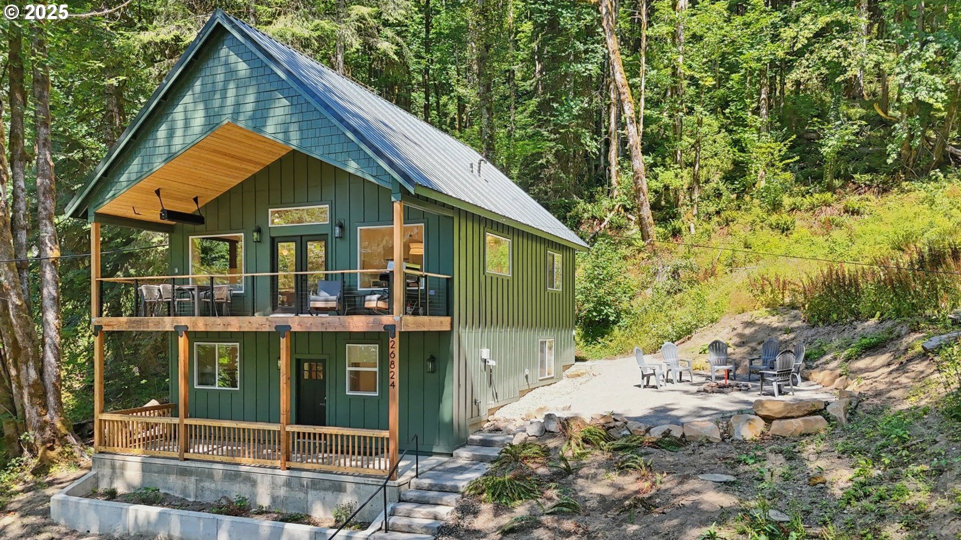 **Contemporary Mountain Chalet in Rhododendron - Your Cozy Getaway**Escape to this stunning, nearly 2,000 square foot mountain chalet, newly constructed in 2024 and nestled on a private half-acre of old-growth forest in Rhododendron. Located on peaceful Henry Creek Road, this contemporary fully furnished retreat offers the perfect balance of seclusion and convenience, just 10 minutes from Government Camp and all major ski areas, yet completely removed from highway noise.This exceptional home features 4 spacious bedrooms with smart TVs, dual living areas that function independently, and a game room with shuffleboard and 75-inch TV. The design includes 2 full bathrooms plus 1 half bath, dual-zone 5-stage heat pump heating and cooling, hybrid resilient flooring throughout, quartz countertops, and custom cabinetry. Premium touches include WiFi-connected LG Studio appliances, all interior walls feature rock-wool soundproof insulation, and vaulted wood ceilings upstairs.Outdoor living is enhanced by covered front porch and rear patio with overhead heating, while luxurious bathrooms feature walk-in showers with dual shower heads and a soaking tub. The property includes high-speed internet and connects to Rhododendron Water Association for just $450 per year unlimited water. Located just 2 minutes to local coffee shops for your morning caffeine fix.This exceptional investment opportunity comes completely furnished including all appliances making it turnkey and move-in ready, perfect for short-term rental with proven Airbnb potential. The flexible layout accommodates both couples' retreats and large groups, while the prime location provides year-round access to world-class skiing, hiking trails, and outdoor recreation. Walking distance to Henry Creek and minutes from Mirror Lake, Timothy Lake, and Trillium Lake make this a rare find in the Mt. Hood corridor. Please click on link for more pictures!! Not on leased land.