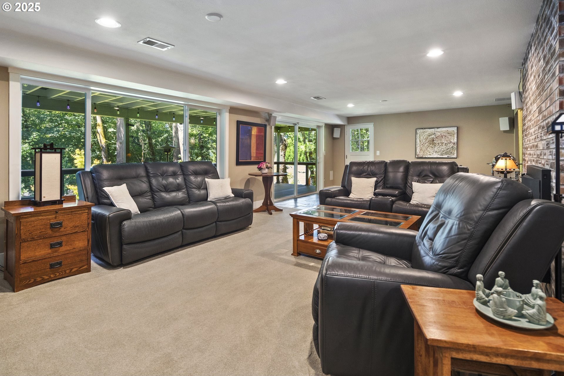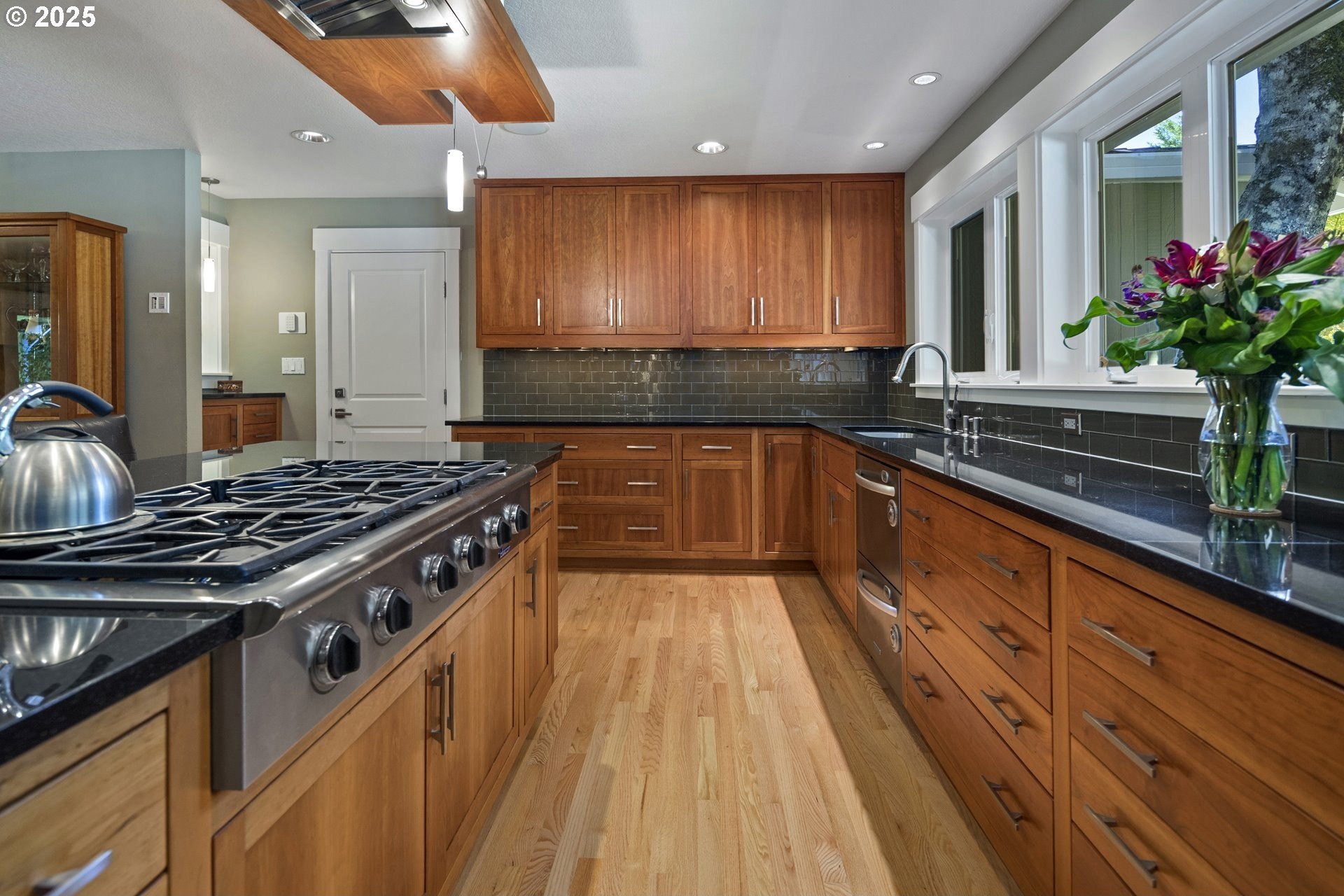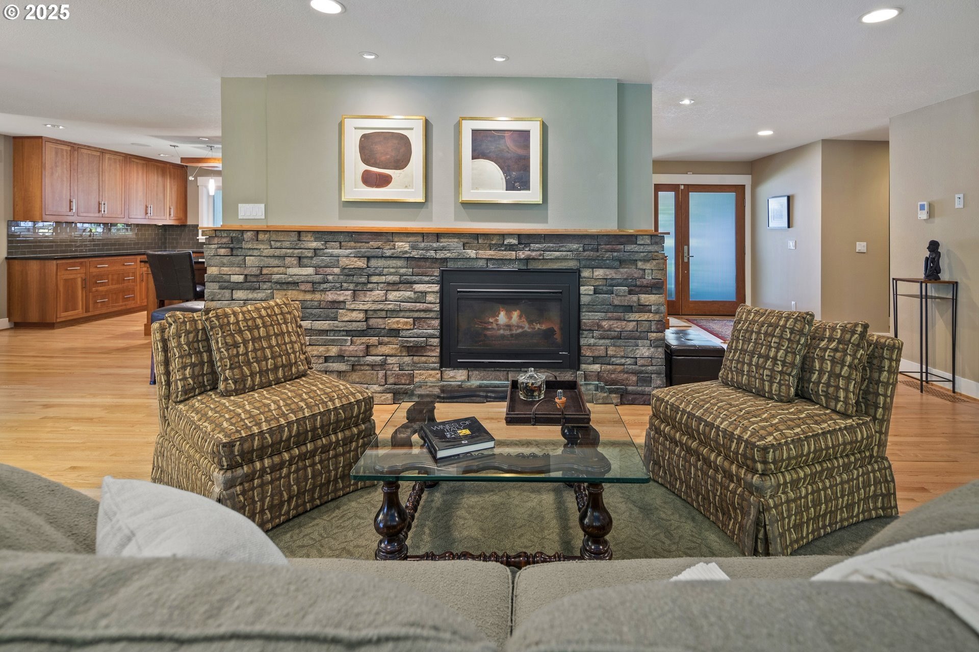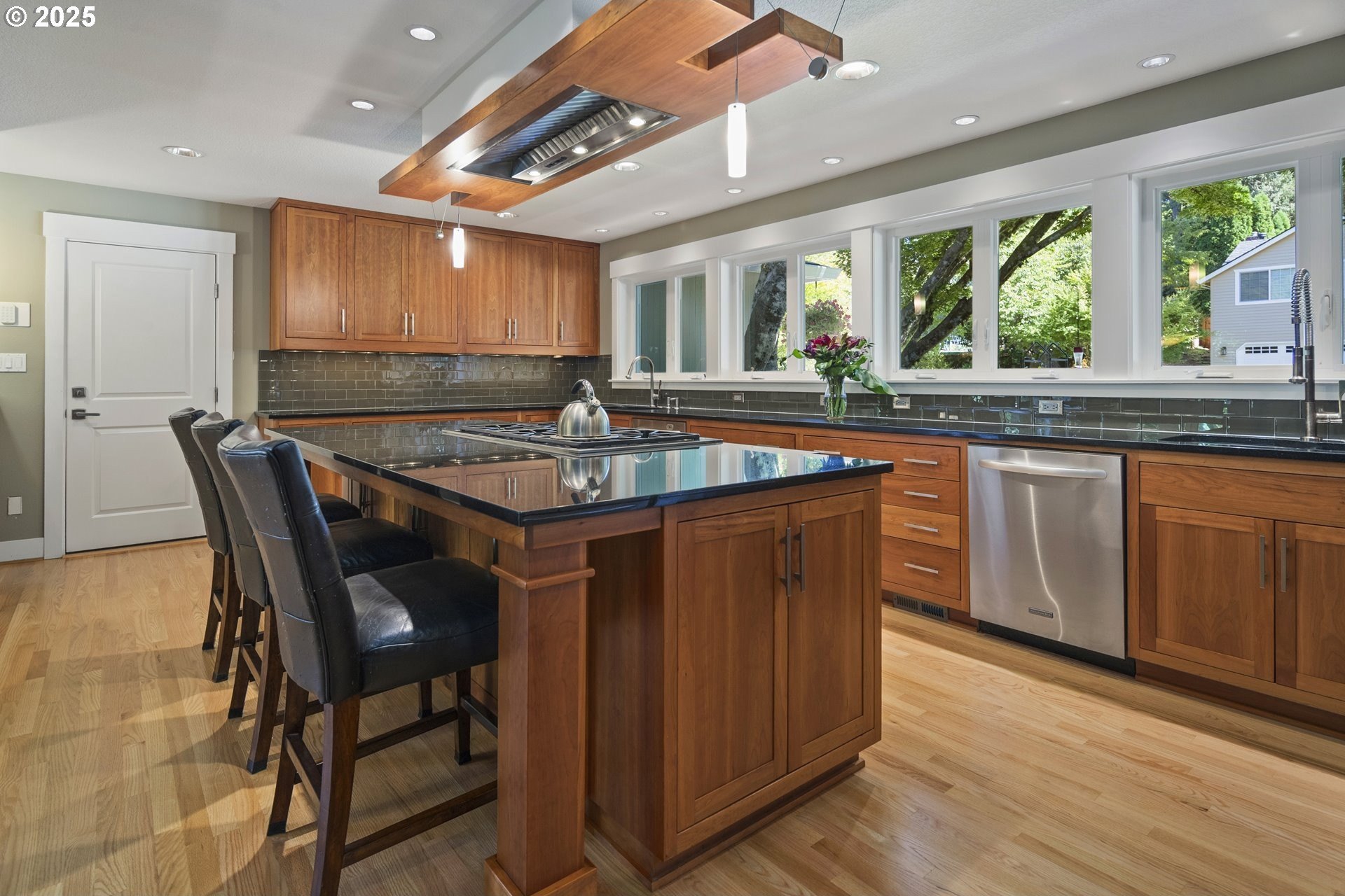 Lake Oswego Daylight Ranch – Remodeled to Perfection. This exquisitely updated 3-bedroom, 3-bath daylight ranch offers 3,408 sq ft of refined living space with exceptional attention to detail throughout. Thoughtful upgrades and luxurious finishes create a home that blends style, comfort, and functionality. The gourmet kitchen features custom cherry cabinets, slide-out shelving, slab granite counters, 6-burner cooktop, double convection ovens and microwave, ultra-quiet exhaust system, 3 dishwashers, fireplace, elegant entertainment lighting. The kitchen opens to a bright family room with gas fireplace, expansive windows and patio door opening to a large deck. The main level includes the primary and second bedrooms, each featuring fully updated baths, hardwood floors and a stairway leading to the lower level with a spacious family room, custom-built bar, insulated wine cellar, third bedroom with a remodeled full bath, versatile media/exercise room, and a gas fireplace perfect for cozy gatherings. Recent 2024/2025 updates include: new decking on two decks, fully updated bathrooms with quartz counters, tile floors, new vanities, and tile-bottom showers, new roof, gutters, new lower level windows and patio doors, solid core interior doors, baseboards & trim, and new exterior paint. The large, wooded backyard offers privacy, serenity, and outdoor enjoyment. Move-in ready, this Lake Oswego daylight ranch embodies timeless craftsmanship and modern luxury, offering versatile living spaces and sophisticated upgrades throughout. Every detail has been carefully curated, from the gourmet kitchen and beautifully appointed fireplaces to the fully updated bathrooms and resurfaced decks. Situated within the highly regarded Lake Oswego school district and the Greentree Pool boundary, this extensively remodeled home presents a rare opportunity to enjoy elegance, comfort, and functionality—perfect for entertaining or everyday living in one of Lake Oswego’s most desirable neighborhoods.