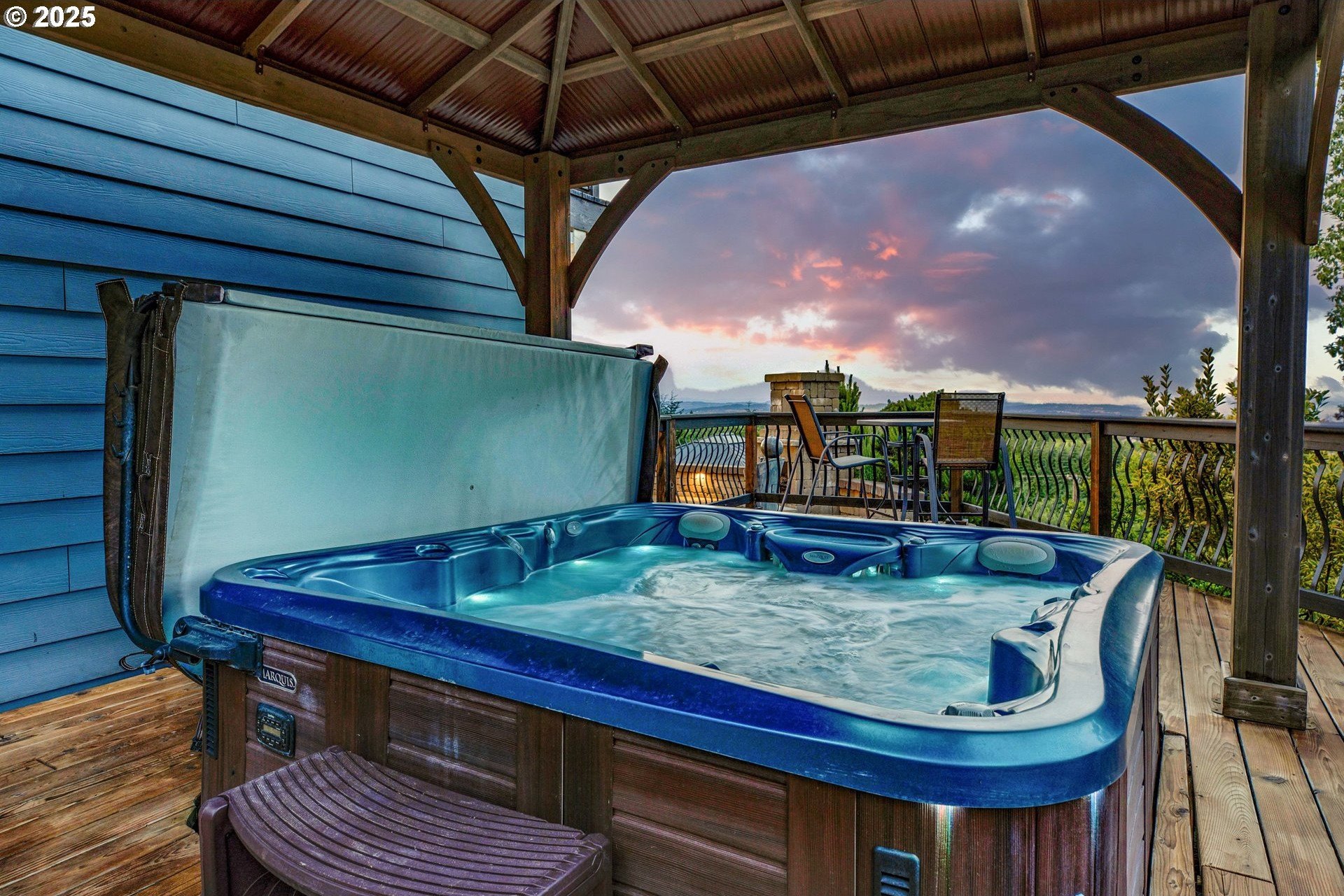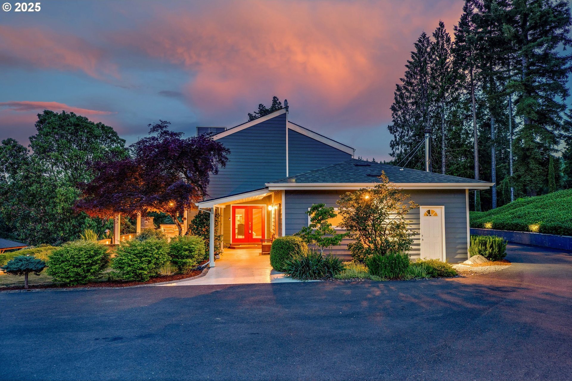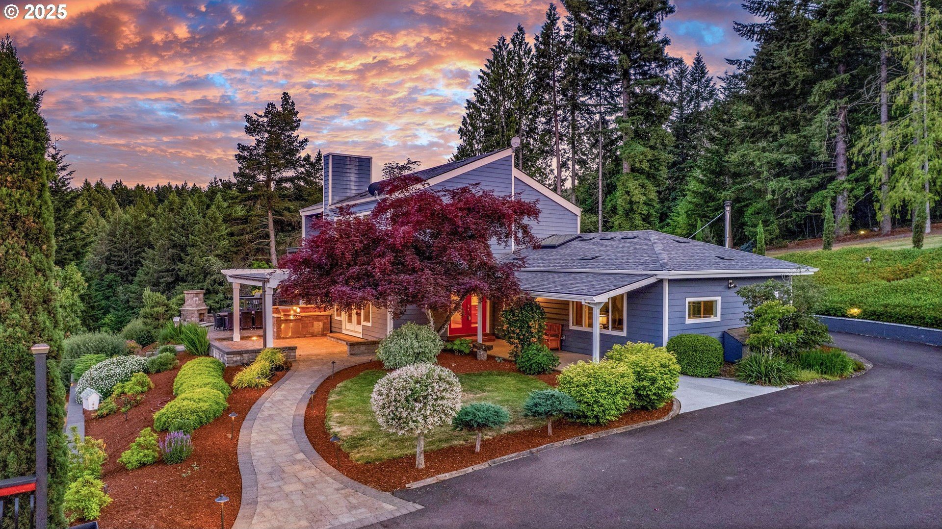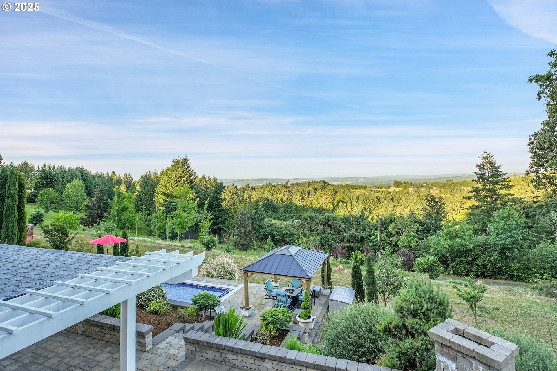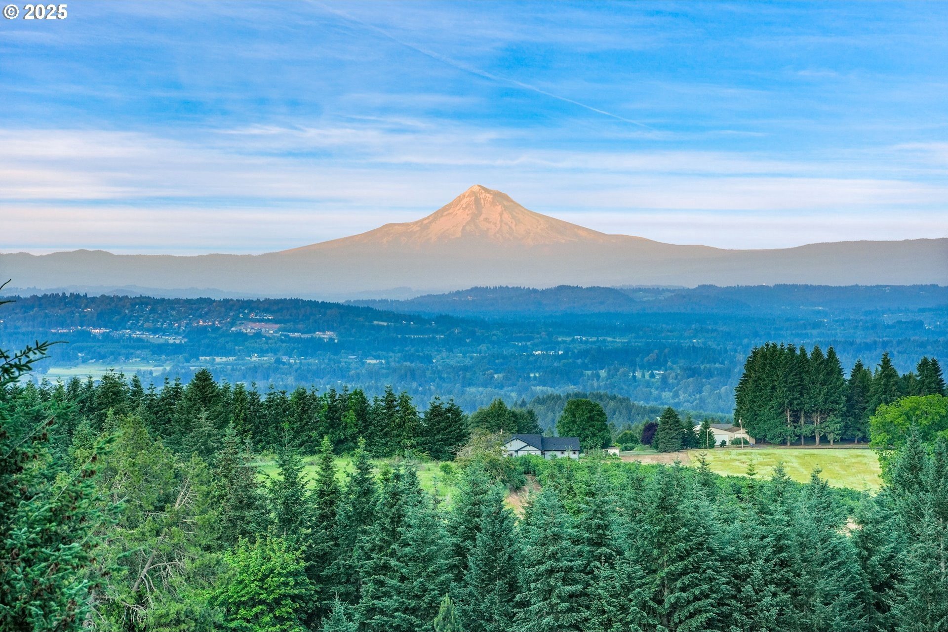 Welcome to a truly one-of-a-kind contemporary masterpiece, offering a private retreat on 3 acres with showstopper panoramic Mt. Hood and the valley views. This stunning 2-bedroomwith optional nonconforming 3rd bedroom/office upstairs, 2-bathroom, 2,400 sq ft home seamlessly blends modern amenities with elegant French countryside touches, including wood-wrapped arched windows, French doors, and hardwood floors. The heart of the home, a completely remodeled kitchen, boasts professional-grade cooking and venting, dual wine fridges, new cabinetry, countertops, and appliances – a chef's dream. Soaring vaults and open upstairs loft create an original and expansive feel while maintaining a warm, comfortable ambiance. Step outside to an entertainer's paradise and enjoy a covered patio with an outdoor cooking area, perfect for al fresco dining. Relax and soak in the breathtaking views from the hot tub or take a dip in the heated/cooled saltwater inground pool, complete with an electric pool cover. Beyond the main residence, discover an incredible 87' x 22' dream garage/shop. This ultimate space features a luxury full bathroom, heated floors, industrial mechanical systems, three parking bays, a dog washing station, laundry facilities, and a heated/cooled office space. This property isn't just a home; it's a lifestyle of unparalleled comfort, luxury, and tranquility. Additionally, this property offers unlimited potential for a separate ADU in the garage/shop already has full bathroom and laundry, Wedding venue that already has parking lot for 25-30 cars, Vinyard tast