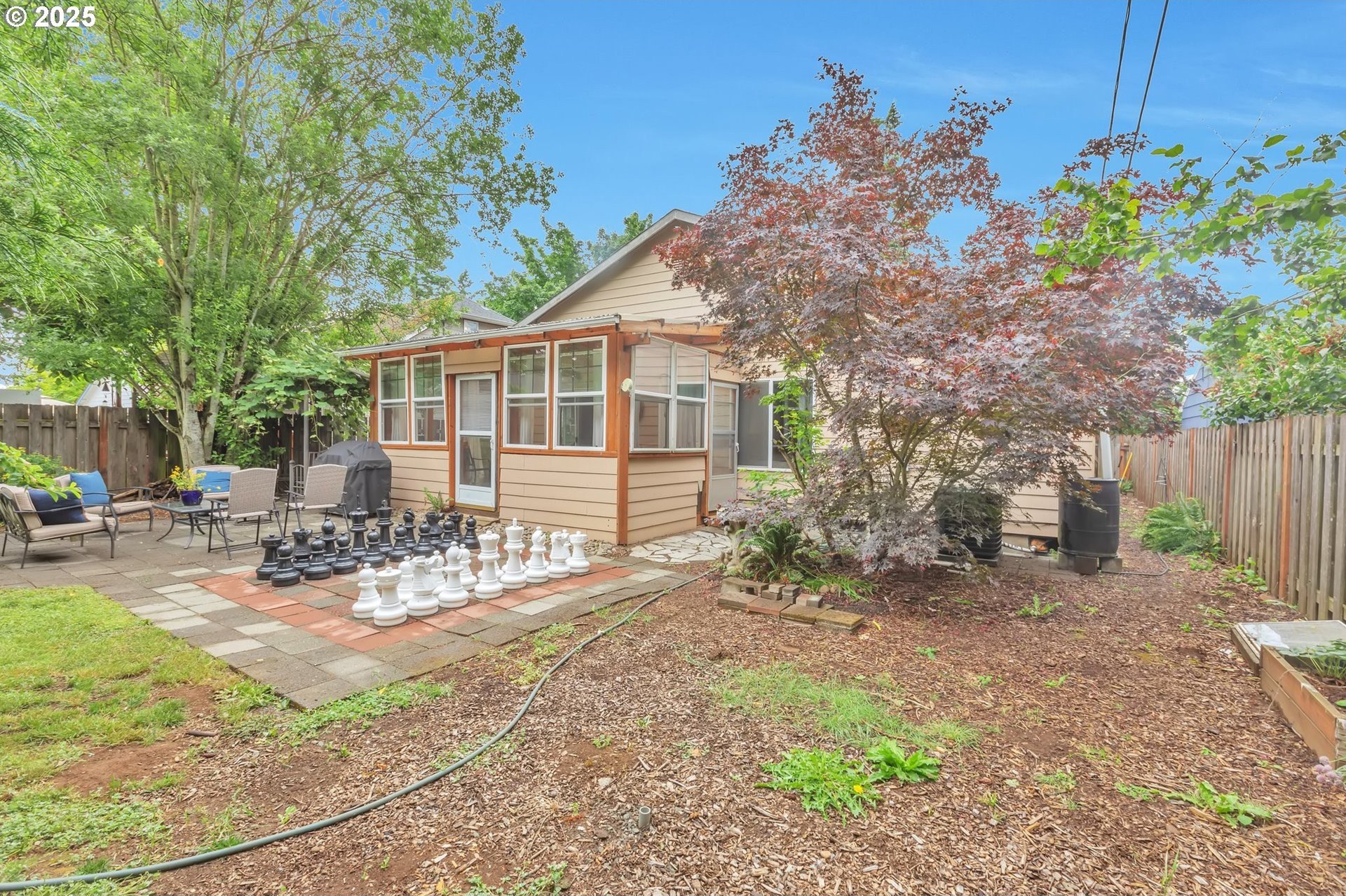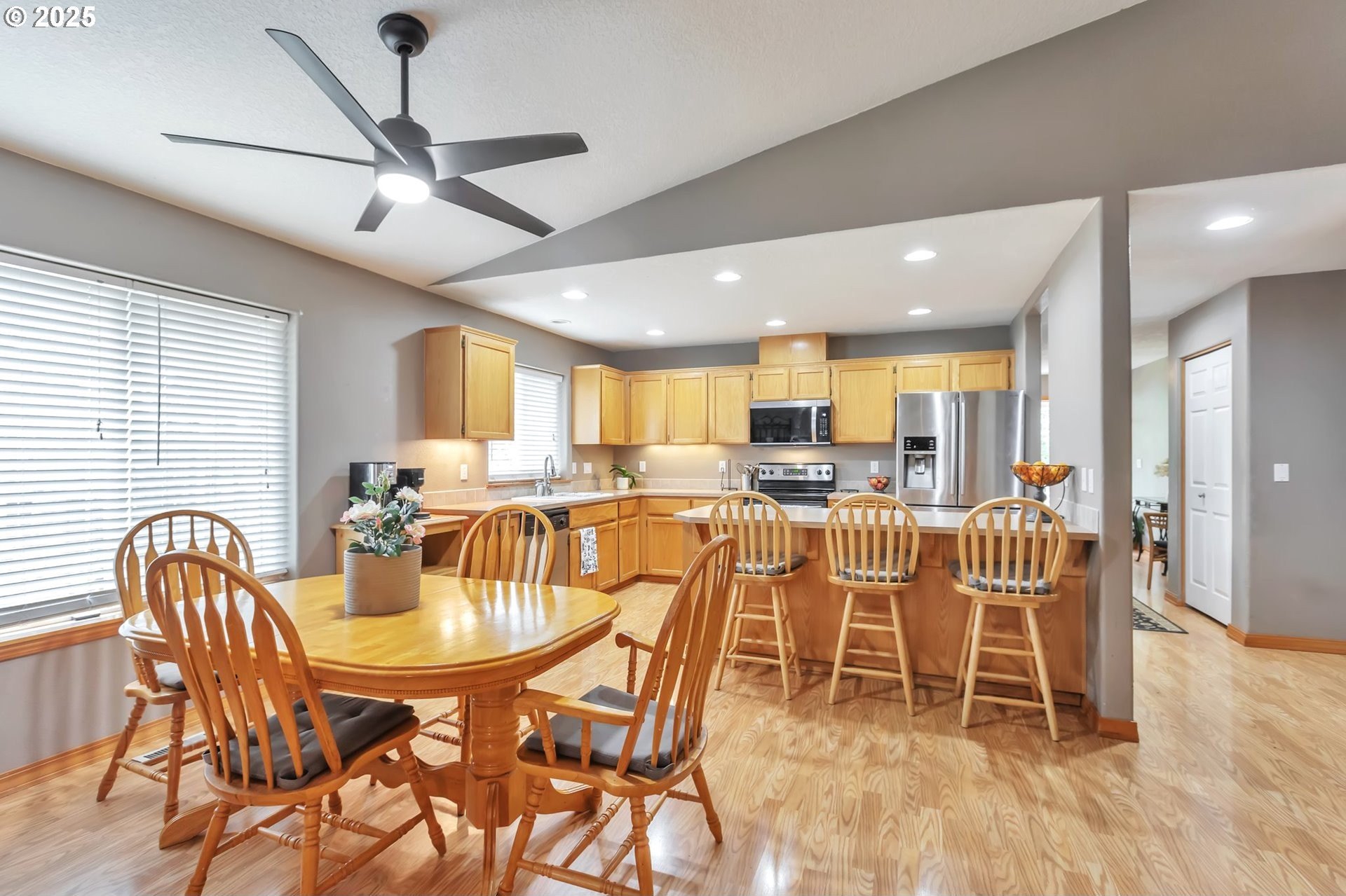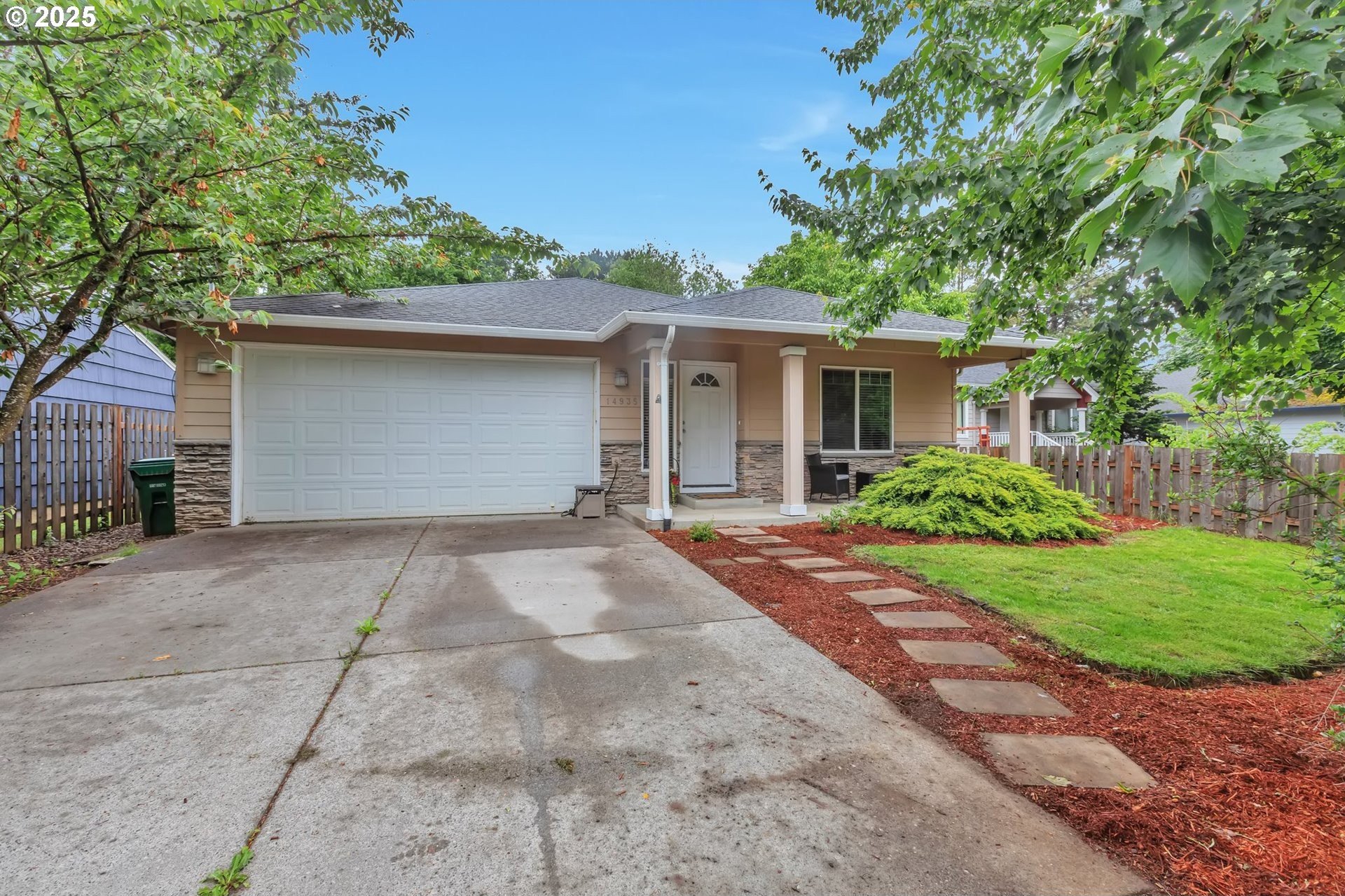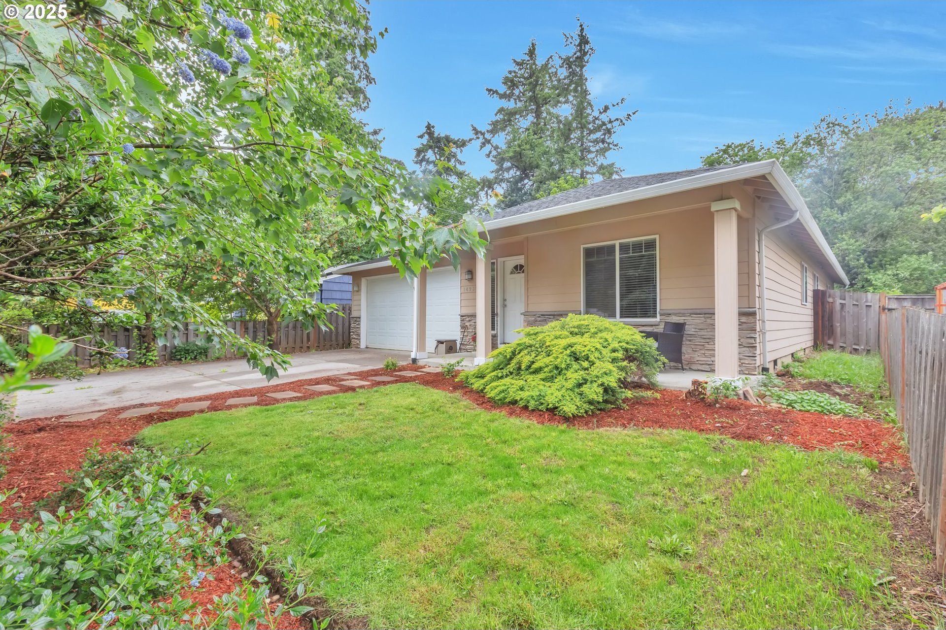 This home features an open floor plan with vaulted ceilings, creating an airy atmosphere. The kitchen is equipped with numerous cabinets, ample storage space, and generous countertop areas, all complemented by stainless steel appliances. It includes four bedrooms, with the primary bedroom offering an ensuite bathroom that boasts skylights and direct access to the backyard. This home has 2.5 bathrooms and a two-car garage. The great room features a cozy fireplace and a sliding door that opens to the backyard. The wide hallways and single-level layout provide easy access throughout the home. The backyard is a private oasis, featuring a covered deck area, a fully fenced yard that receives plenty of sunlight, fruit trees, and a shed for additional storage. The original owners have well-maintained the property, recently replacing the water heater, furnace, and adding central air conditioning. This home is conveniently located near public transportation, grocery stores, and the newly expanded Parklane Park. [Home Energy Score = 6. HES Report at https://rpt.greenbuildingregistry.com/hes/OR10238962]