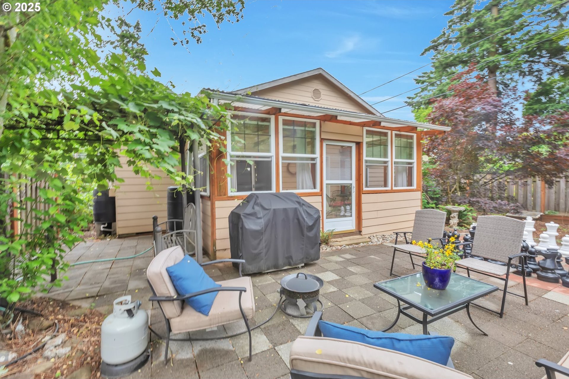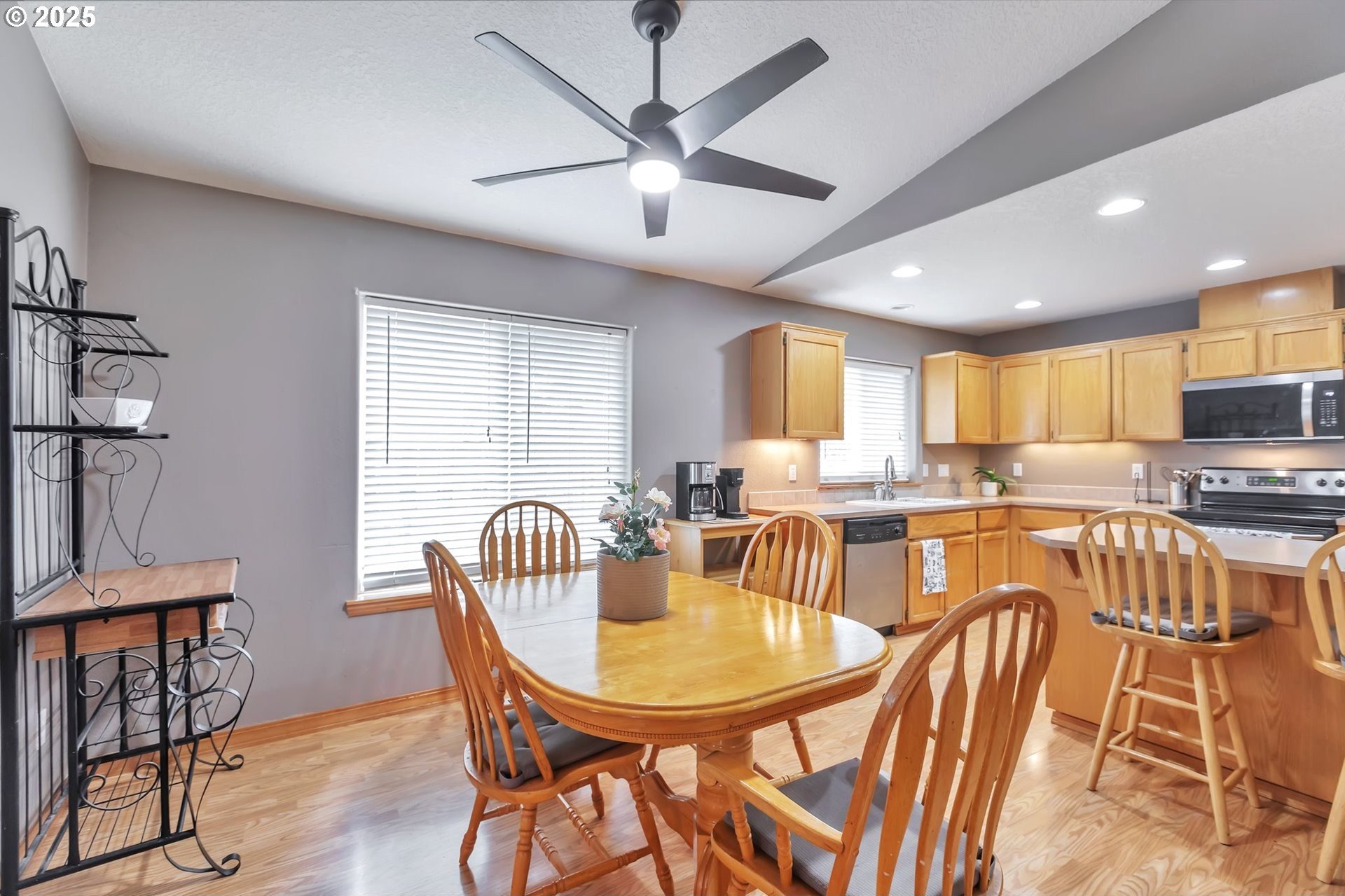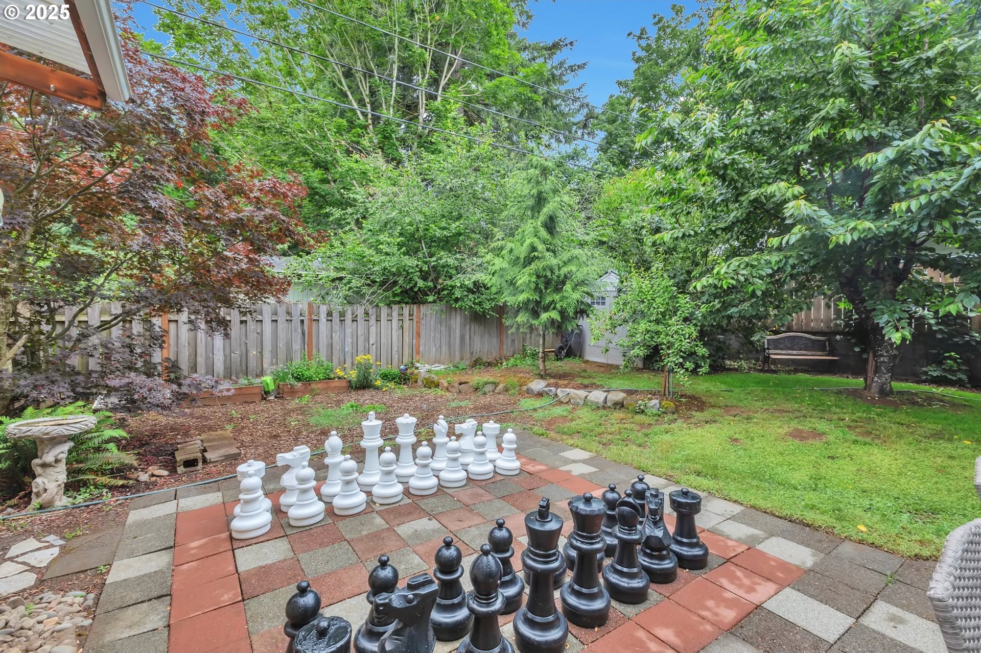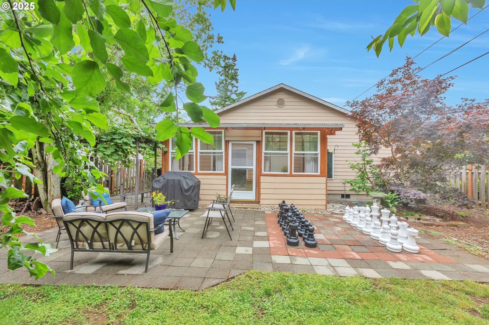 This home features an open floor plan with vaulted ceilings, creating an airy atmosphere. The kitchen is equipped with numerous cabinets, ample storage space, and generous countertop areas, all complemented by stainless steel appliances. It includes four bedrooms, with the primary bedroom offering an ensuite bathroom that boasts skylights and direct access to the backyard. This home has 2.5 bathrooms and a two-car garage. The great room features a cozy fireplace and a sliding door that opens to the backyard. The wide hallways and single-level layout provide easy access throughout the home. The backyard is a private oasis, featuring a covered deck area, a fully fenced yard that receives plenty of sunlight, fruit trees, and a shed for additional storage. The original owners have well-maintained the property, recently replacing the water heater, furnace, and adding central air conditioning. This home is conveniently located near public transportation, grocery stores, and the newly expanded Parklane Park. [Home Energy Score = 6. HES Report at https://rpt.greenbuildingregistry.com/hes/OR10238962]