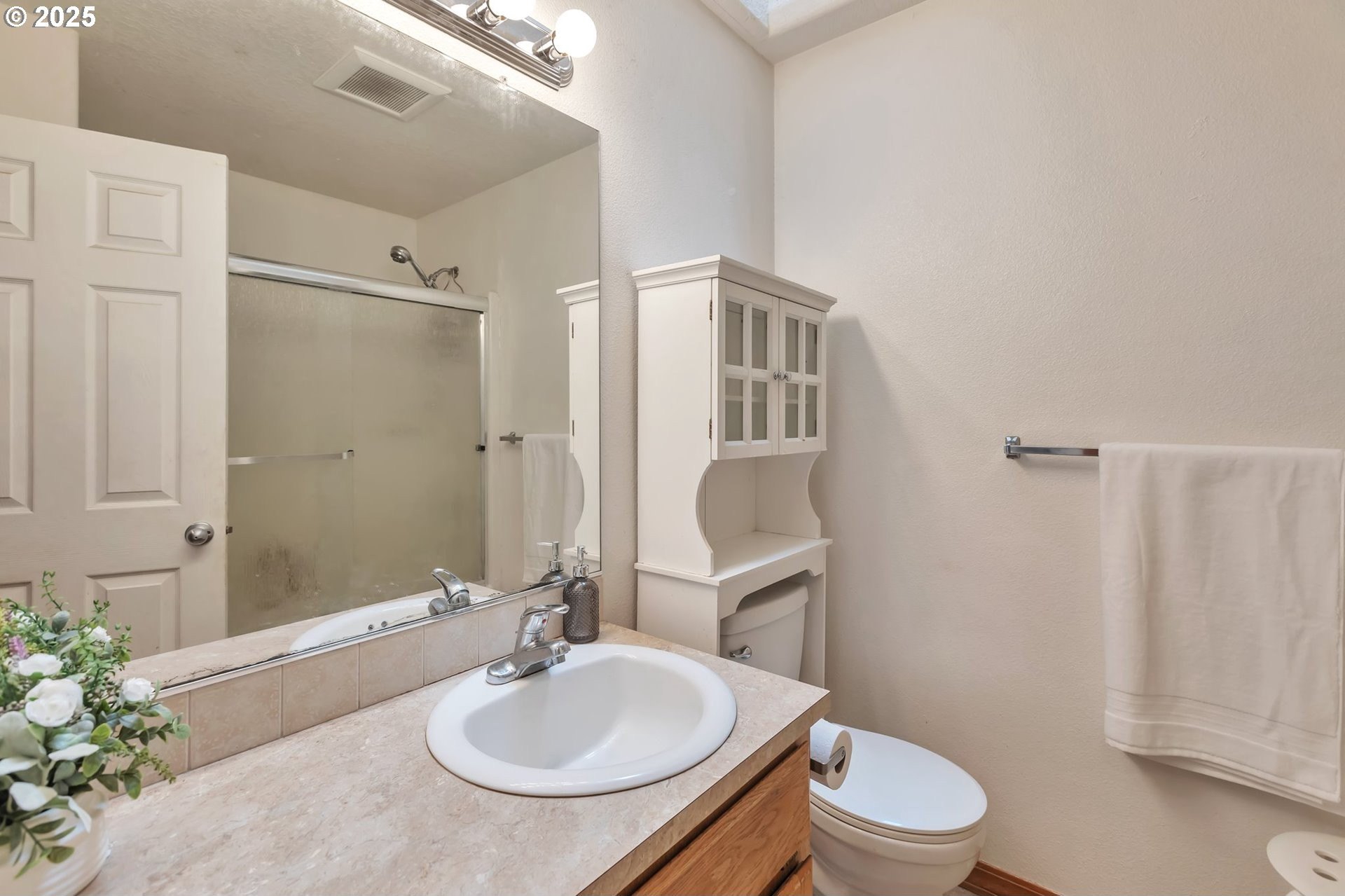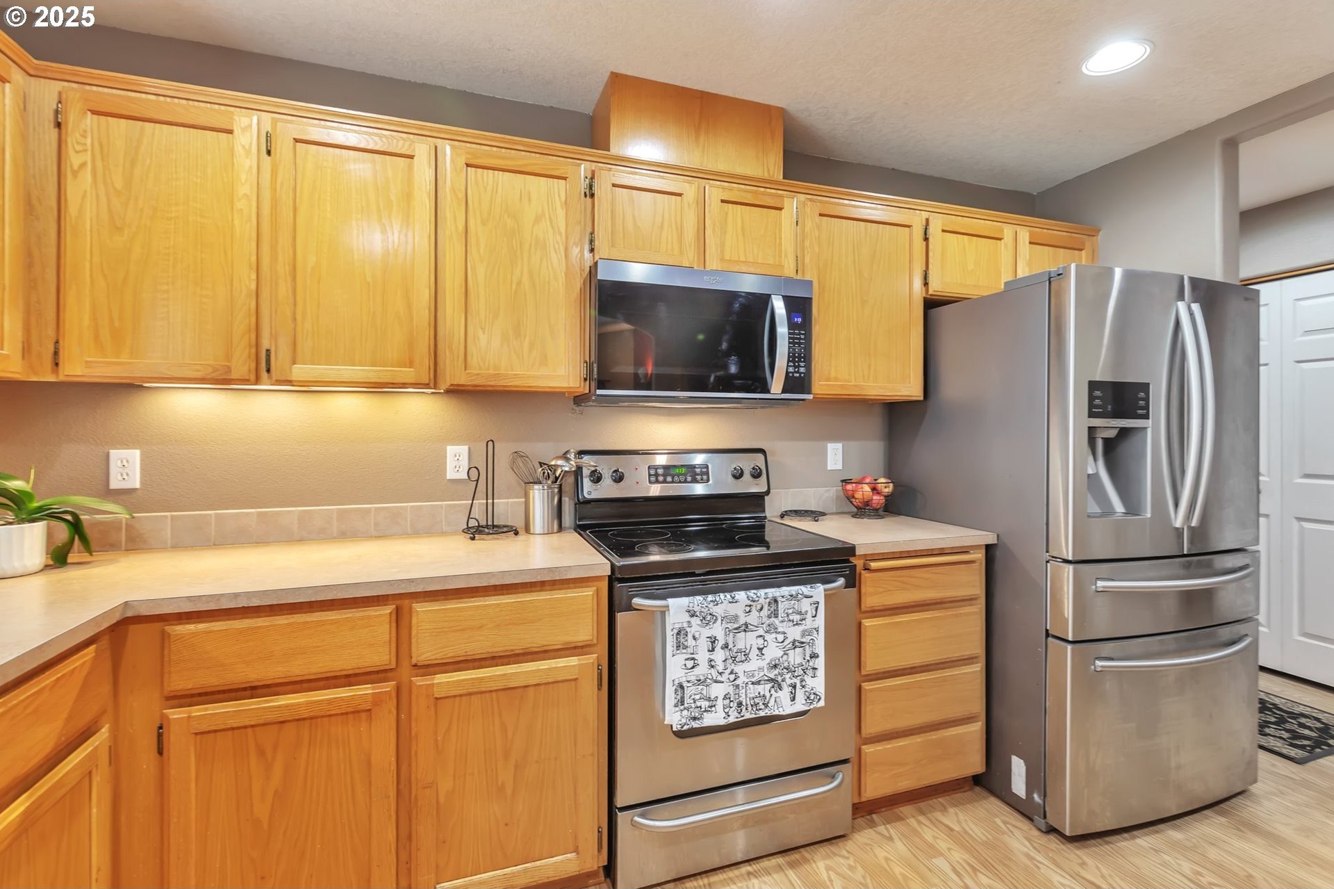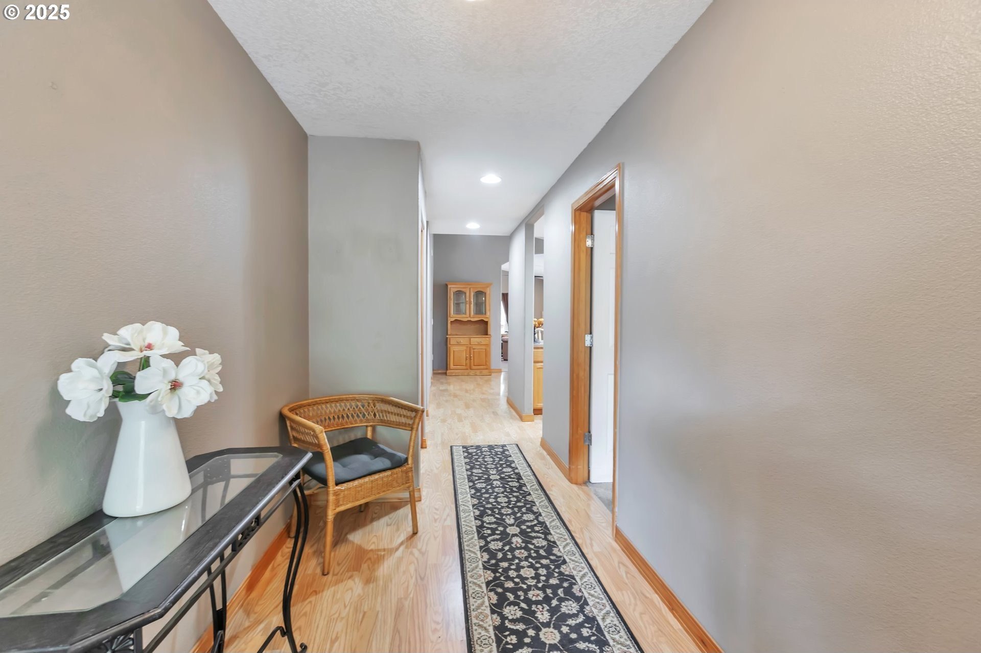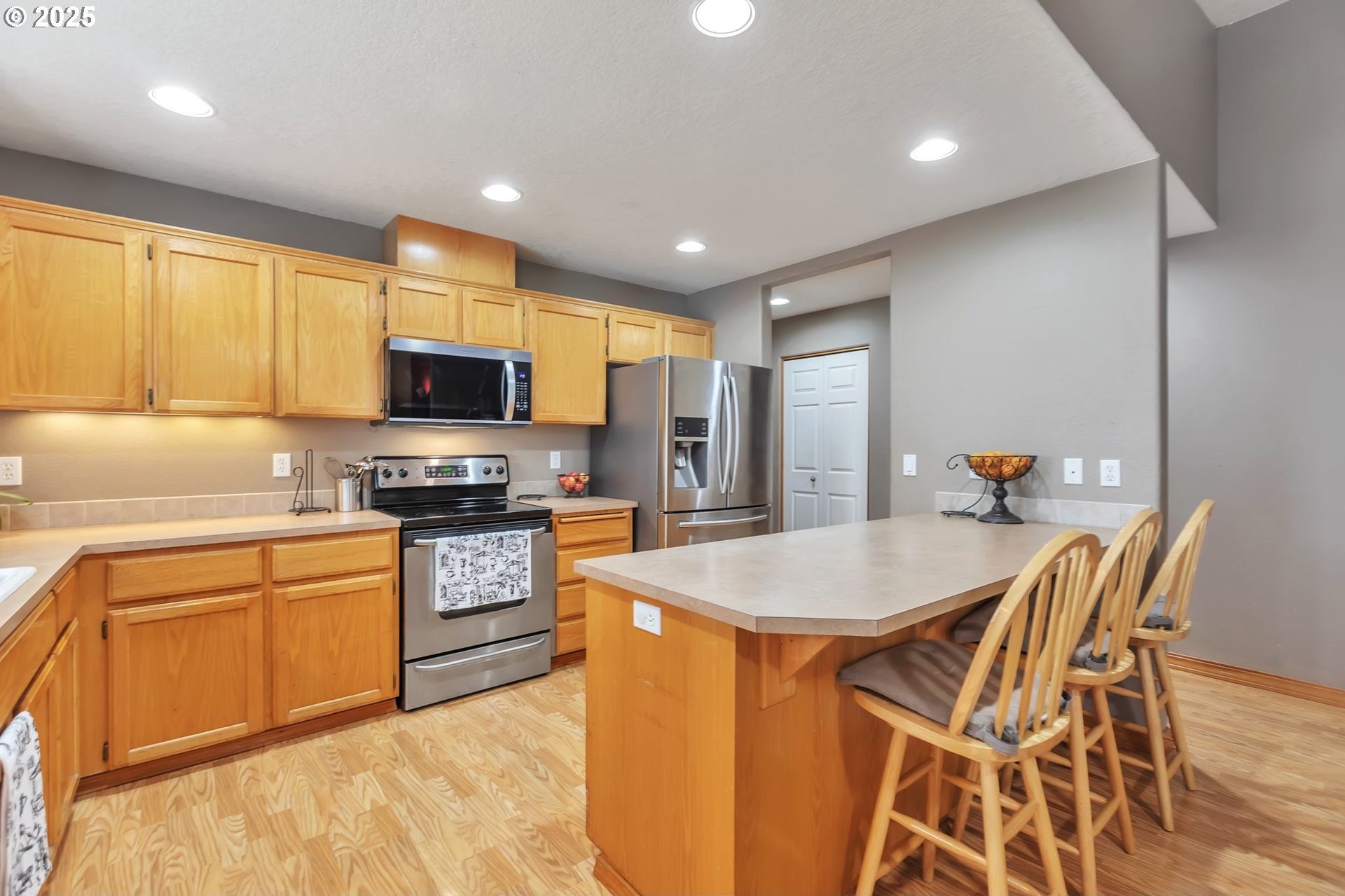 This home features an open floor plan with vaulted ceilings, creating an airy atmosphere. The kitchen is equipped with numerous cabinets, ample storage space, and generous countertop areas, all complemented by stainless steel appliances. It includes four bedrooms, with the primary bedroom offering an ensuite bathroom that boasts skylights and direct access to the backyard. This home has 2.5 bathrooms and a two-car garage. The great room features a cozy fireplace and a sliding door that opens to the backyard. The wide hallways and single-level layout provide easy access throughout the home. The backyard is a private oasis, featuring a covered deck area, a fully fenced yard that receives plenty of sunlight, fruit trees, and a shed for additional storage. The original owners have well-maintained the property, recently replacing the water heater, furnace, and adding central air conditioning. This home is conveniently located near public transportation, grocery stores, and the newly expanded Parklane Park. [Home Energy Score = 6. HES Report at https://rpt.greenbuildingregistry.com/hes/OR10238962]