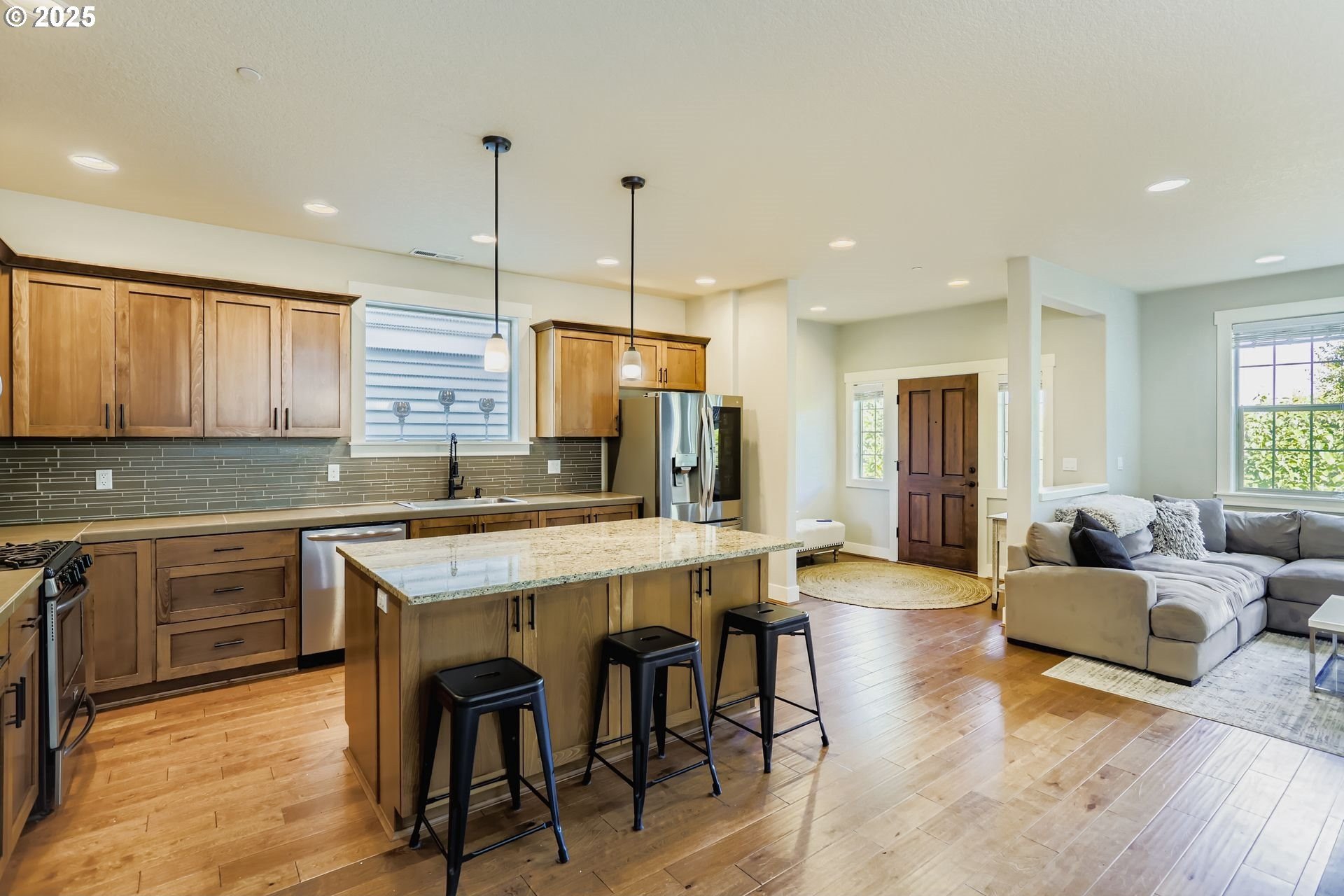 With Mt. Hood as its backdrop and Villebois at your doorstep, this 2015-built home is a rare chance to live where connection and comfort meet. Step inside the gated front courtyard and covered porch, then into a thoughtfully designed interior where engineered hardwood floors, soaring ceilings and an open-concept layout create an inviting flow. A gas fireplace anchors the great room which is filled with natural light and opens seamlessly to the dining area and chef’s kitchen—complete with stainless steel appliances, a granite island with seating, gas range and tile backsplash. From here, step outside to a private, low-maintenance backyard and patio—perfect for summer barbecues or morning coffee. Upstairs, the vaulted primary suite is a true retreat with a spa-like ensuite including double sinks, a soaking tub, walk-in shower and a generous walk-in closet. Three additional bedrooms, a full bath and a laundry room round out the upper level. Modern comforts include central AC and a two-car garage with alley access. Life in Villebois means more than just a home—it’s a lifestyle. Enjoy a pedestrian-friendly stone courtyard with an old-world fountain, neighborhood coffeehouse, Montessori school, farmers market, live music and bocce court. Low HOA dues unlock resort-style amenities: pool, fitness center, locker rooms, 160+ acres of parks and trails, community gardens, dog parks, sports courts, skate parks and more. All of this within the award-winning Wilsonville School District, known for its top-rated schools. This home truly delivers it all—modern living, unmatched amenities and a vibrant community.
