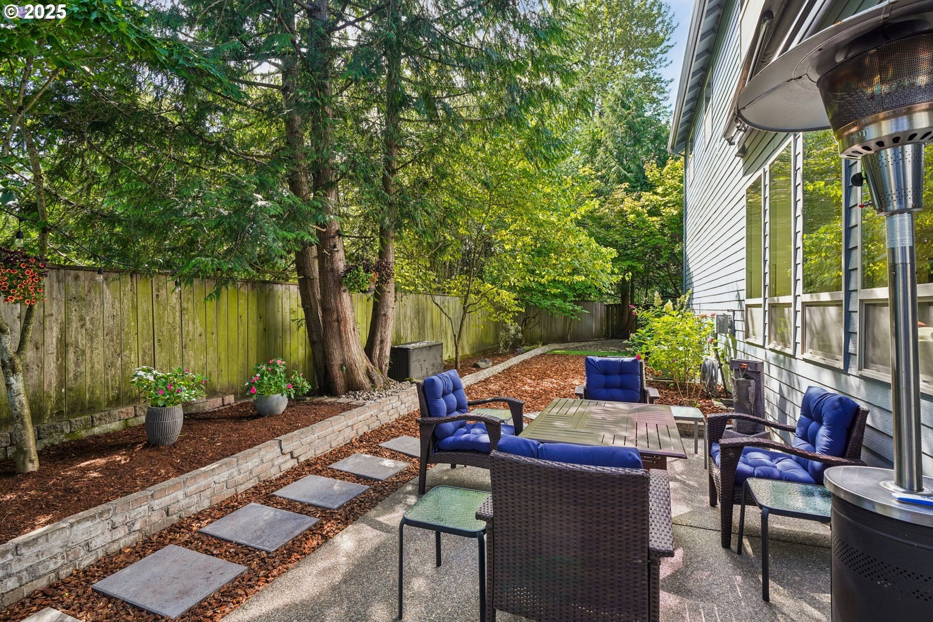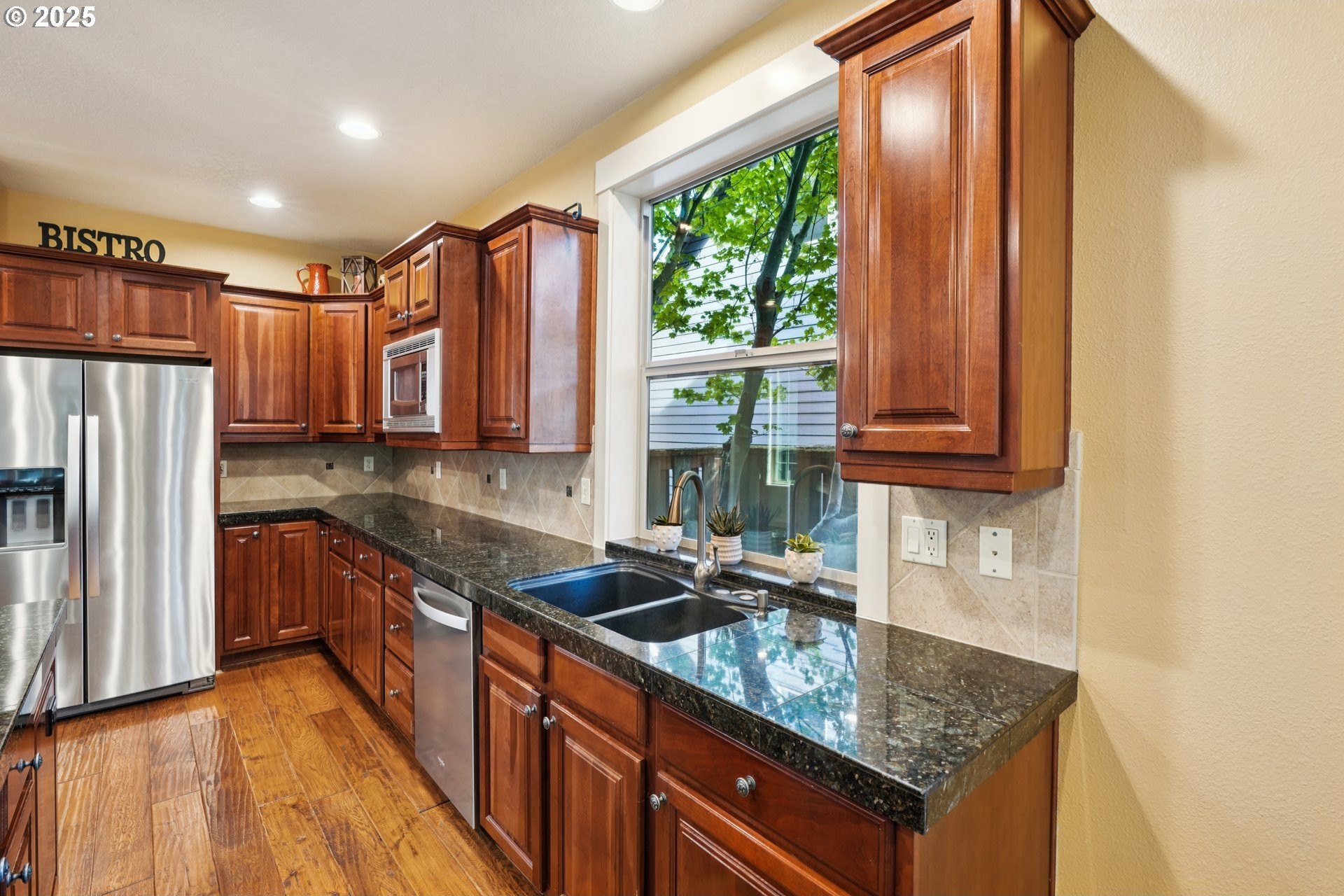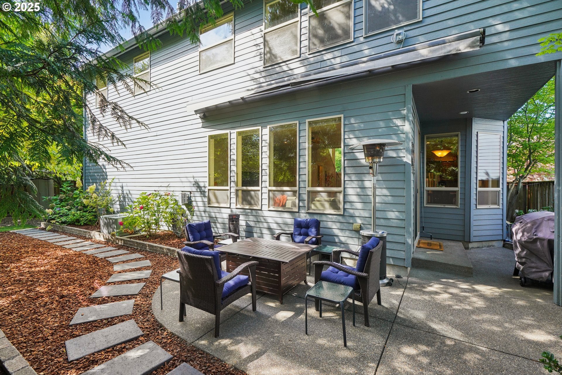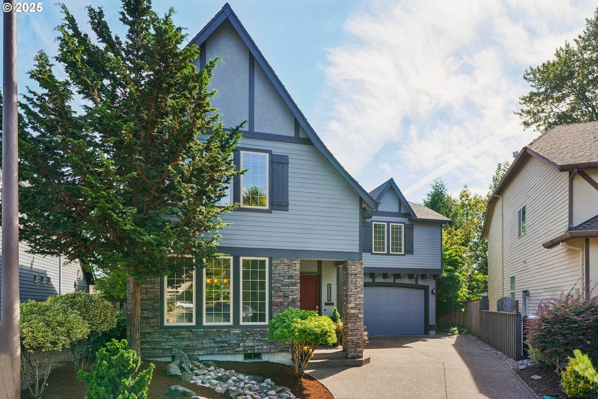 Nestled in a quiet cul-de-sac and backing to lush greenspace, this beautifully maintained home offers comfort, privacy, and sophisticated style. Step into the dramatic two-story foyer, where towering windows flood the space with natural light. The open-concept great room and formal dining area flow seamlessly into a gourmet kitchen with granite counters, tile backsplash, hand-scraped wood floors, and newer stainless appliances.Upstairs features three spacious bedrooms with vaulted ceilings, a versatile bonus room, and 2.5 baths. Premium wood finishes and soaring ceilings throughout create a sense of upscale elegance. The laundry room includes built-in cabinetry for added storage and organization. Modern conveniences include an Alexa-enabled smart thermostat for effortless climate control. Outside, enjoy your own private oasis with mature landscaping, stonework, and raised beds. The covered patio is enhanced by a 20' x 13' electric retractable awning, offering extended year-round enjoyment. Located on a private road with minimal traffic, just a block from Deer Creek Elementary and minutes from King City Community Park, with a playground, athletic fields, sports courts, and access to the beautiful Tualatin River. A rare find—luxury, privacy, and convenience all in one!