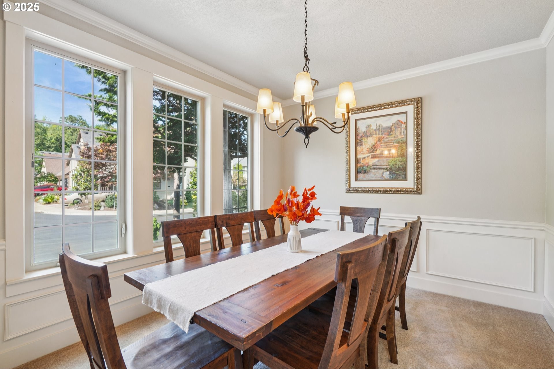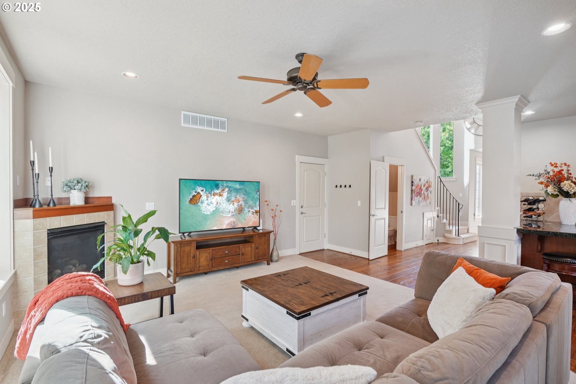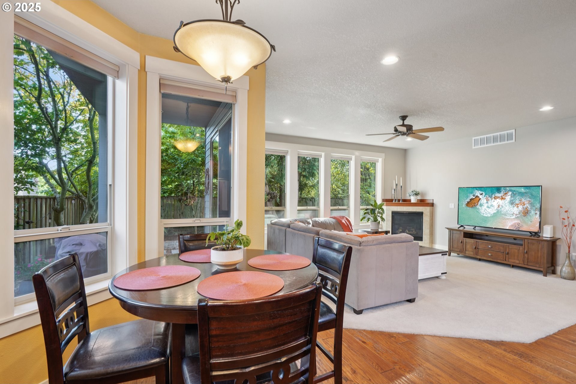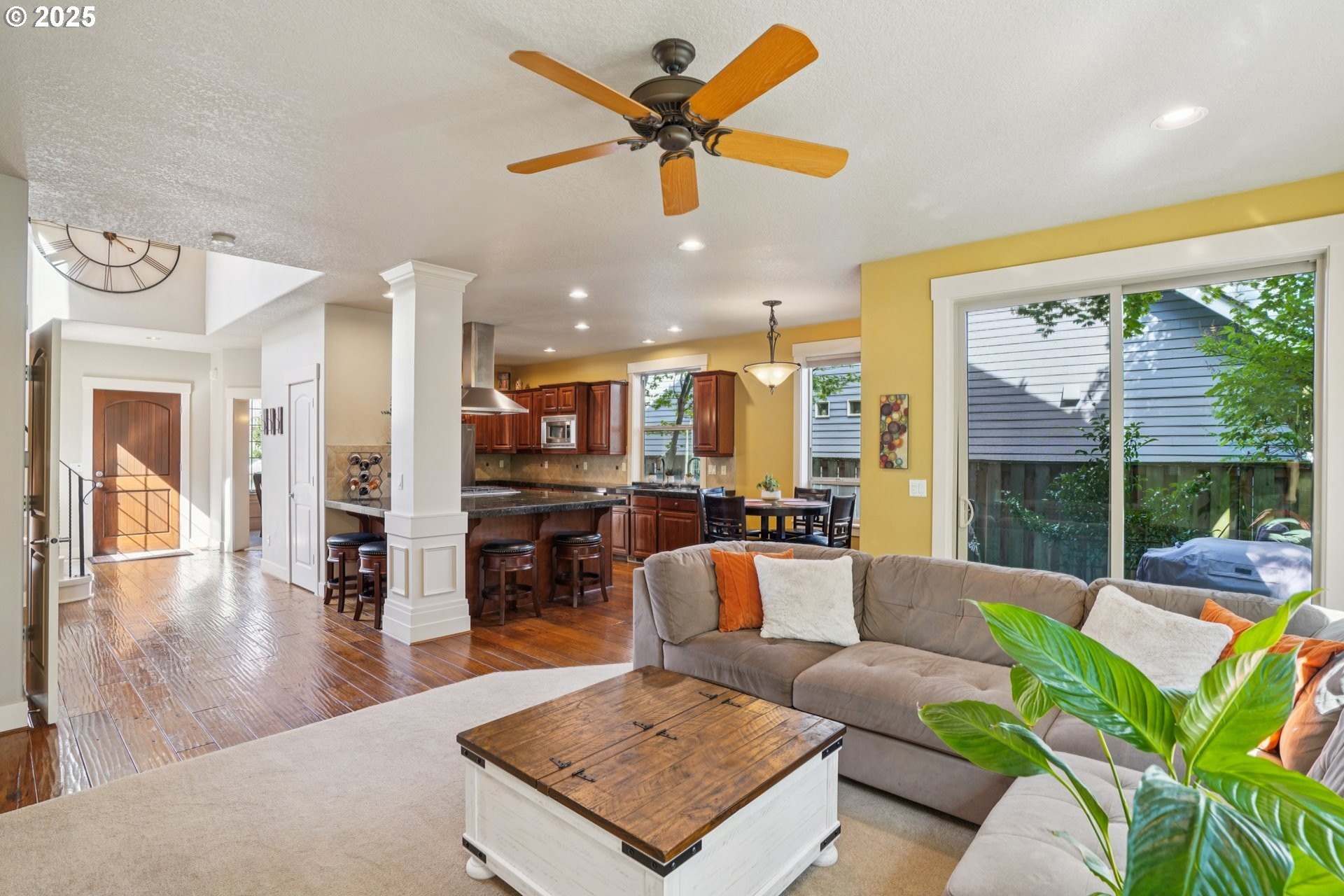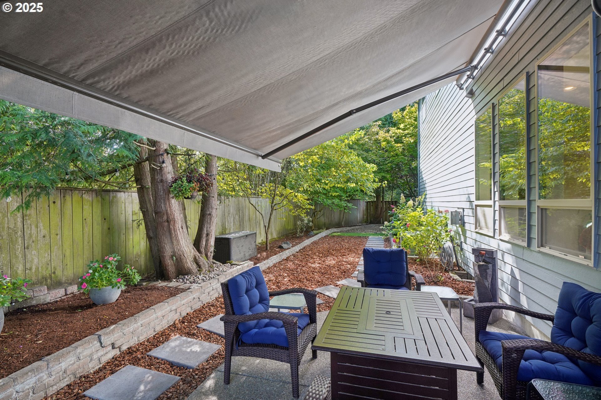 Nestled in a quiet cul-de-sac and backing to lush greenspace, this beautifully maintained home offers comfort, privacy, and sophisticated style. Step into the dramatic two-story foyer, where towering windows flood the space with natural light. The open-concept great room and formal dining area flow seamlessly into a gourmet kitchen with granite counters, tile backsplash, hand-scraped wood floors, and newer stainless appliances.Upstairs features three spacious bedrooms with vaulted ceilings, a versatile bonus room, and 2.5 baths. Premium wood finishes and soaring ceilings throughout create a sense of upscale elegance. The laundry room includes built-in cabinetry for added storage and organization. Modern conveniences include an Alexa-enabled smart thermostat for effortless climate control. Outside, enjoy your own private oasis with mature landscaping, stonework, and raised beds. The covered patio is enhanced by a 20' x 13' electric retractable awning, offering extended year-round enjoyment. Located on a private road with minimal traffic, just a block from Deer Creek Elementary and minutes from King City Community Park, with a playground, athletic fields, sports courts, and access to the beautiful Tualatin River. A rare find—luxury, privacy, and convenience all in one!