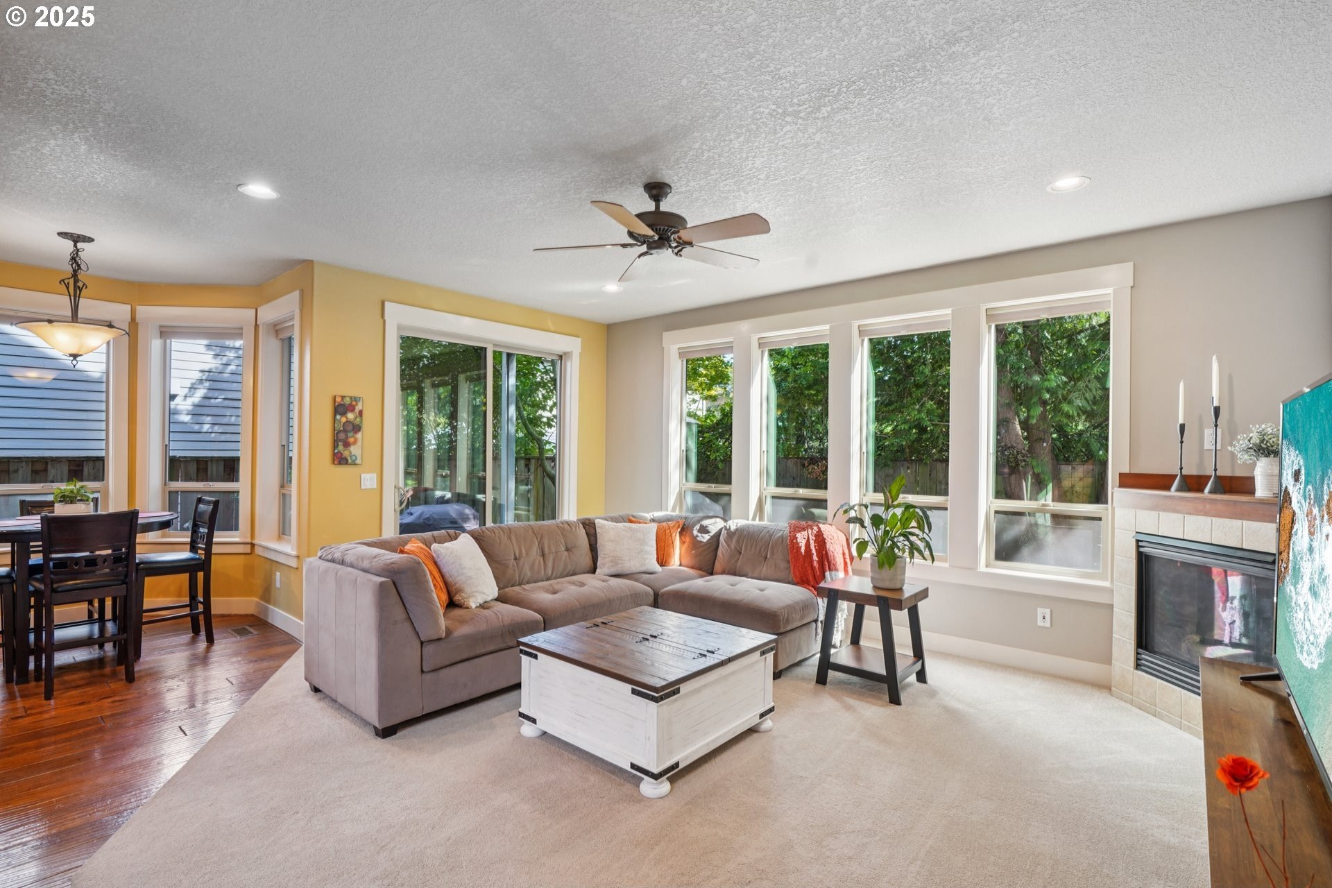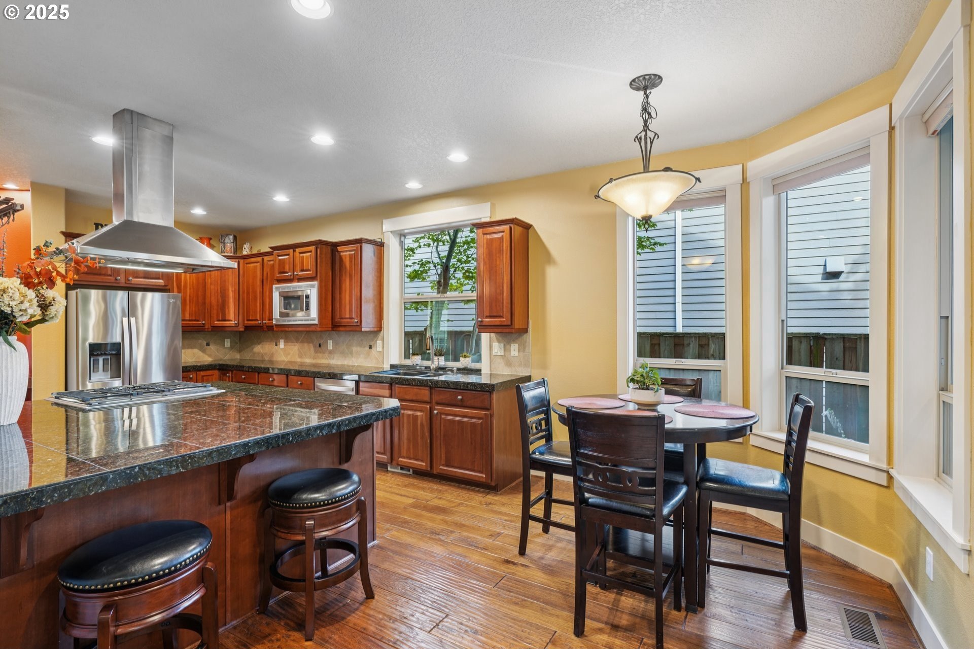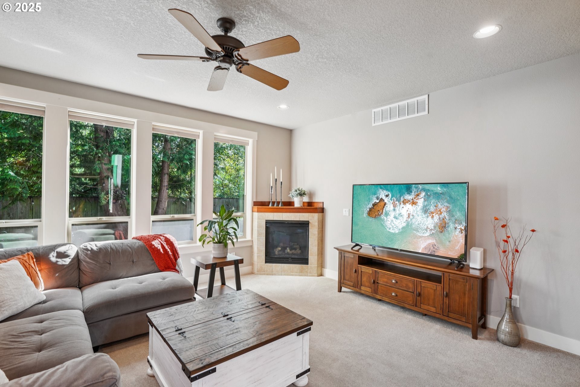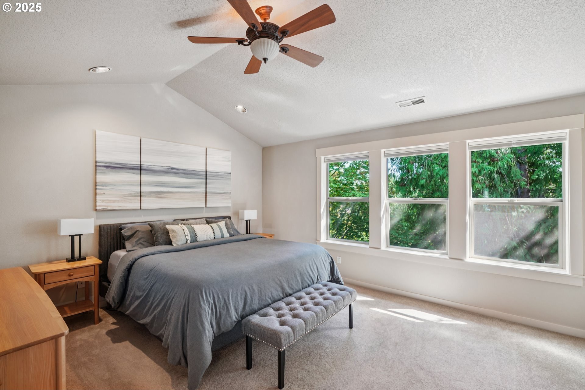 Nestled in a quiet cul-de-sac and backing to lush greenspace, this beautifully maintained home offers comfort, privacy, and sophisticated style. Step into the dramatic two-story foyer, where towering windows flood the space with natural light. The open-concept great room and formal dining area flow seamlessly into a gourmet kitchen with granite counters, tile backsplash, hand-scraped wood floors, and newer stainless appliances.Upstairs features three spacious bedrooms with vaulted ceilings, a versatile bonus room, and 2.5 baths. Premium wood finishes and soaring ceilings throughout create a sense of upscale elegance. The laundry room includes built-in cabinetry for added storage and organization. Modern conveniences include an Alexa-enabled smart thermostat for effortless climate control. Outside, enjoy your own private oasis with mature landscaping, stonework, and raised beds. The covered patio is enhanced by a 20' x 13' electric retractable awning, offering extended year-round enjoyment. Located on a private road with minimal traffic, just a block from Deer Creek Elementary and minutes from King City Community Park, with a playground, athletic fields, sports courts, and access to the beautiful Tualatin River. A rare find—luxury, privacy, and convenience all in one!