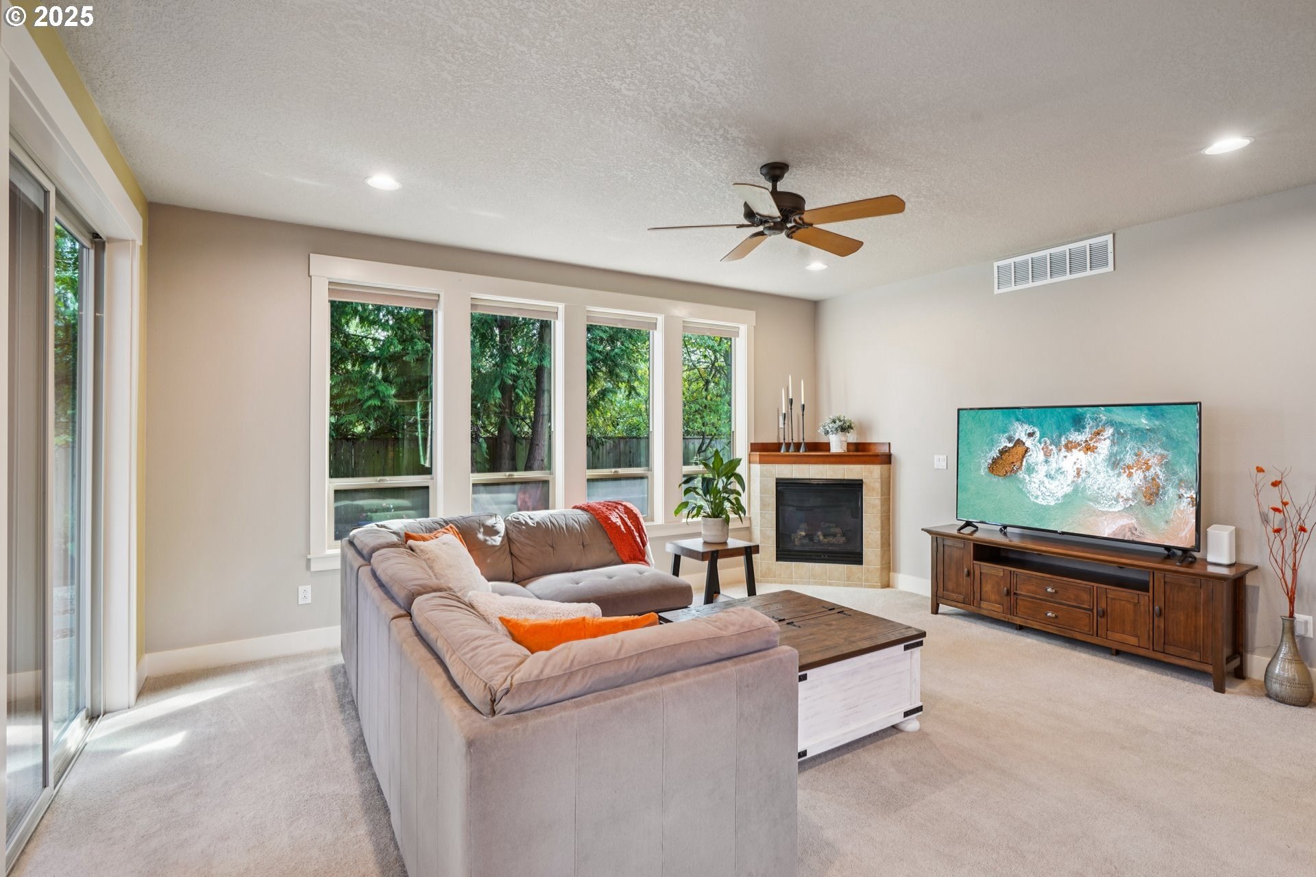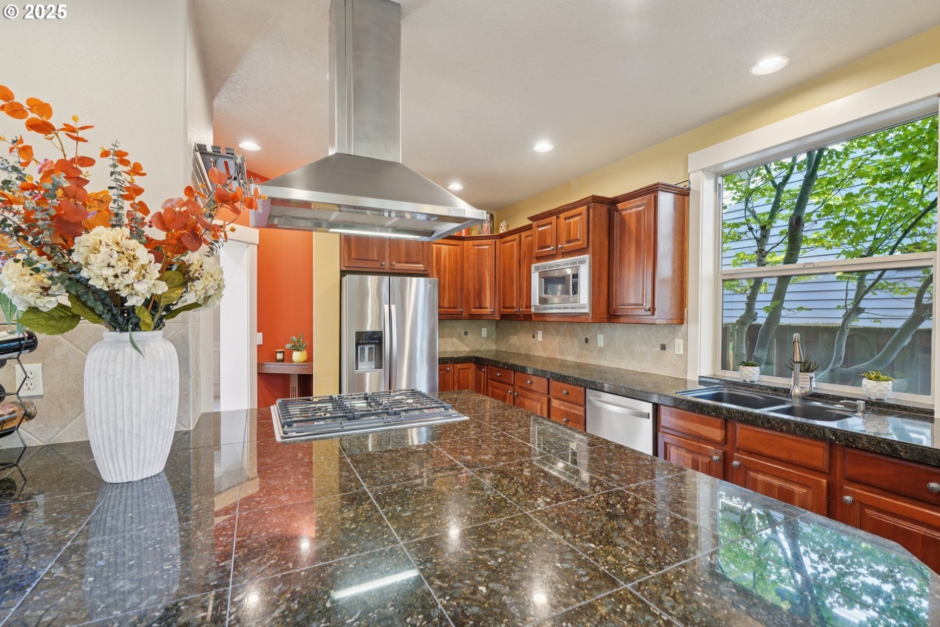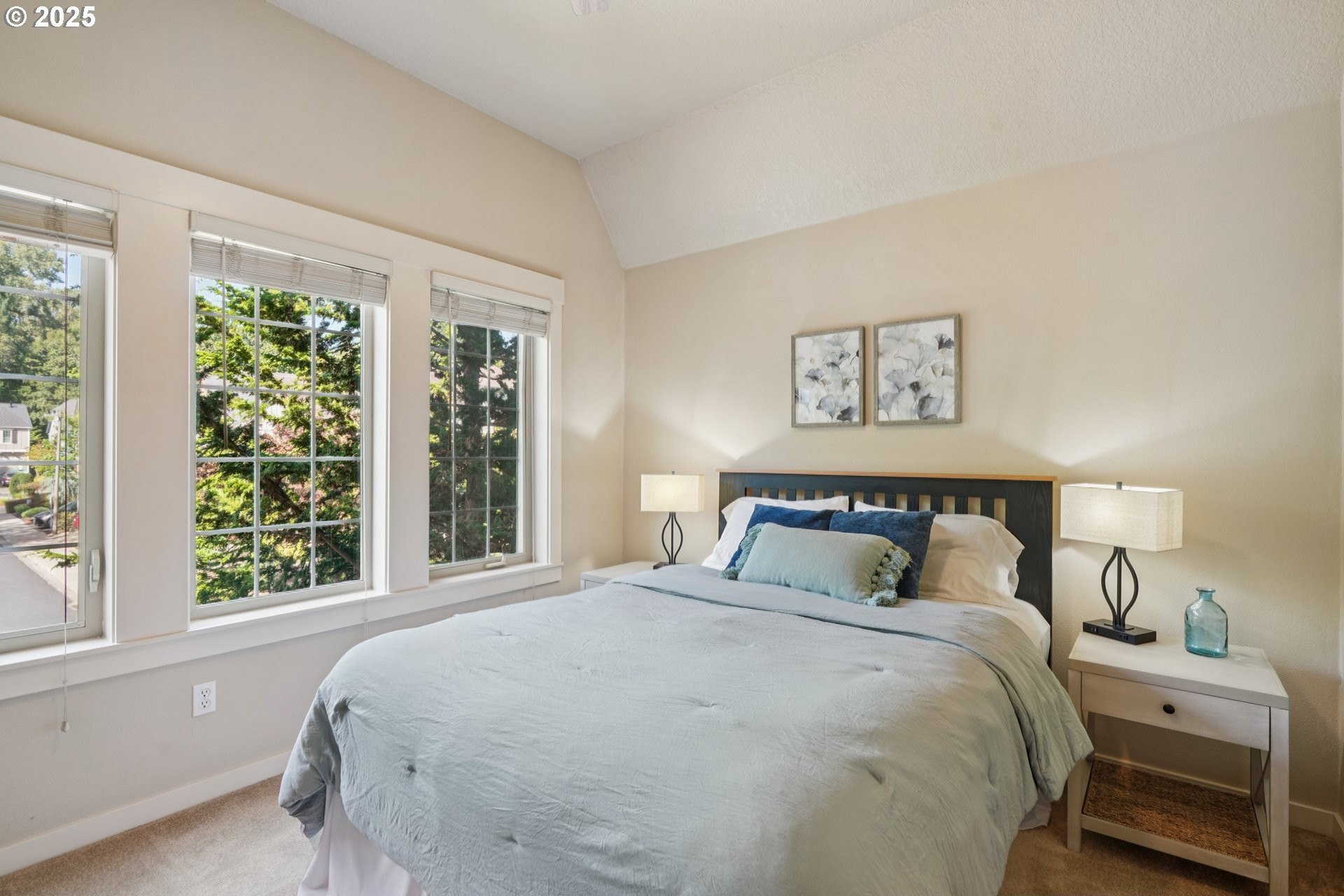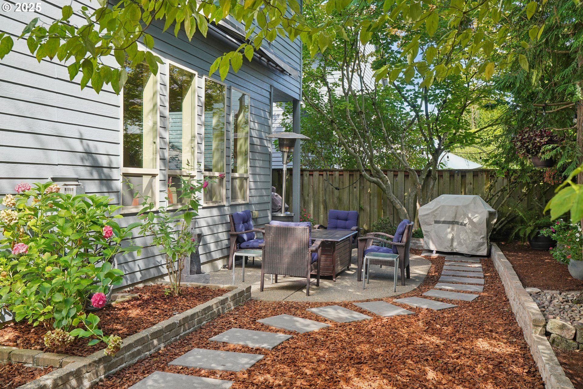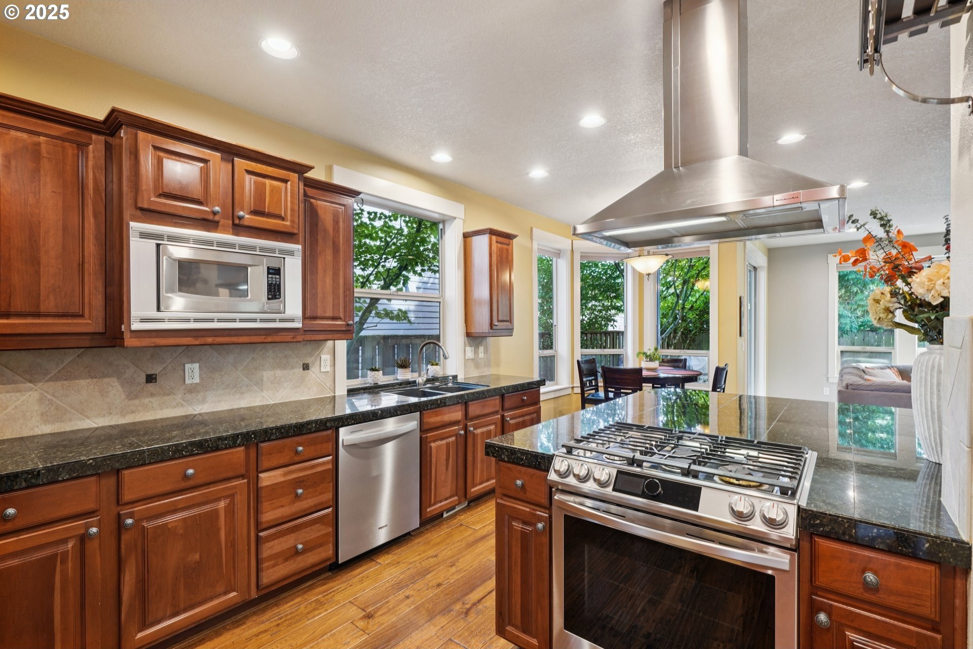 Nestled in a quiet cul-de-sac and backing to lush greenspace, this beautifully maintained home offers comfort, privacy, and sophisticated style. Step into the dramatic two-story foyer, where towering windows flood the space with natural light. The open-concept great room and formal dining area flow seamlessly into a gourmet kitchen with granite counters, tile backsplash, hand-scraped wood floors, and newer stainless appliances.Upstairs features three spacious bedrooms with vaulted ceilings, a versatile bonus room, and 2.5 baths. Premium wood finishes and soaring ceilings throughout create a sense of upscale elegance. The laundry room includes built-in cabinetry for added storage and organization. Modern conveniences include an Alexa-enabled smart thermostat for effortless climate control. Outside, enjoy your own private oasis with mature landscaping, stonework, and raised beds. The covered patio is enhanced by a 20' x 13' electric retractable awning, offering extended year-round enjoyment. Located on a private road with minimal traffic, just a block from Deer Creek Elementary and minutes from King City Community Park, with a playground, athletic fields, sports courts, and access to the beautiful Tualatin River. A rare find—luxury, privacy, and convenience all in one!