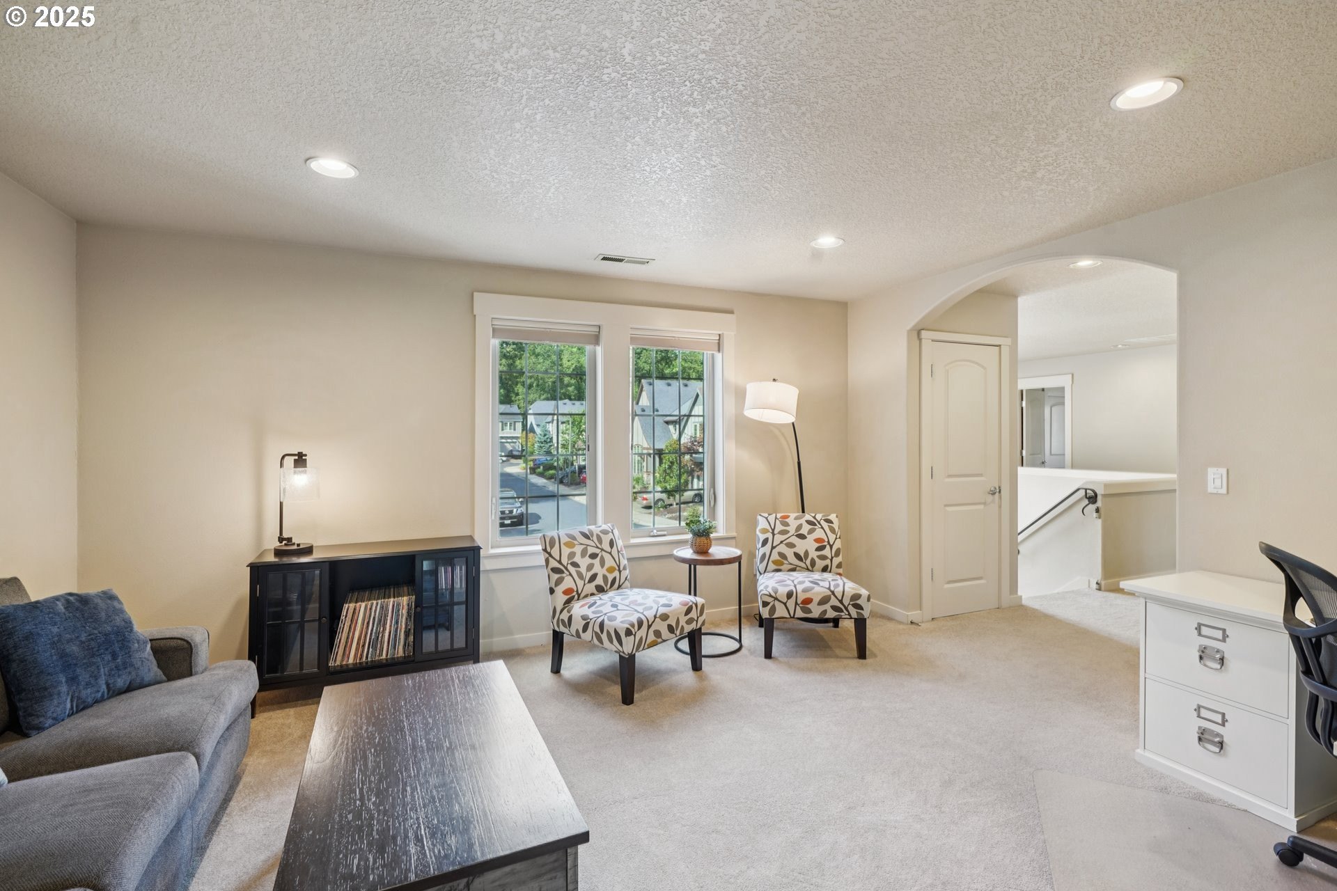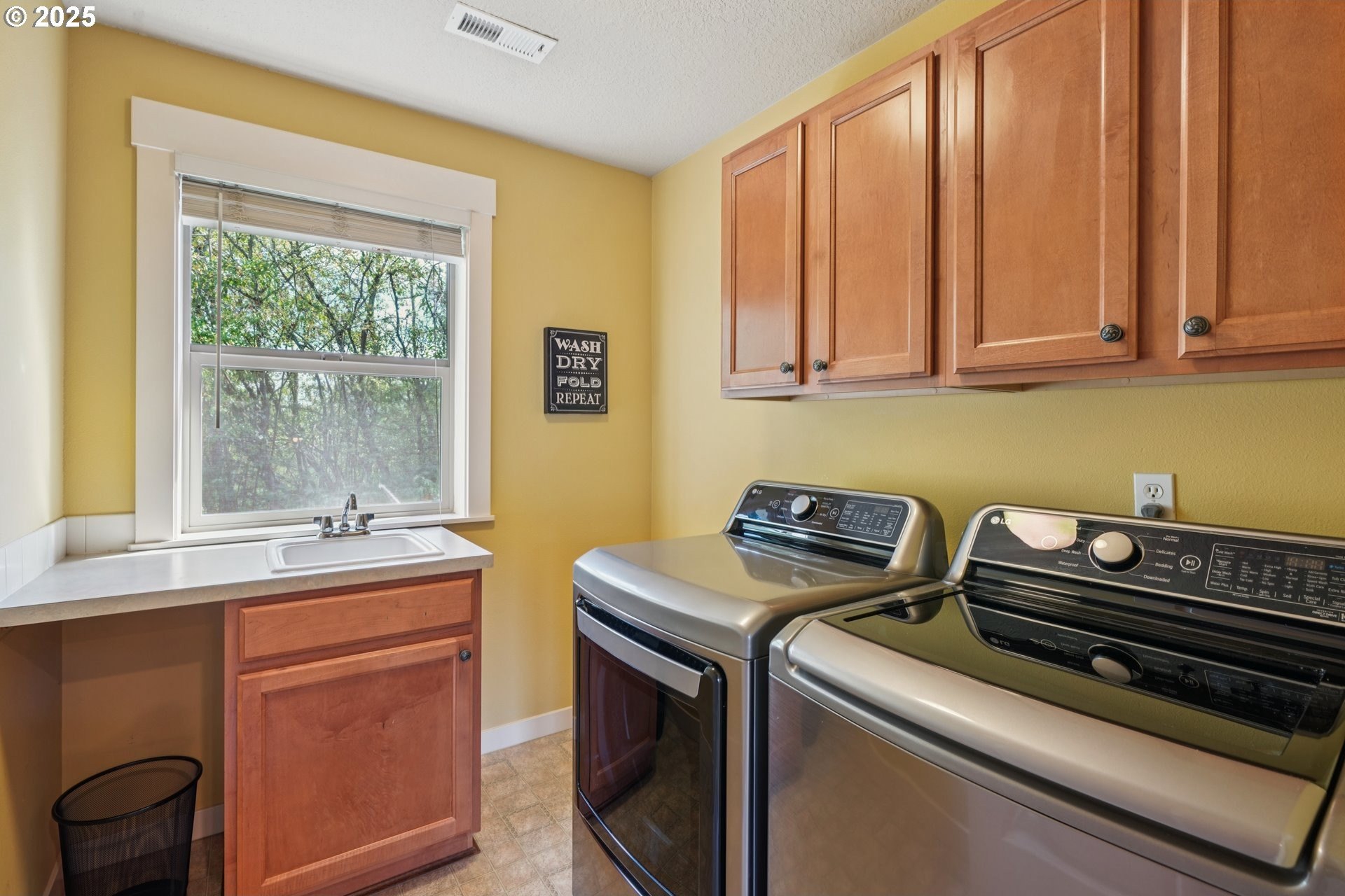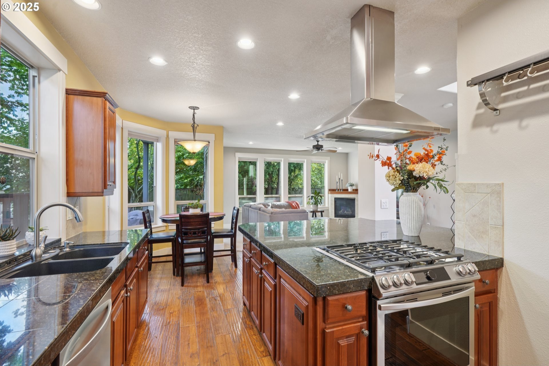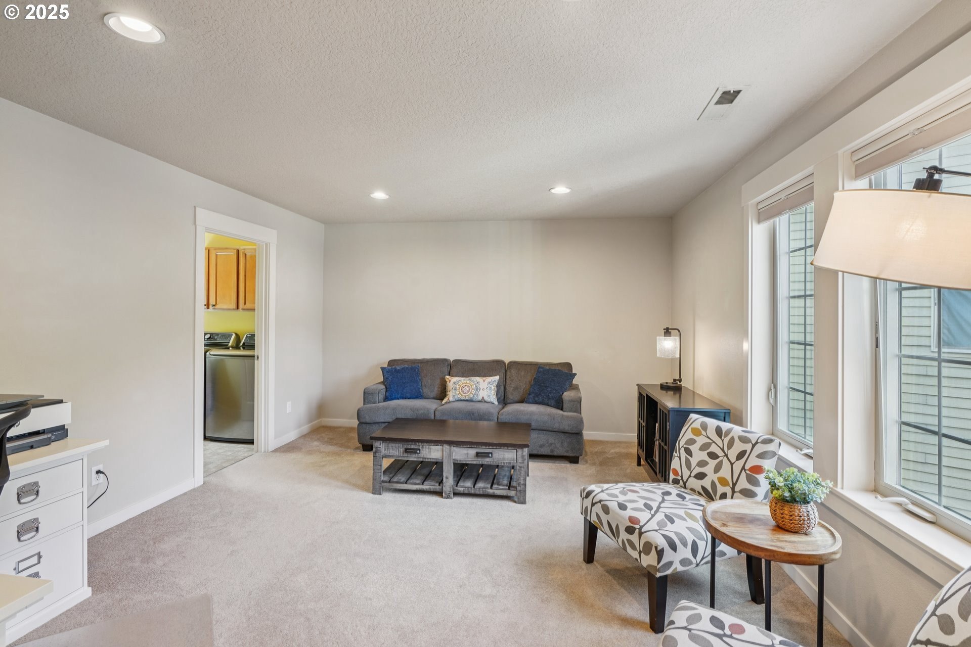 Nestled in a quiet cul-de-sac and backing to lush greenspace, this beautifully maintained home offers comfort, privacy, and sophisticated style. Step into the dramatic two-story foyer, where towering windows flood the space with natural light. The open-concept great room and formal dining area flow seamlessly into a gourmet kitchen with granite counters, tile backsplash, hand-scraped wood floors, and newer stainless appliances.Upstairs features three spacious bedrooms with vaulted ceilings, a versatile bonus room, and 2.5 baths. Premium wood finishes and soaring ceilings throughout create a sense of upscale elegance. The laundry room includes built-in cabinetry for added storage and organization. Modern conveniences include an Alexa-enabled smart thermostat for effortless climate control. Outside, enjoy your own private oasis with mature landscaping, stonework, and raised beds. The covered patio is enhanced by a 20' x 13' electric retractable awning, offering extended year-round enjoyment. Located on a private road with minimal traffic, just a block from Deer Creek Elementary and minutes from King City Community Park, with a playground, athletic fields, sports courts, and access to the beautiful Tualatin River. A rare find—luxury, privacy, and convenience all in one!