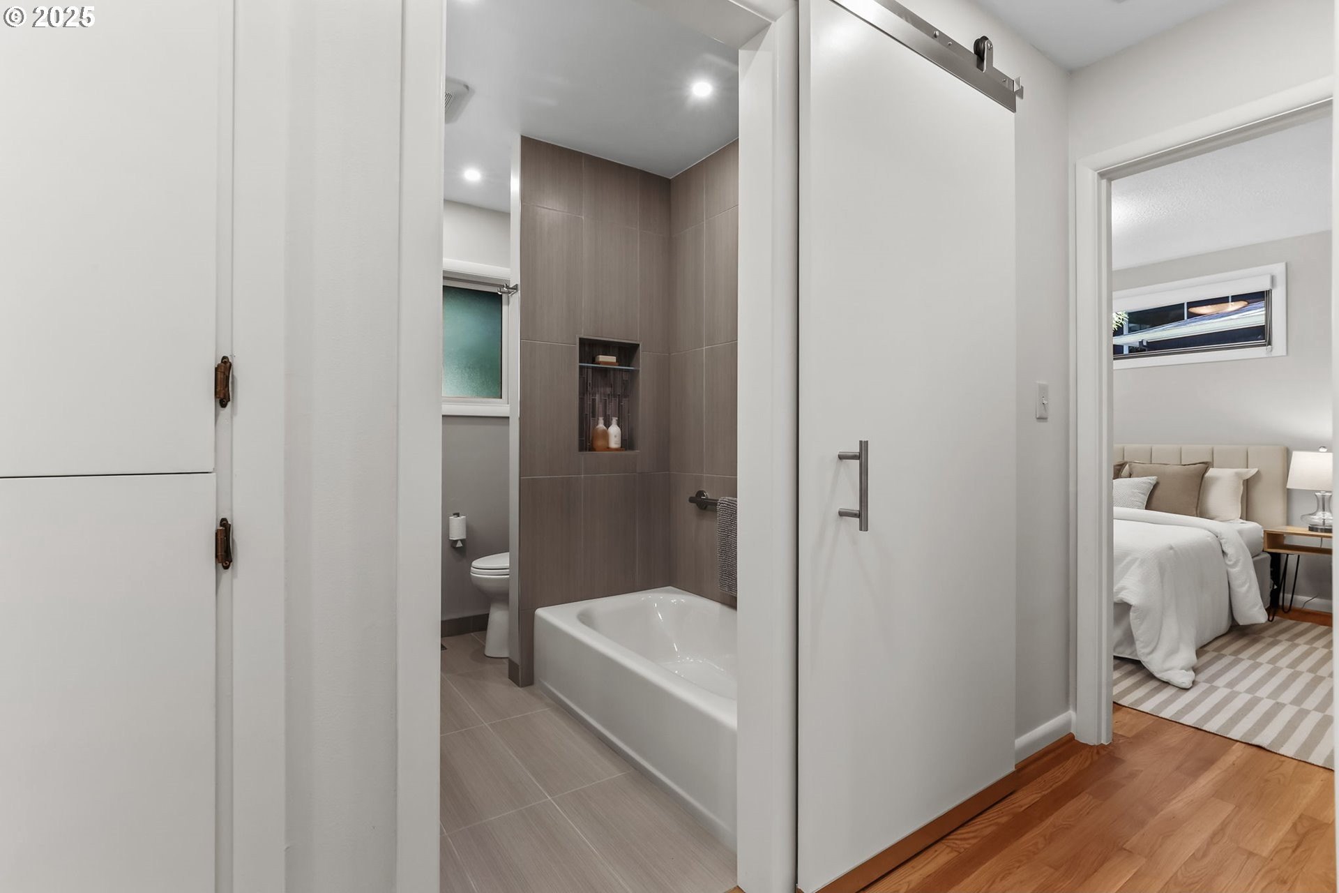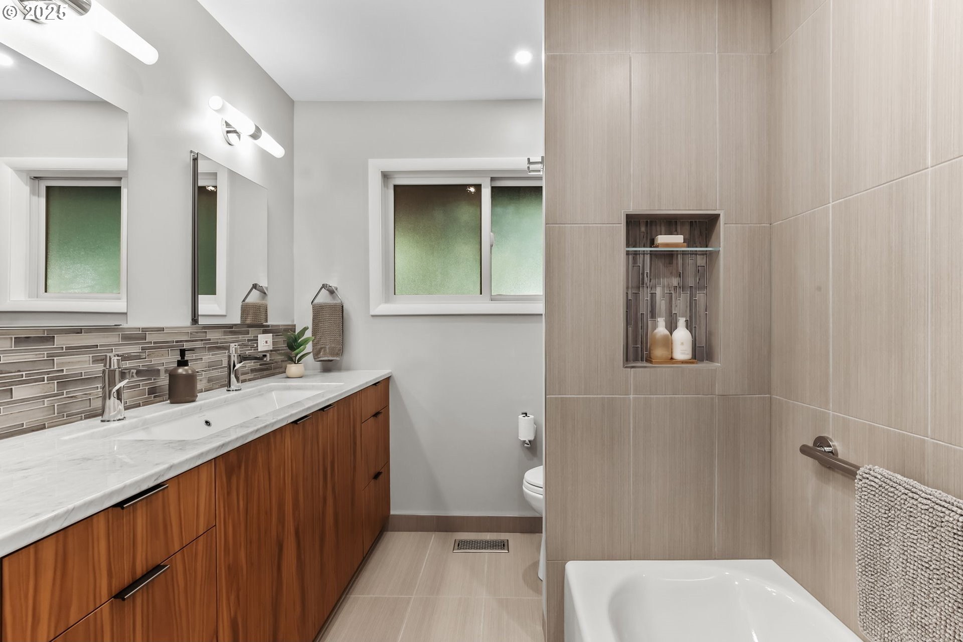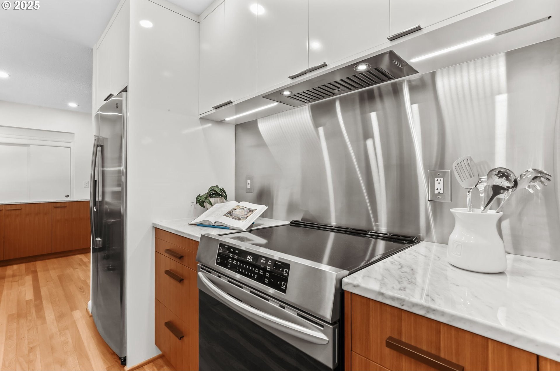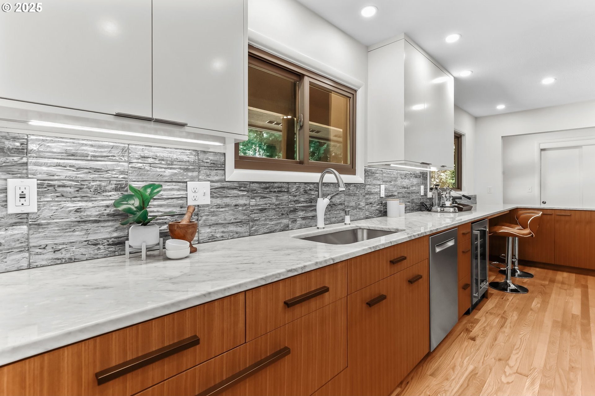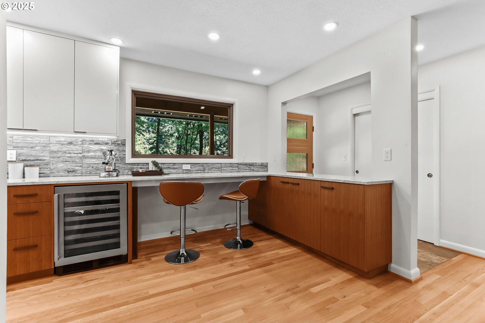 Mid-century modern character meets today’s upgrades in this single-level home on nearly half an acre in SW Portland’s Arnold Creek. At 11313 SW 33rd Ave, quality has been prioritized in every detail— making thoughtful design and craftsmanship the true measure, not square footage. Inside, newly refinished white oak hardwood floors extend through the main living and dining spaces, enhanced by recessed lighting and a classic wood-burning fireplace. A large sliding glass door connects the interior to the outdoors, filling the home with light and opening onto a beautiful stamped concrete patio — an extension of the living space perfect for gatherings or quiet mornings. The kitchen has been fully updated with marble countertops, custom cabinetry, stainless steel refrigerator, induction range with oven, and a built-in wine refrigerator. Every upgrade reflects an investment in durability and timeless appeal rather than trend. The entry features new copper slate flooring, while the updated bathroom includes custom cabinetry, tile work, and modern fixtures. Renewal by Andersen windows and a tankless water heater add efficiency to the home’s comfort. Set on a corner lot just under half an acre, the property offers ample privacy, mature landscaping, and generous off-street parking. The oversized two-car garage provides additional storage and workspace. This home embodies the best of mid-century modern living: single-level design, seamless indoor-outdoor connection, and a focus on materials that last. With updates that rival much larger homes, it delivers a rare combination of style, function, and lot size—all in a sought-after Portland location. [Home Energy Score = 2. HES Report at https://rpt.greenbuildingregistry.com/hes/OR10045171]