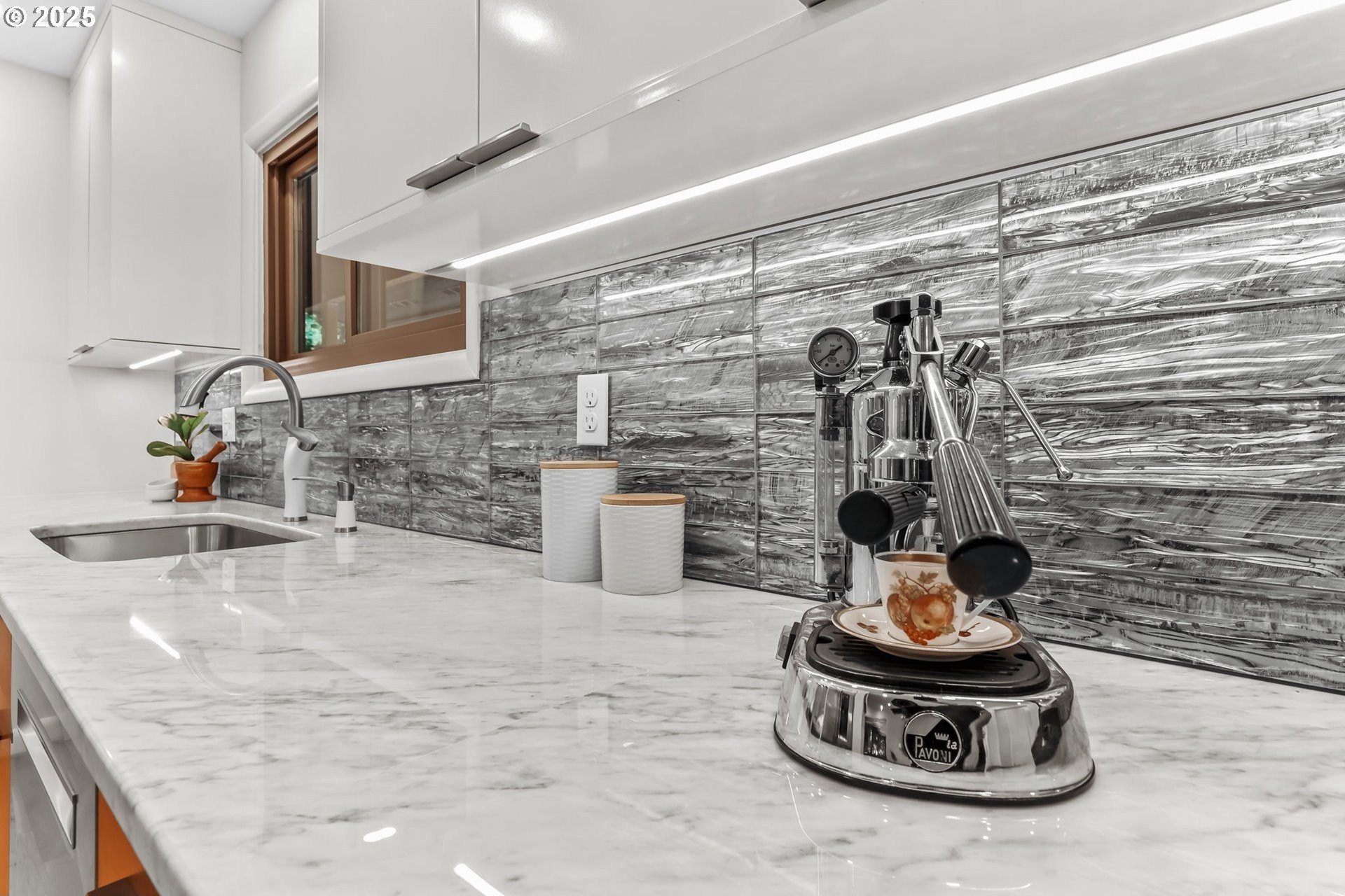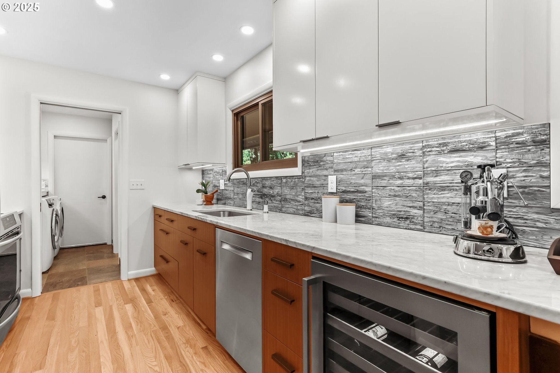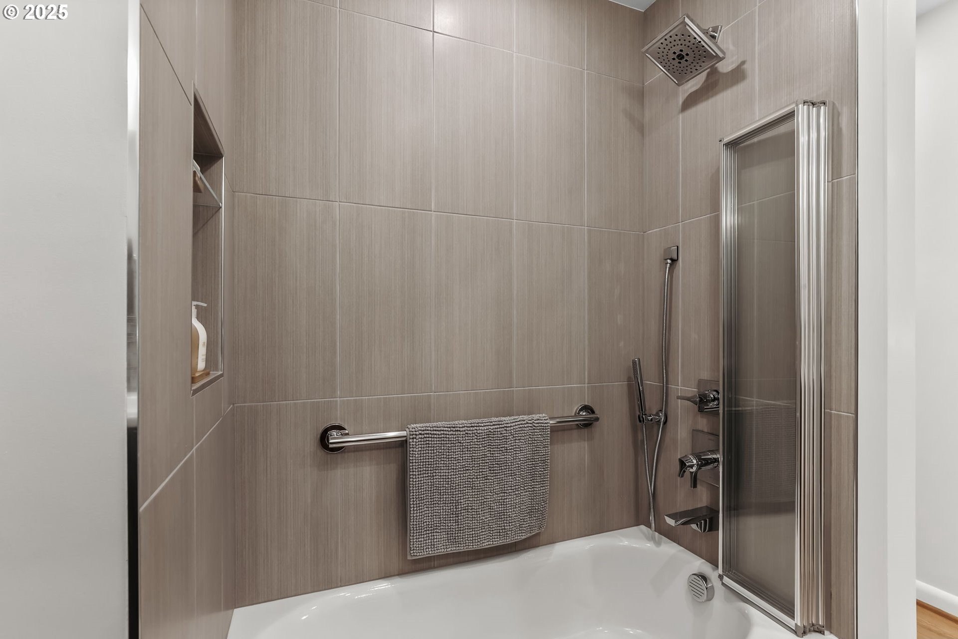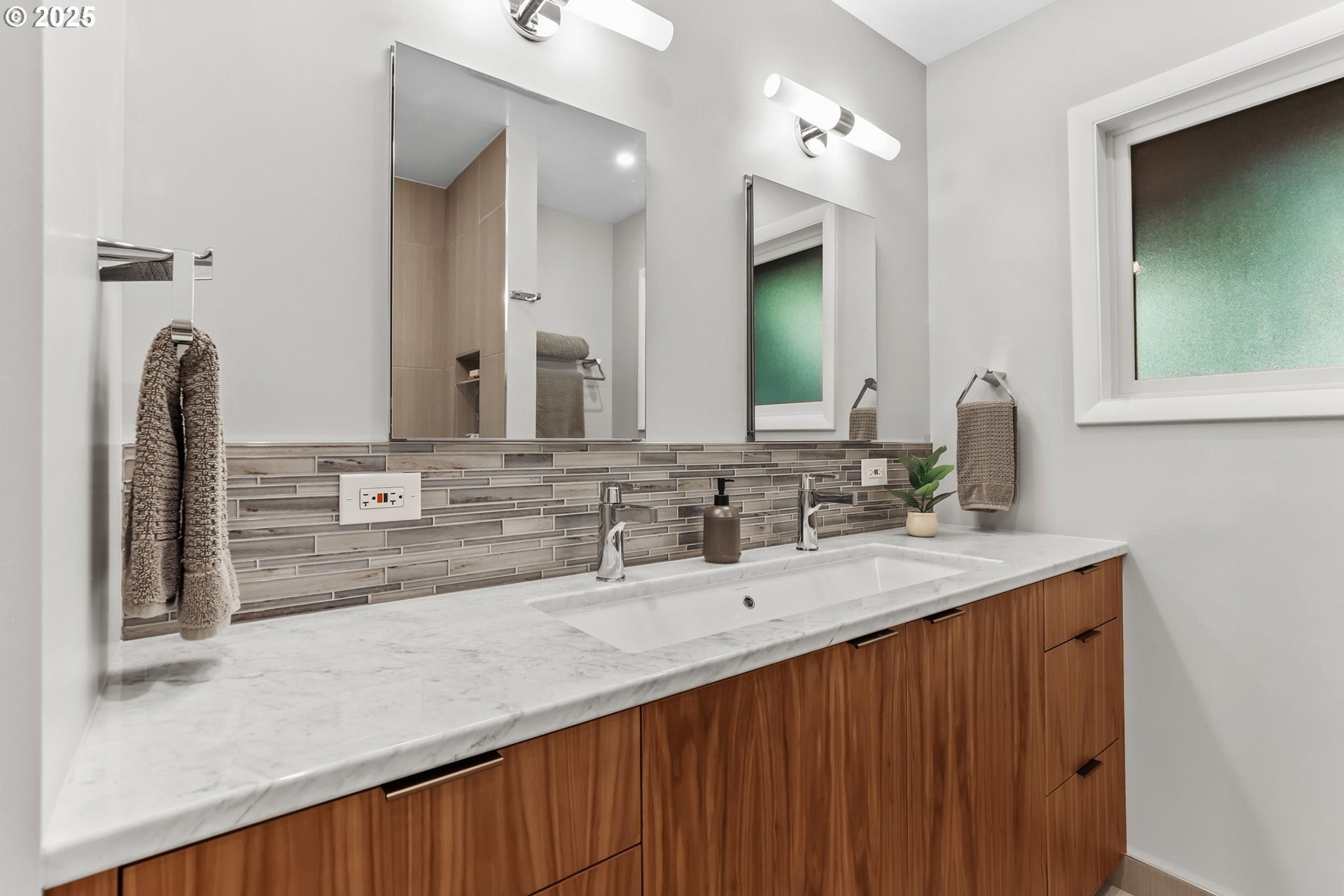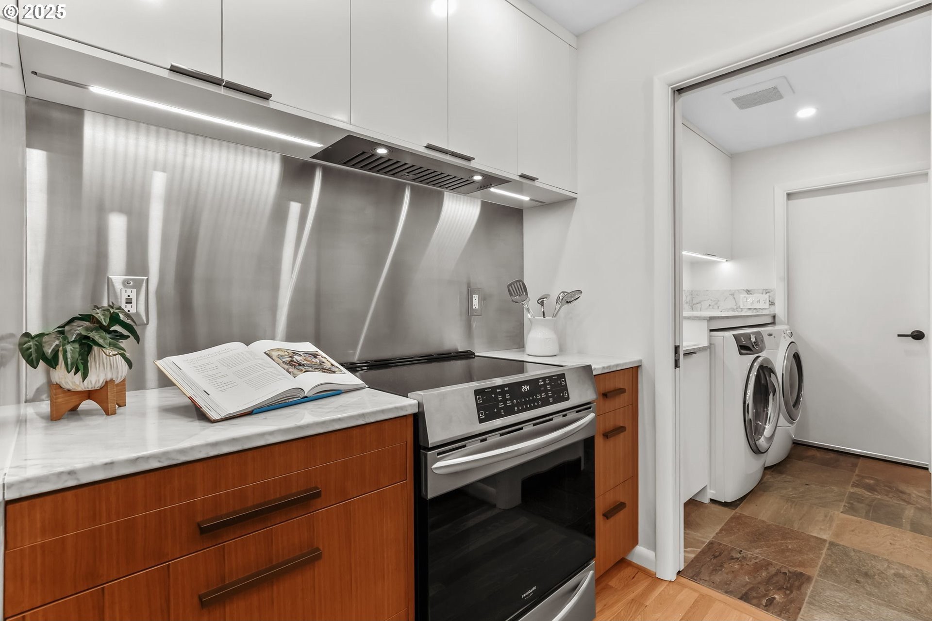 Mid-century modern character meets today’s upgrades in this single-level home on nearly half an acre in SW Portland’s Arnold Creek. At 11313 SW 33rd Ave, quality has been prioritized in every detail— making thoughtful design and craftsmanship the true measure, not square footage. Inside, newly refinished white oak hardwood floors extend through the main living and dining spaces, enhanced by recessed lighting and a classic wood-burning fireplace. A large sliding glass door connects the interior to the outdoors, filling the home with light and opening onto a beautiful stamped concrete patio — an extension of the living space perfect for gatherings or quiet mornings. The kitchen has been fully updated with marble countertops, custom cabinetry, stainless steel refrigerator, induction range with oven, and a built-in wine refrigerator. Every upgrade reflects an investment in durability and timeless appeal rather than trend. The entry features new copper slate flooring, while the updated bathroom includes custom cabinetry, tile work, and modern fixtures. Renewal by Andersen windows and a tankless water heater add efficiency to the home’s comfort. Set on a corner lot just under half an acre, the property offers ample privacy, mature landscaping, and generous off-street parking. The oversized two-car garage provides additional storage and workspace. This home embodies the best of mid-century modern living: single-level design, seamless indoor-outdoor connection, and a focus on materials that last. With updates that rival much larger homes, it delivers a rare combination of style, function, and lot size—all in a sought-after Portland location. [Home Energy Score = 2. HES Report at https://rpt.greenbuildingregistry.com/hes/OR10045171]