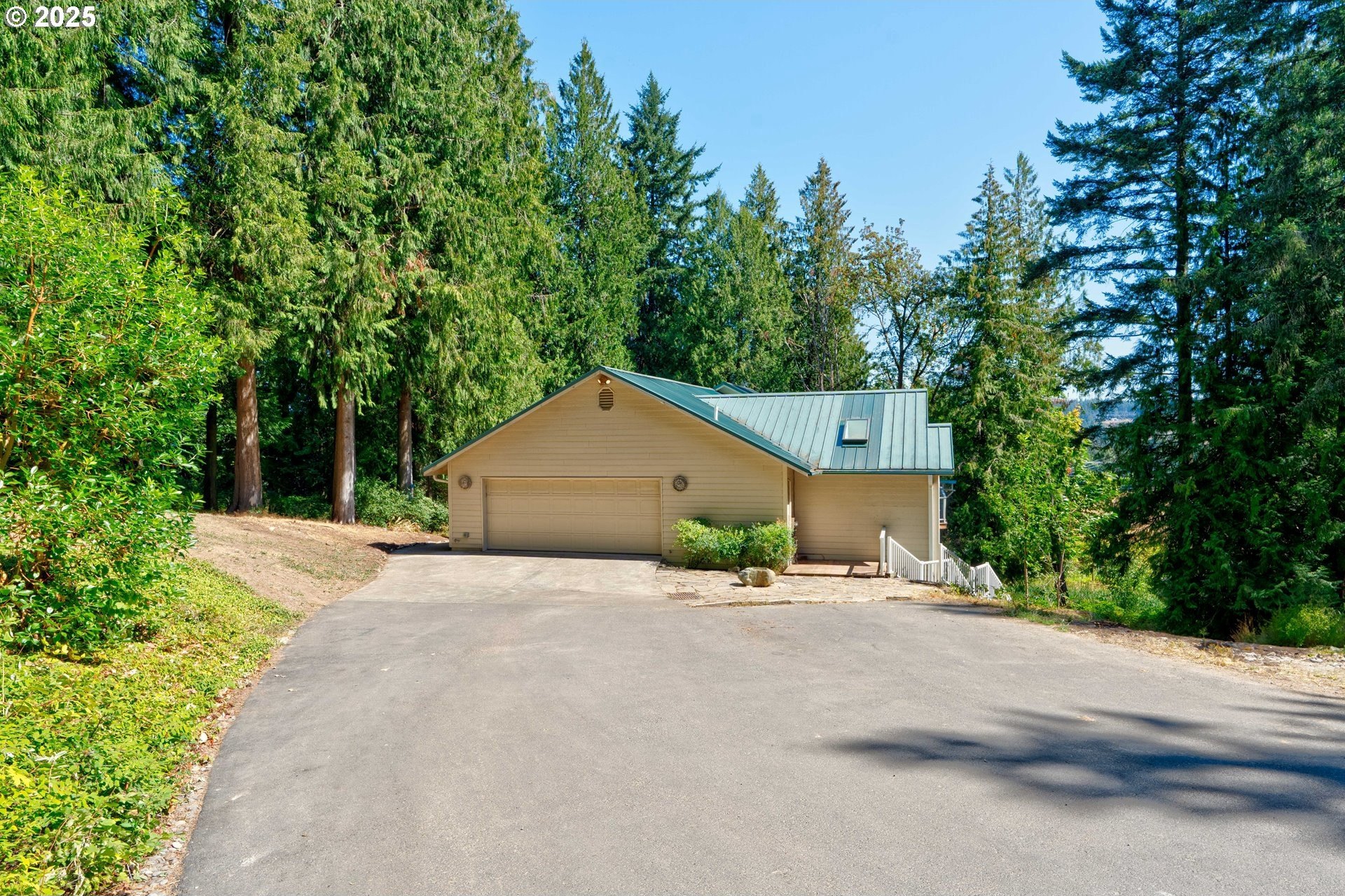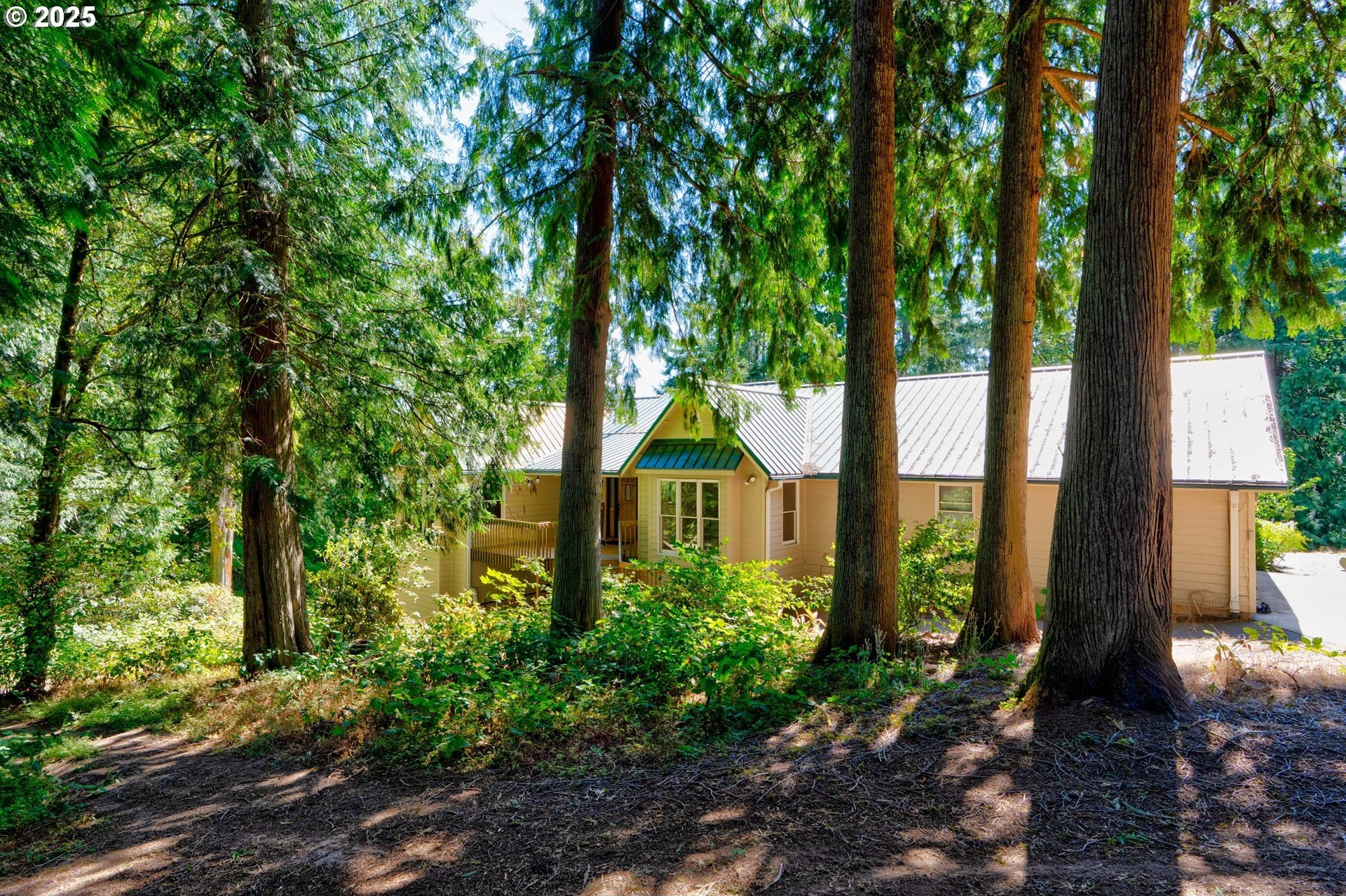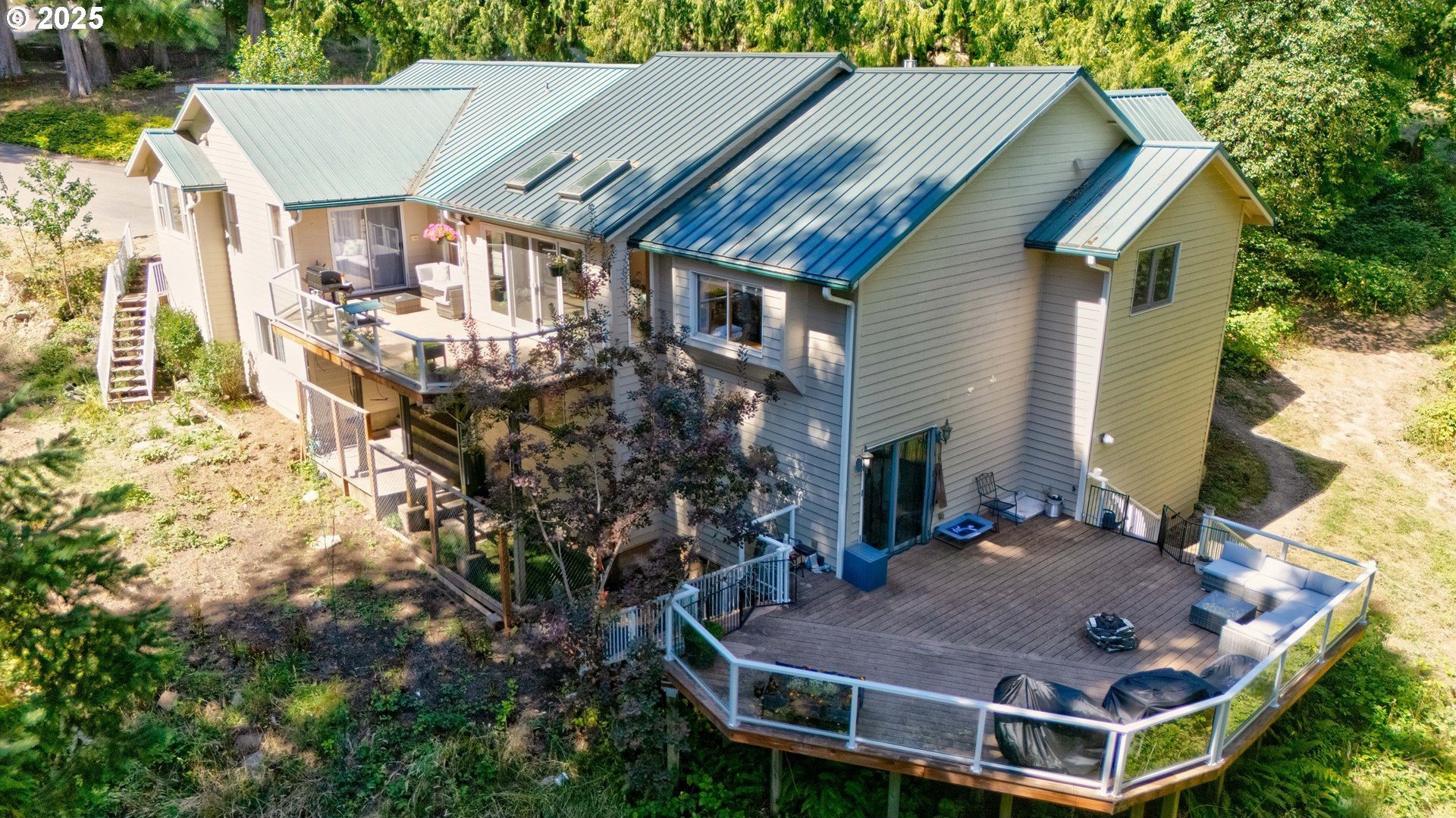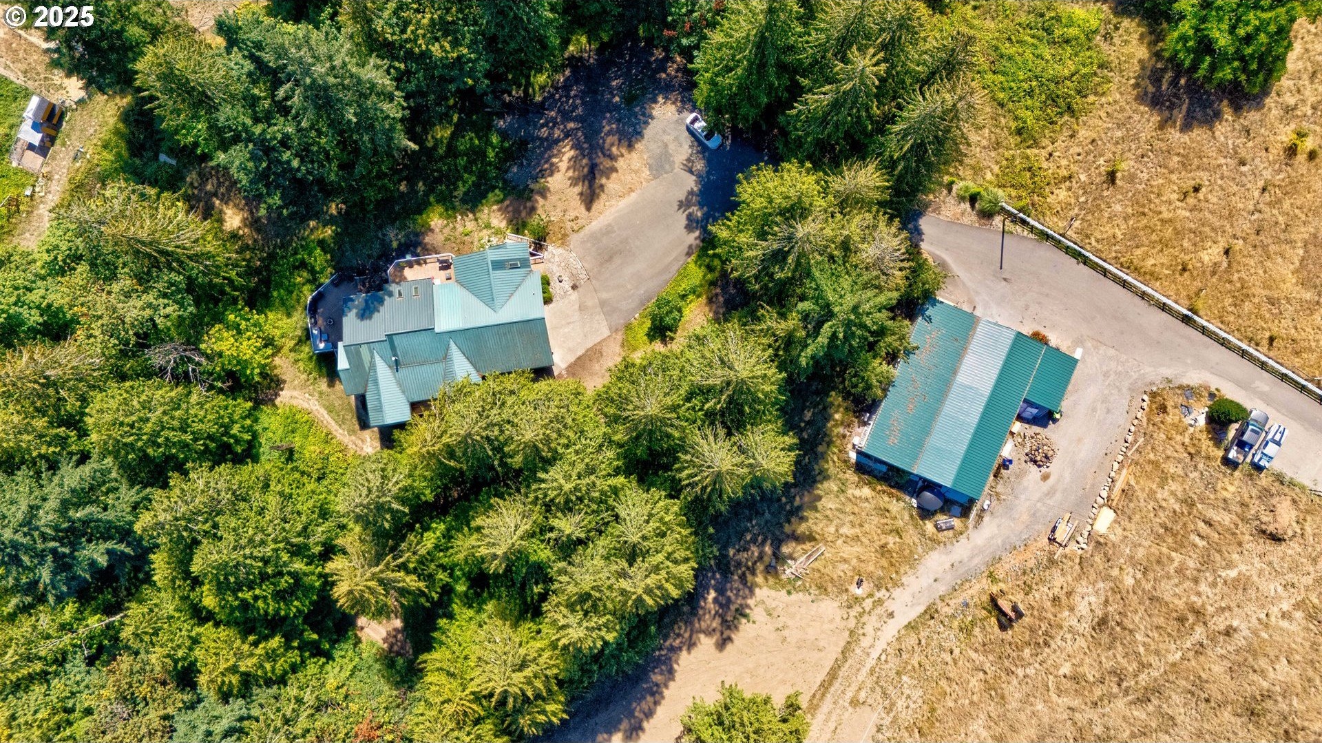 A gardener’s paradise awaits on 19.93 acres across 2 tax lots, offering peaceful seclusion with views of Mt. Hood, rolling hills, mature trees, and a private pond. This custom 4-bedroom, 4-bath home features vaulted ceilings, skylights, and large windows that fill the living spaces with natural light. The kitchen includes a center island, built-ins, and a nook with Mt. Hood views opening to a sunny multi-level deck. A daylight basement adds a second kitchen, gas fireplace, bonus room, and direct yard access. The full downstairs kitchen and separate entrance make it perfect for dual living. Outdoors, enjoy room to roam, garden, or keep animals with 2 stalls/structures. A newly remodeled 2,640 sq ft shop provides a kitchen, bathroom, storage, and polyurethane-coated floors, plus 800-amp power and a 5,000-gallon cistern. With AC, gas heat, tankless water heater, and updated septic line, this property offers unlimited potential—just minutes from town.