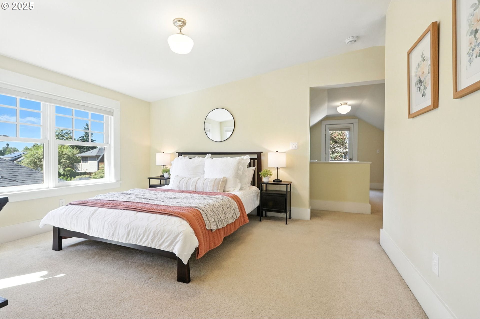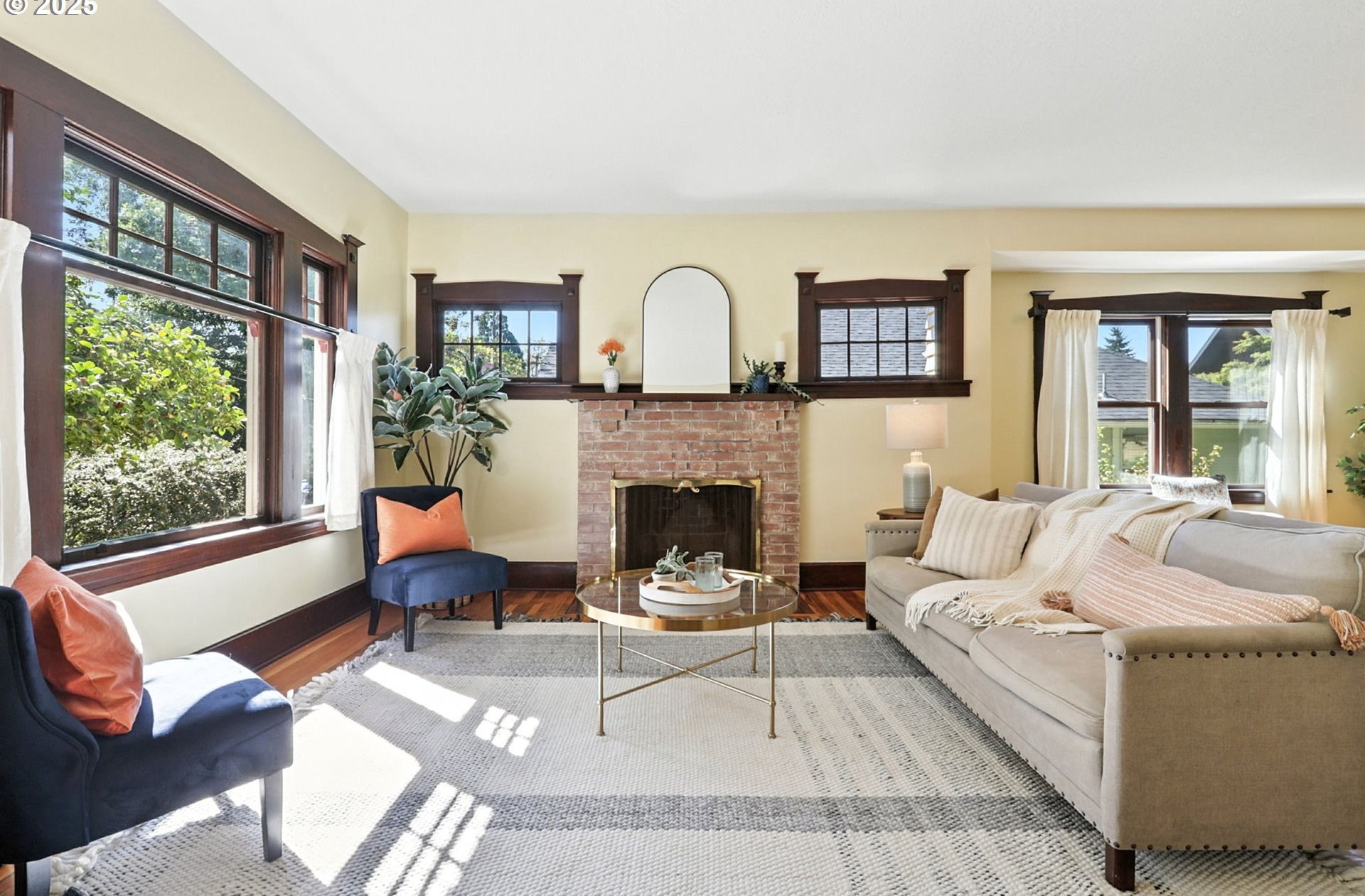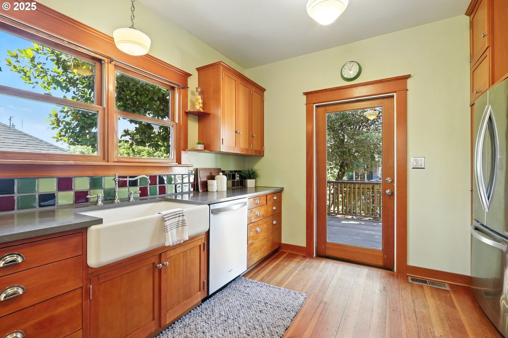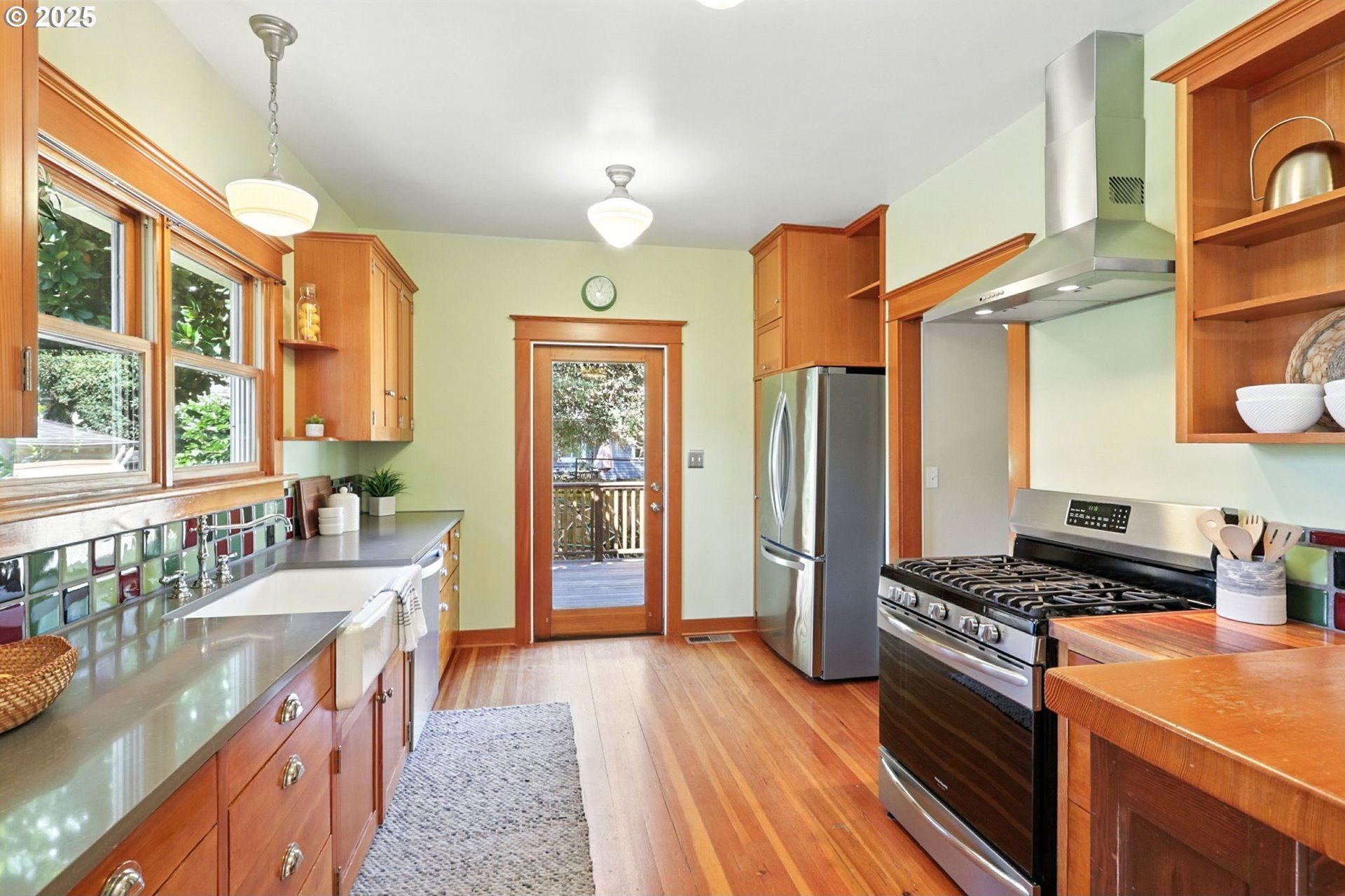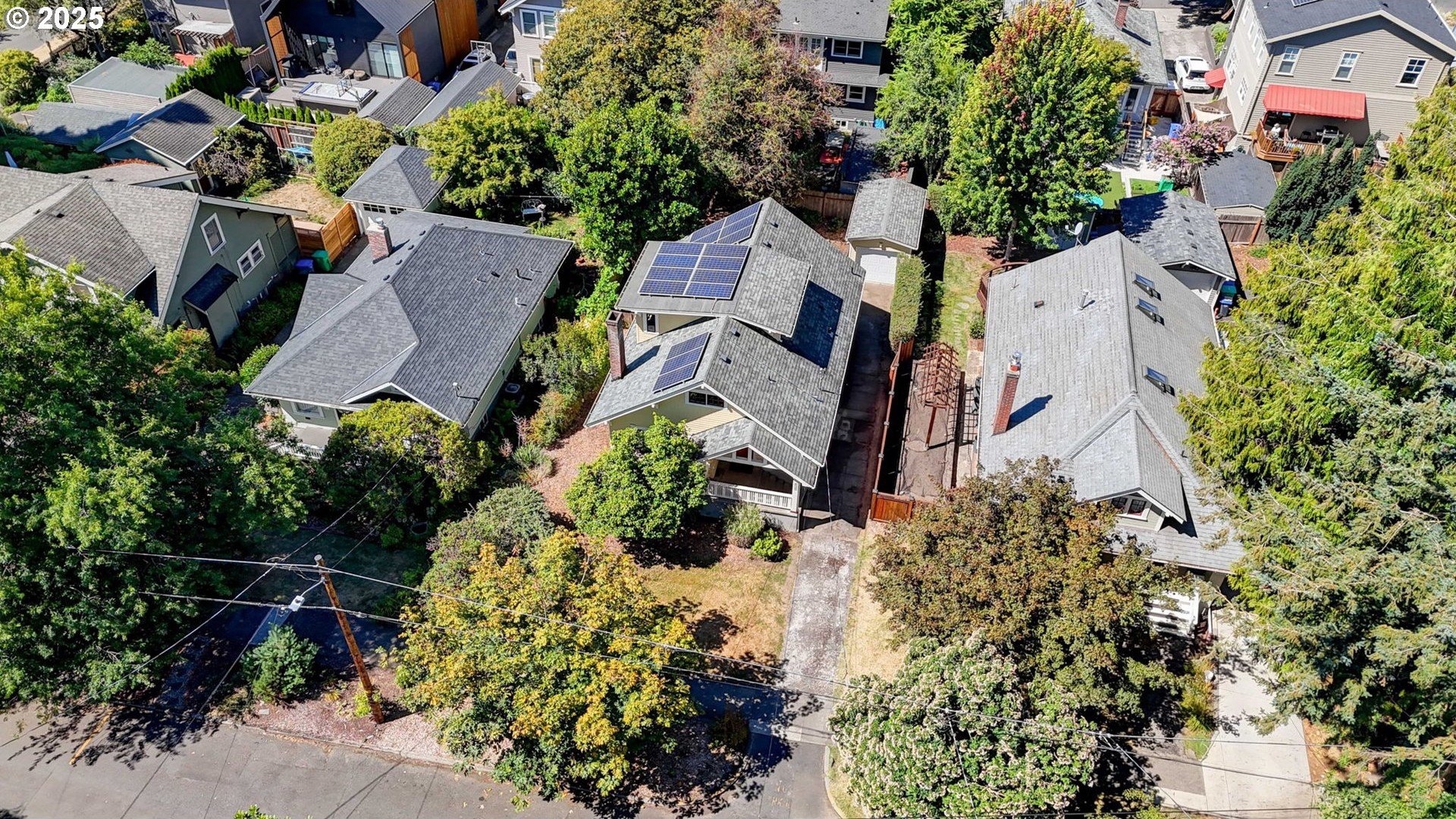 This fully updated and remodeled Craftsman Bungalow combines timeless charm with modern efficiency—including paid-off solar panels, EV charging ready, updated plumbing and electrical (2008), earthquake retrofit, and radon mitigation system. Nestled at the base of Alameda Ridge in the highly sought-after Rose City Park neighborhood, this home blends classic character with contemporary convenience.Step inside to find gorgeous oak floors throughout the main level and fir floors in the kitchen. The spacious living and dining rooms showcase rare unpainted woodwork, a stunning wood-burning fireplace, and abundant natural light. The remodeled kitchen pairs vintage charm with modern finishes, featuring solid wood cabinets, quartz and butcher block countertops, stainless steel appliances, and a stylish tile backsplash. A generous back deck—just off the kitchen—is perfect for morning coffee or entertaining.The main level includes two large bedrooms and a full bath with a clawfoot tub and elegant tile flooring. Upstairs, the primary suite offers a full bath, tranquil ambiance, and its own deck overlooking the backyard. A second upstairs bedroom makes a great nursery or home office.The finished lower level offers a flexible family room or fourth bedroom with a closet and egress window, a third full bath, spacious laundry/utility room with cabinetry and sink, and a cozy nook ideal for a second office. With a separate exterior entrance, this level has strong ADU potential.Enjoy a fenced yard- that has received it's Backyard Habitat Certificate, and a detached single-car garage—all just minutes from parks, shops, restaurants, and the Hollywood Farmers Market.