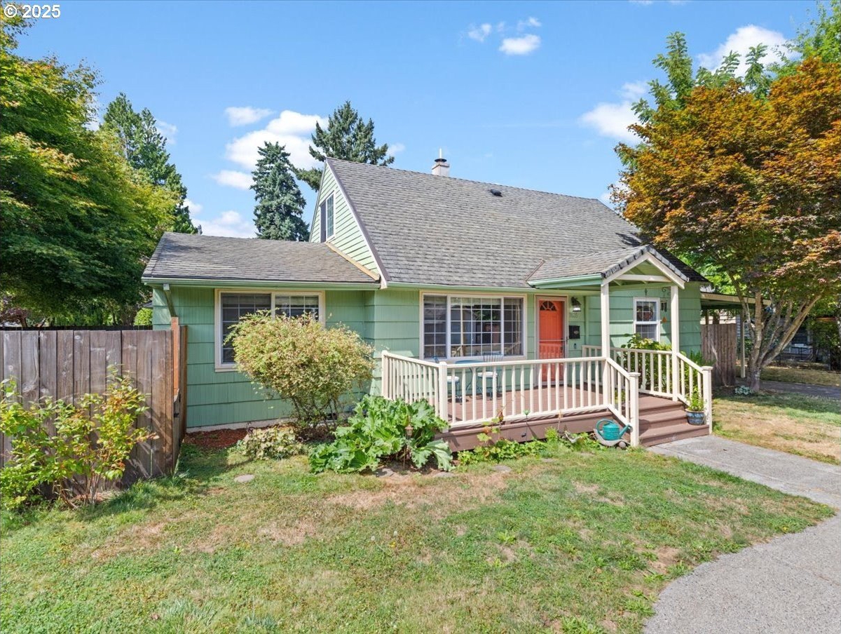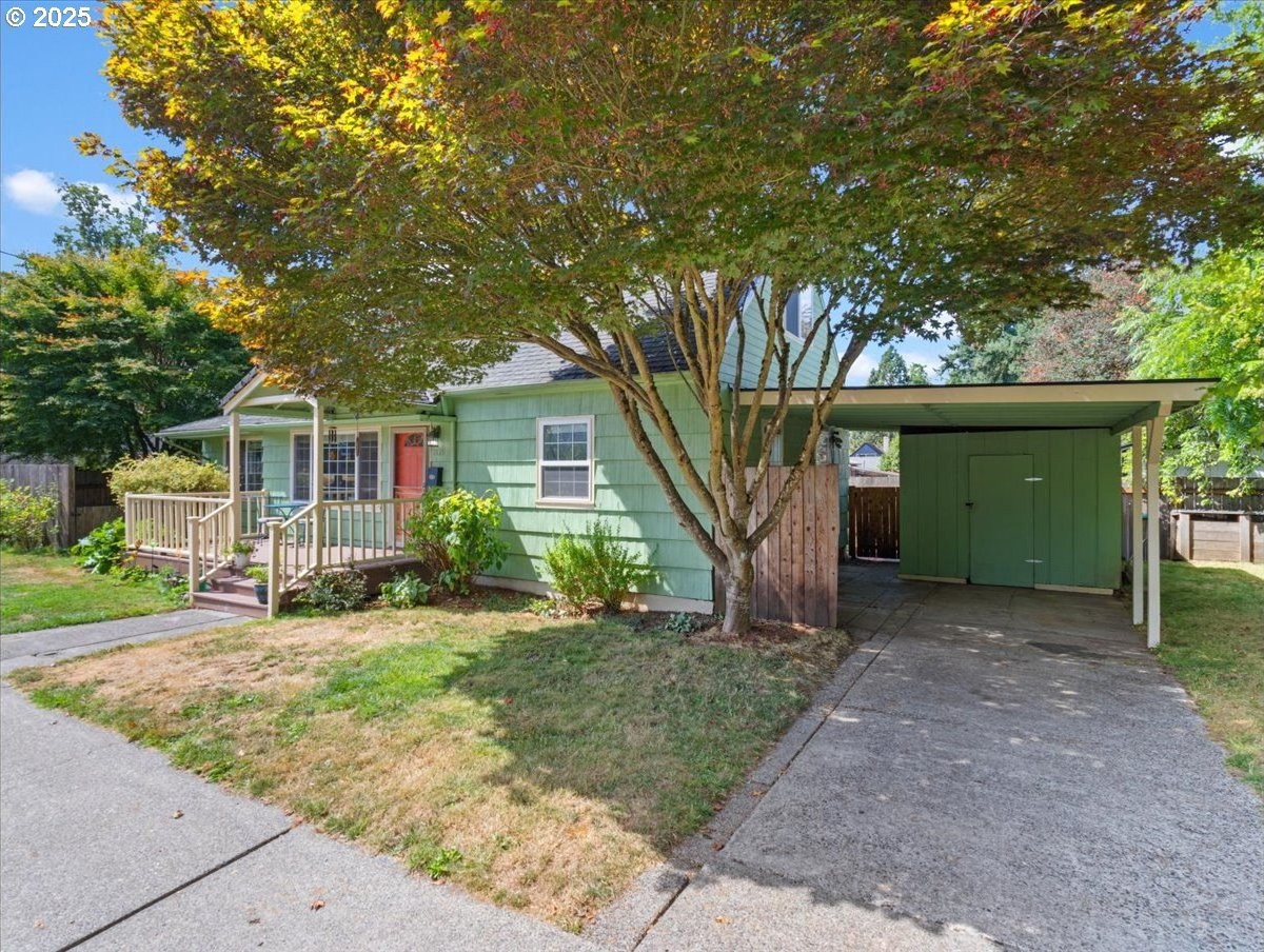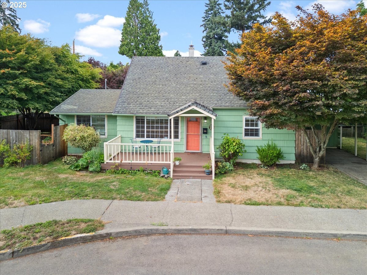 Step into a truly special home bursting with charm, character, and an abundance of natural light. Nestled on a beautifully landscaped, fenced corner lot, this 4-bedroom, 1.5-bath vintage gem is filled with sunshine, soul, and smart updates throughout. Step into a cheerful living room where sunlight streams through large picture-framed windows, bouncing off warm beech hardwood floors and highlighting the vintage knotty pine paneling. High ceilings and newer paint make the space feel open, airy, and welcoming. The dining room is just as delightful, glowing with light from three windows and a glass door that opens to the side yard. With updated lighting, a charming picture-framed ceiling, and beautiful hardwoods, it's the perfect place for cozy meals or joyful gatherings. The kitchen shines with personality and function: a garden window lets in even more sunshine, while updated appliances (Frigidaire fridge, LG dishwasher, and GE oven), a decorative backsplash, and plentiful cabinetry make everyday cooking feel like a treat. Fresh paint and new hardware keep it feeling crisp and clean. Two bright main-floor bedrooms feature beech hardwood floors, newer windows, fresh paint, and one with custom wainscoting. The main bath has been thoughtfull updated with slate tile flooring, a cast-iron tub, a dual-flush toilet, and modern fixtures.Upstairs, the spacious primary bedroom features a large picture window with treetop and garden views, wall-to-wall carpet, and a charming half bath with newer flooring, fixtures, and wainscoting. A fourth bedroom includes built-ins, a newer Hunter ceiling fan, and lots of natural light. The sunny yard is a gardener’s dream—brimming with blueberries, huckleberries, rhubarb, tomatoes, and fruit trees. Enjoy raised beds, a newer patio (2025), BBQ pad, compost bins, storage shed with power, and a carport.With newer Hardiplank siding upper level, newer cedar shake backside lower portion of the home, and newer window casings south side of the home.
