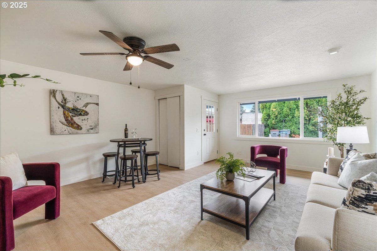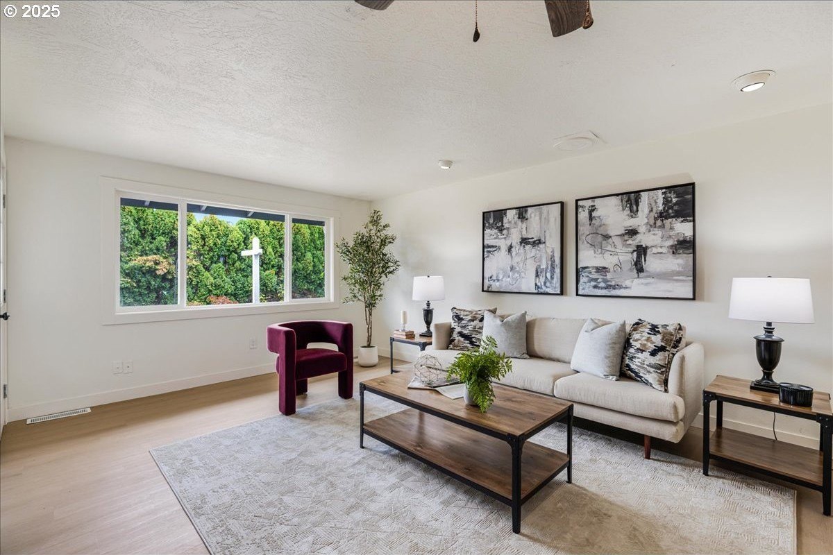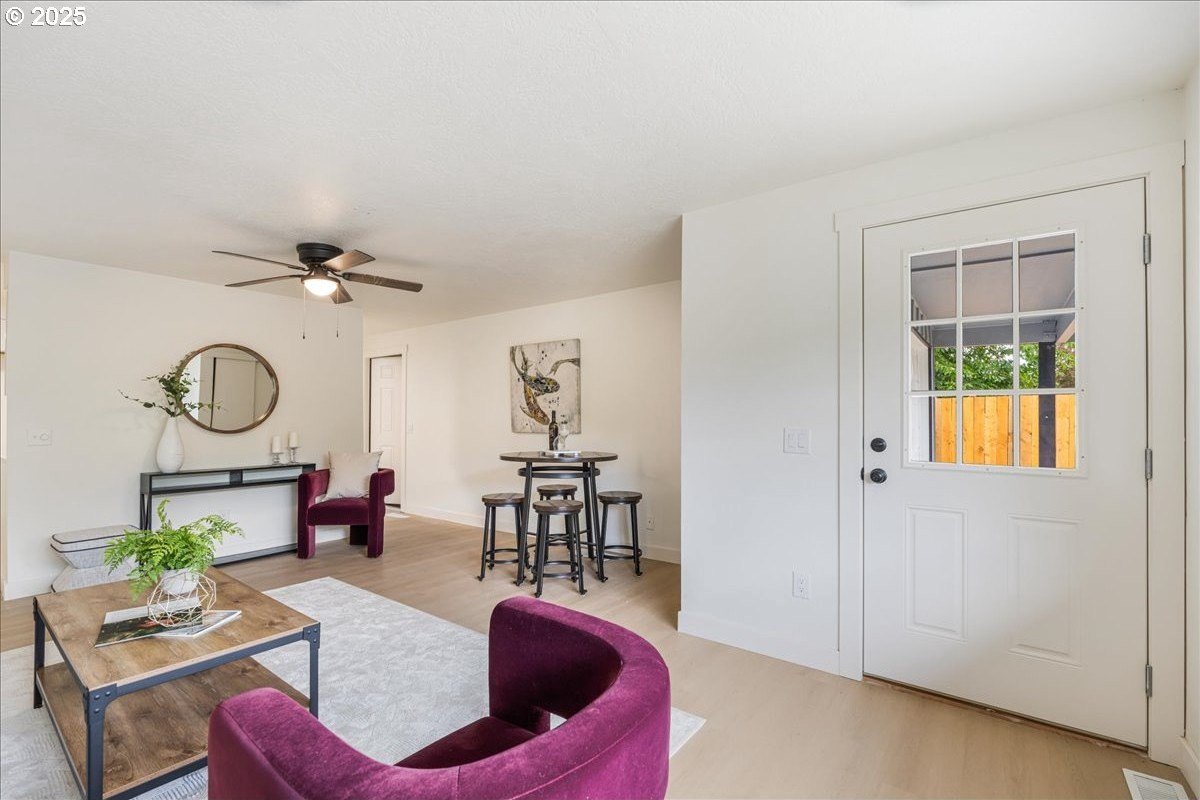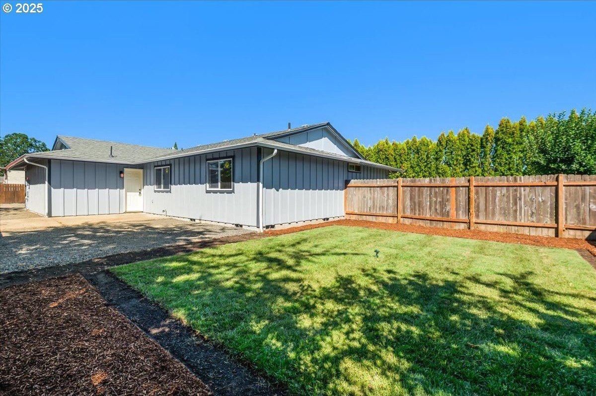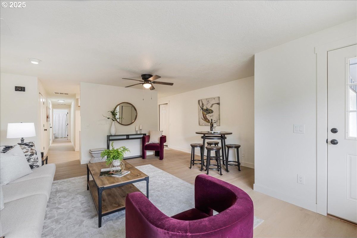 Updated townhouse with tasteful new features near schools, parks and close to Downtown McMinnville. This single-level home has been recently renovated with new LVP flooring, interior and exterior paint, trimwork, carpet, bathrooms, and a beautiful kitchen remodel. The large living area has excellent natural light with ample room for couches, chairs, and gathering. The kitchen boasts quartz countertops, new cabinetry, and a stainless steel appliance package. The rooms are carpeted with ceiling fans and well-sized closets. This townhome is unique due to the half bathroom in the hallway, plus you have a full bath near the bedrooms with new vanities, mirrors, and fixtures. There is additional parking on this lot, with space for small trailers or boats. The backyard is sizeable, and features a large concrete patio, ideal for hosting.