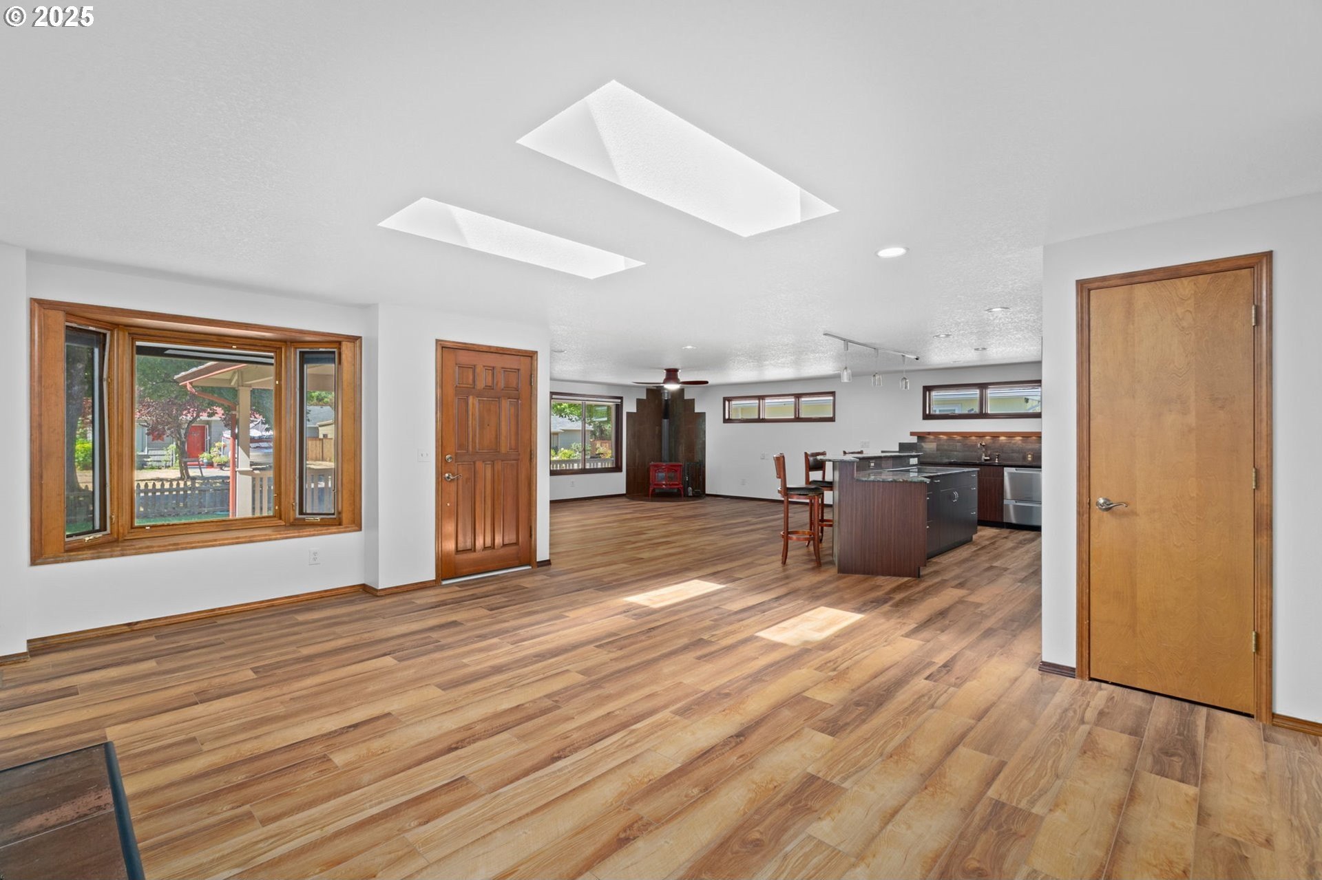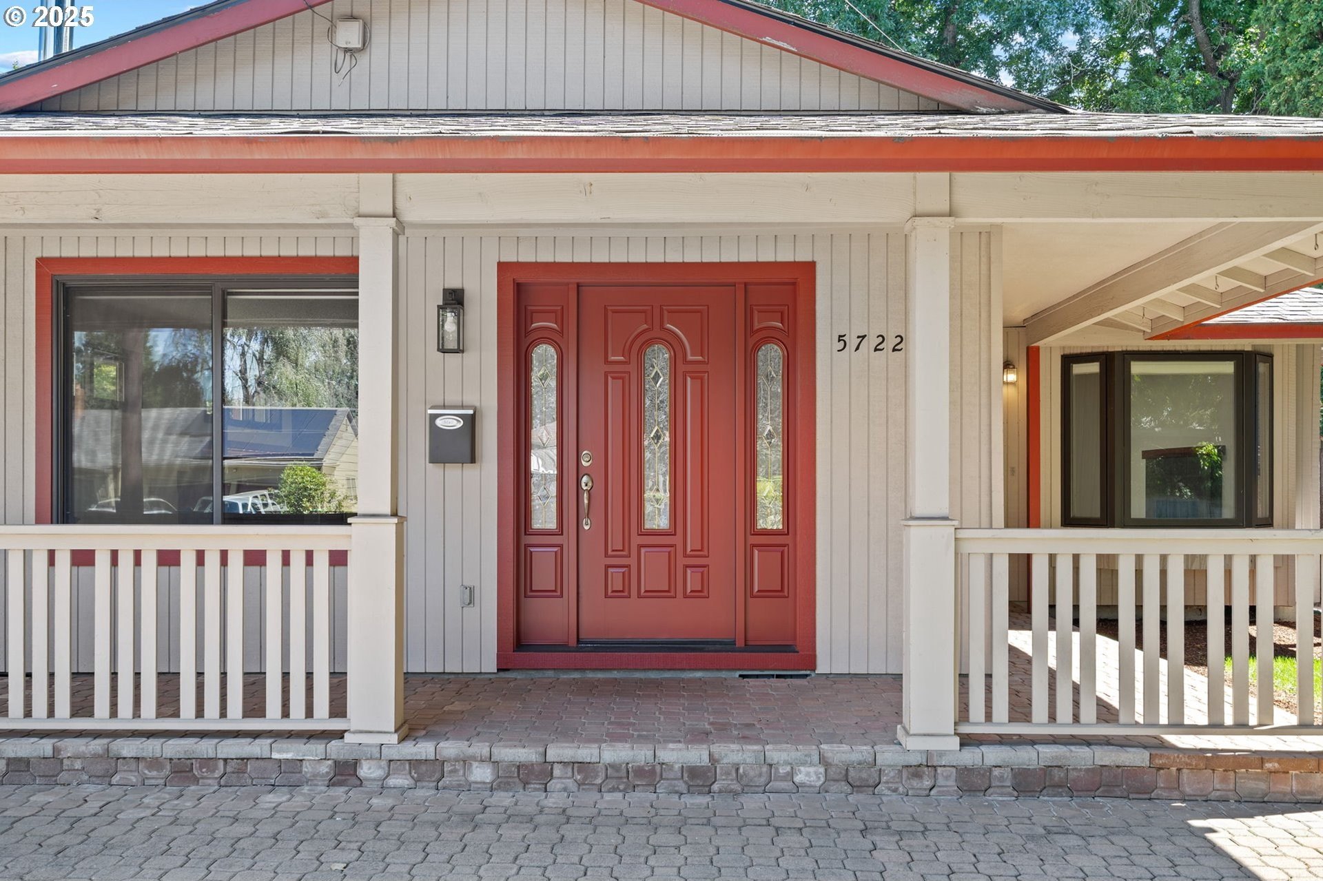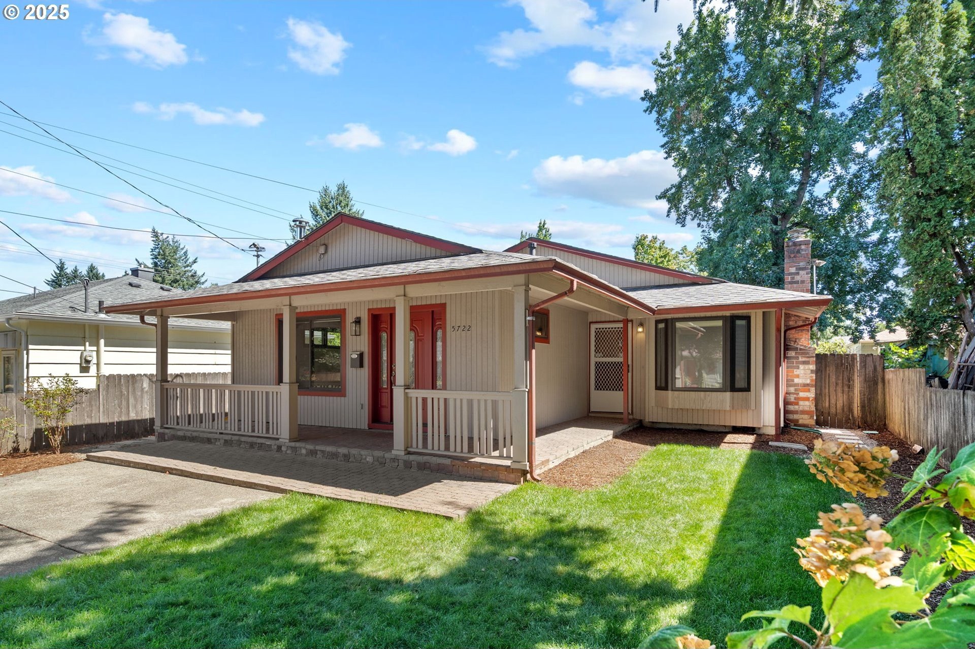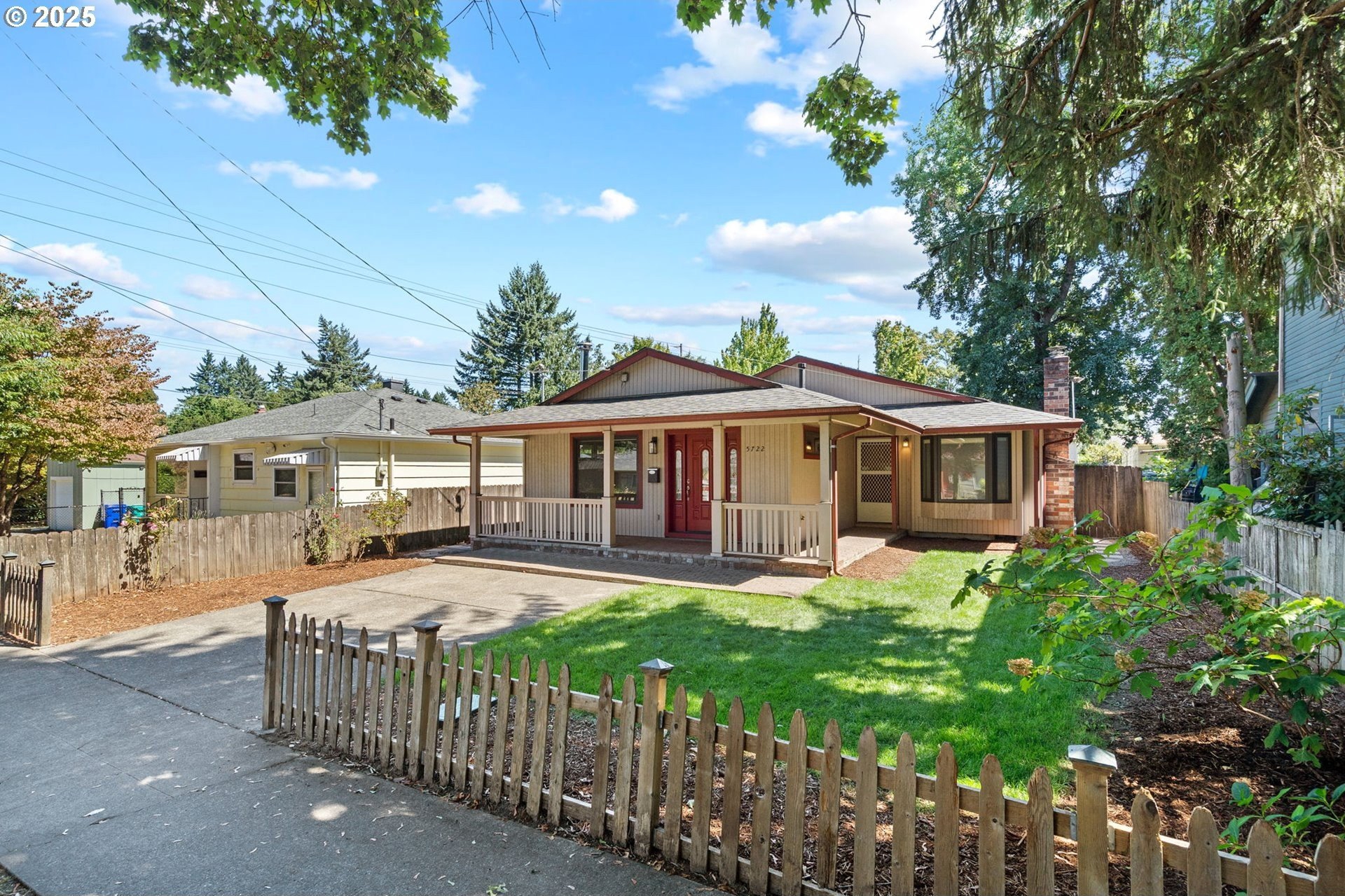 Location, location, location! Why drive when everything good starts just 1 block away on Woodstock? This 1980s ranch was fully remodeled in 2008 by Neil Kelly and now, made even better, with all new vinyl plank flooring, a new energy efficient heat pump, and newer roof replaced in 2023. An inviting covered porch fit for an evening of book reading or people watching leads to one of two front doors. Stepping inside, an expansive open living space is sure to surprise any guest, featuring a custom kitchen with gorgeous granite counters, skylights, a free standing wood stove and room for just about any couch on your wish list. Just off the kitchen, a laundry room with a sink and storage leads to a patio in back yard. Down the hall, a guest bathroom, bedrooms two and three, and the primary bedroom with ensuite bath and additional access through a beautiful wood door to the yard. Both bathrooms feature custom vanities and travertine tile throughout. Notable mentions: Woodstock Elementary and Woodstock Park are 2 blocks away, restaurants, grocery stores, the Sunday farmers market, and Heist Food Cart Pod along with so much more minutes away on Woodstock. Need I say, location, again? This ones a winner.