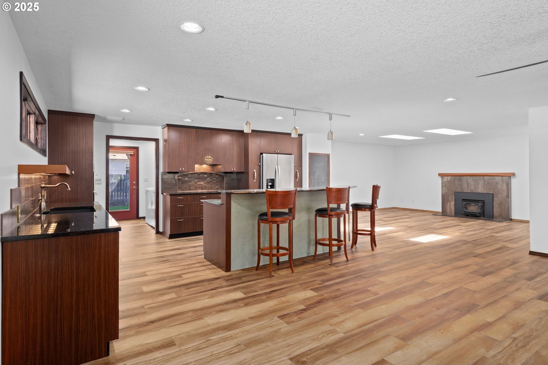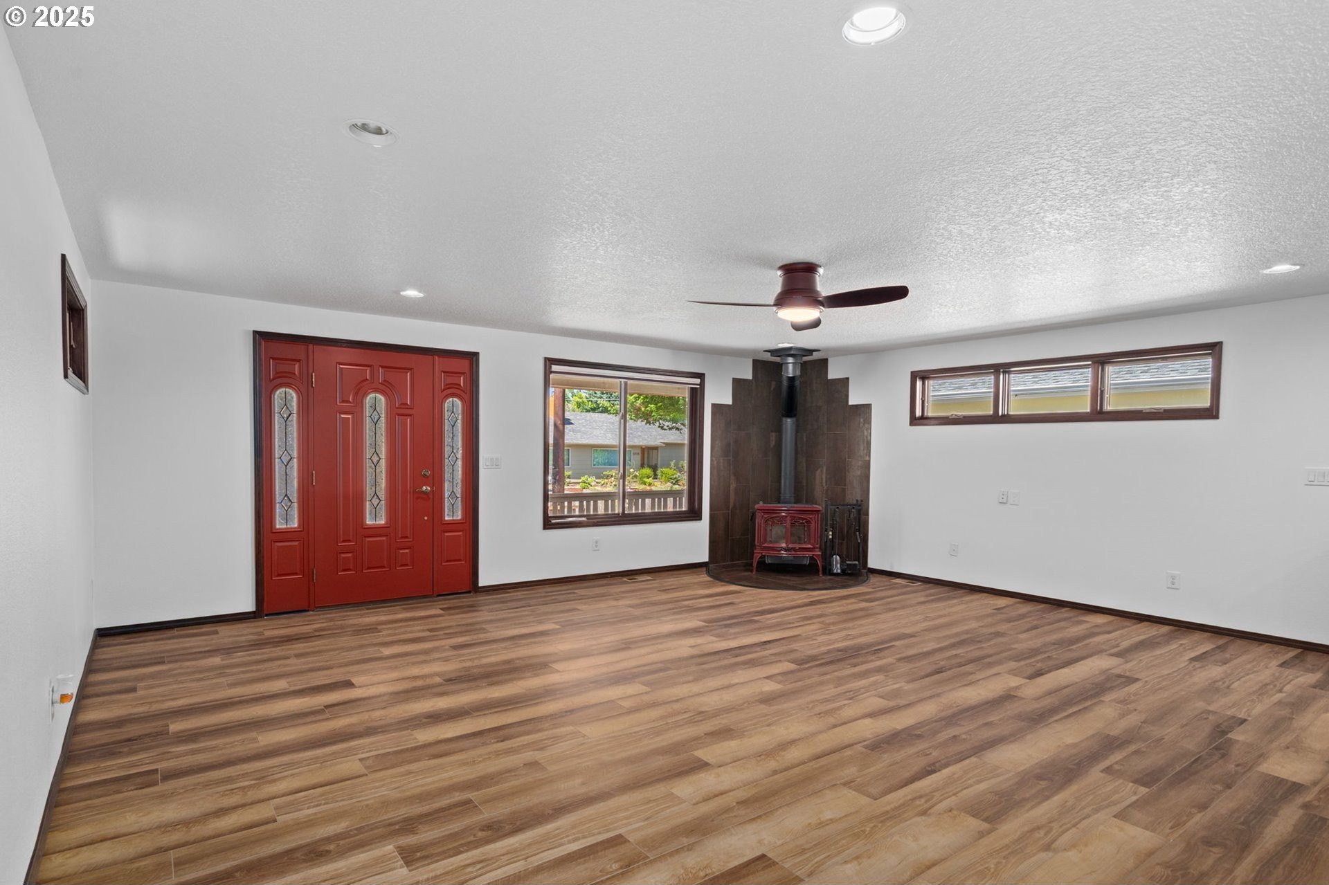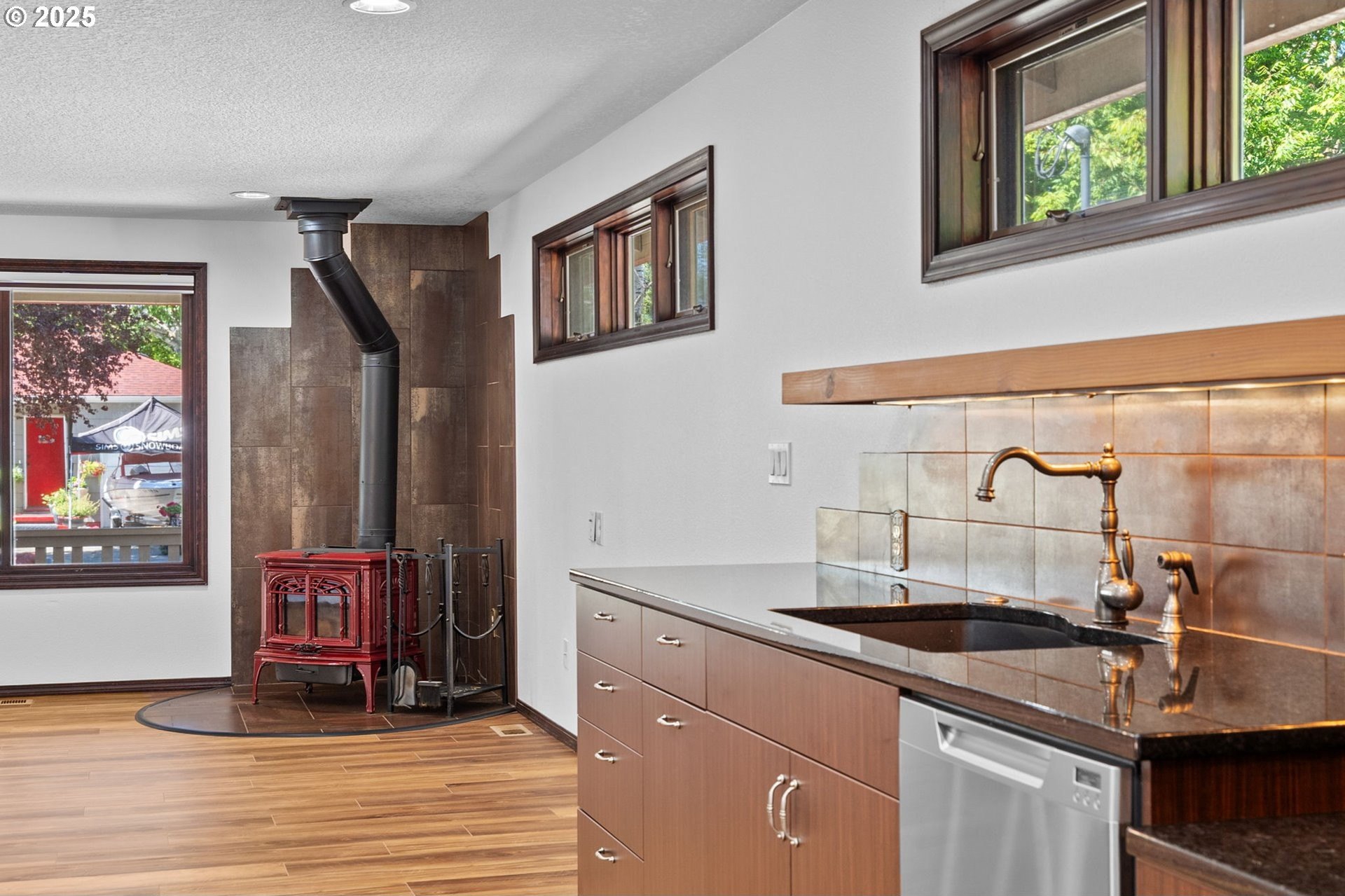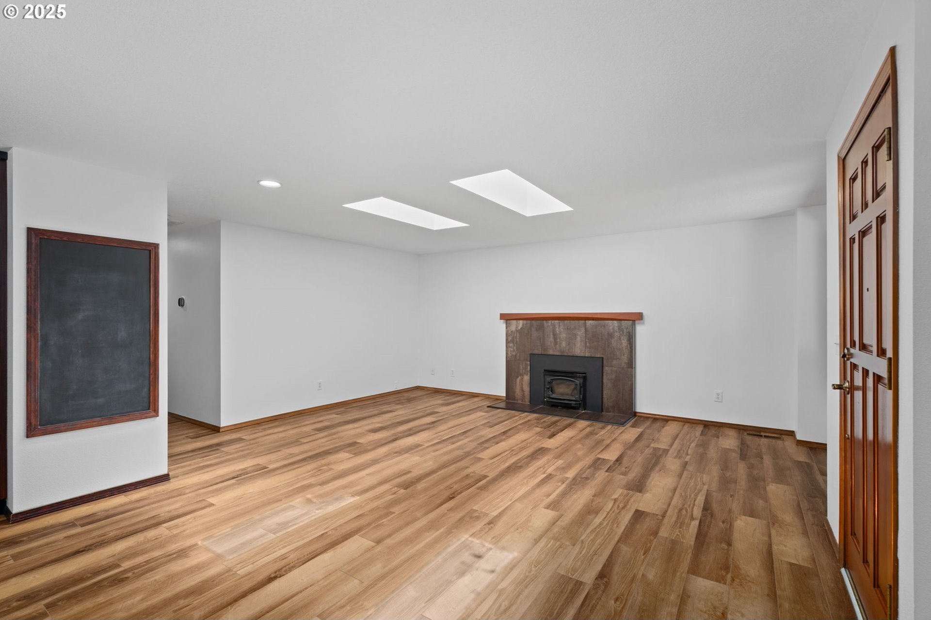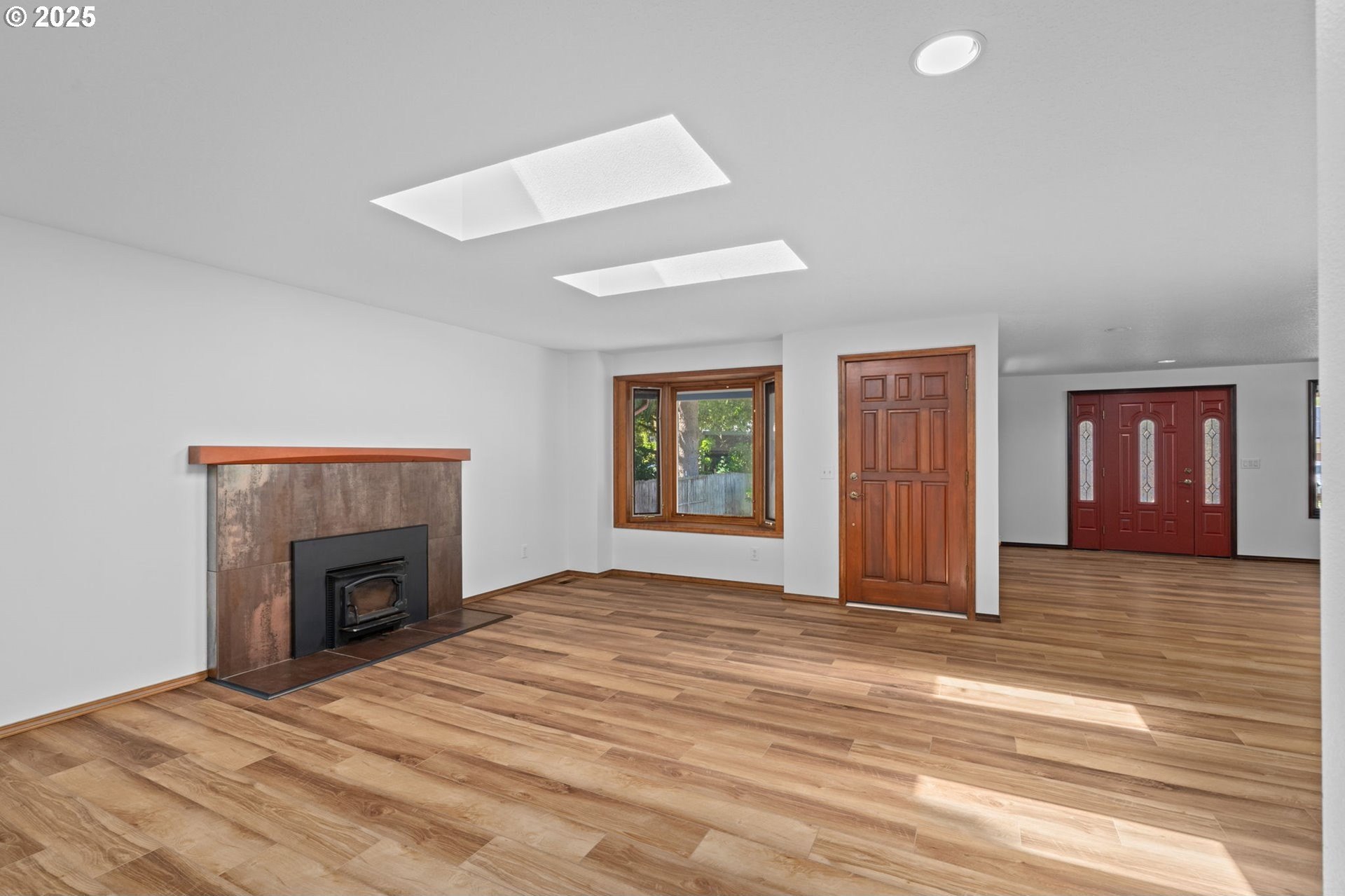 Location, location, location! Why drive when everything good starts just 1 block away on Woodstock? This 1980s ranch was fully remodeled in 2008 by Neil Kelly and now, made even better, with all new vinyl plank flooring, a new energy efficient heat pump, and newer roof replaced in 2023. An inviting covered porch fit for an evening of book reading or people watching leads to one of two front doors. Stepping inside, an expansive open living space is sure to surprise any guest, featuring a custom kitchen with gorgeous granite counters, skylights, a free standing wood stove and room for just about any couch on your wish list. Just off the kitchen, a laundry room with a sink and storage leads to a patio in back yard. Down the hall, a guest bathroom, bedrooms two and three, and the primary bedroom with ensuite bath and additional access through a beautiful wood door to the yard. Both bathrooms feature custom vanities and travertine tile throughout. Notable mentions: Woodstock Elementary and Woodstock Park are 2 blocks away, restaurants, grocery stores, the Sunday farmers market, and Heist Food Cart Pod along with so much more minutes away on Woodstock. Need I say, location, again? This ones a winner.