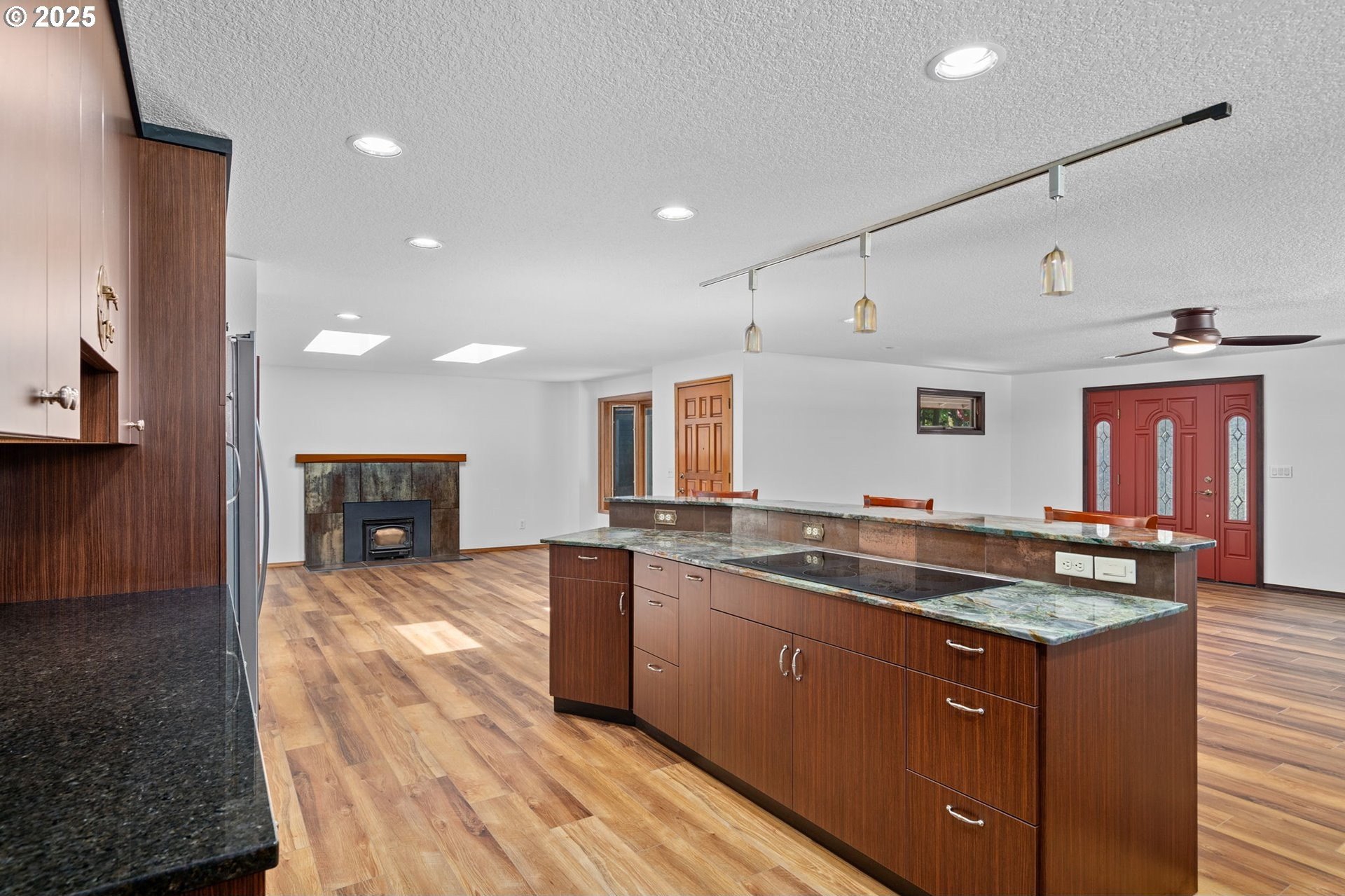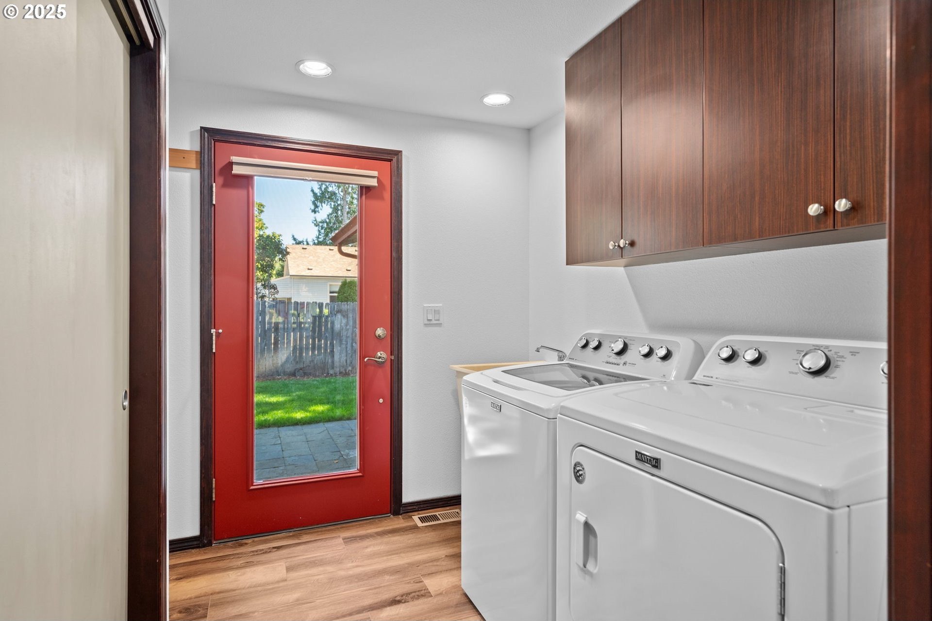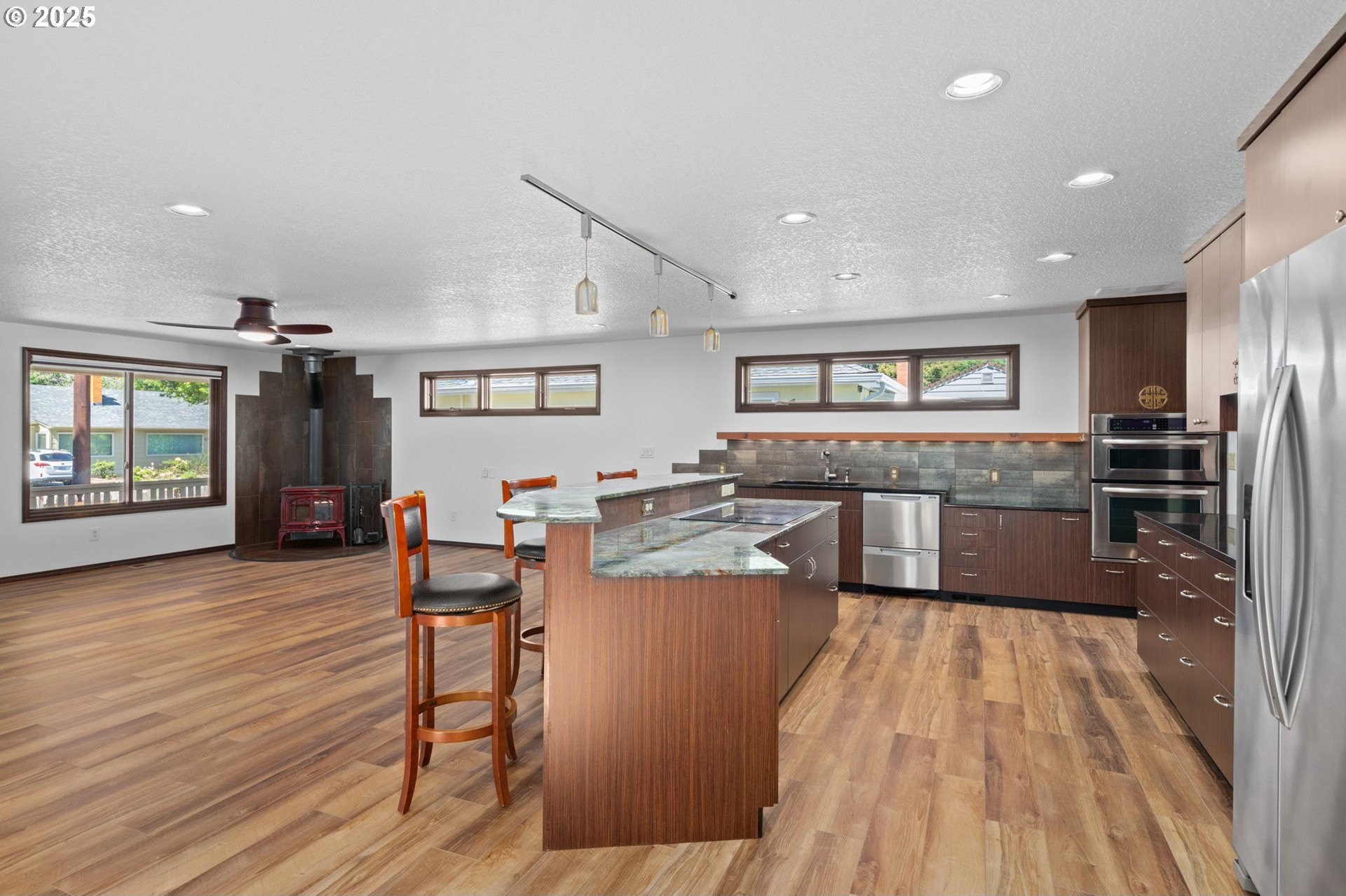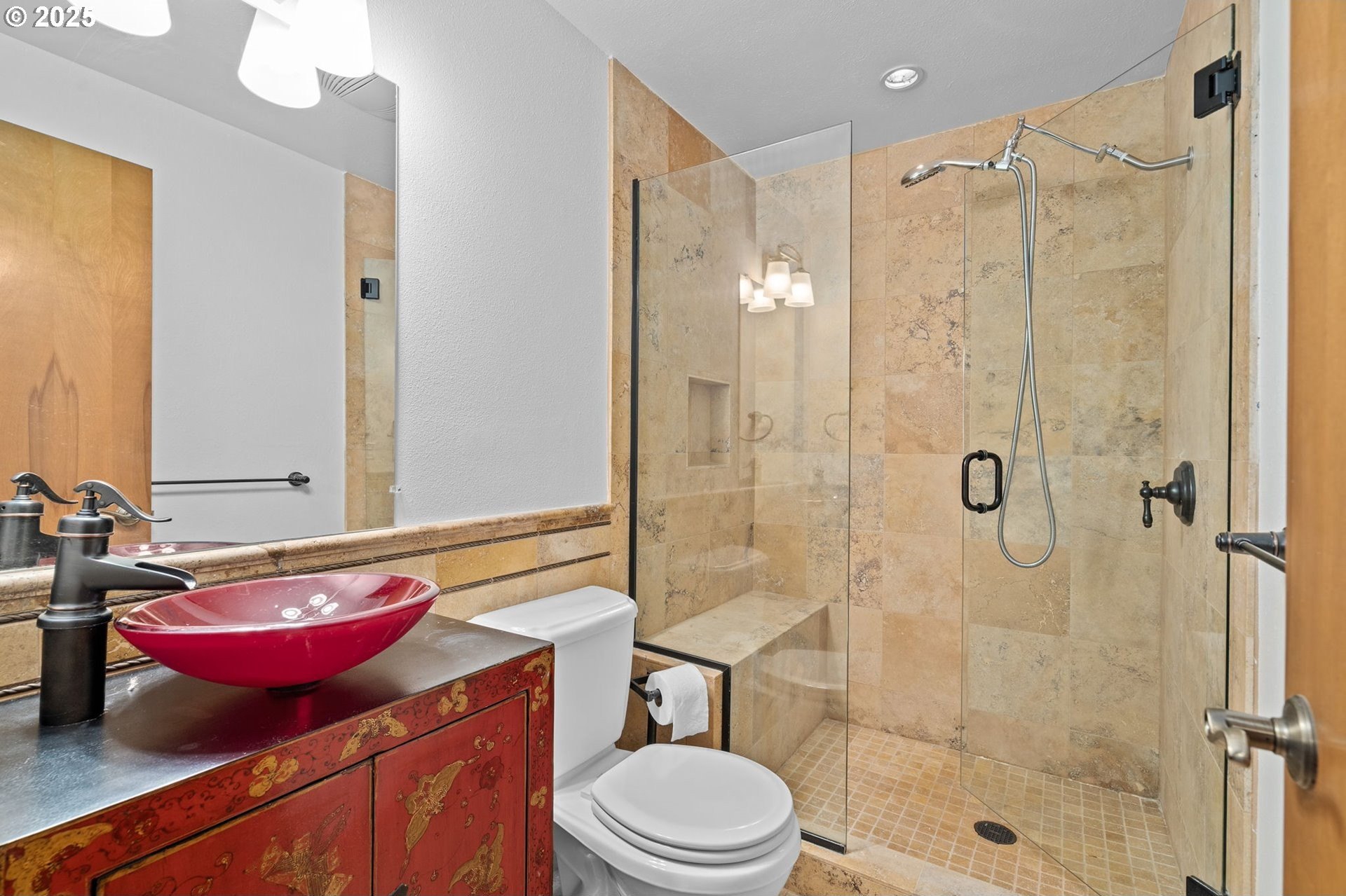 Location, location, location! Why drive when everything good starts just 1 block away on Woodstock? This 1980s ranch was fully remodeled in 2008 by Neil Kelly and now, made even better, with all new vinyl plank flooring, a new energy efficient heat pump, and newer roof replaced in 2023. An inviting covered porch fit for an evening of book reading or people watching leads to one of two front doors. Stepping inside, an expansive open living space is sure to surprise any guest, featuring a custom kitchen with gorgeous granite counters, skylights, a free standing wood stove and room for just about any couch on your wish list. Just off the kitchen, a laundry room with a sink and storage leads to a patio in back yard. Down the hall, a guest bathroom, bedrooms two and three, and the primary bedroom with ensuite bath and additional access through a beautiful wood door to the yard. Both bathrooms feature custom vanities and travertine tile throughout. Notable mentions: Woodstock Elementary and Woodstock Park are 2 blocks away, restaurants, grocery stores, the Sunday farmers market, and Heist Food Cart Pod along with so much more minutes away on Woodstock. Need I say, location, again? This ones a winner.