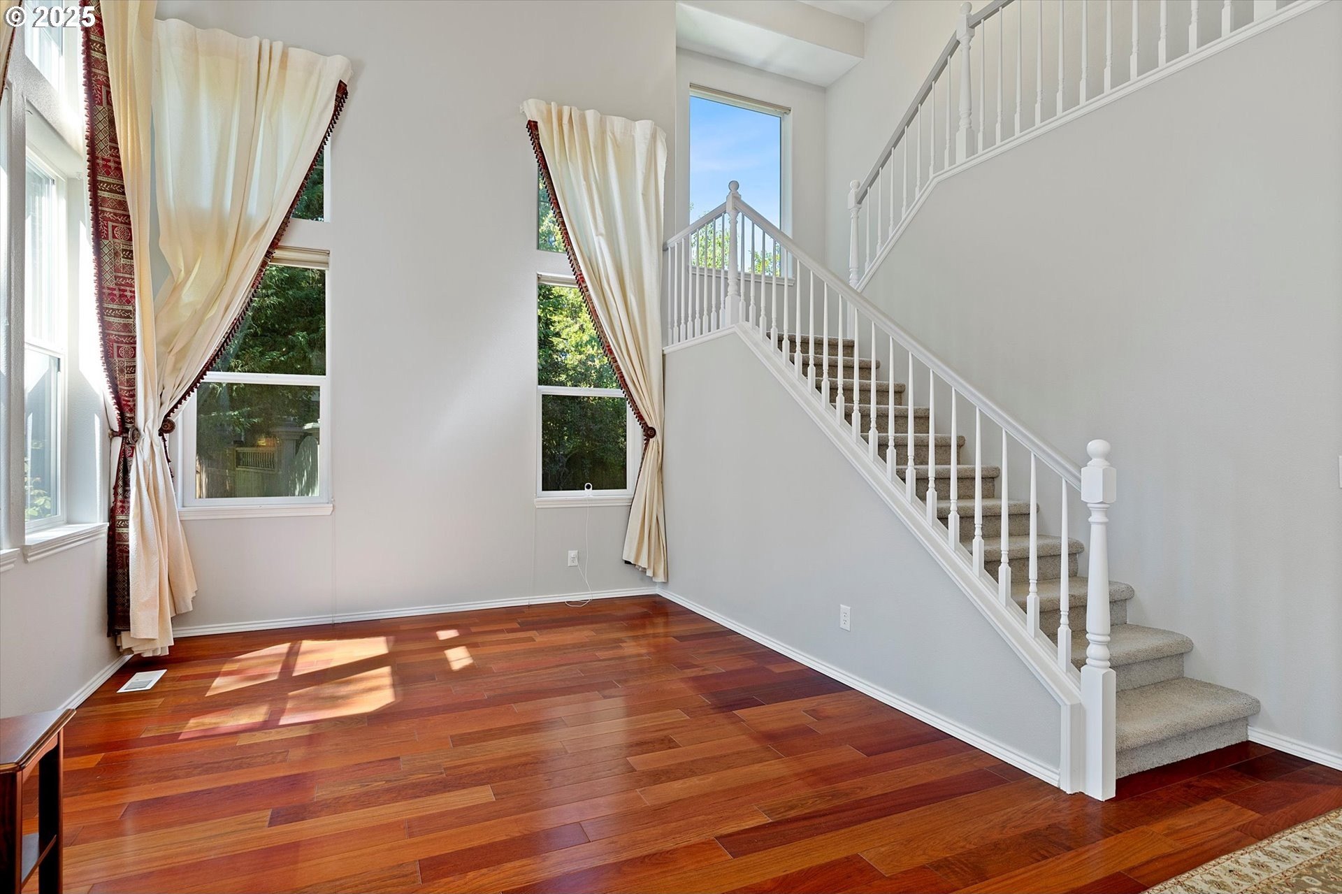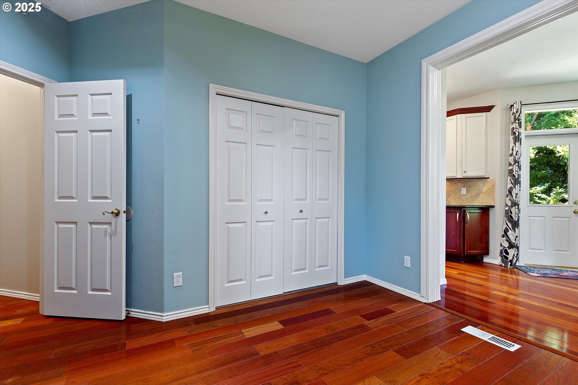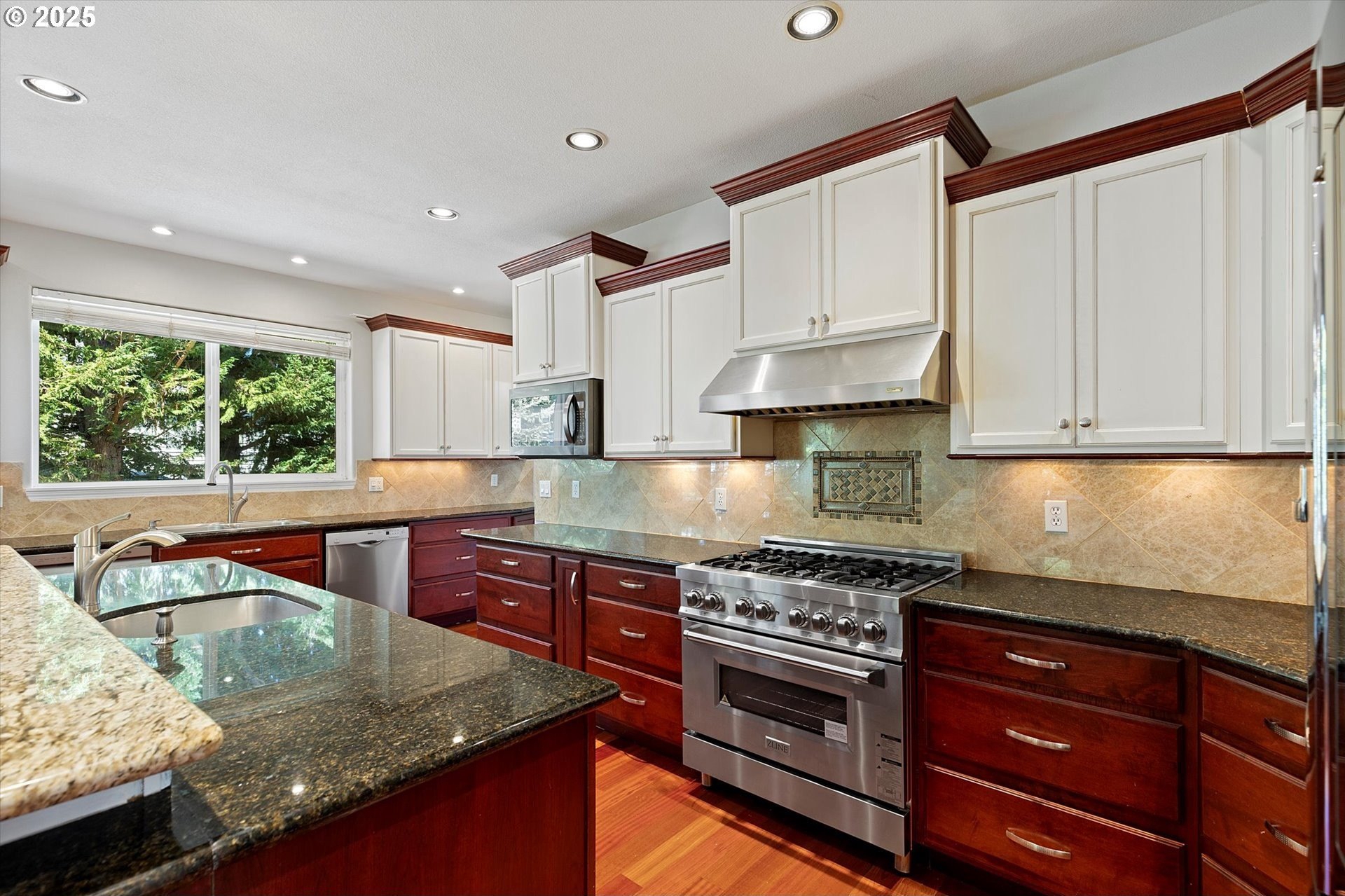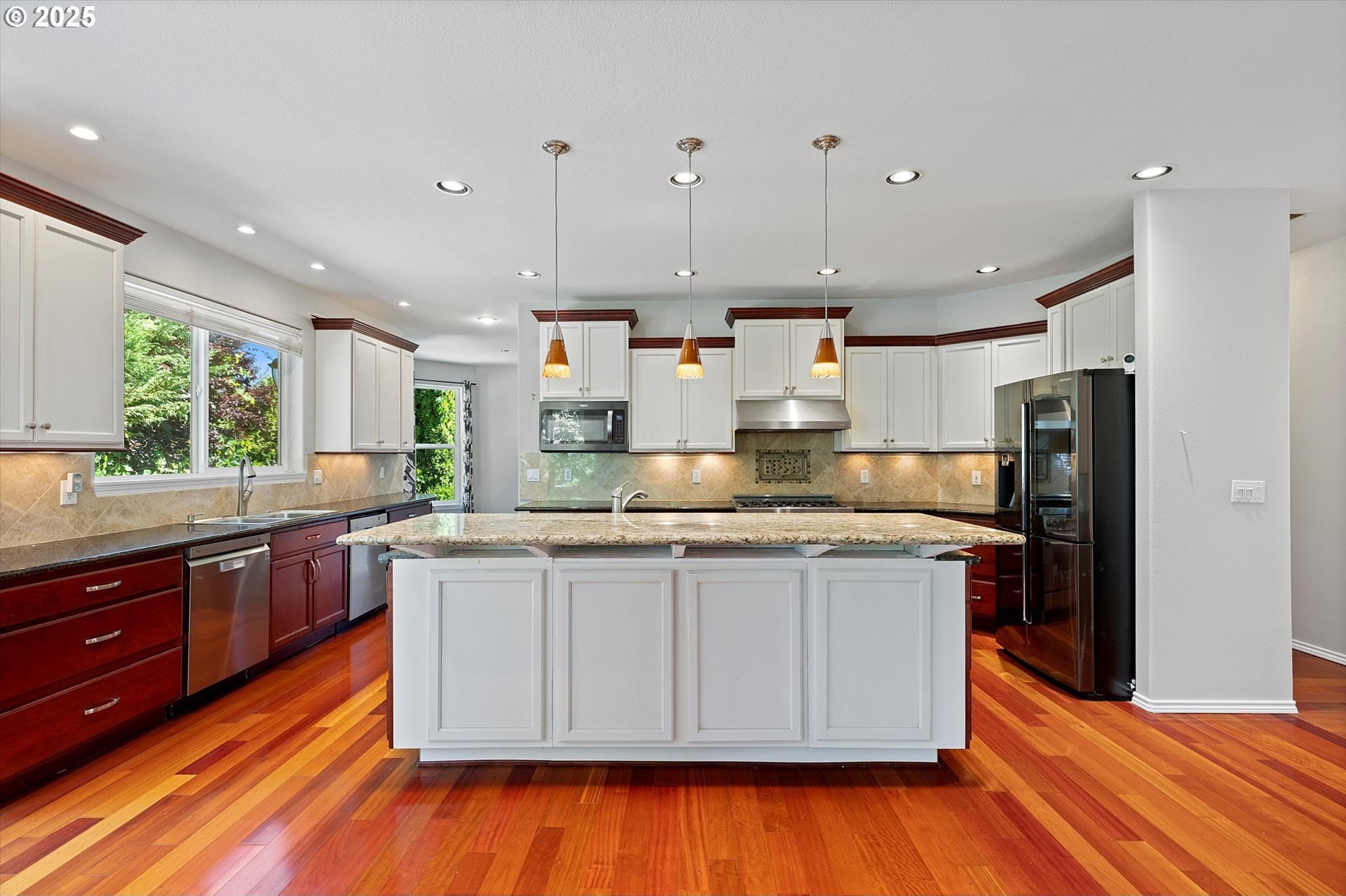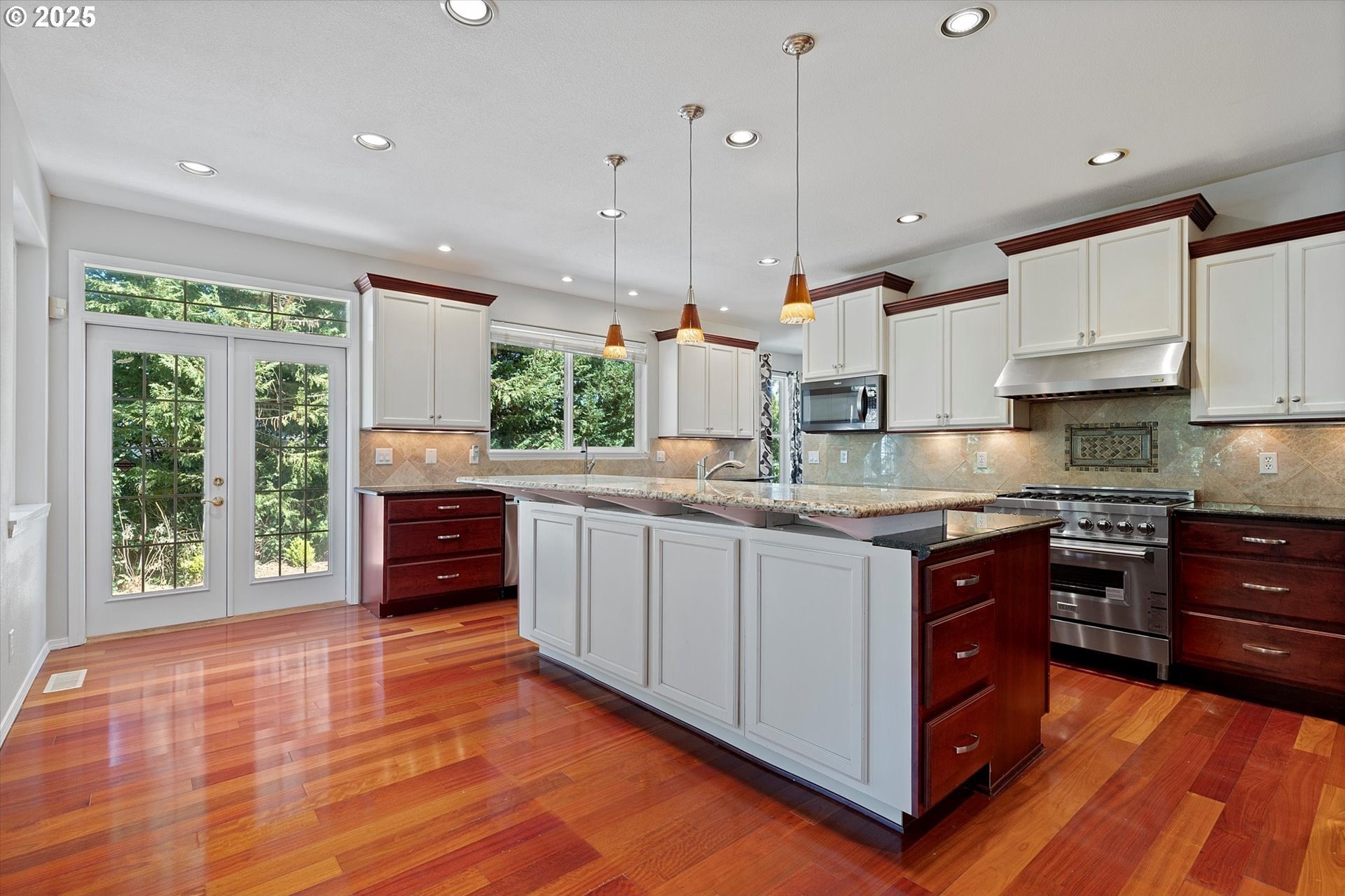 This beautifully updated 2,943 sq. ft. home in the sought-after Jones Farm neighborhood offers five bedrooms and 3.5 bathrooms, providing exceptional space and flexibility for comfortable living and entertaining. The upgraded mahogany entry door with decorative glass sets the tone as you step into the main level, which features solid ¾-inch Brazilian Cherry hardwood floors throughout the living areas. A spacious living room centers around a custom granite slab fireplace hearth and opens to a gourmet kitchen fully remodeled in 2009, complete with tall custom cabinetry, granite countertops, marble backsplash, a 36” professional range with stainless hood, two dishwashers, two sinks, a large pantry, and a charming bay-style breakfast nook. The thoughtful floor plan includes a main-level bedroom with a full bath, along with a remodeled powder room featuring a quartz vanity, glass vessel sink, and walls finished in travertine and Venetian plaster. Upstairs, the primary suite includes a walk-in closet and updated en-suite with quartz vanity, while four additional bedrooms provide versatility for family, guests, or office use. Backyard access from both the living room/kitchen and the breakfast nook creates easy indoor-outdoor living, with the private yard offering room to entertain, relax, or play. Recent updates ensure peace of mind and value, including an exterior repaint in 2023, new roof and water heater in June 2025, new gas furnace in July 2025, new carpet on the second level and stairs in June 2025, and fresh interior paint on most walls in July 2025. Ideally located close to schools, parks, shopping, and major commuting routes, this home combines timeless craftsmanship, thoughtful updates, and modern convenience in one of the area’s most desirable neighborhoods.
