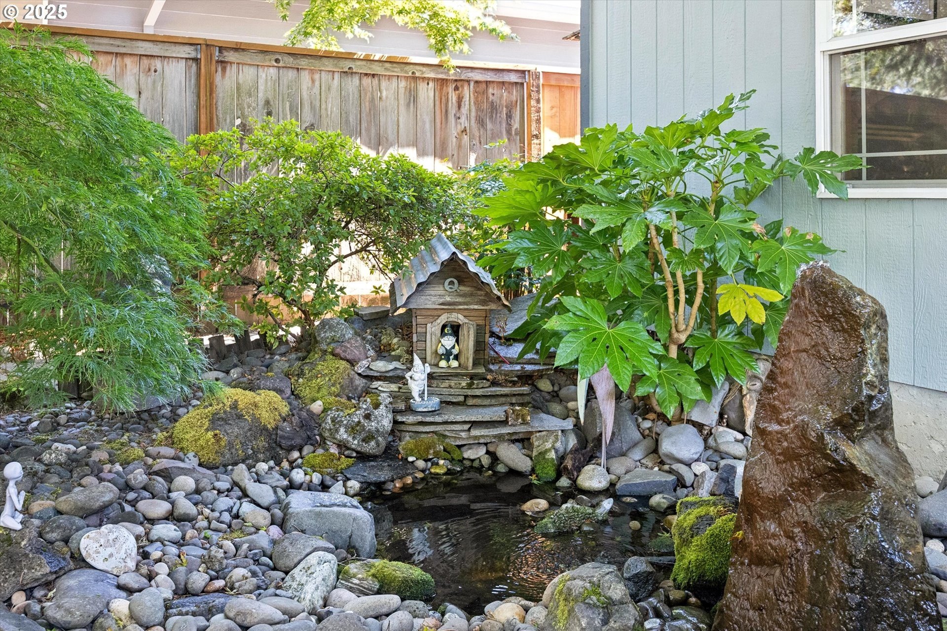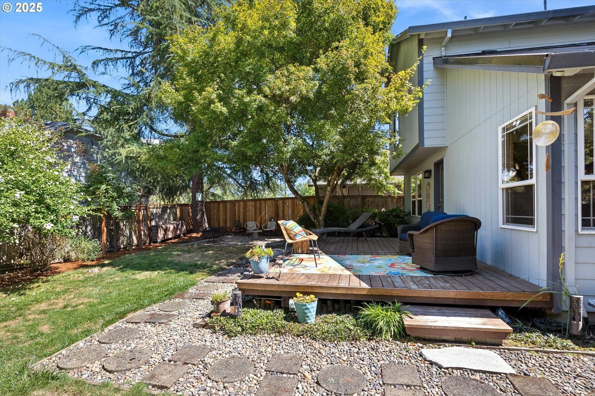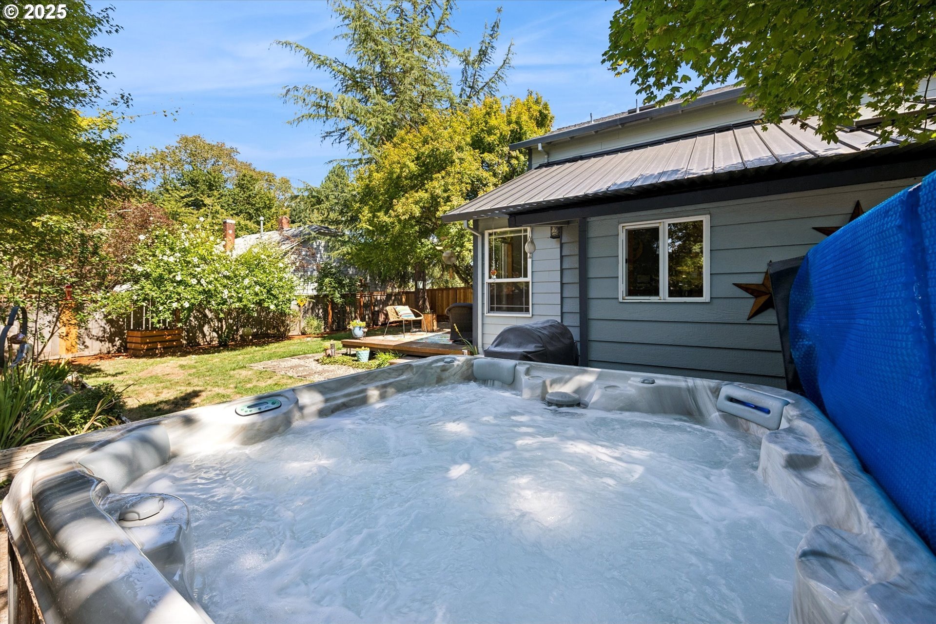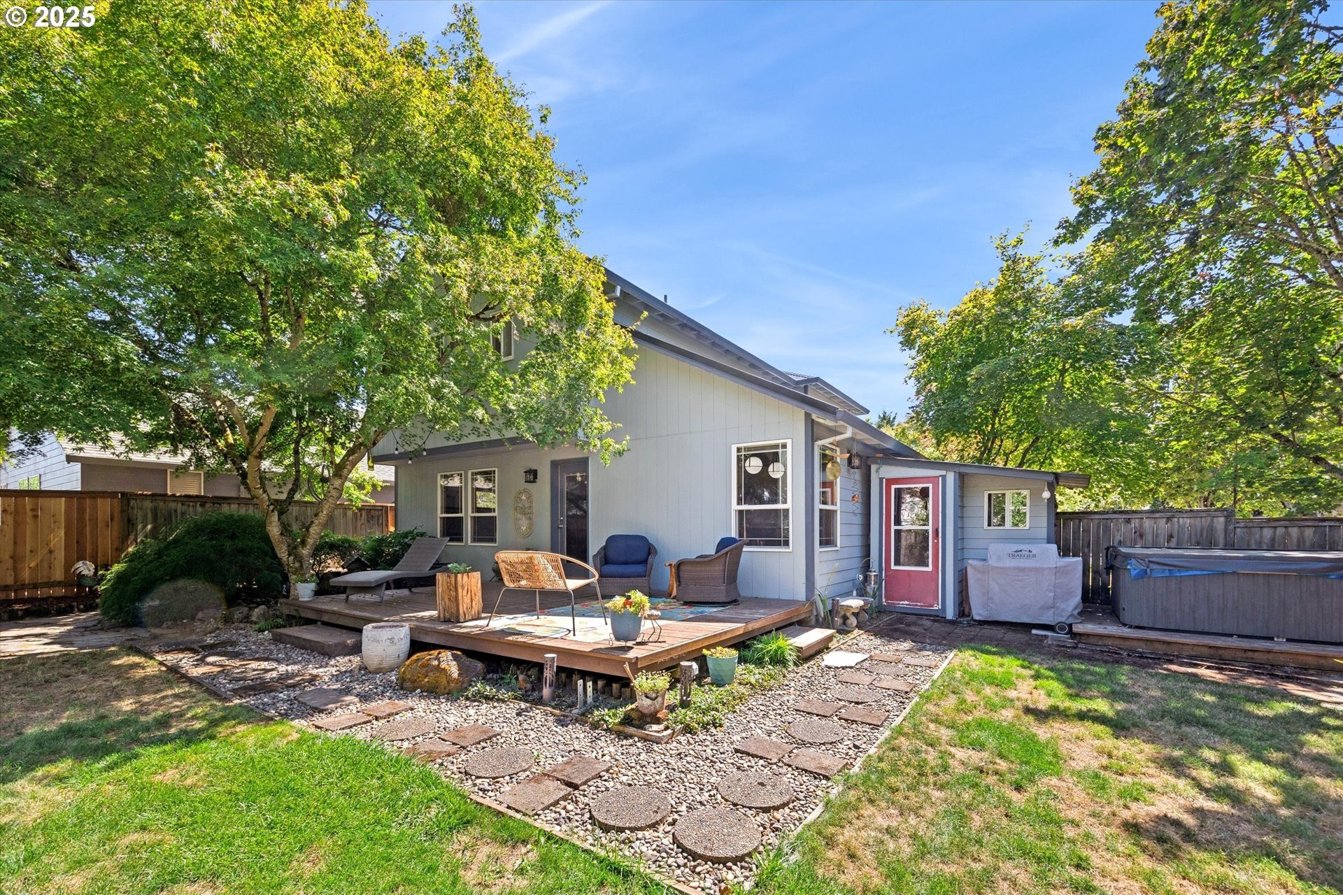 First impressions are everything—so take your time to enjoy the oversized corner lot, with beautifully landscaped grounds and whimsical touches. Step inside and you'll be instantly "WOWED!" by the openness, vaulted ceilings, and a modern gourmet kitchen that rivals those found in multi-million-dollar homes. ••• The kitchen is truly the heart of the home, and this heart is strong! Top-quality cabinets, gas appliances, a spacious pantry, and quartz countertops with a waterfall island. There are 3 ovens as the microwave is also a double convection oven (like a built-in air fryer). The stylish wallpaper pairs perfectly with the designer full wall tile, adding a contemporary flair. Four high efficiency skylight brighten the home. ••• Open floor plan with direct access to the living room, dining, and the backyard. ••• Beautiful LVP floors are also practical since they are waterproof and scratch-resistant. ••• The spacious primary suite easily accommodates a king-sized bed, furniture, and there is still plenty of room for an office, crib, or exercise equipment here. The beautifully tiled walk-in shower completes this private ensuite. ••• The backyard is big, private, sunny, and yet offers plenty of shade. An outdoor rec room makes a great private man-cave/she-shed or sauna. And enjoy relaxing in the modern 6-seat hot tub. ••• The fundamentals are just as impressive: the roof is under 5 years old, and the newer water heater and appliances provide peace of mind, the furnace has been serviced and certified. There is a dog door, and lots of easy to access storage in the attic and garage, top rated schools. Of course, the most important fundamental is that you will love living here! [Home Energy Score = 7. HES Report at https://rpt.greenbuildingregistry.com/hes/OR10241389]