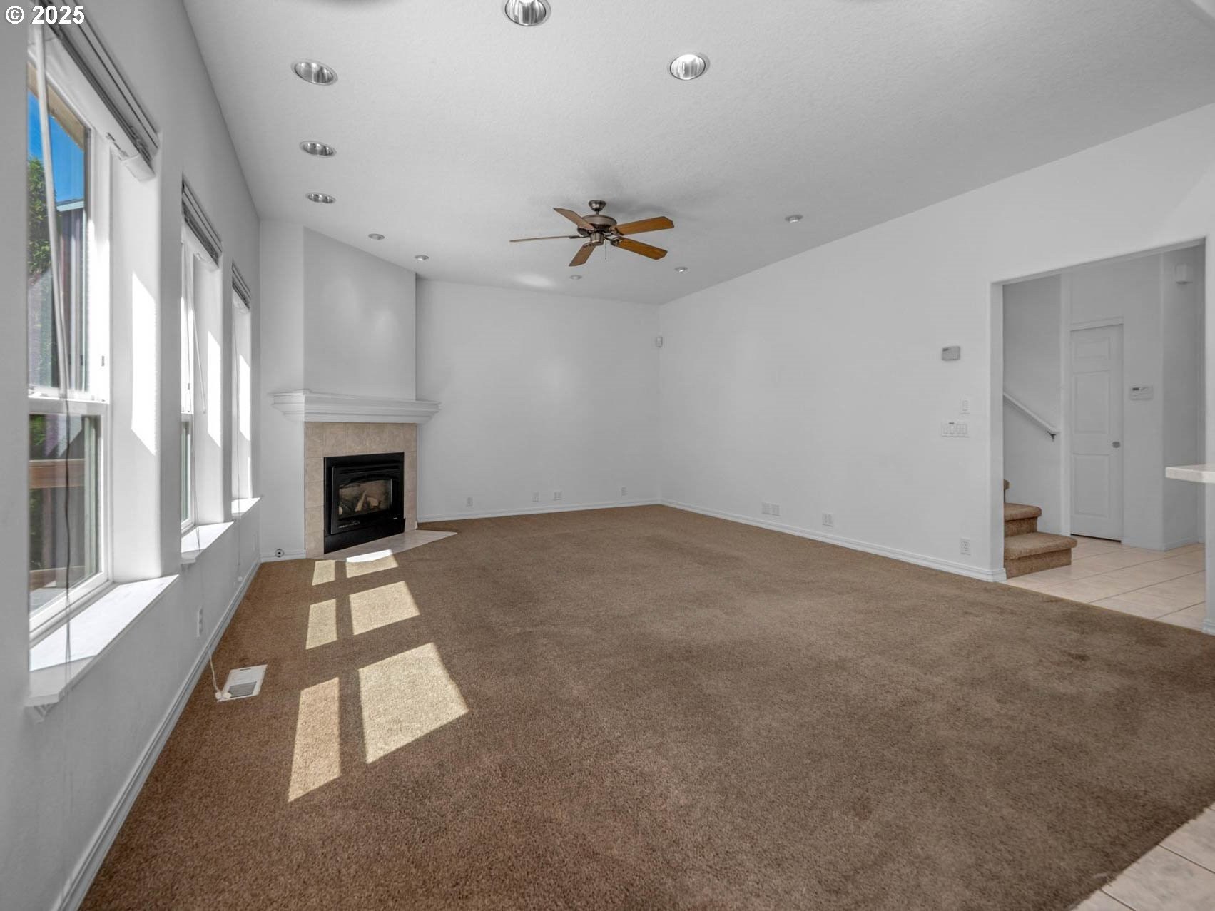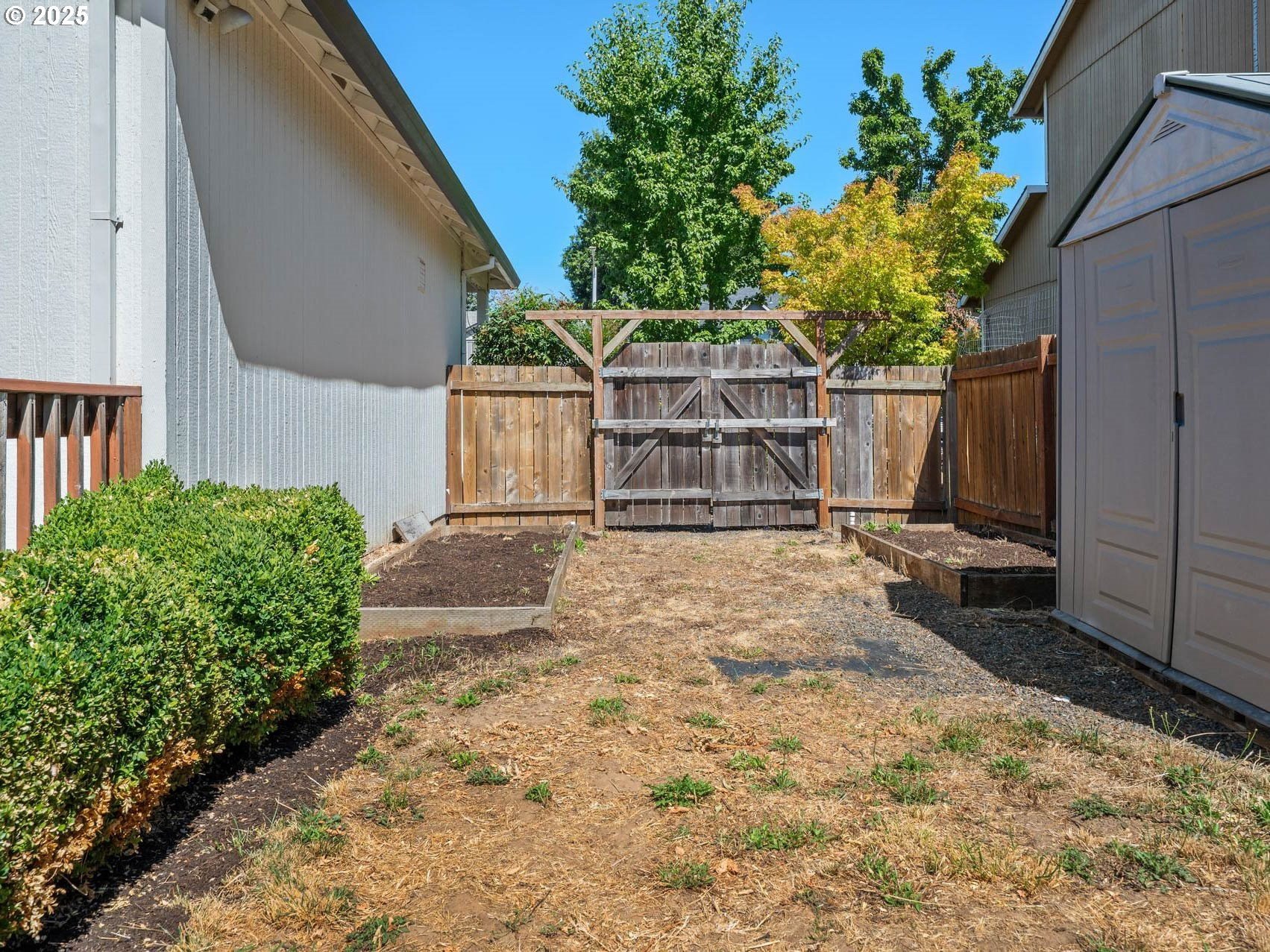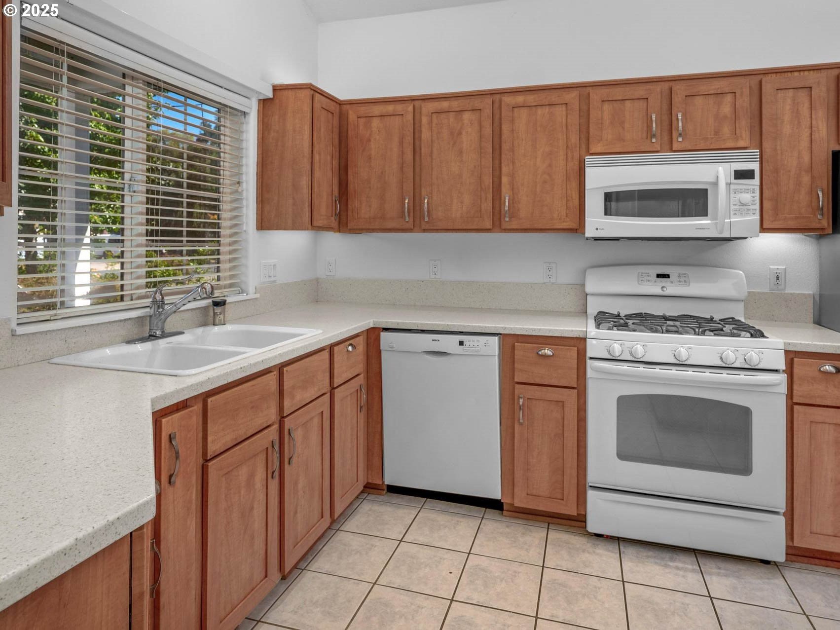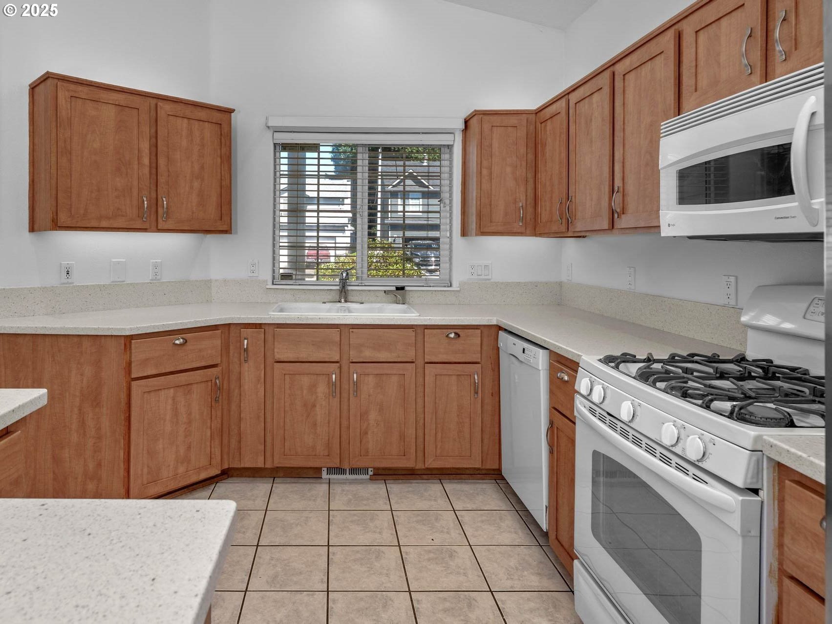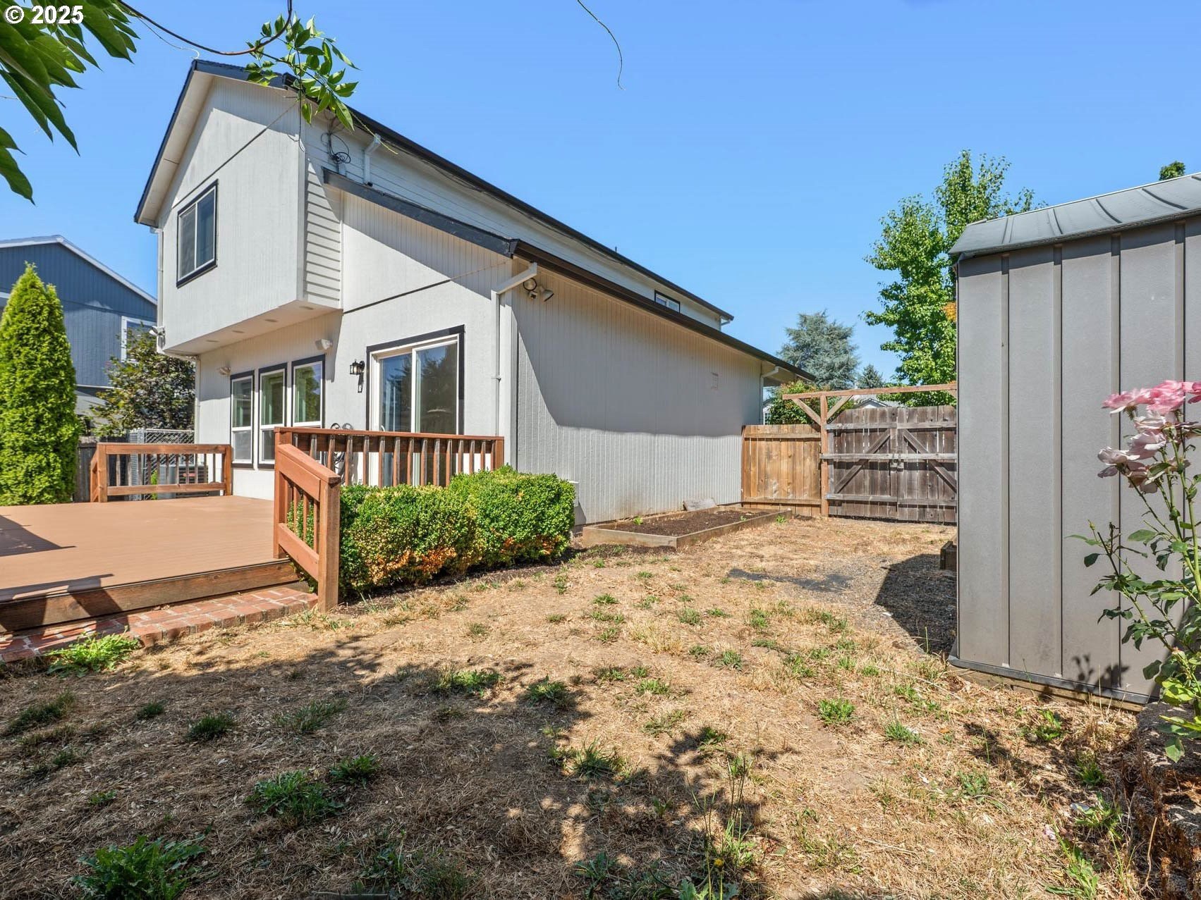 This inviting home features a bright, open floor plan with high ceilings in both the kitchen and living areas. The great room, centered around a cozy gas fireplace, flows seamlessly into the spacious kitchen with tiled flooring, abundant cabinetry, and plenty of counter space for cooking and entertaining. The vaulted primary suite offers generous storage, ample closet space, and a skylight in the bathroom, creating a bright and airy retreat. Two additional carpeted bedrooms upstairs provide flexibility for guests, family, or a home office. Perfectly situated on a peaceful street away from heavy traffic, the property is just minutes from Target, Home Depot, Starbucks, and the bus line, offering both convenience and tranquility. The fenced backyard includes a deck, a tool shed, and a dog run, providing versatile spaces for outdoor enjoyment, relaxing, or entertaining guests. [Home Energy Score = 7. HES Report at https://rpt.greenbuildingregistry.com/hes/OR10241449]