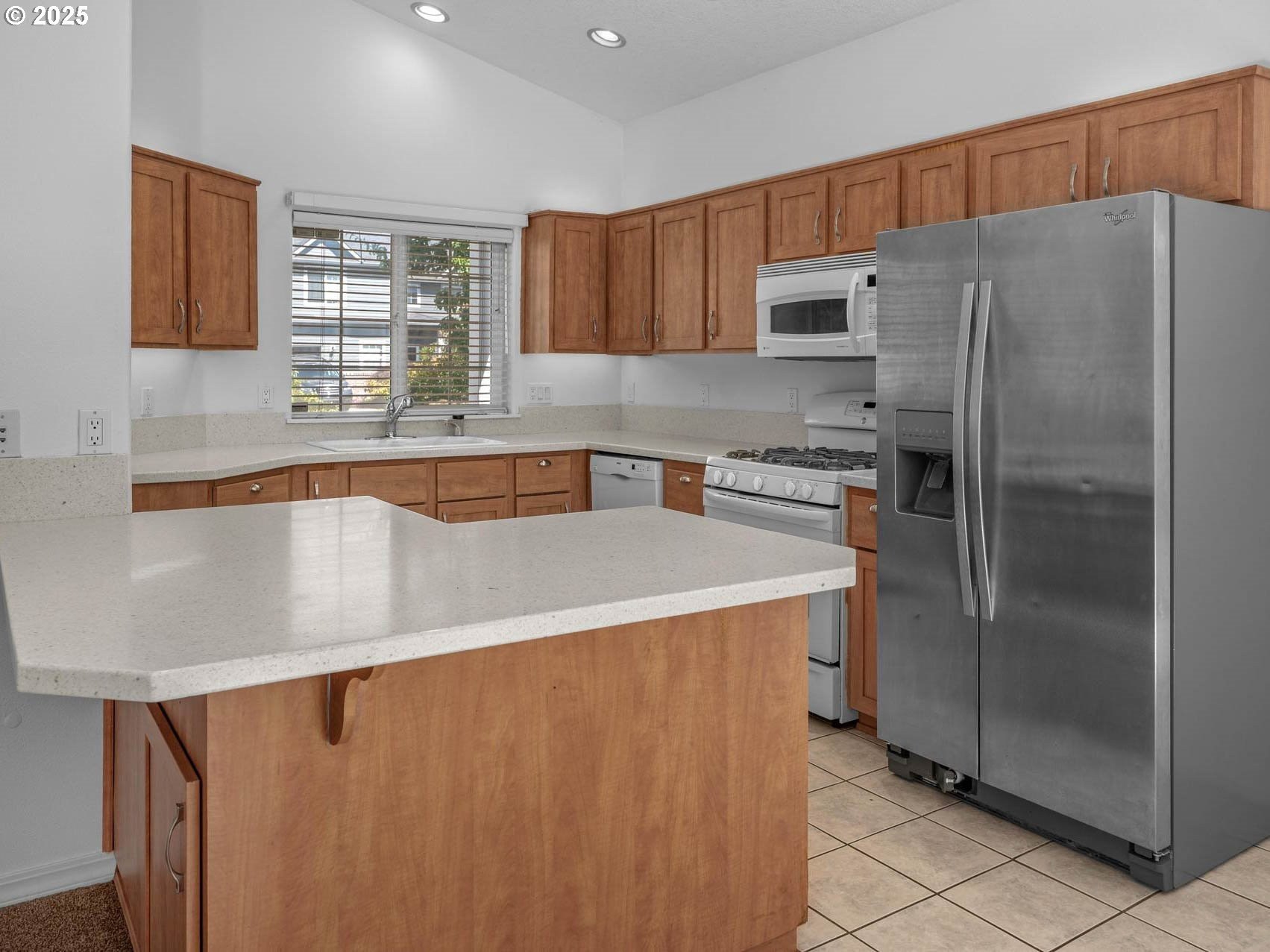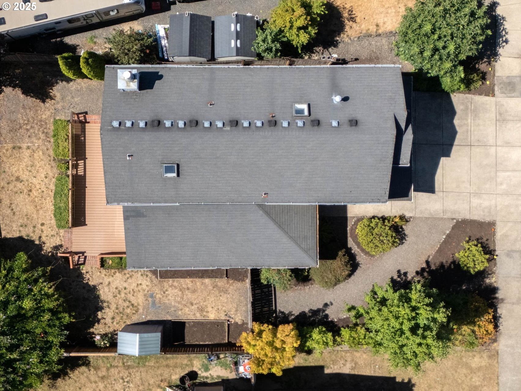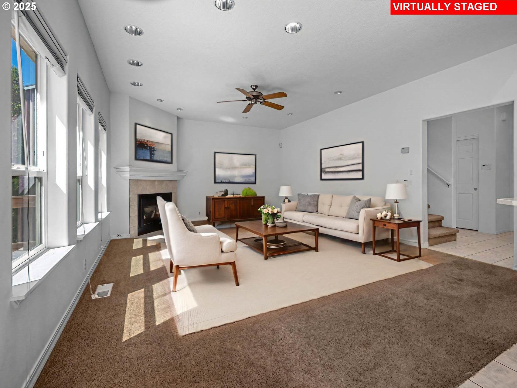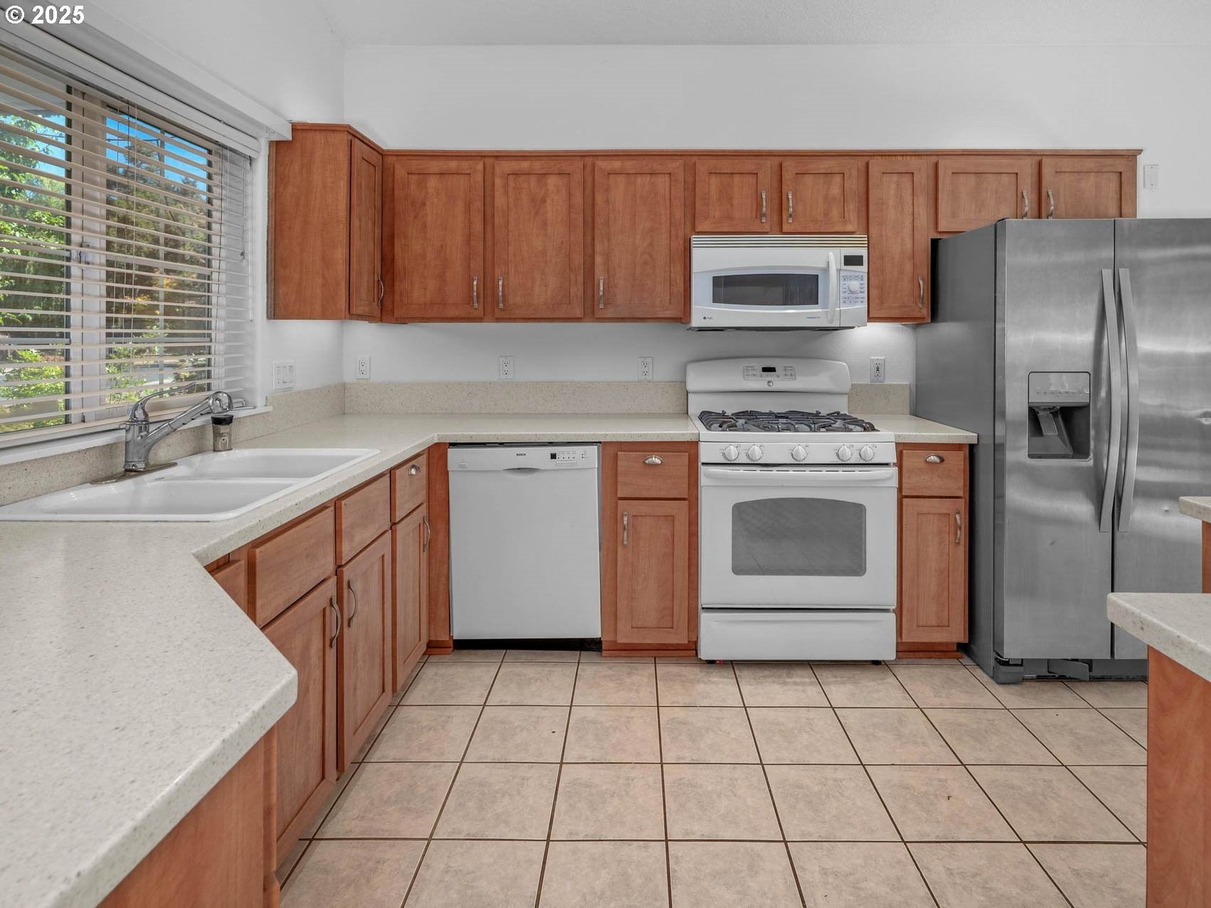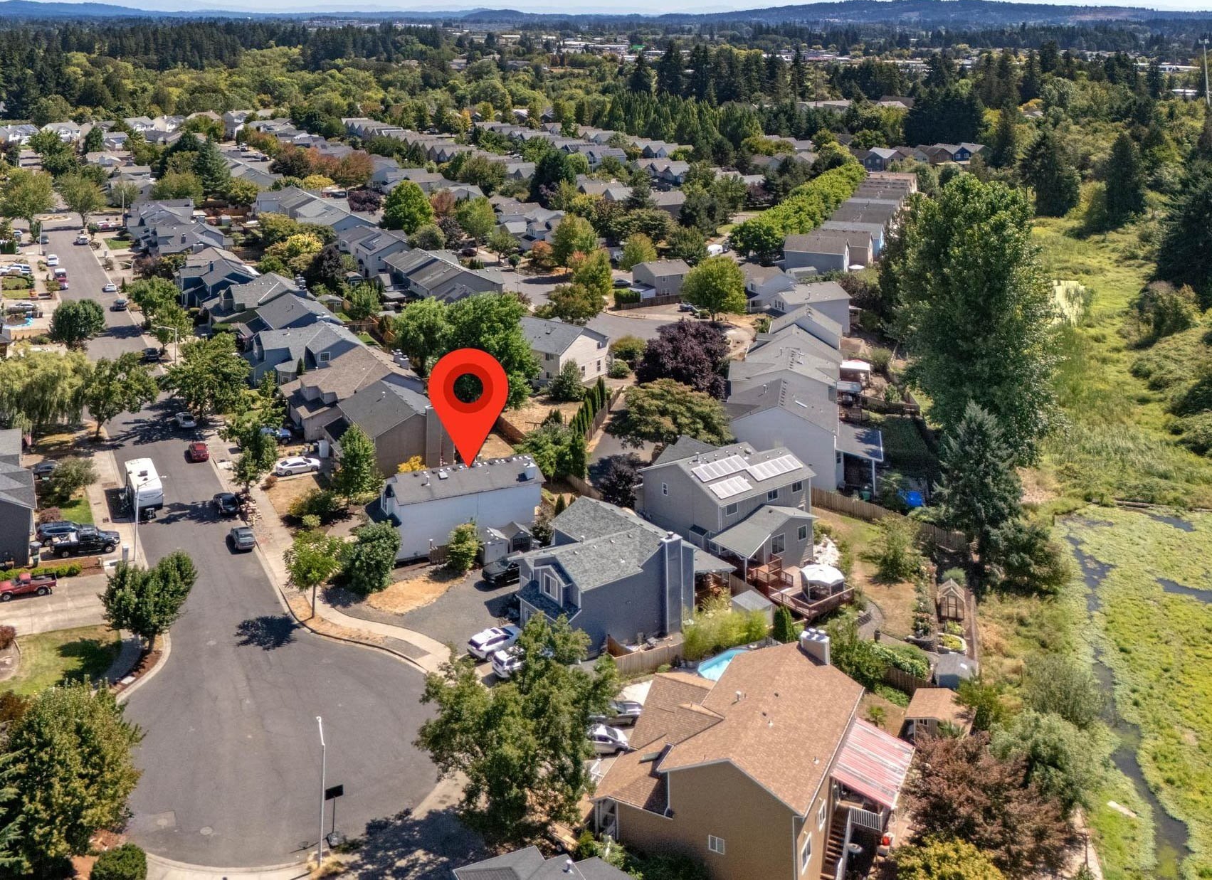 This inviting home features a bright, open floor plan with high ceilings in both the kitchen and living areas. The great room, centered around a cozy gas fireplace, flows seamlessly into the spacious kitchen with tiled flooring, abundant cabinetry, and plenty of counter space for cooking and entertaining. The vaulted primary suite offers generous storage, ample closet space, and a skylight in the bathroom, creating a bright and airy retreat. Two additional carpeted bedrooms upstairs provide flexibility for guests, family, or a home office. Perfectly situated on a peaceful street away from heavy traffic, the property is just minutes from Target, Home Depot, Starbucks, and the bus line, offering both convenience and tranquility. The fenced backyard includes a deck, a tool shed, and a dog run, providing versatile spaces for outdoor enjoyment, relaxing, or entertaining guests. [Home Energy Score = 7. HES Report at https://rpt.greenbuildingregistry.com/hes/OR10241449]