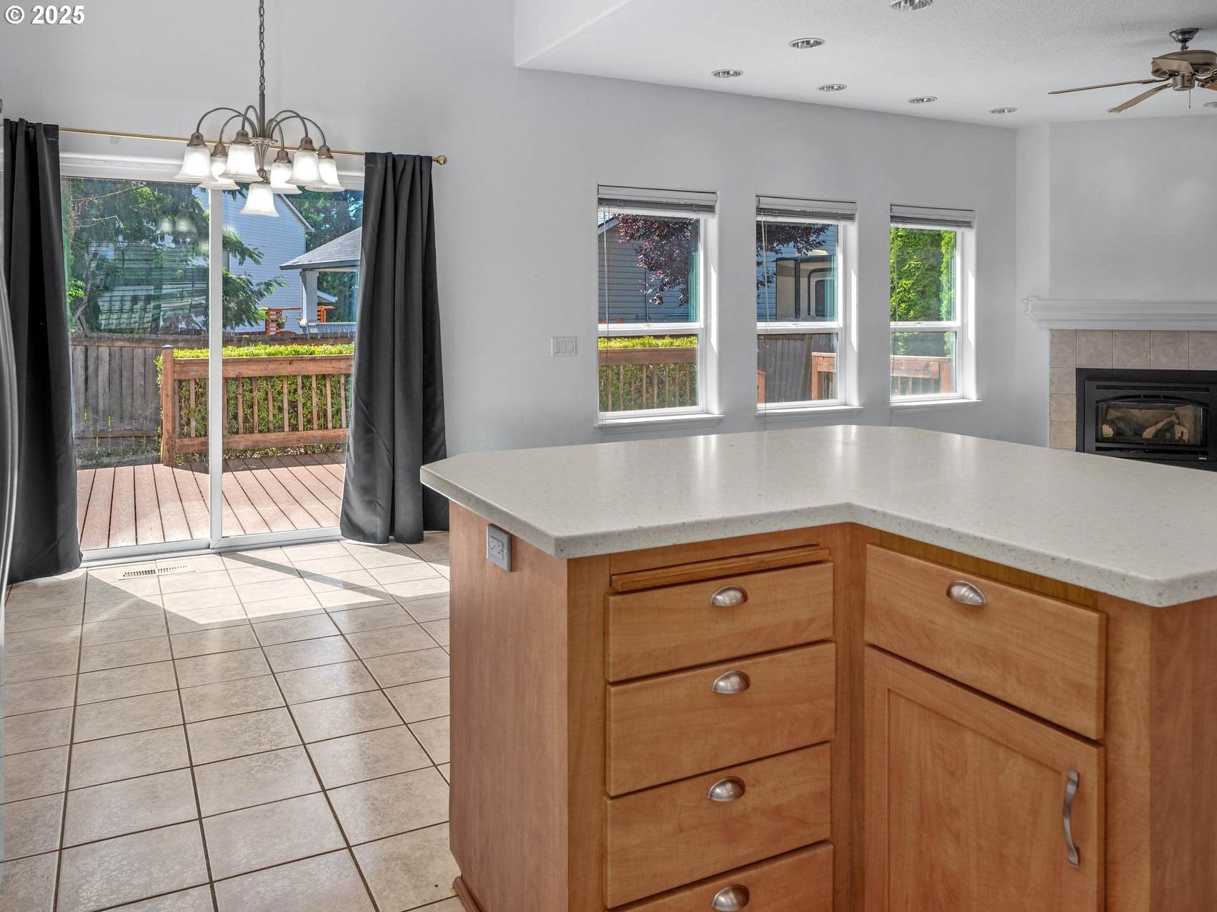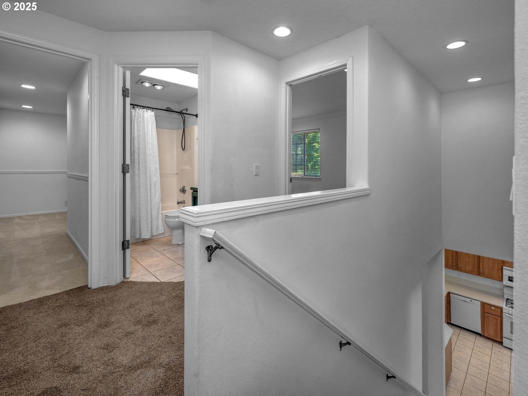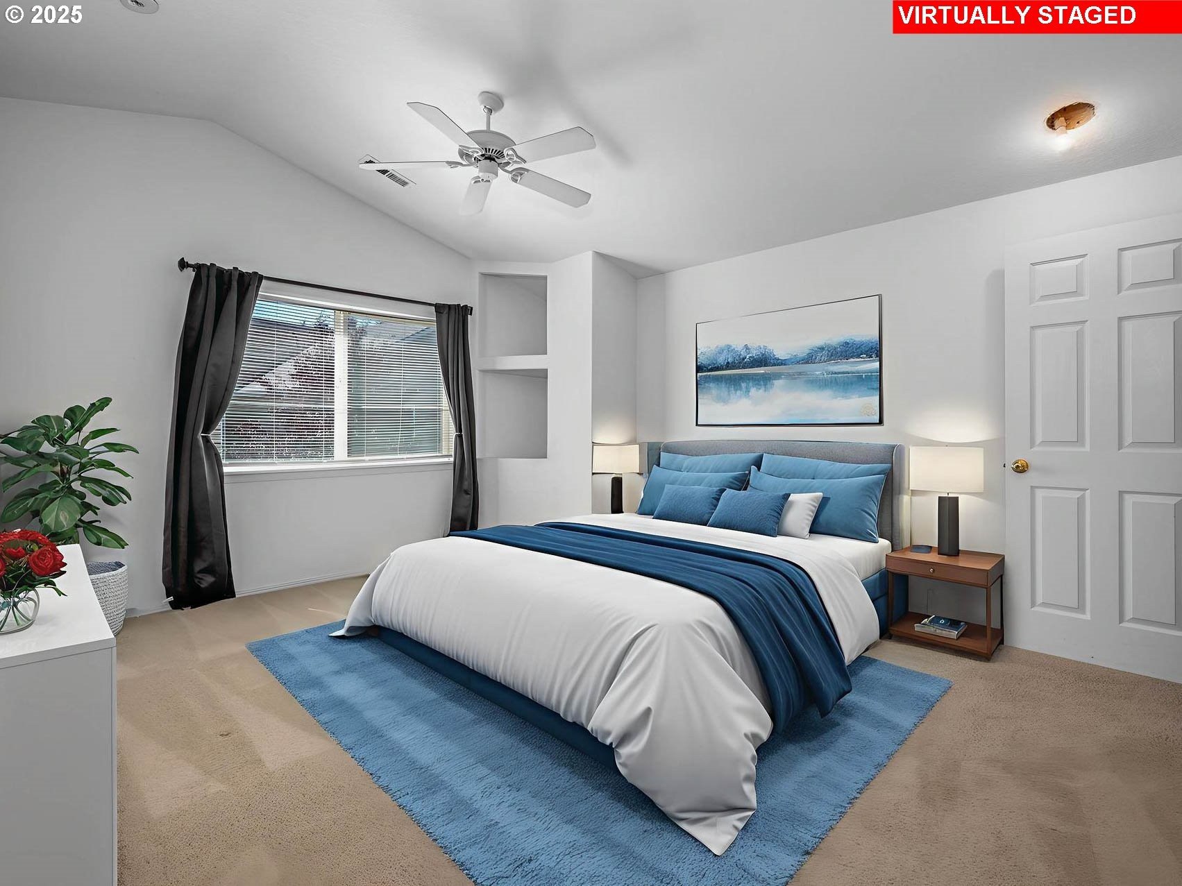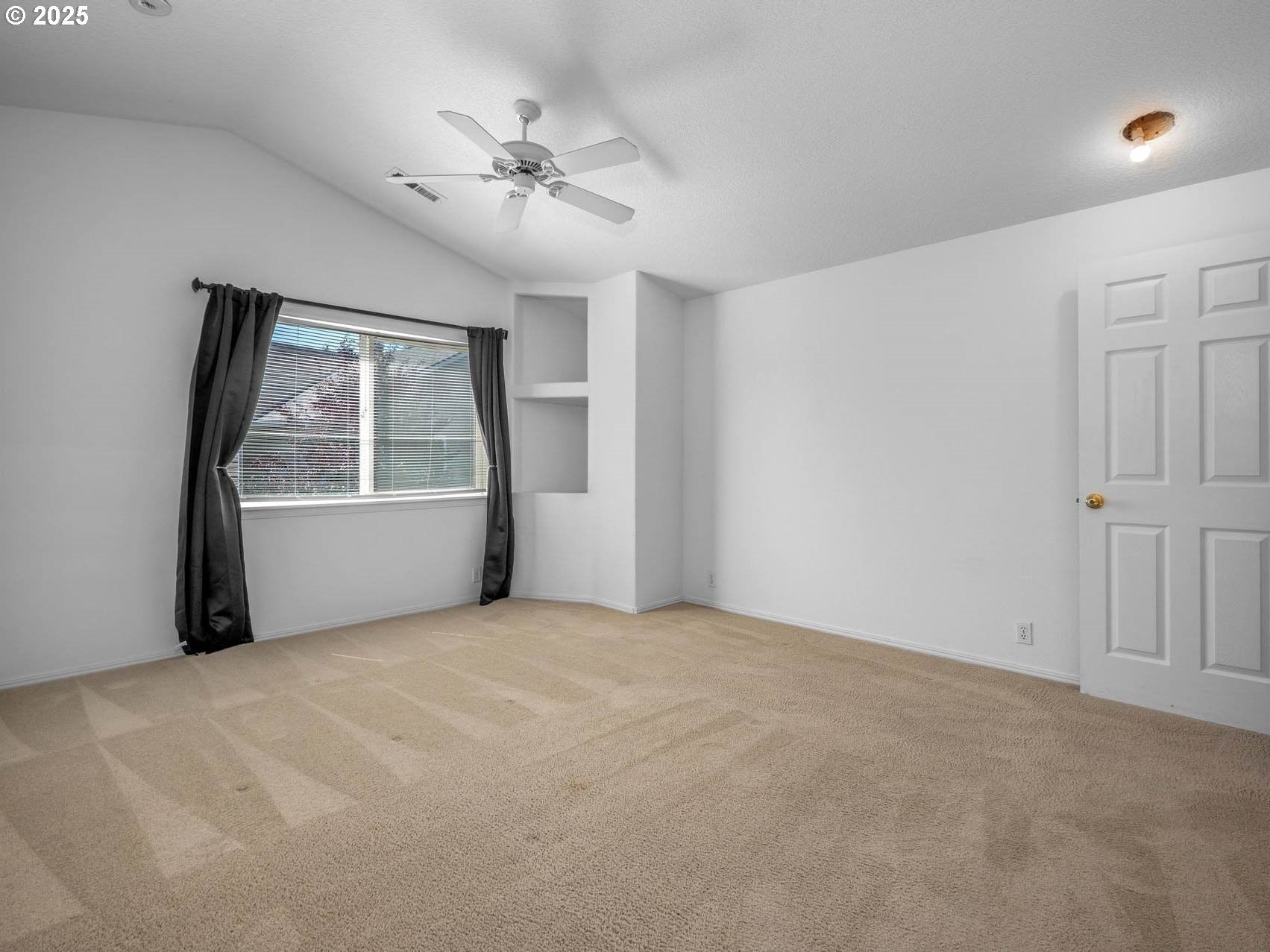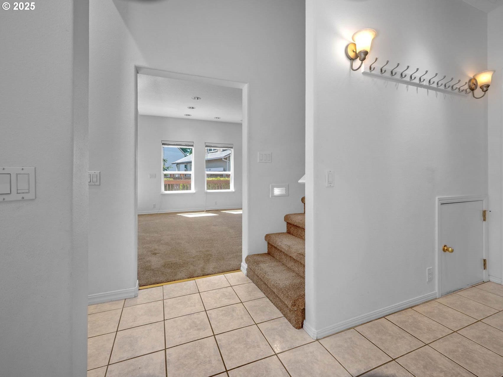 This inviting home features a bright, open floor plan with high ceilings in both the kitchen and living areas. The great room, centered around a cozy gas fireplace, flows seamlessly into the spacious kitchen with tiled flooring, abundant cabinetry, and plenty of counter space for cooking and entertaining. The vaulted primary suite offers generous storage, ample closet space, and a skylight in the bathroom, creating a bright and airy retreat. Two additional carpeted bedrooms upstairs provide flexibility for guests, family, or a home office. Perfectly situated on a peaceful street away from heavy traffic, the property is just minutes from Target, Home Depot, Starbucks, and the bus line, offering both convenience and tranquility. The fenced backyard includes a deck, a tool shed, and a dog run, providing versatile spaces for outdoor enjoyment, relaxing, or entertaining guests. [Home Energy Score = 7. HES Report at https://rpt.greenbuildingregistry.com/hes/OR10241449]