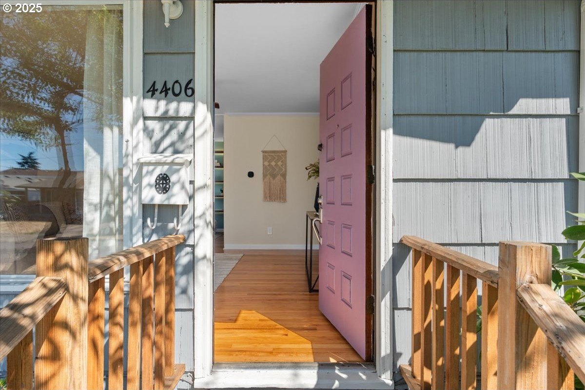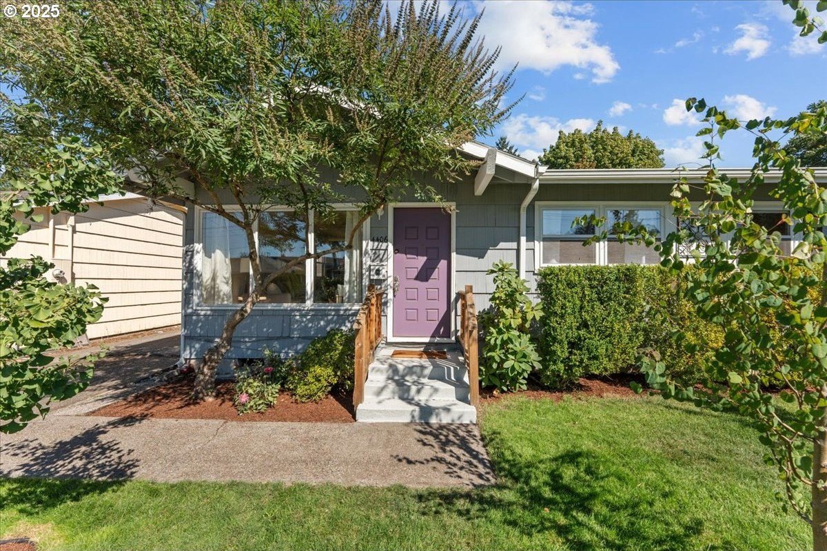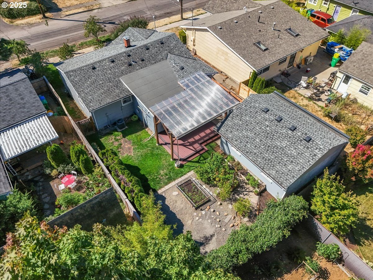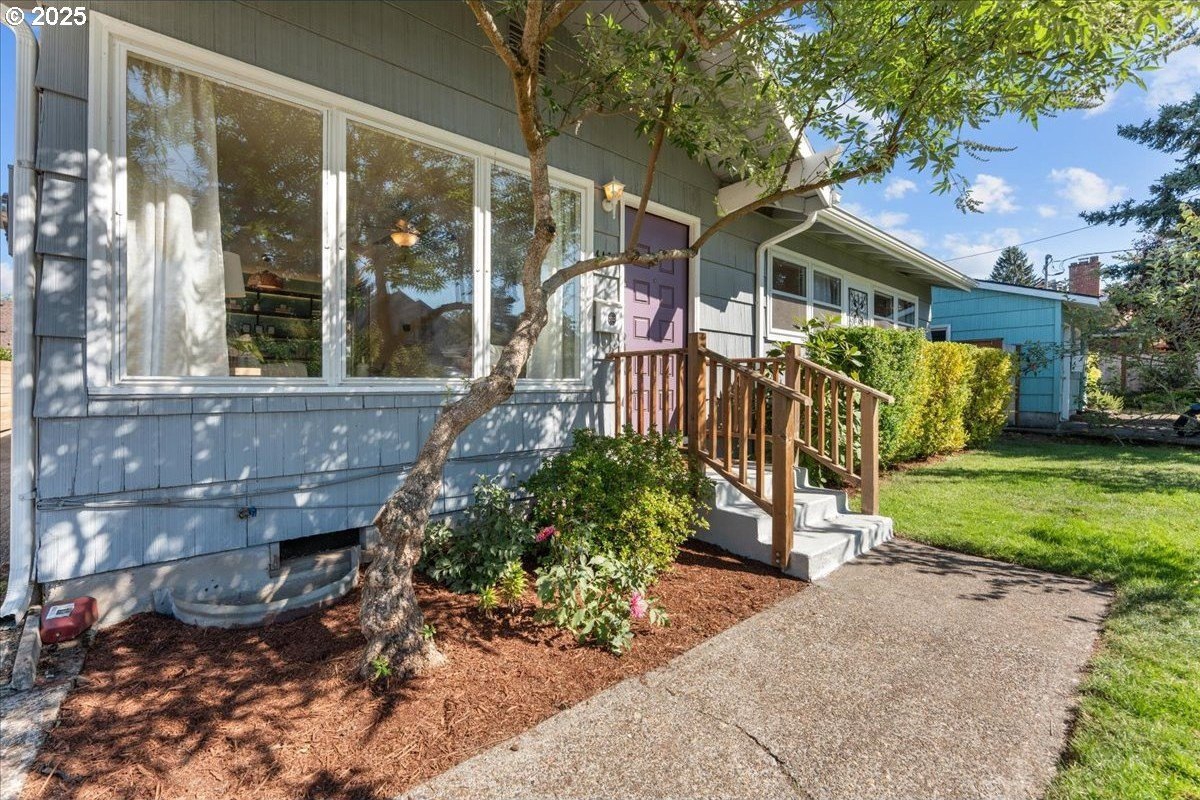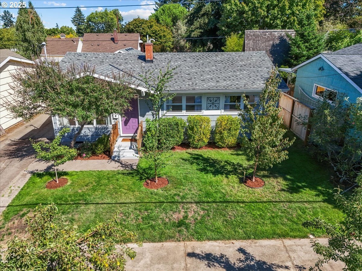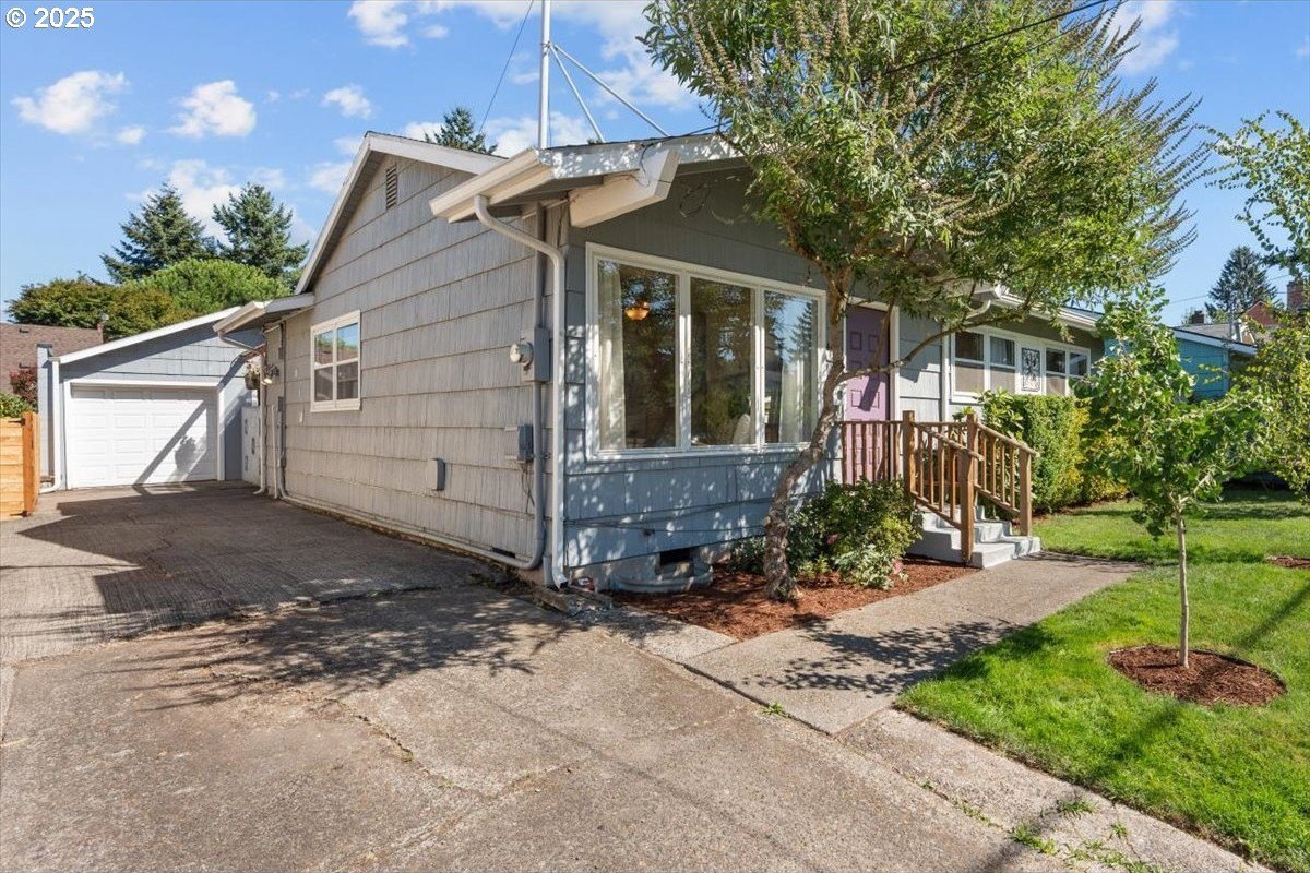 Charming & move-in ready 3-bedroom, 1-bath home offers 1,104 sq. ft. of comfortable living space. Inside you'll find beautiful hardwood floors and an updated kitchen with stainless steel appliances, perfect for everyday living and entertaining. An energy efficient gas furnace, AC, and new water heater keeps the home comfortable year-round, while seismic updates (bolted to the foundation) provide added peace of mind.The detached garage includes a finished bonus room, giving you a flexible space for a home office, gym, studio, or hobby room. Step outside to enjoy a covered Trex deck, perfect for relaxing or hosting friends. The backyard features raised garden beds, thriving blueberry and raspberry bushes, and a fire pit area—ideal for cozy evenings. Out front, mature pear trees welcome you home with seasonal fruit and charm. Located just blocks from the bus line, local stores, and restaurants, this home blends convenience with neighborhood charm. It’s truly move-in ready and waiting for its next chapter. [Home Energy Score = 6. HES Report at https://rpt.greenbuildingregistry.com/hes/OR10241418]
