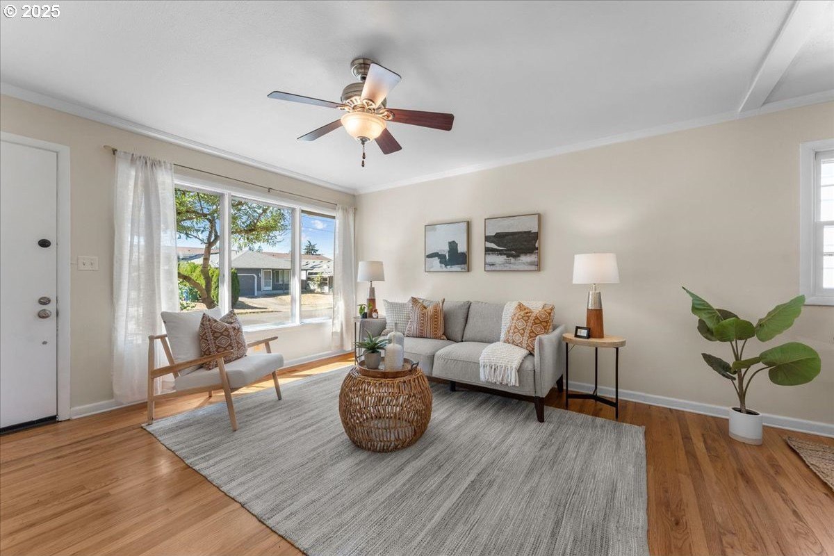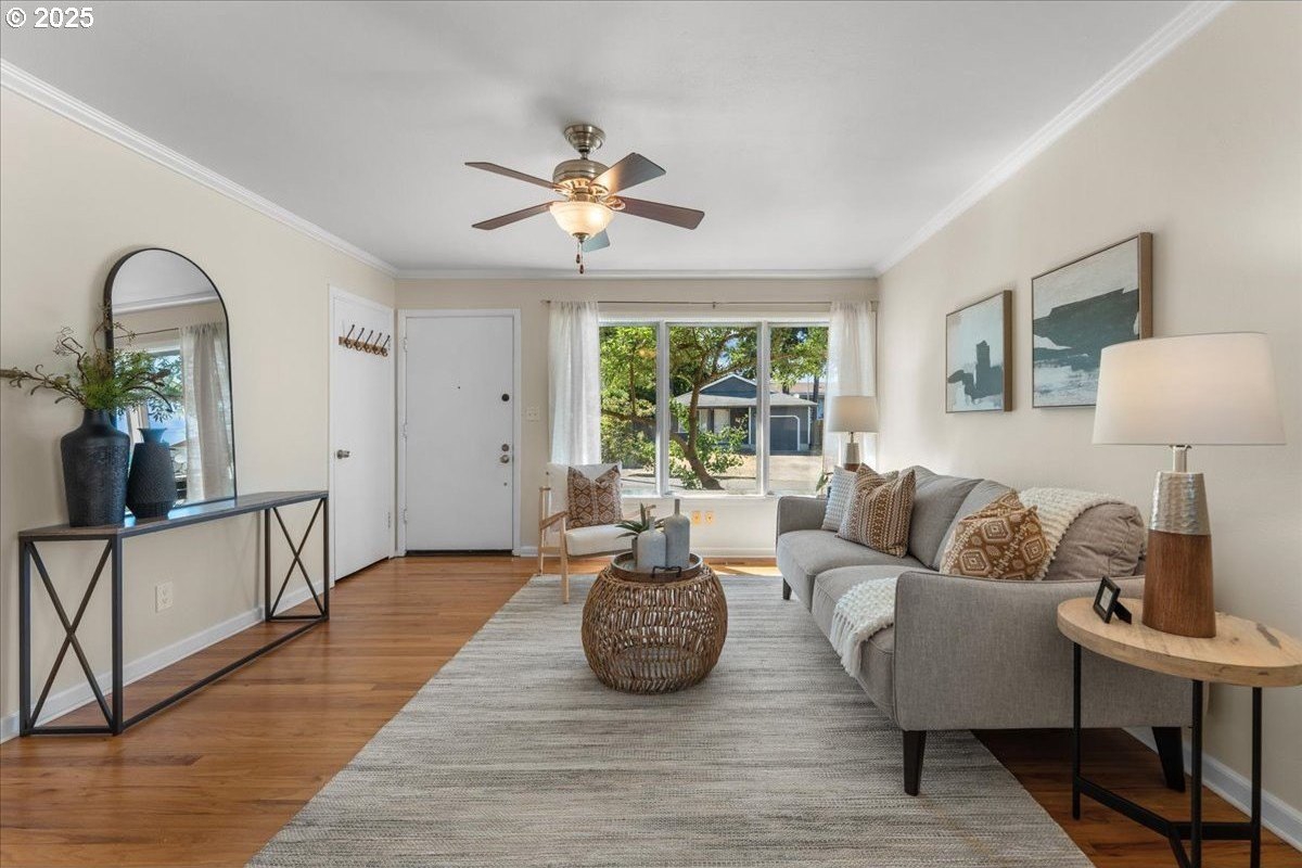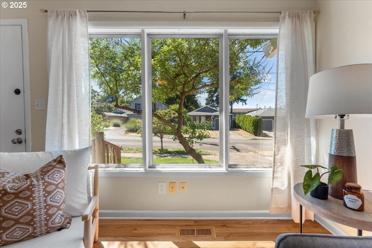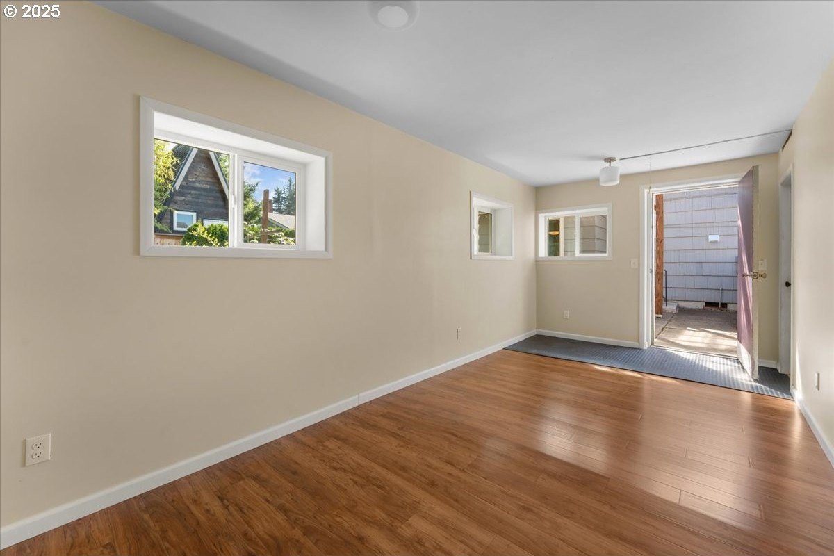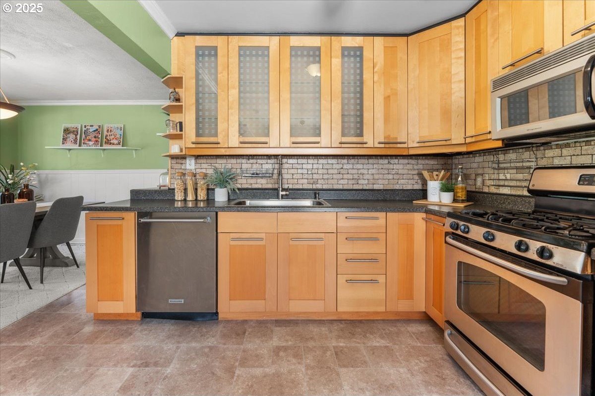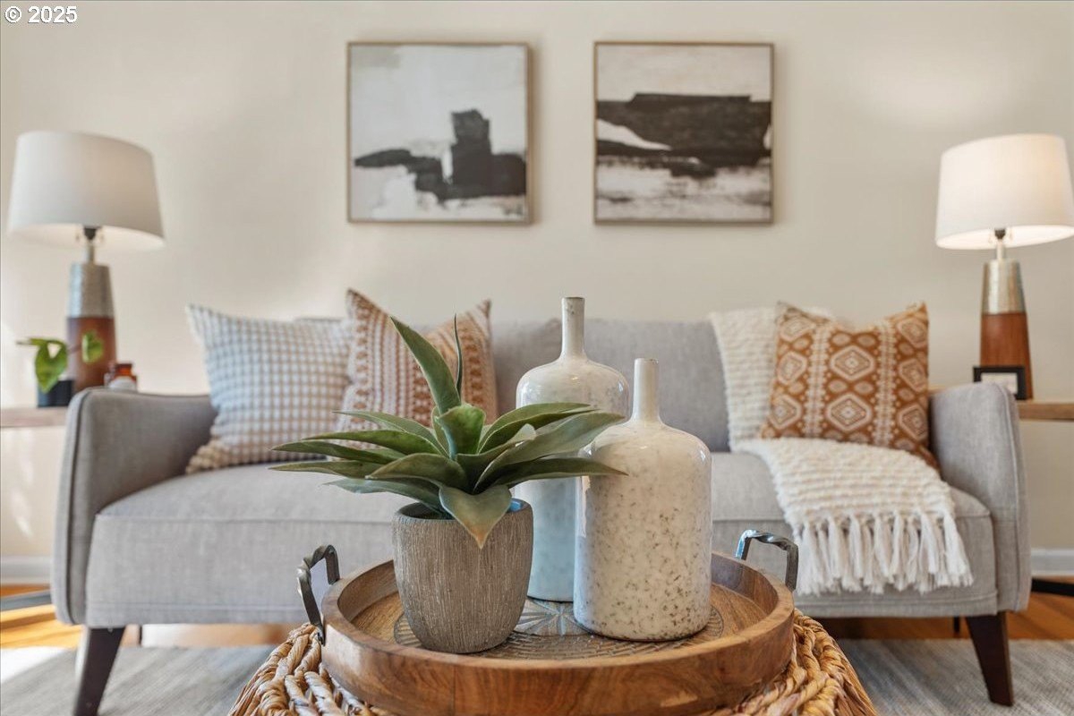 Charming & move-in ready 3-bedroom, 1-bath home offers 1,104 sq. ft. of comfortable living space. Inside you'll find beautiful hardwood floors and an updated kitchen with stainless steel appliances, perfect for everyday living and entertaining. An energy efficient gas furnace, AC, and new water heater keeps the home comfortable year-round, while seismic updates (bolted to the foundation) provide added peace of mind.The detached garage includes a finished bonus room, giving you a flexible space for a home office, gym, studio, or hobby room. Step outside to enjoy a covered Trex deck, perfect for relaxing or hosting friends. The backyard features raised garden beds, thriving blueberry and raspberry bushes, and a fire pit area—ideal for cozy evenings. Out front, mature pear trees welcome you home with seasonal fruit and charm. Located just blocks from the bus line, local stores, and restaurants, this home blends convenience with neighborhood charm. It’s truly move-in ready and waiting for its next chapter. [Home Energy Score = 6. HES Report at https://rpt.greenbuildingregistry.com/hes/OR10241418]