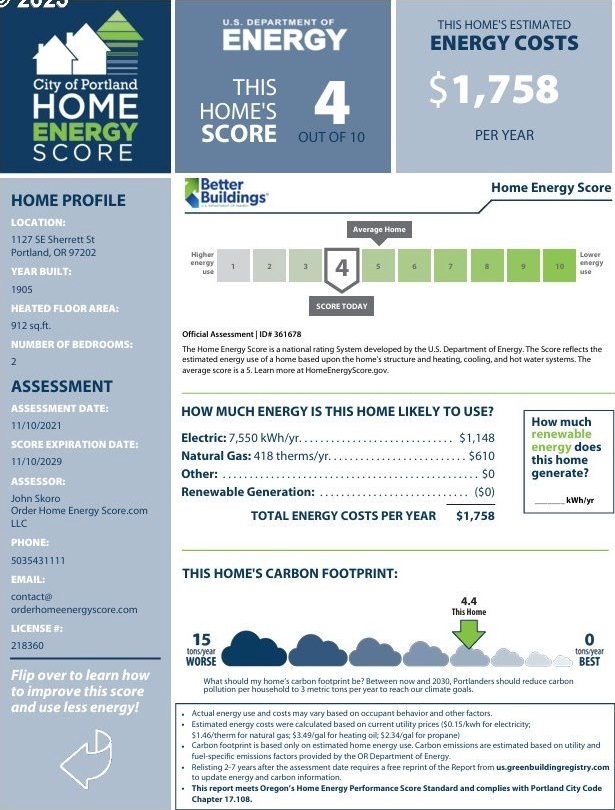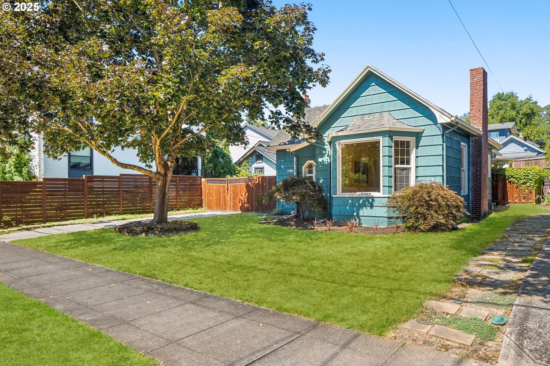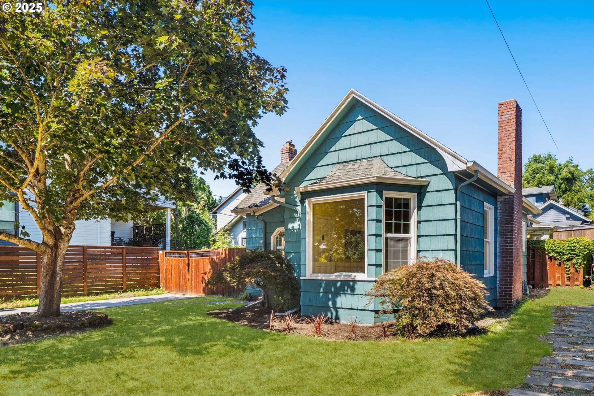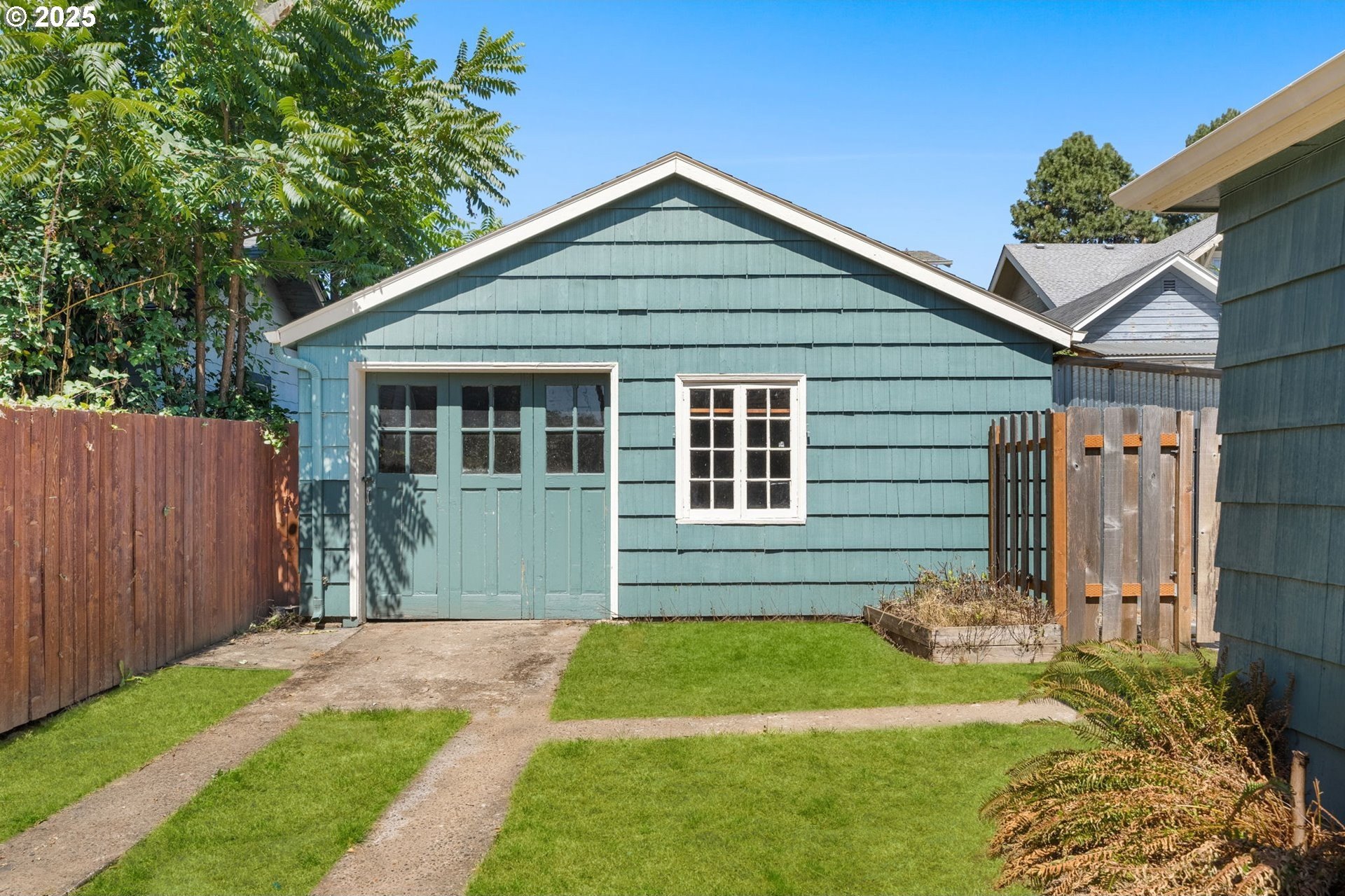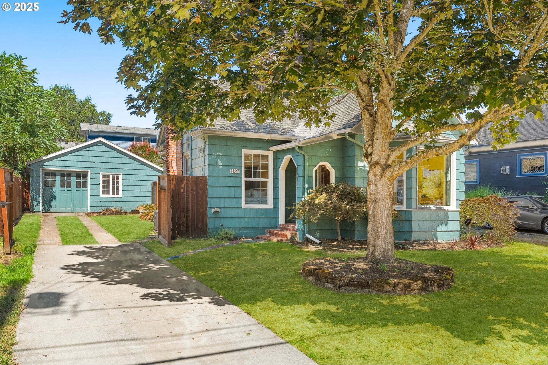 Charming 1905 bungalow in the heart of Sellwood! 2 bedrooms + a Jack-and-Jill bath, with the primary bedroom offering a walk-in closet and built-ins. Oak floors, graceful archways, and a floor-to-ceiling brick fireplace. A butler’s pantry with original cabinetry leads into an updated kitchen with butcher block counters, subway tile backsplash, hand-forged hardware, abundant storage, and a breakfast nook. From the kitchen, a Dutch door opens to a versatile sunroom suited for laundry, hobbies, or quiet retreat. The fenced yard includes covered storage and a 440-sq-ft detached garage/workshop with its own electrical panel, plus off-street parking for 3+ vehicles. Recent updates include a new furnace, A/C, water and sewer lines, fencing, gutters, interior and exterior paint, and a parking pad. Unbeatable SE location close to cafés, shops, New Seasons Market, parks, river, and transit! [Home Energy Score = 4. HES Report at https://rpt.greenbuildingregistry.com/hes/OR10196590]