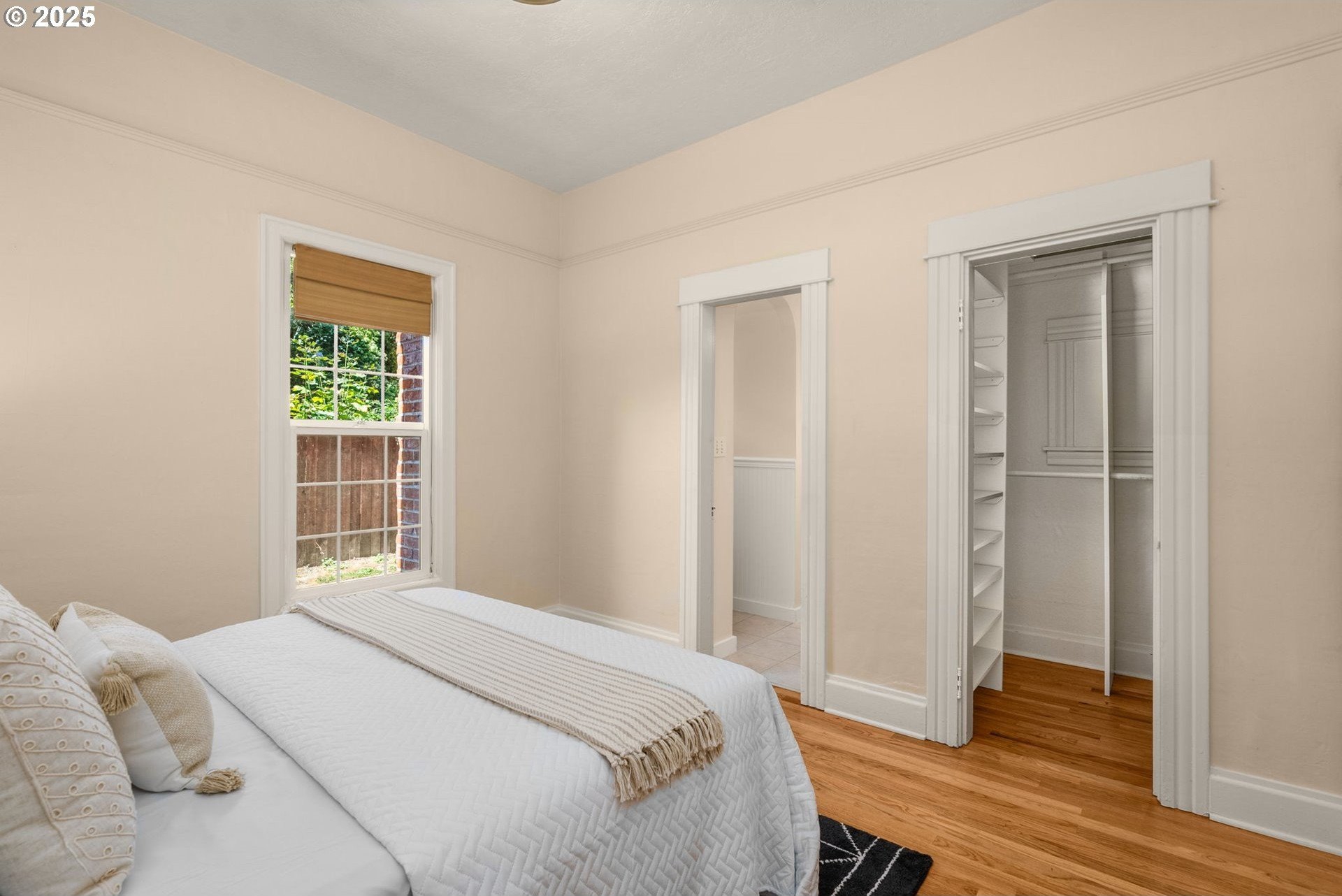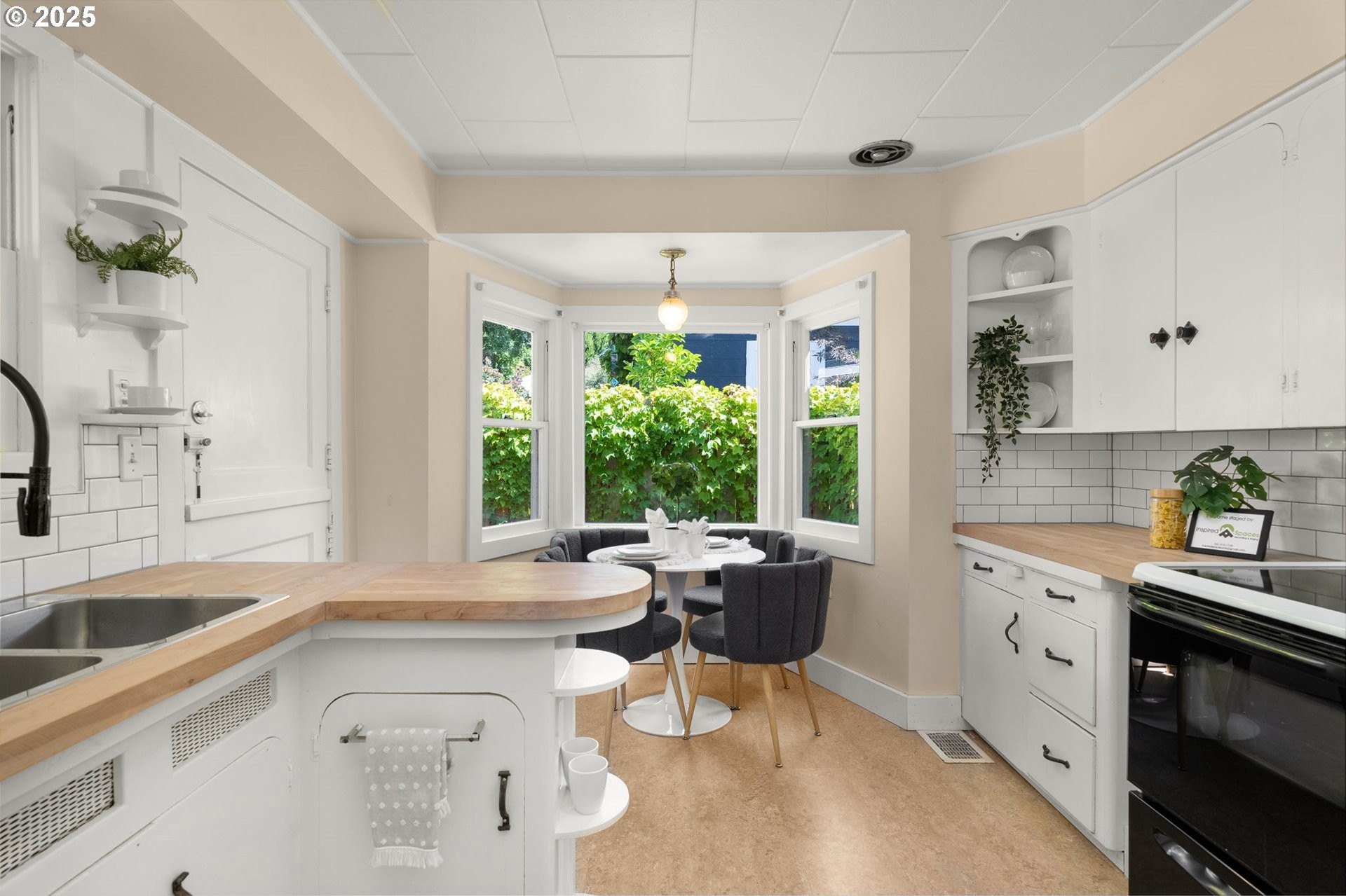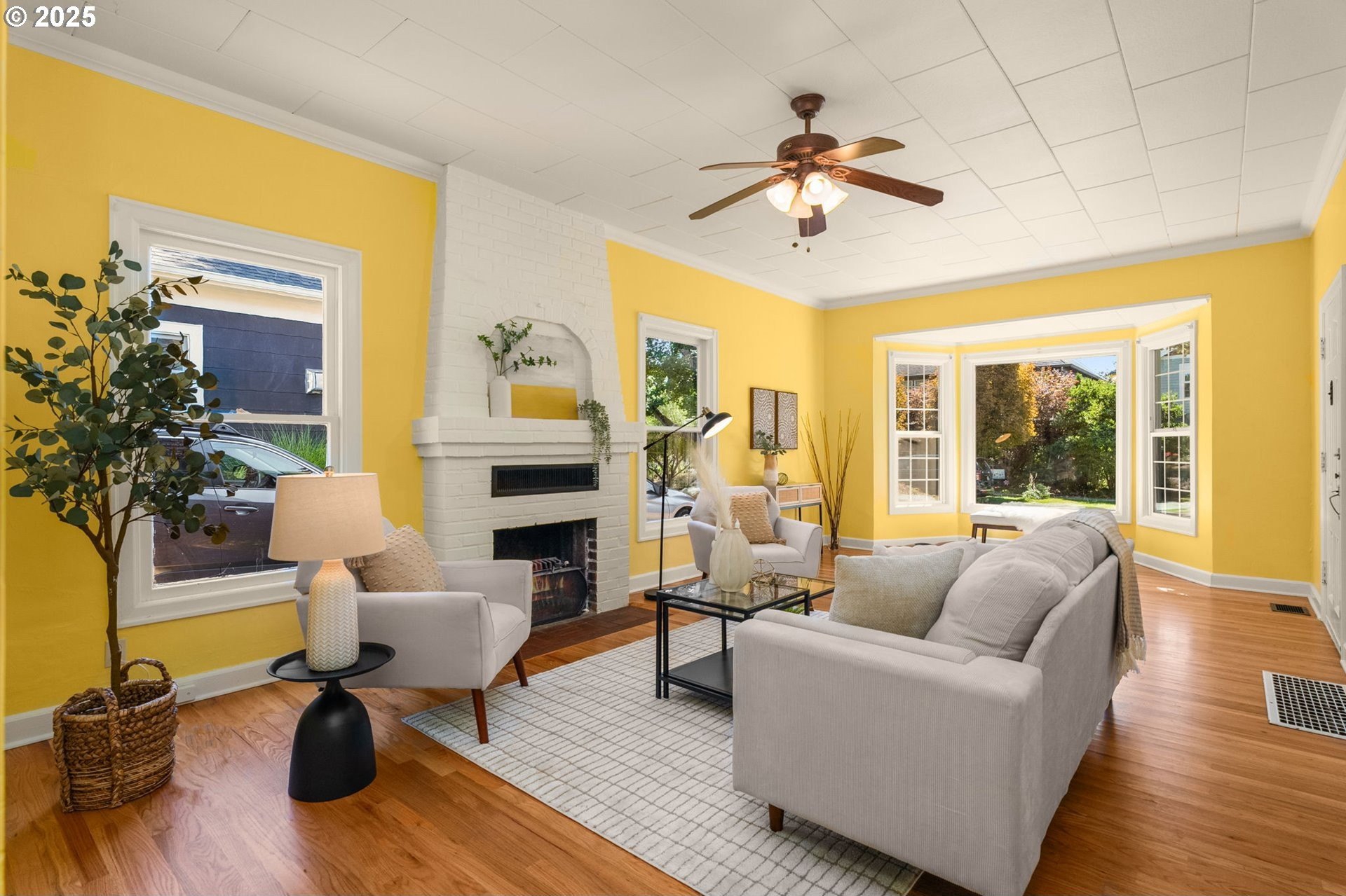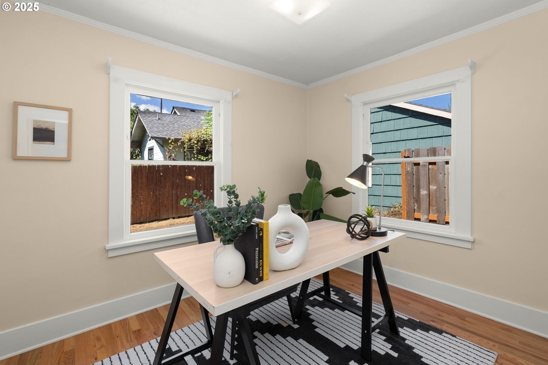 Charming 1905 bungalow in the heart of Sellwood! 2 bedrooms + a Jack-and-Jill bath, with the primary bedroom offering a walk-in closet and built-ins. Oak floors, graceful archways, and a floor-to-ceiling brick fireplace. A butler’s pantry with original cabinetry leads into an updated kitchen with butcher block counters, subway tile backsplash, hand-forged hardware, abundant storage, and a breakfast nook. From the kitchen, a Dutch door opens to a versatile sunroom suited for laundry, hobbies, or quiet retreat. The fenced yard includes covered storage and a 440-sq-ft detached garage/workshop with its own electrical panel, plus off-street parking for 3+ vehicles. Recent updates include a new furnace, A/C, water and sewer lines, fencing, gutters, interior and exterior paint, and a parking pad. Unbeatable SE location close to cafés, shops, New Seasons Market, parks, river, and transit! [Home Energy Score = 4. HES Report at https://rpt.greenbuildingregistry.com/hes/OR10196590]