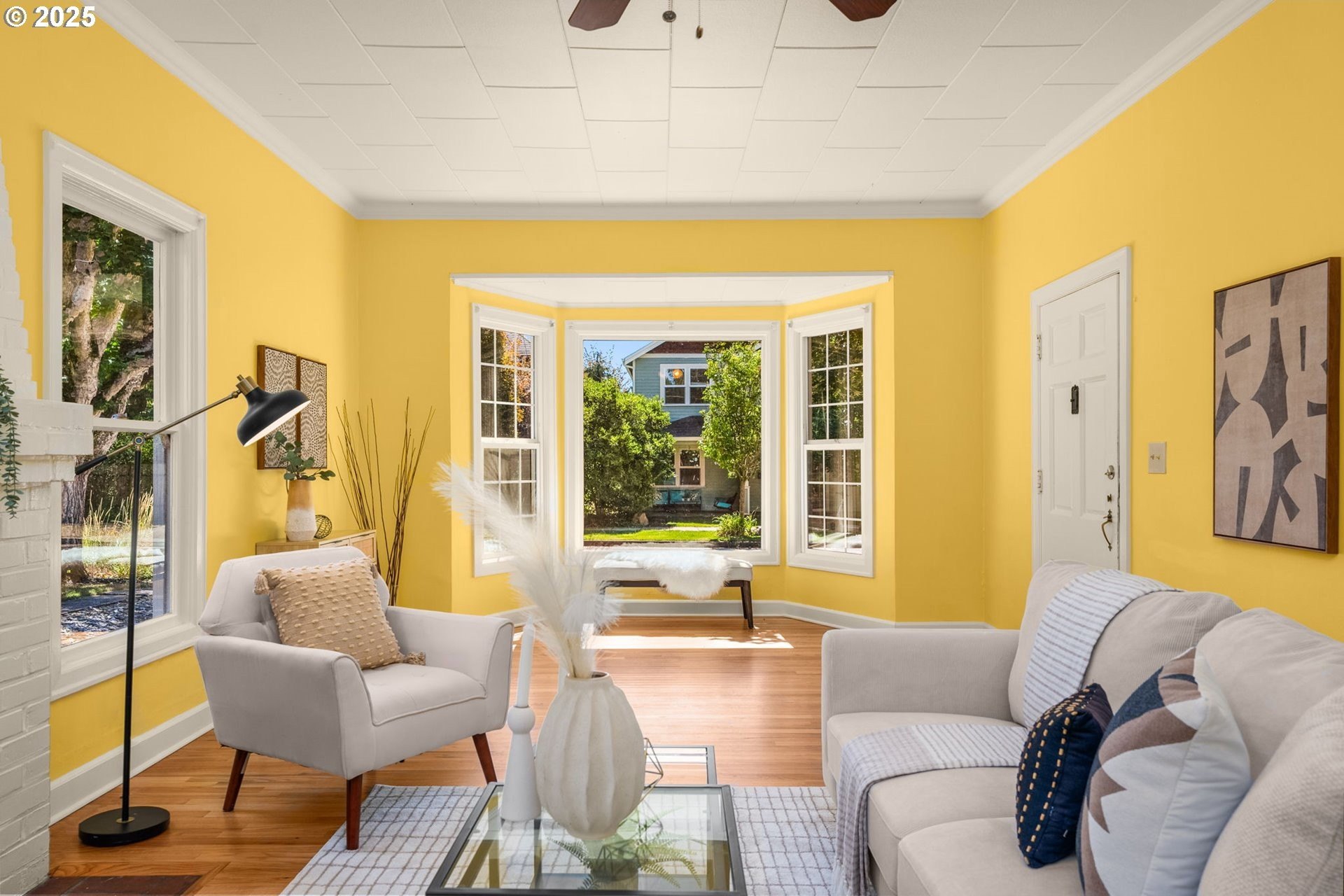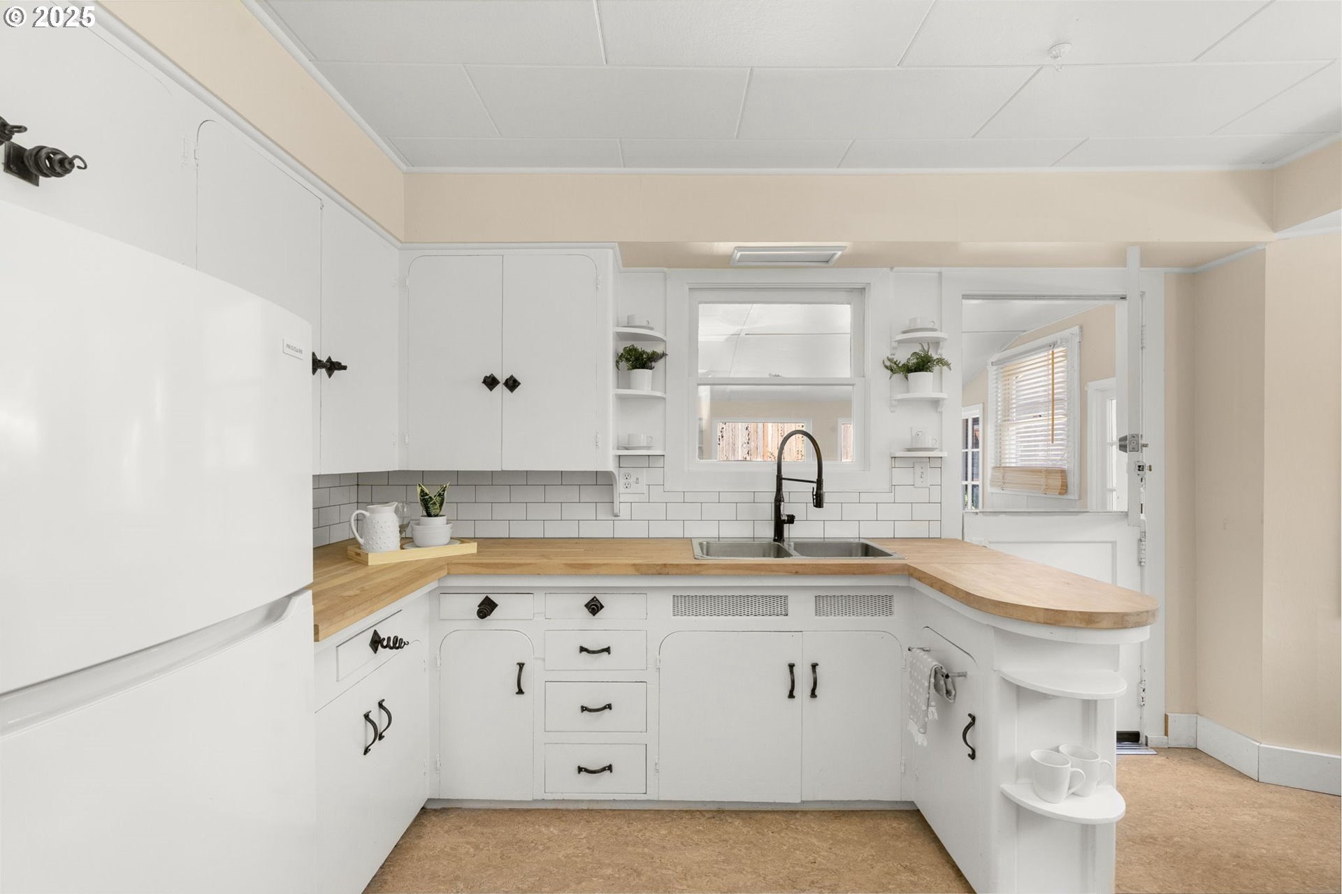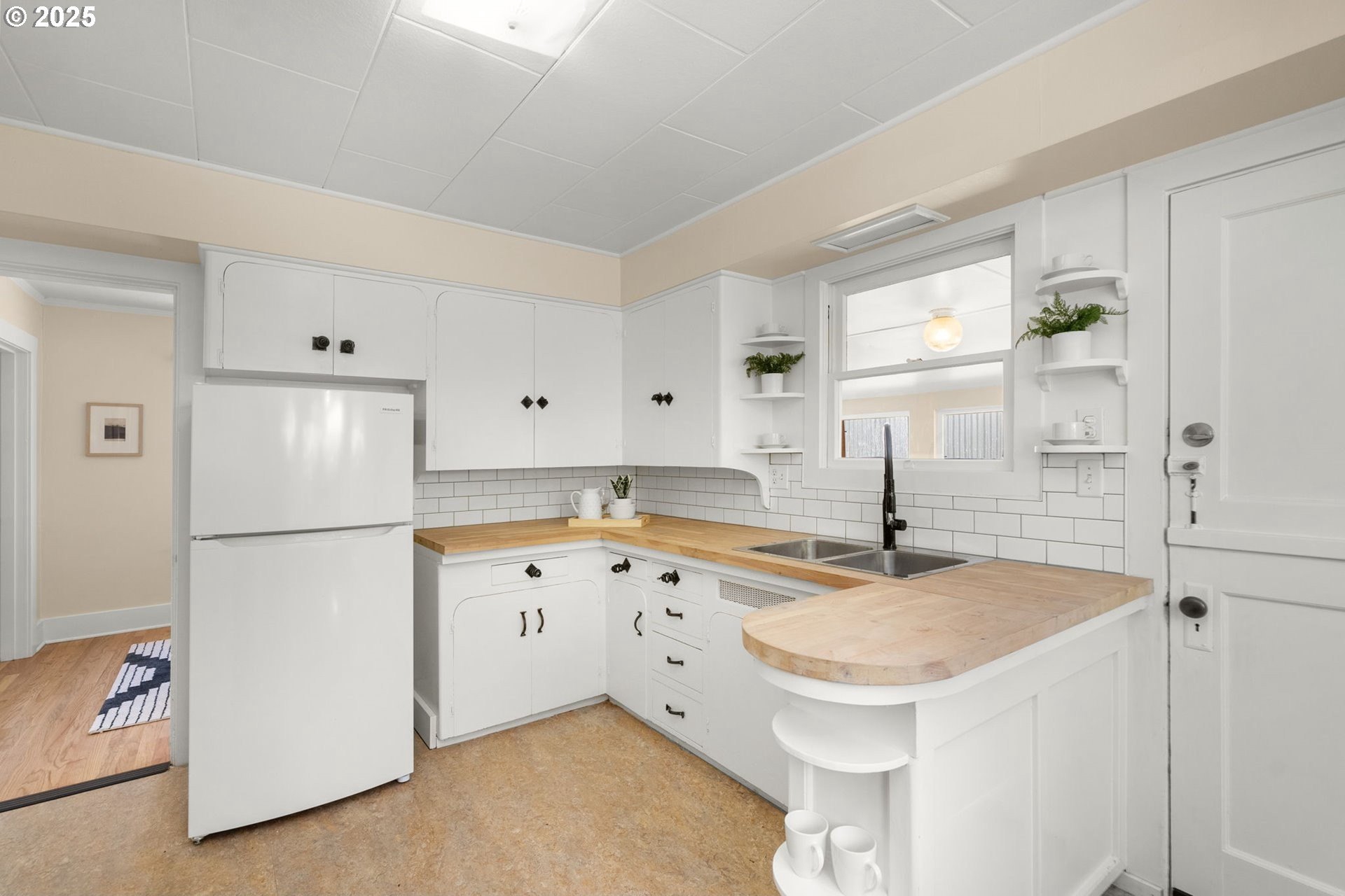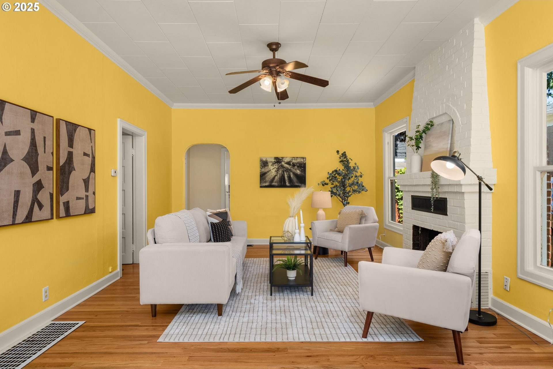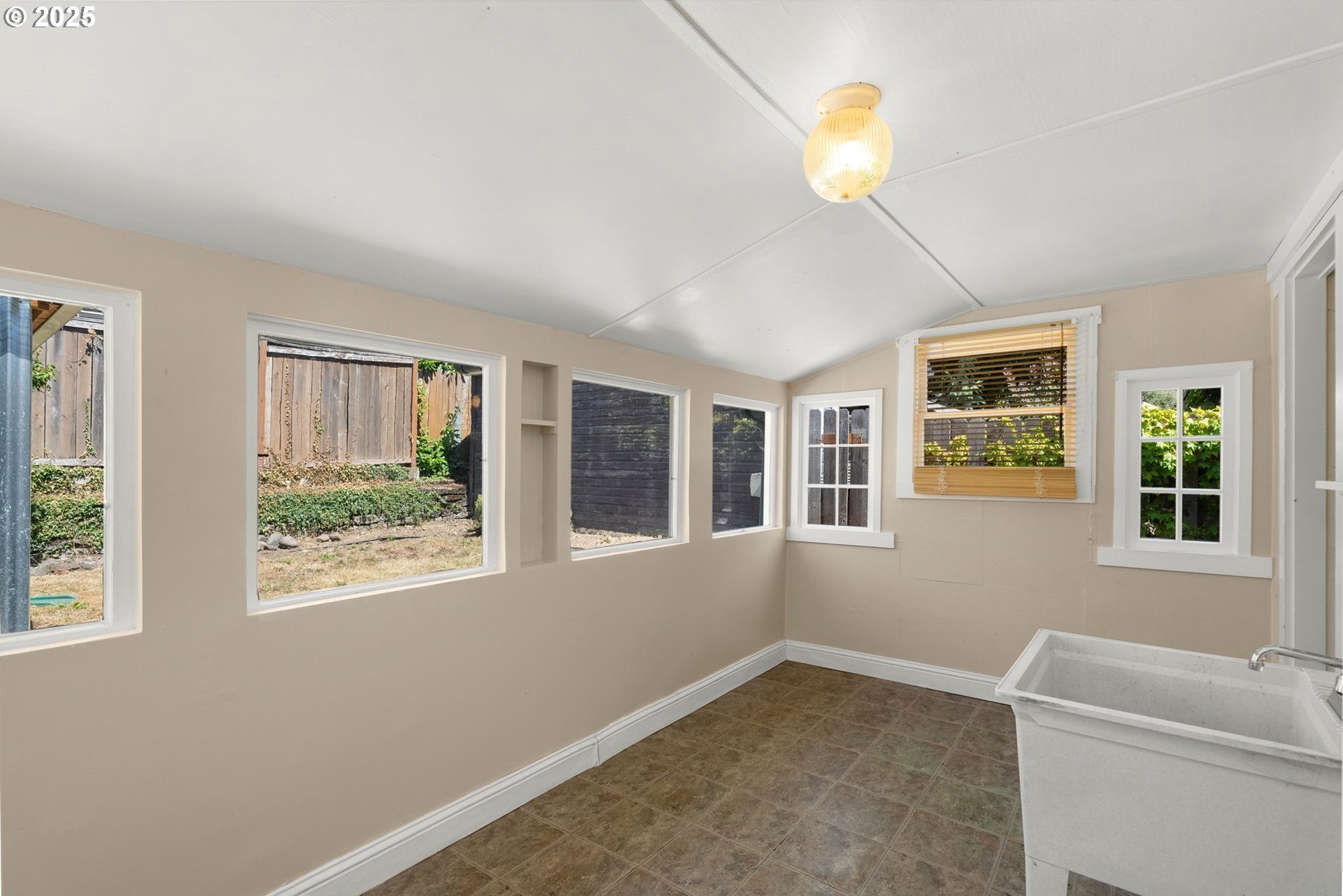 Charming 1905 bungalow in the heart of Sellwood! 2 bedrooms + a Jack-and-Jill bath, with the primary bedroom offering a walk-in closet and built-ins. Oak floors, graceful archways, and a floor-to-ceiling brick fireplace. A butler’s pantry with original cabinetry leads into an updated kitchen with butcher block counters, subway tile backsplash, hand-forged hardware, abundant storage, and a breakfast nook. From the kitchen, a Dutch door opens to a versatile sunroom suited for laundry, hobbies, or quiet retreat. The fenced yard includes covered storage and a 440-sq-ft detached garage/workshop with its own electrical panel, plus off-street parking for 3+ vehicles. Recent updates include a new furnace, A/C, water and sewer lines, fencing, gutters, interior and exterior paint, and a parking pad. Unbeatable SE location close to cafés, shops, New Seasons Market, parks, river, and transit! [Home Energy Score = 4. HES Report at https://rpt.greenbuildingregistry.com/hes/OR10196590]