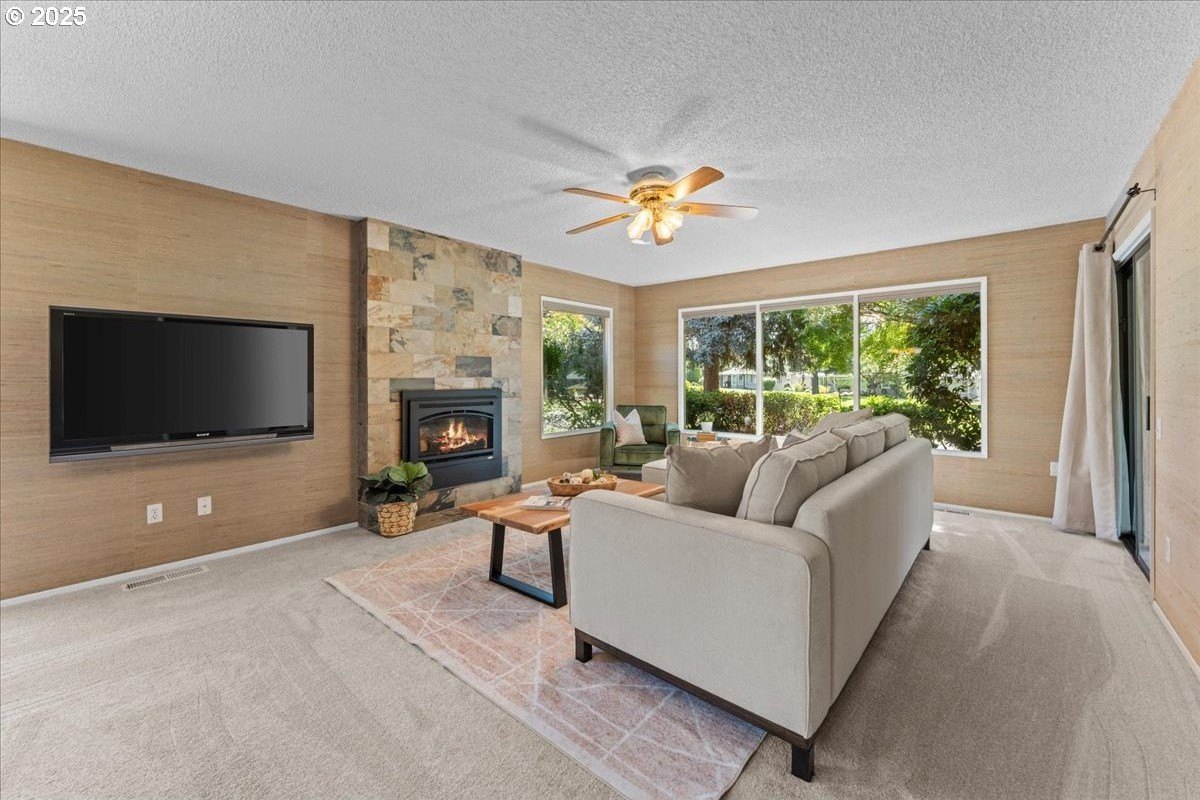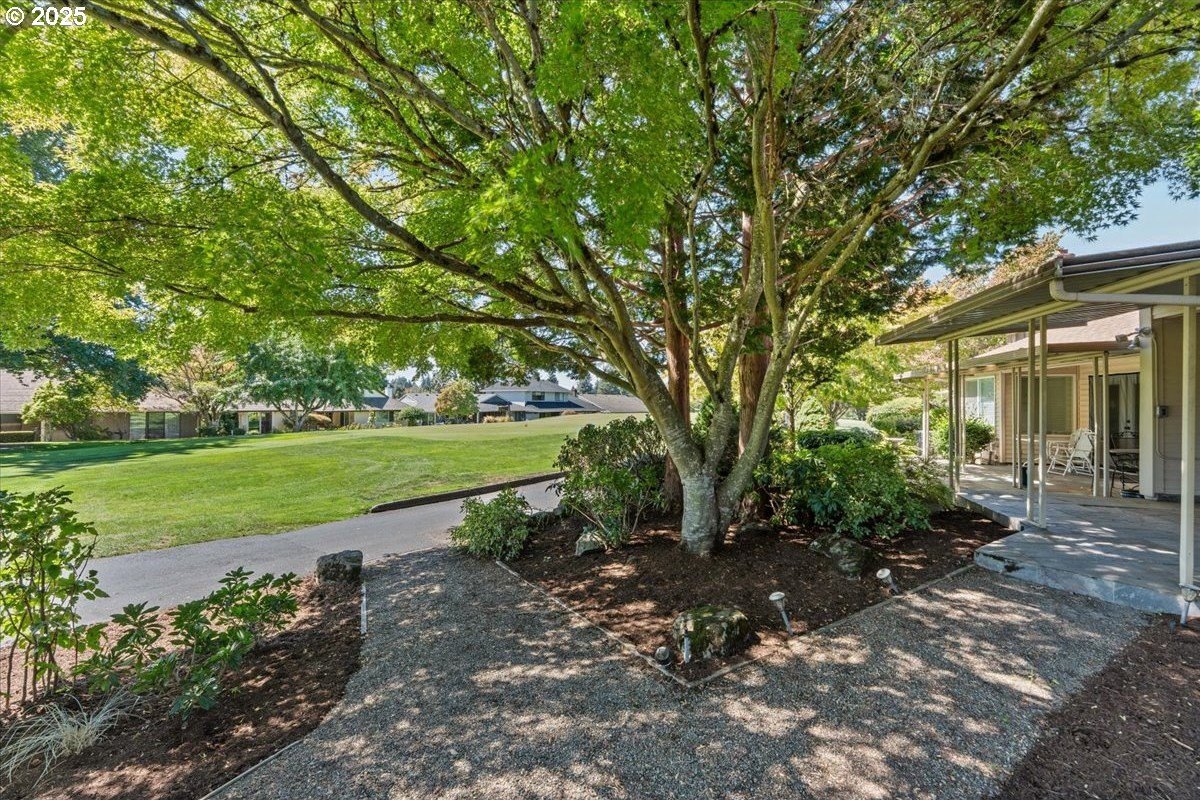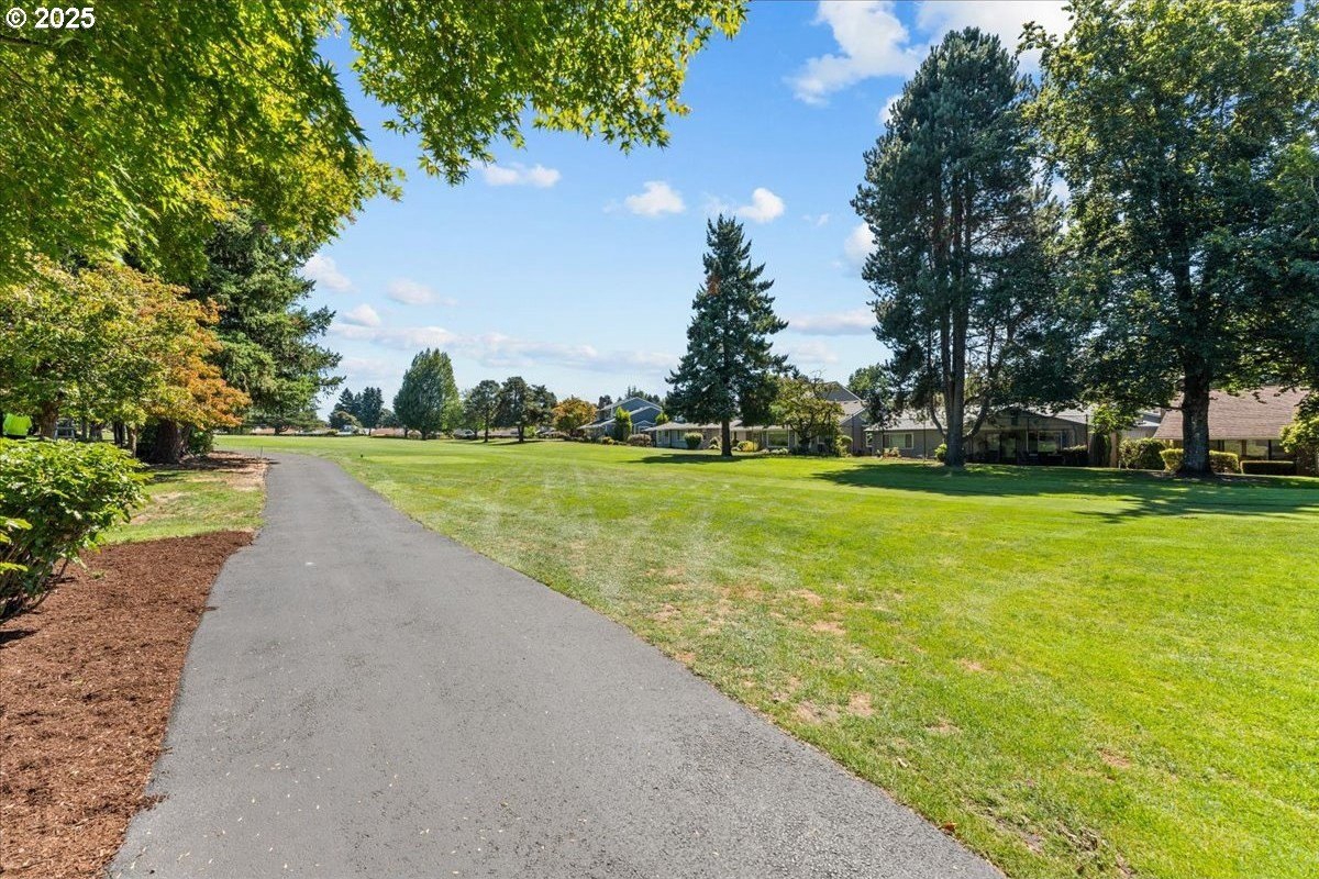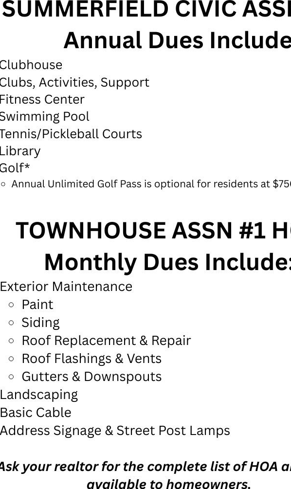 Welcome home to this charming 1-level townhome on the golf course in the vibrant Summerfield 55+ community! Just the right size for entertaining & everyday living, this 2 bedroom, 2 bath updated beauty features an inviting living room w/large windows, fireplace w/gas insert & sliding glass door opening to a gracious paver back patio. Natural light filters in as you watch your favorite foursomes take their opening drive from the first tee. Make the patio space your outdoor oasis w/cushy furniture & colorful potted plants! The lush landscape, shade, & sweeping golf course view make it a perfect place to host a barbecue or to relax w/a book. The kitchen w/garden window, updated appliances, and granite countertops is located right between a cheery breakfast nook & a formal dining area. Transferring meals to either table is so convenient. The primary bedroom has an ensuite bath w/updated glass & tile shower & double closets. Bedroom #2 can be used as a guestroom, office, or sewing room. Its built-in cabinets & desk are perfect for storage of all your important documents and/or fun crafting items! The 2-car garage offers lots of cabinet storage, plus a pull down ladder to tuck seasonal items & totes out of sight in the overhead attic area. The refrigerator, upright freezer, & washer & dryer are included. Updates 2025: New Carpet, New Microwave. 2024: New Roof. 2017: New Primary Bath Shower. 2013: Kitchen & Bath Remodel. Residents become members of the Summerfield Clubhouse, featuring golf, tennis, pickleball, swimming, & a variety of social & fitness activities including book clubs, art classes, music classes, and so much more! HOA takes care of exterior maintenance, lawn care, & provides basic cable TV, allowing you more time to enjoy all Summerfield 55+ community amenities. Please ask for the complete list of HOA Amenities included! Located just steps away from the clubhouse, pool, & pro shop, & close to local dining & shopping. Carefree retirement living at its best!