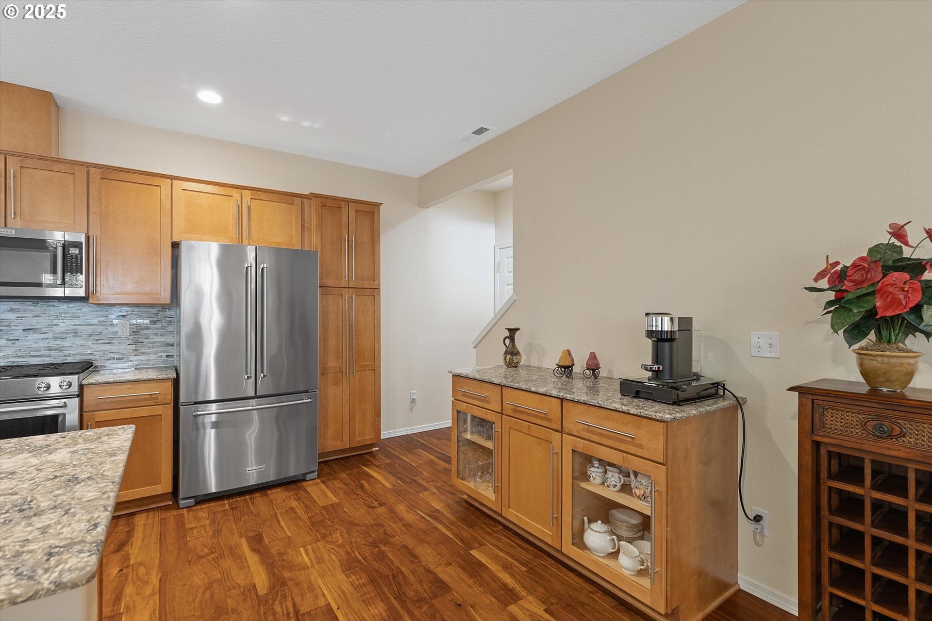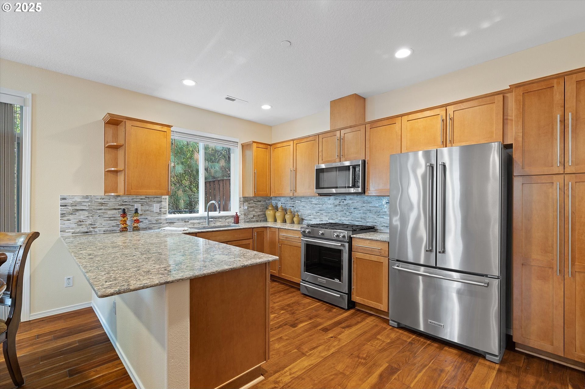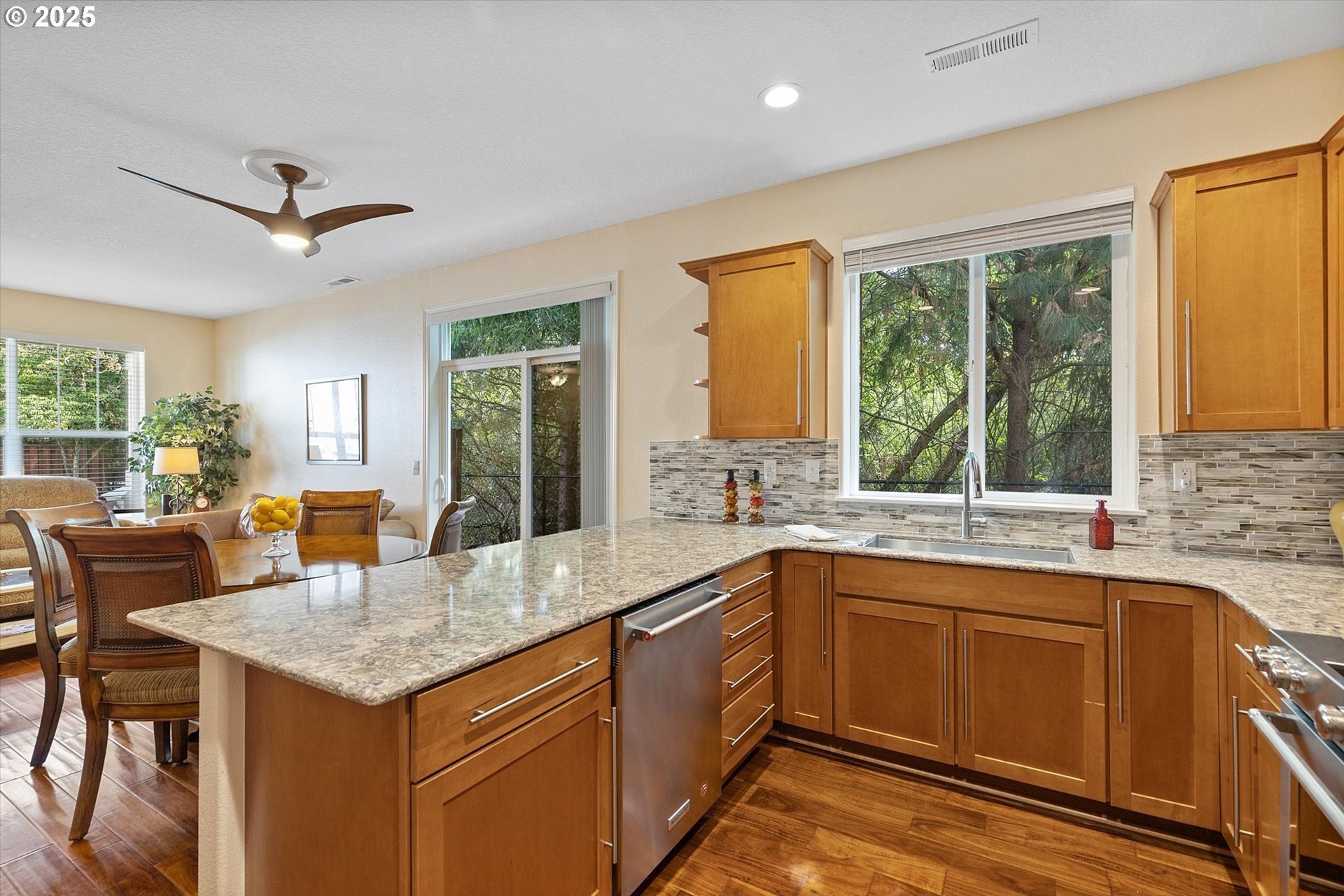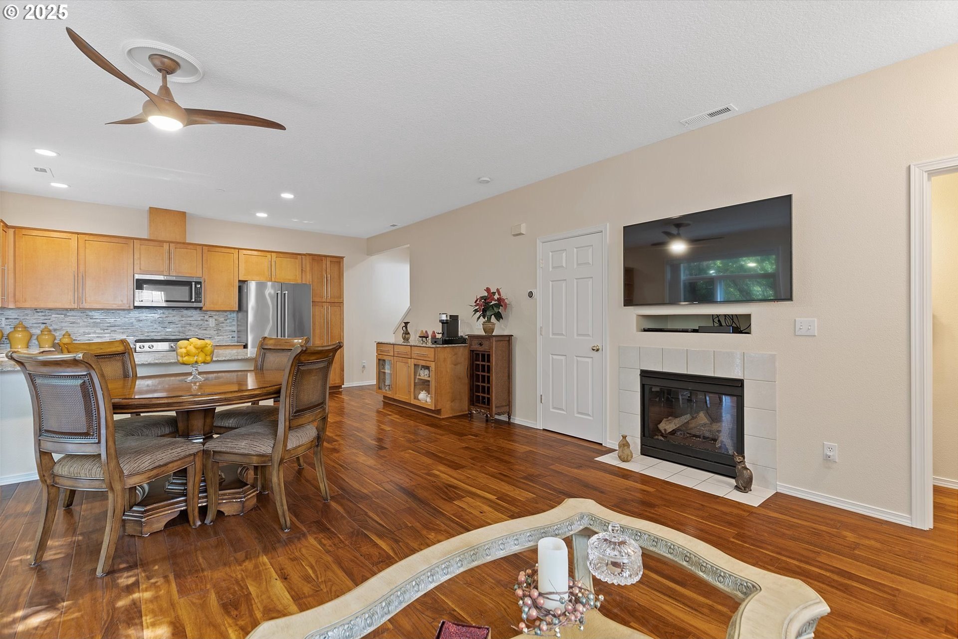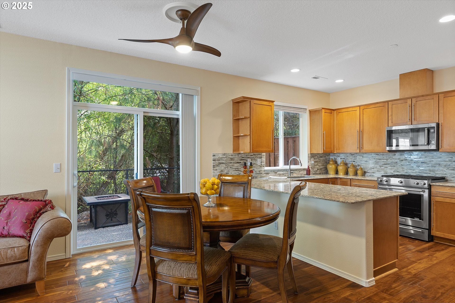 Meticulously remodeled end unit condo in desirable Progress Ridge area. Next to a beautiful green-space with a creek on a dead end street. Situated in prime location in the Orchard Glen neighborhood near the community park with a playground and basketball court. The main level flows seamlessly from the entry boasting high ceilings to the open concept living with a cozy gas fireplace. Dining area has slider to patio and connects to the spacious remodeled kitchen with an eat bar, beautiful granite counters, soft close cabinets and drawers, plus stainless steel kitchen aid appliances. Nicely updated half bath tucked away for privacy. Primary suite has walk-in closet, oversized vanity, shower/tub combo, and separate toilet room. Upstairs laundry room conveniently next to bedrooms and full bathroom. Bamboo floors upstairs. Plenty of storage and closet space throughout each floor and in garage. Private and serene back yard is fenced adjoining green space for added privacy! Perfect for entertaining and relaxing. HOA maintains all common areas, ground maintenance, front and back landscaping, and exterior maintenance. All kitchen appliances, extra freezer in garage and washer and dryer are included. See 3D Tour! New interior paint, finished garage, New blinds, new slider, Near walking paths, lots of great restaurants, shopping, entertainment and so many more amenities! See attached list of updates.
