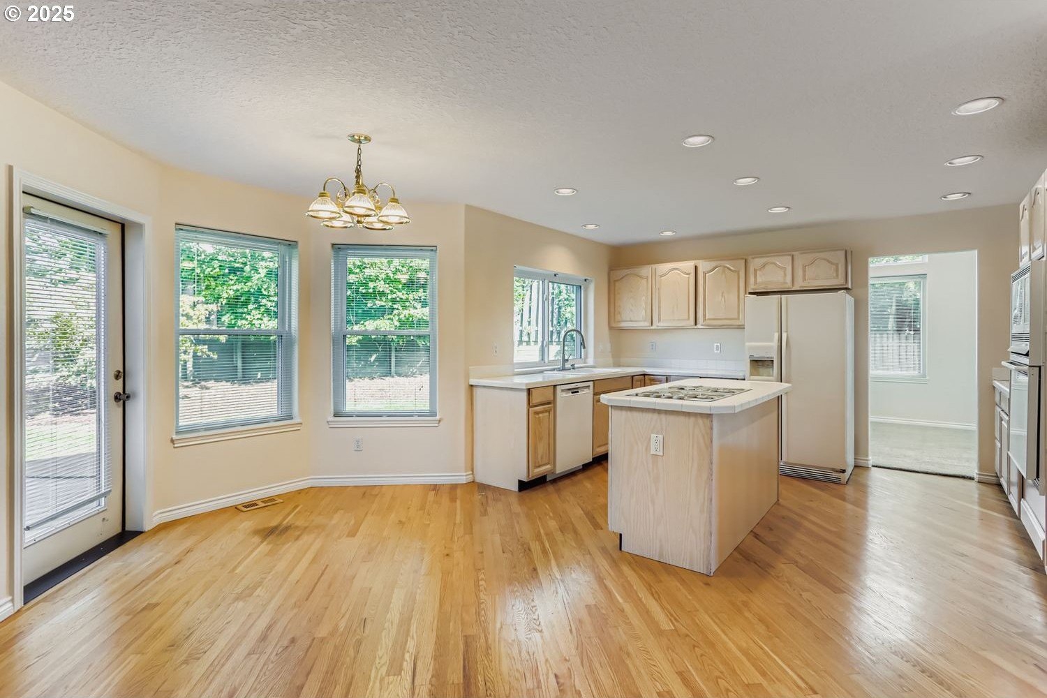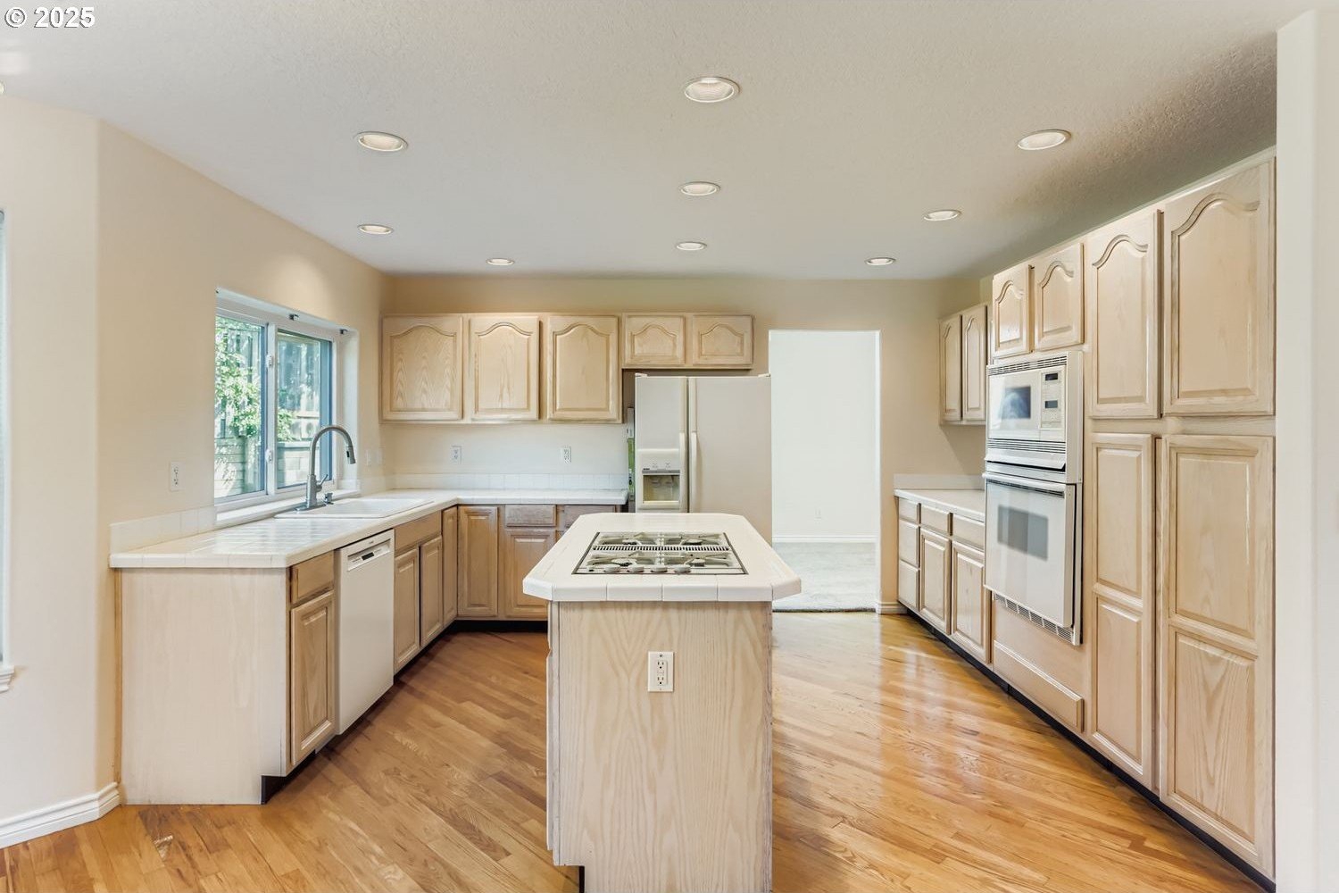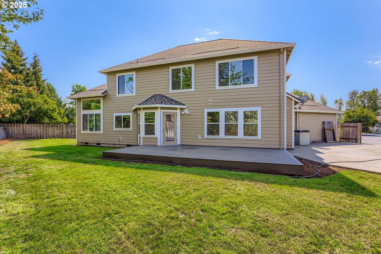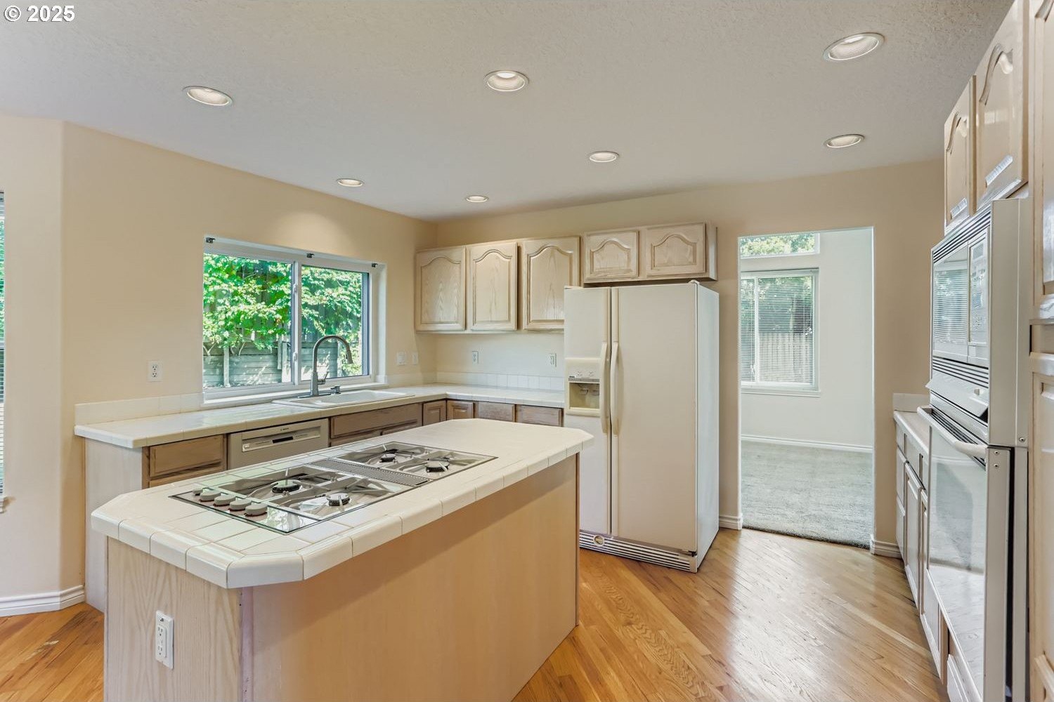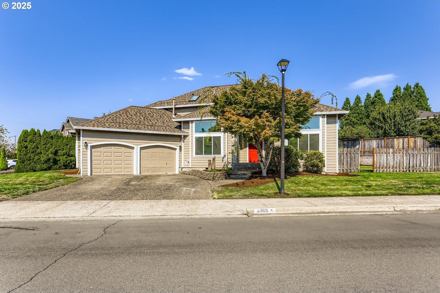 Fantastic Rock Creek Contemporary on quiet, loop street! With soaring ceilings, new upgraded vinyl windows, and an open design, natural light abounds! This two-story contemporary has been recently updated with big-ticket upgrades, including a new composition roof, brand-new fiber cement siding, a new deck, and more. Oversized kitchen features hardwood floors, abundant cabinetry space, cooking island, and all appliances included. The kitchen is open to a sunny dining nook and large family room with new carpet and a gas fireplace. Upstairs, French doors introduce a deluxe primary suite with new carpet, two closets (one walk-in),and an attached bathroom with soaking tub, walk-in shower, dual sinks, new LVT flooring, and skylight. There are two more sizable upstairs bedrooms, with ceiling fans and new carpet, plus a second full bathroom with double sinks and new LVT flooring. Perfectly situated on a private corner lot with a new high-end deck and poured concrete patio. Great location, close to several THPRD parks and trails, Rock Creek Country Club, and neighborhood schools.