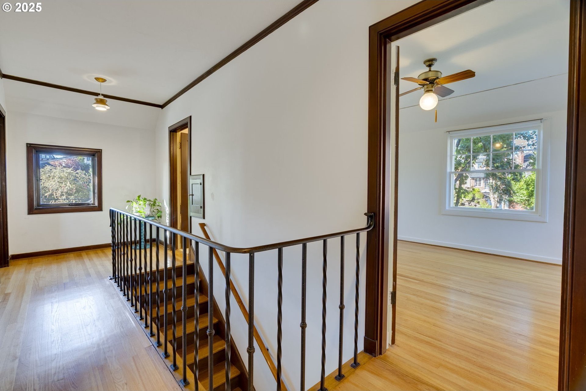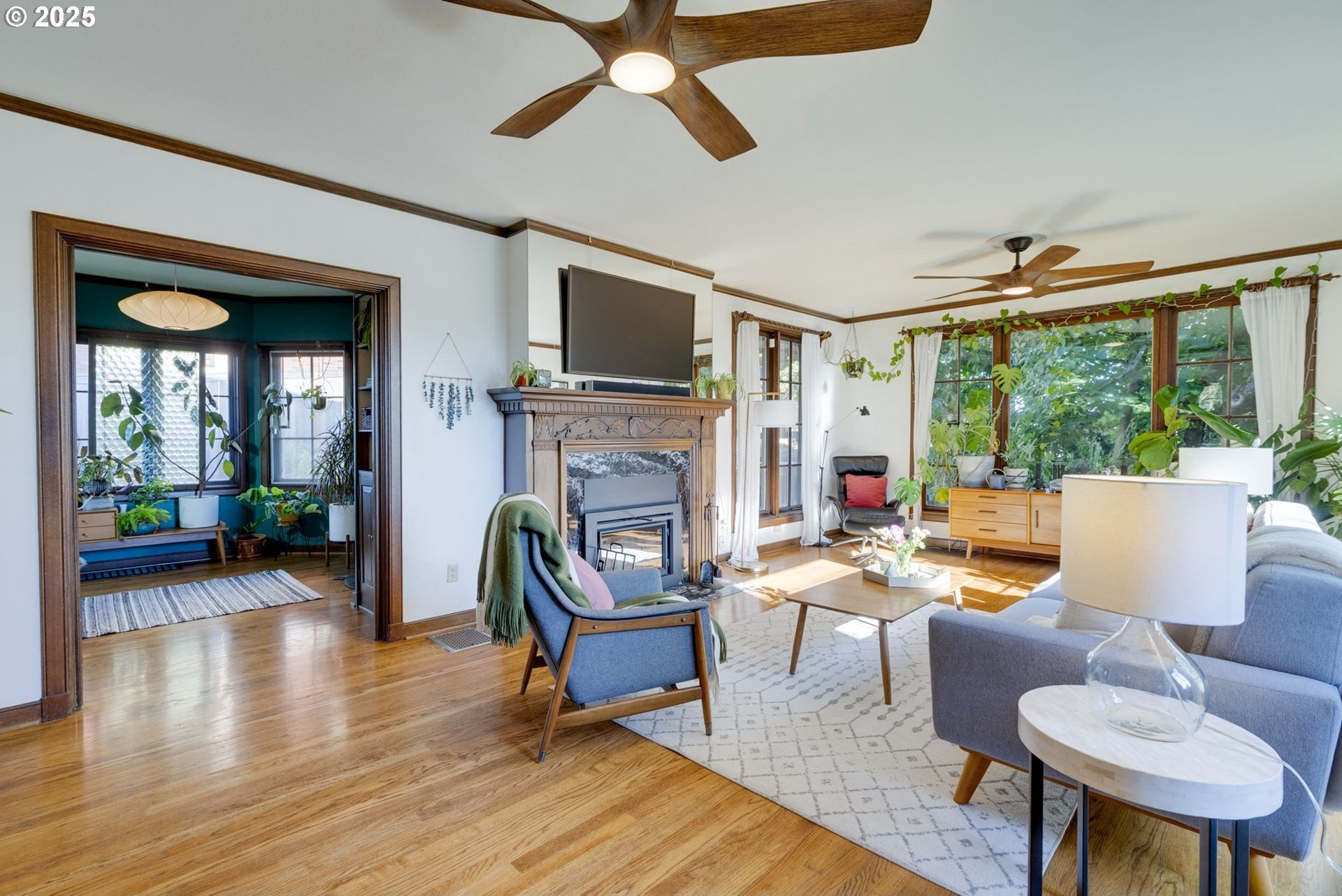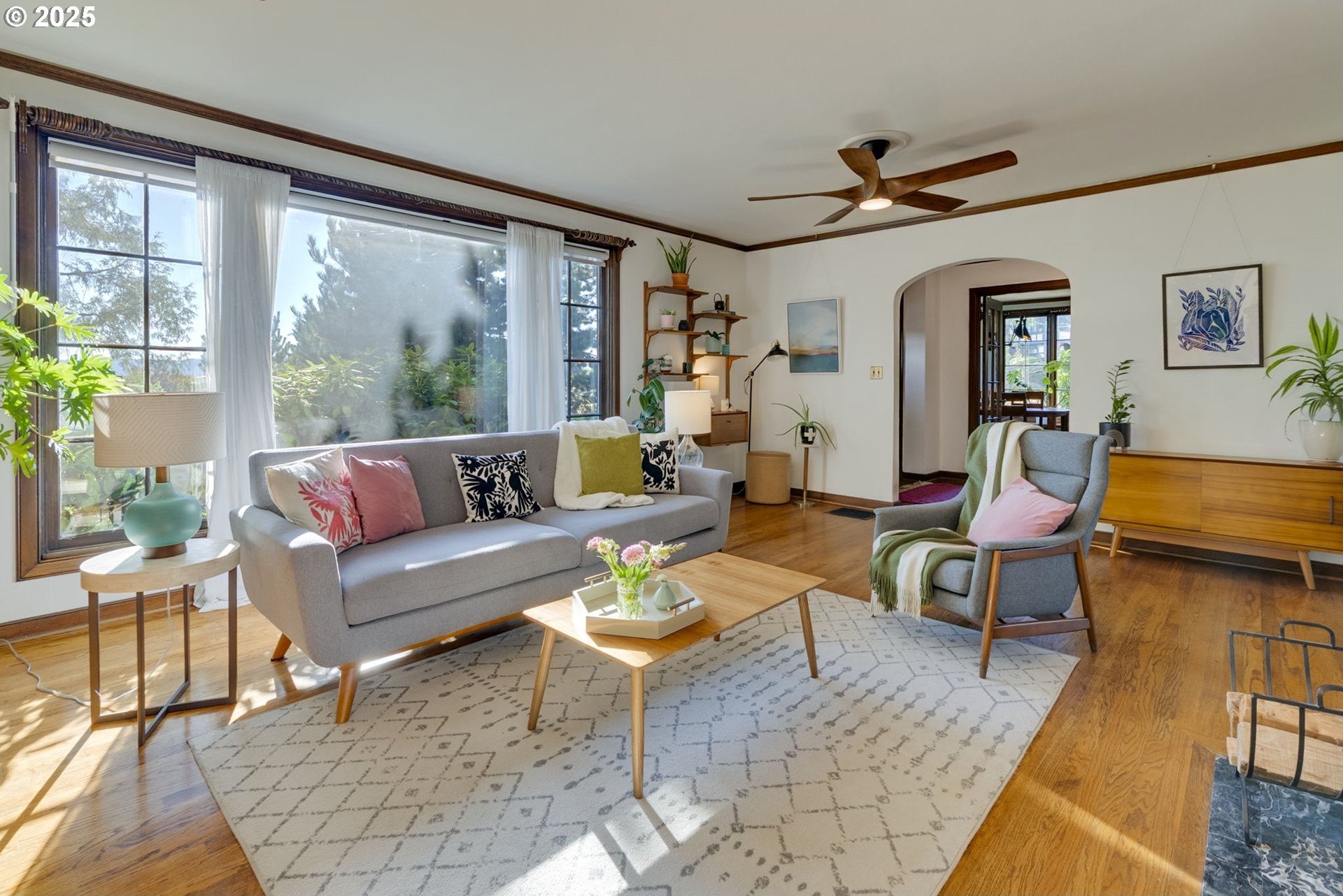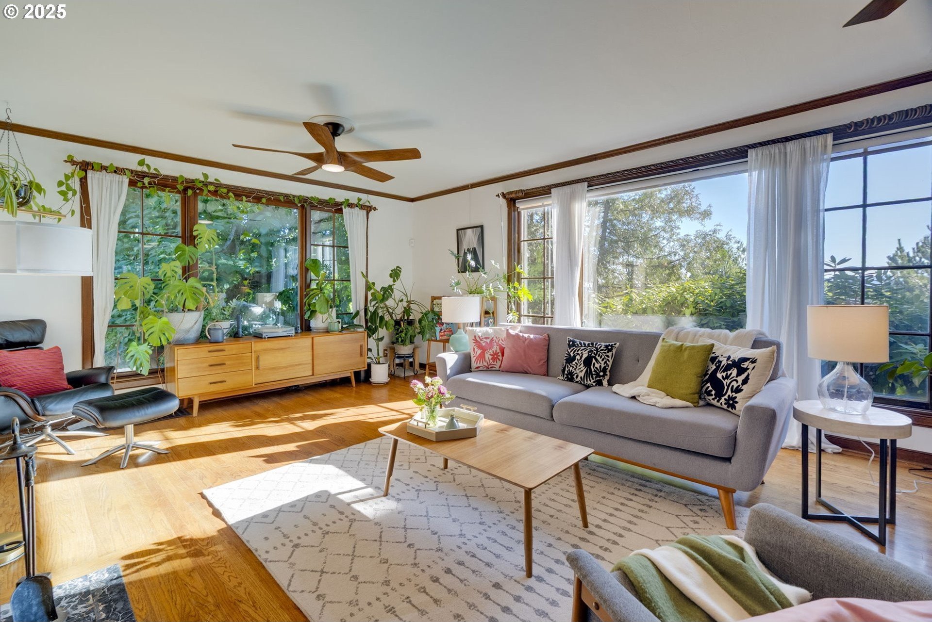 Perched atop the coveted Alameda Ridge, this timeless Tudor captures sweeping views of downtown Portland and blends classic craftsmanship with inviting living spaces. Rich hardwood floors, natural woodwork, and graceful built-ins fill the home with warmth, while abundant natural light brings every detail to life.The expansive main level is designed for connection—whether hosting elegant dinners in the formal dining room or relaxing in cozy sitting areas. Charming nooks provide perfect spots to curl up with a book or enjoy quiet conversation, while a half bath with retro wallpaper adds a playful touch of personality.Upstairs, three spacious bedrooms await, including a serene primary suite with an adjoining office or den—ideal for working from home, creating a private retreat (or adding a walk-in closet). The lower level includes a bonus living room and attached garage access, with plenty of potential for a home gym, or future expansion.Outdoors, a covered patio offer a year-round sanctuary, while a deck above the garage provides a tranquil perch for morning coffee or sunset views. Set within the boundaries of Portland’s sought-after schools, this home offers the perfect balance of location, lifestyle, and timeless charm.This is more than a home—it’s a rare opportunity to enjoy the unmatched views, charm, and community of one of Portland’s most beloved neighborhoods. [Home Energy Score = 3. HES Report at https://rpt.greenbuildingregistry.com/hes/OR10017719]