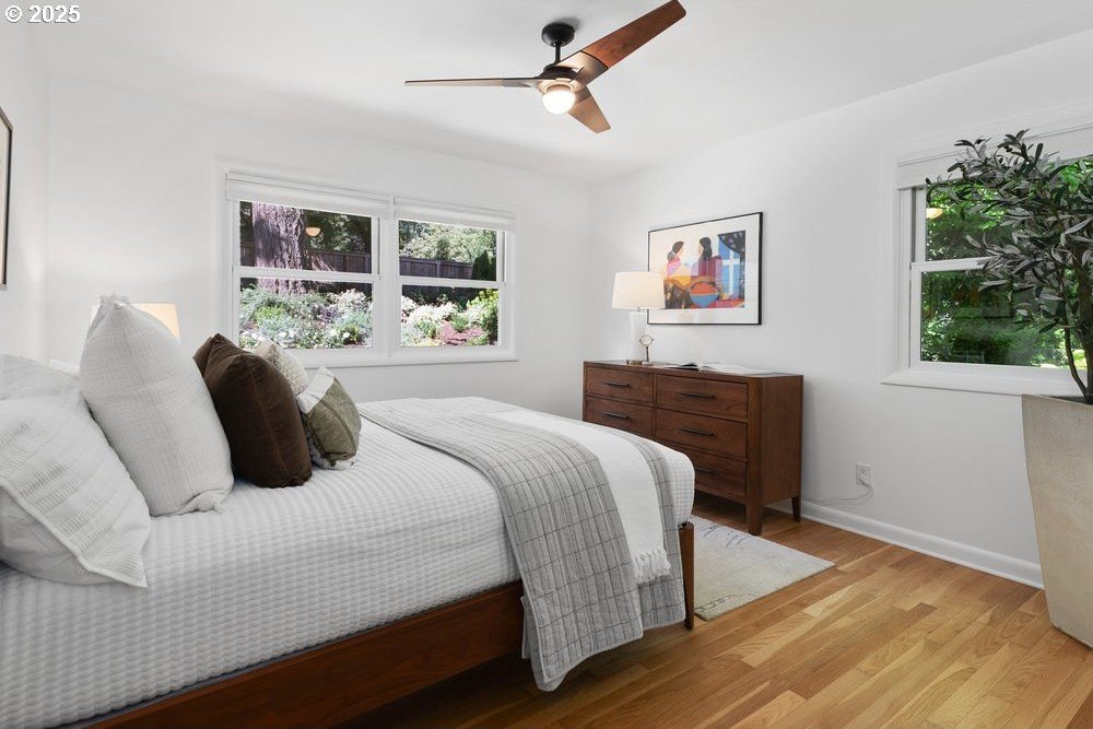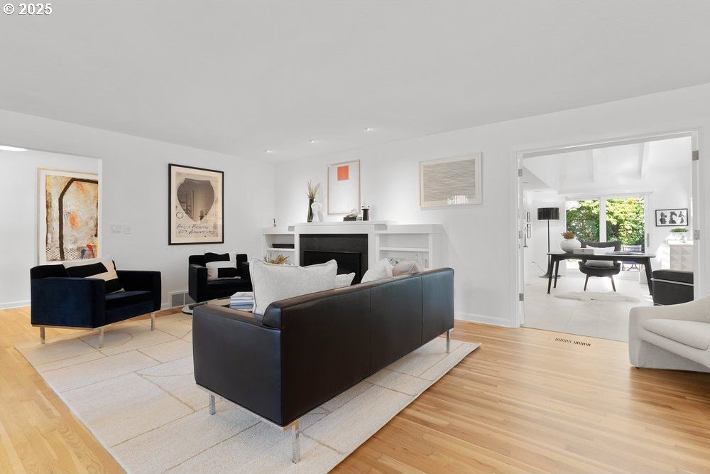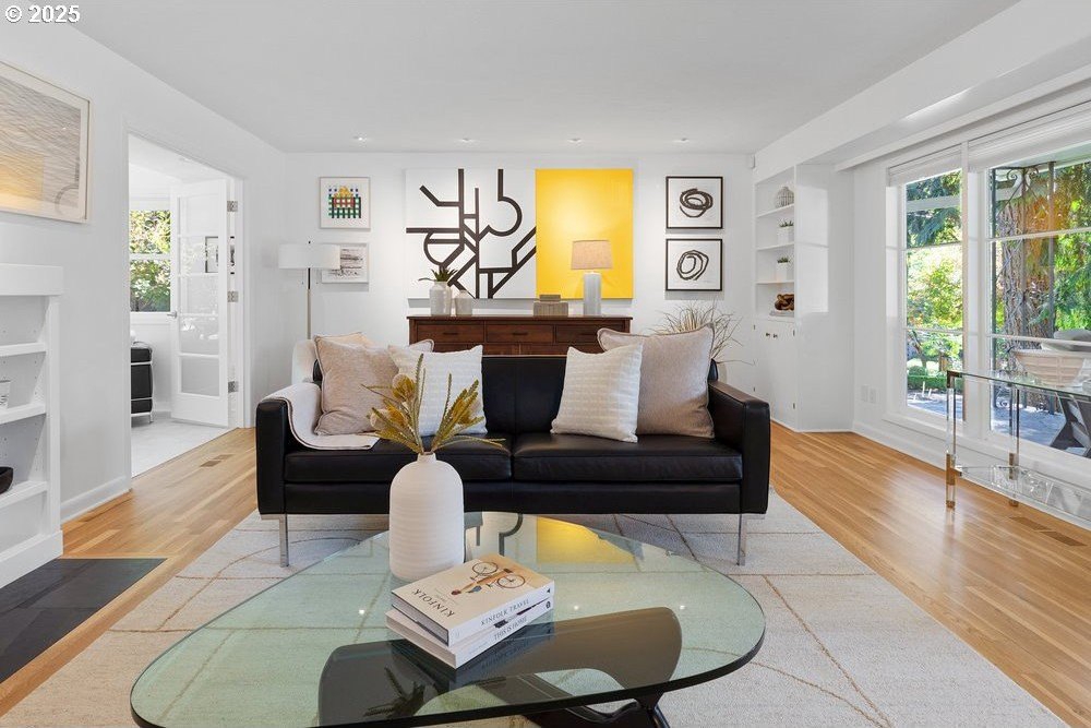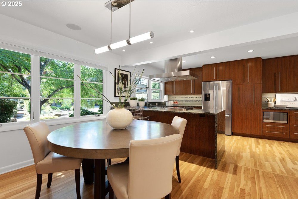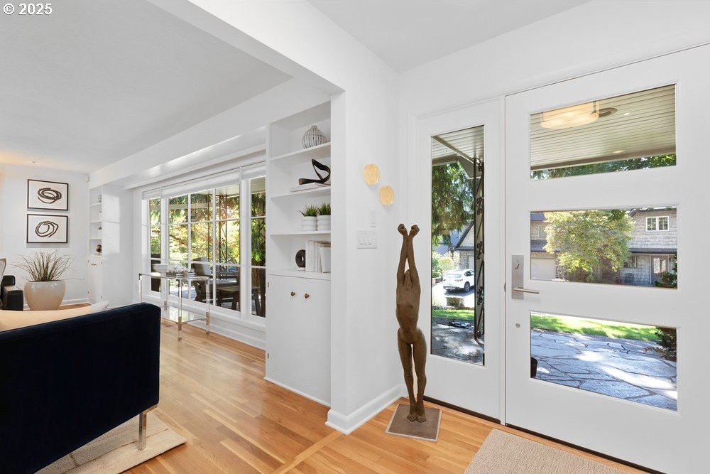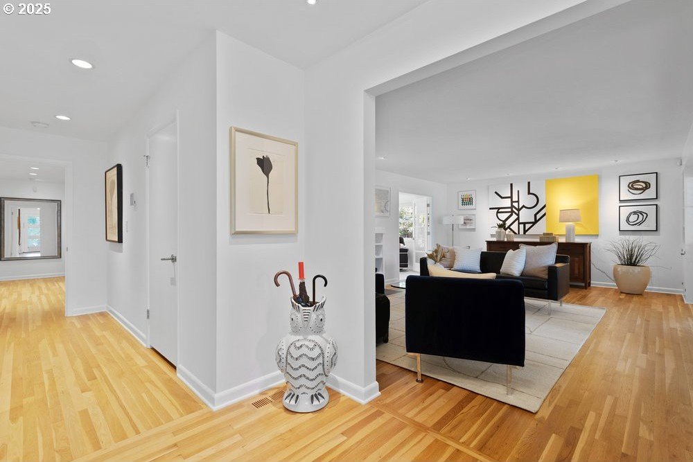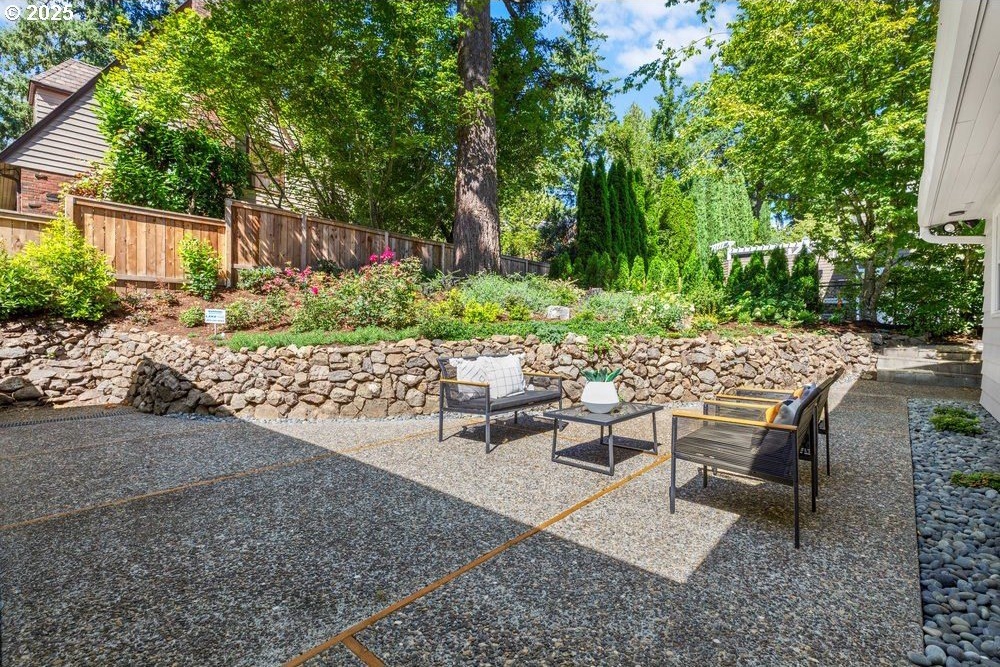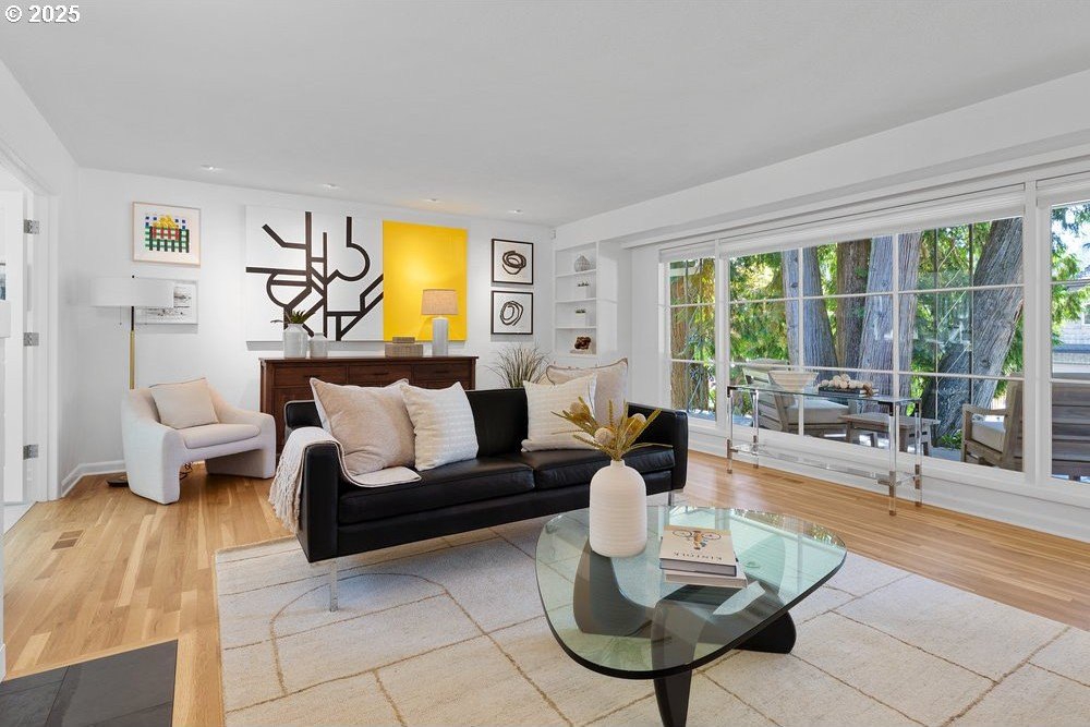 Fashionably Modernized Mid-Century, Remodeled to Perfection in the Lakewood neighborhood near Downtown Lake Oswego! This remarkable TRUE main-level living home sits on a large, private corner lot just steps from lake easement access, charming shops, restaurants, the river, and local parks including George Rogers Park. Nestled on a quiet, highly coveted street of multi-million dollar homes, this home showcases the highest quality craftsmanship, clean lines, exquisite materials, and warm, inviting design throughout.The main floor was meticulously repainted, beautifully refinished hardwood floors, updated cabinetry, and a stunning new powder room featuring Ann Sacks tile, a custom vanity, new faucet, and designer lighting. Enjoy the newly installed tile flooring in the sunroom, and new hardwoods in the TV/media room. The home also features fresh Hunter Douglas window coverings and elegant Rejuvenation light fixtures throughout—including the dining room and all bathrooms.New Bosch refrigerator and dishwasher (April 2025), new front door with side panel, and updated main floor laundry room. Exterior painted in 2023 and refreshed landscaping by Aurora Landscaping (May 2025) adds to the incredible curb appeal.Two patios, walking paths, mature custom-designed gardens, and a welcoming flagstone front porch create outdoor living at its finest. The lower level offers exciting possibilities for future expansion or additional living space. A rare and timeless opportunity in one of Lake Oswego’s most desirable neighborhoods. Rights to three easements include North Lake Club, South View Club and Lakewood Yacht Club. Recently Seismically Upgraded.