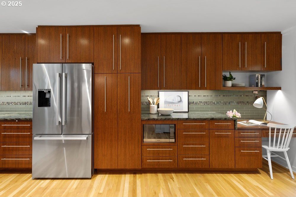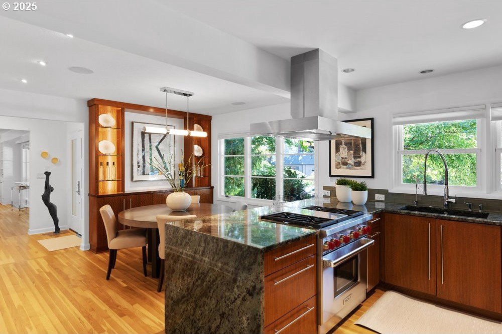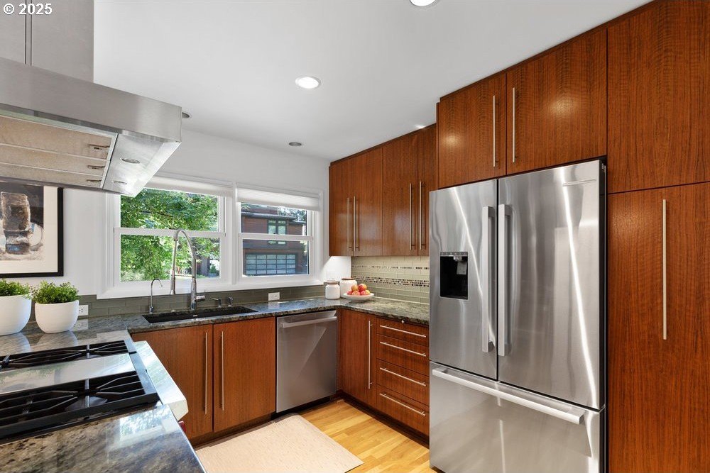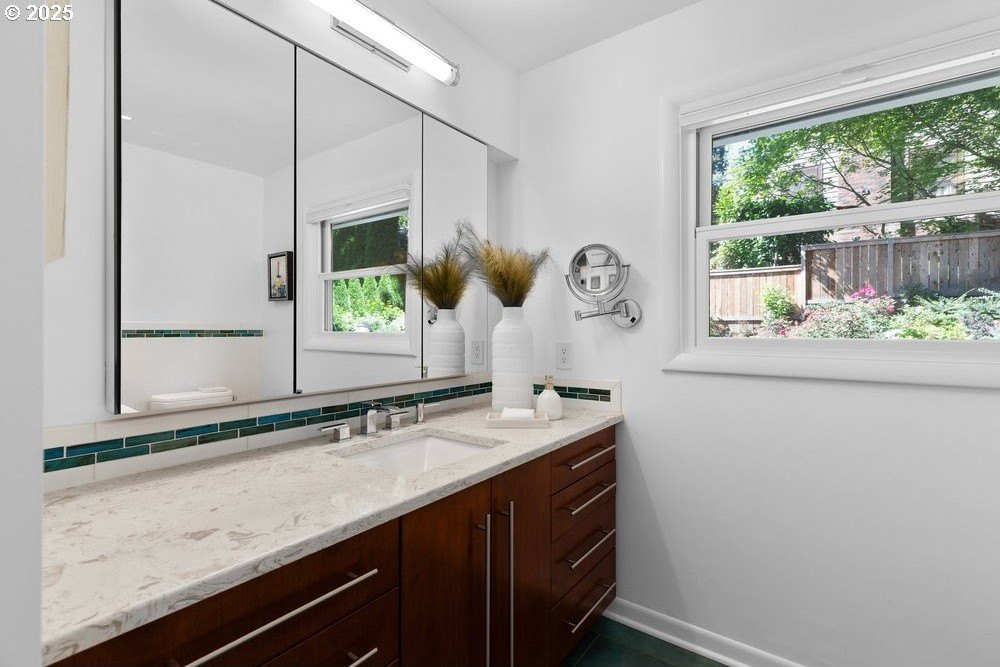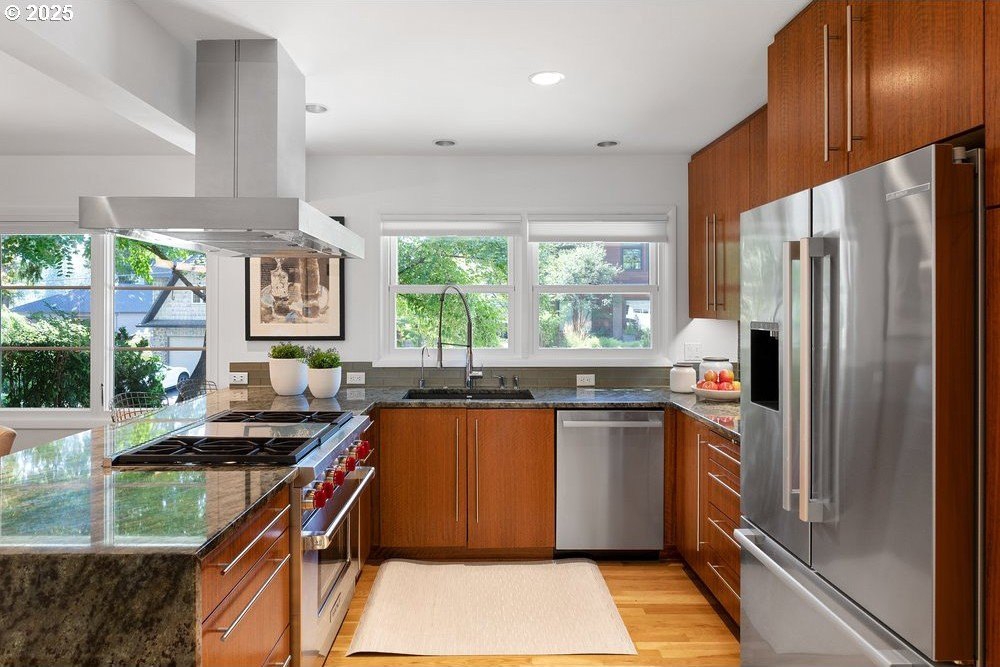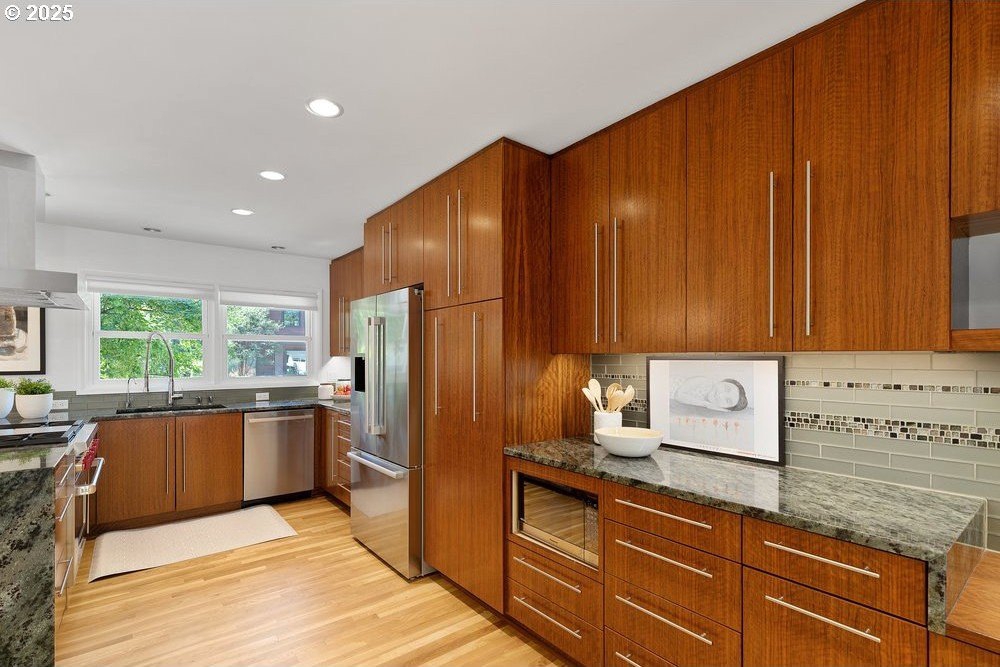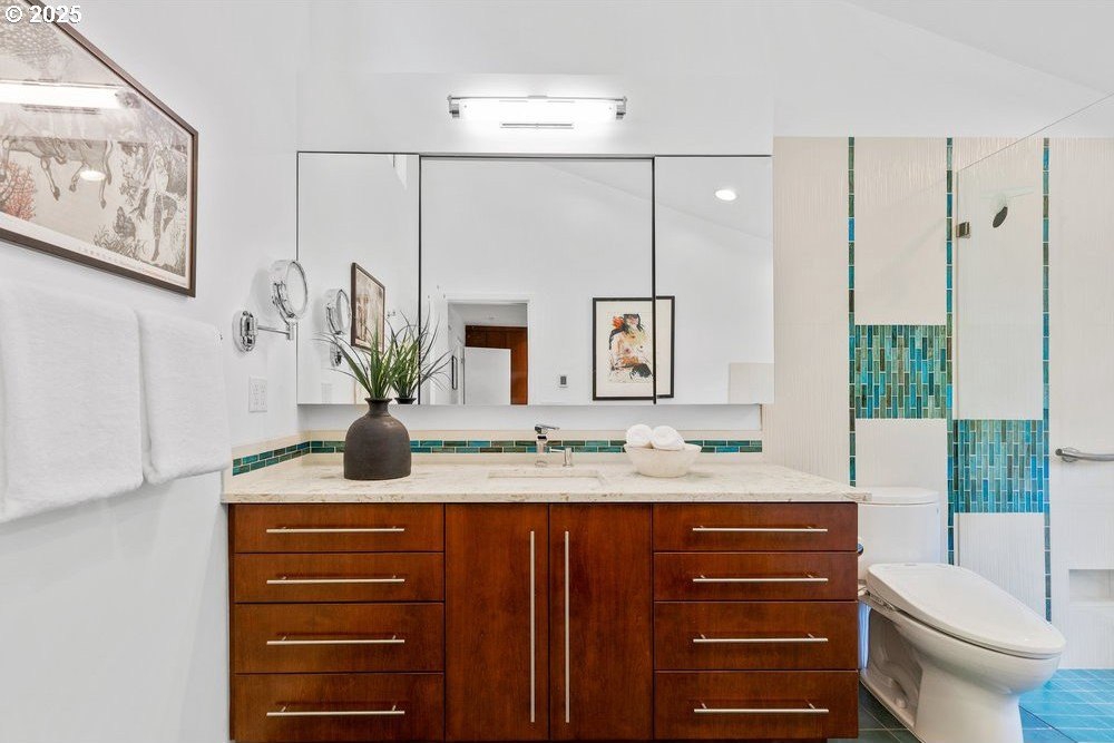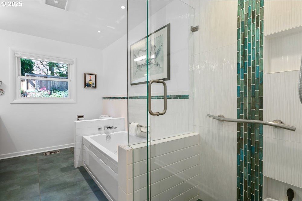 Fashionably Modernized Mid-Century, Remodeled to Perfection in the Lakewood neighborhood near Downtown Lake Oswego! This remarkable TRUE main-level living home sits on a large, private corner lot just steps from lake easement access, charming shops, restaurants, the river, and local parks including George Rogers Park. Nestled on a quiet, highly coveted street of multi-million dollar homes, this home showcases the highest quality craftsmanship, clean lines, exquisite materials, and warm, inviting design throughout.The main floor was meticulously repainted, beautifully refinished hardwood floors, updated cabinetry, and a stunning new powder room featuring Ann Sacks tile, a custom vanity, new faucet, and designer lighting. Enjoy the newly installed tile flooring in the sunroom, and new hardwoods in the TV/media room. The home also features fresh Hunter Douglas window coverings and elegant Rejuvenation light fixtures throughout—including the dining room and all bathrooms.New Bosch refrigerator and dishwasher (April 2025), new front door with side panel, and updated main floor laundry room. Exterior painted in 2023 and refreshed landscaping by Aurora Landscaping (May 2025) adds to the incredible curb appeal.Two patios, walking paths, mature custom-designed gardens, and a welcoming flagstone front porch create outdoor living at its finest. The lower level offers exciting possibilities for future expansion or additional living space. A rare and timeless opportunity in one of Lake Oswego’s most desirable neighborhoods. Rights to three easements include North Lake Club, South View Club and Lakewood Yacht Club. Recently Seismically Upgraded.
