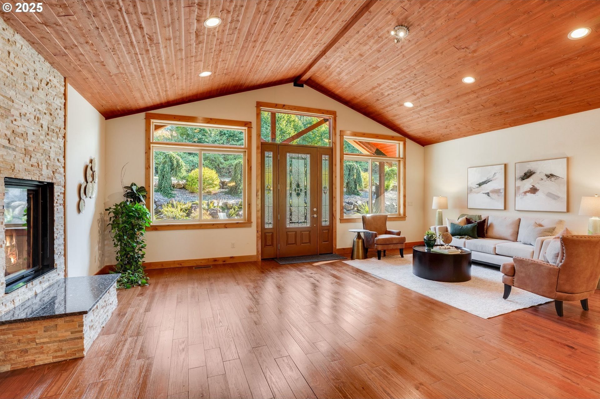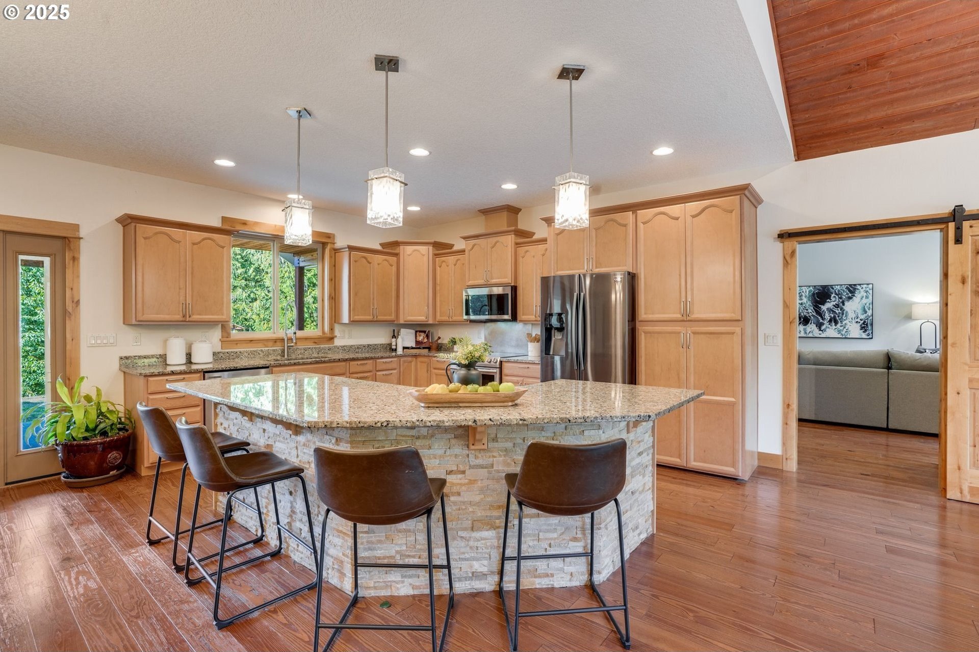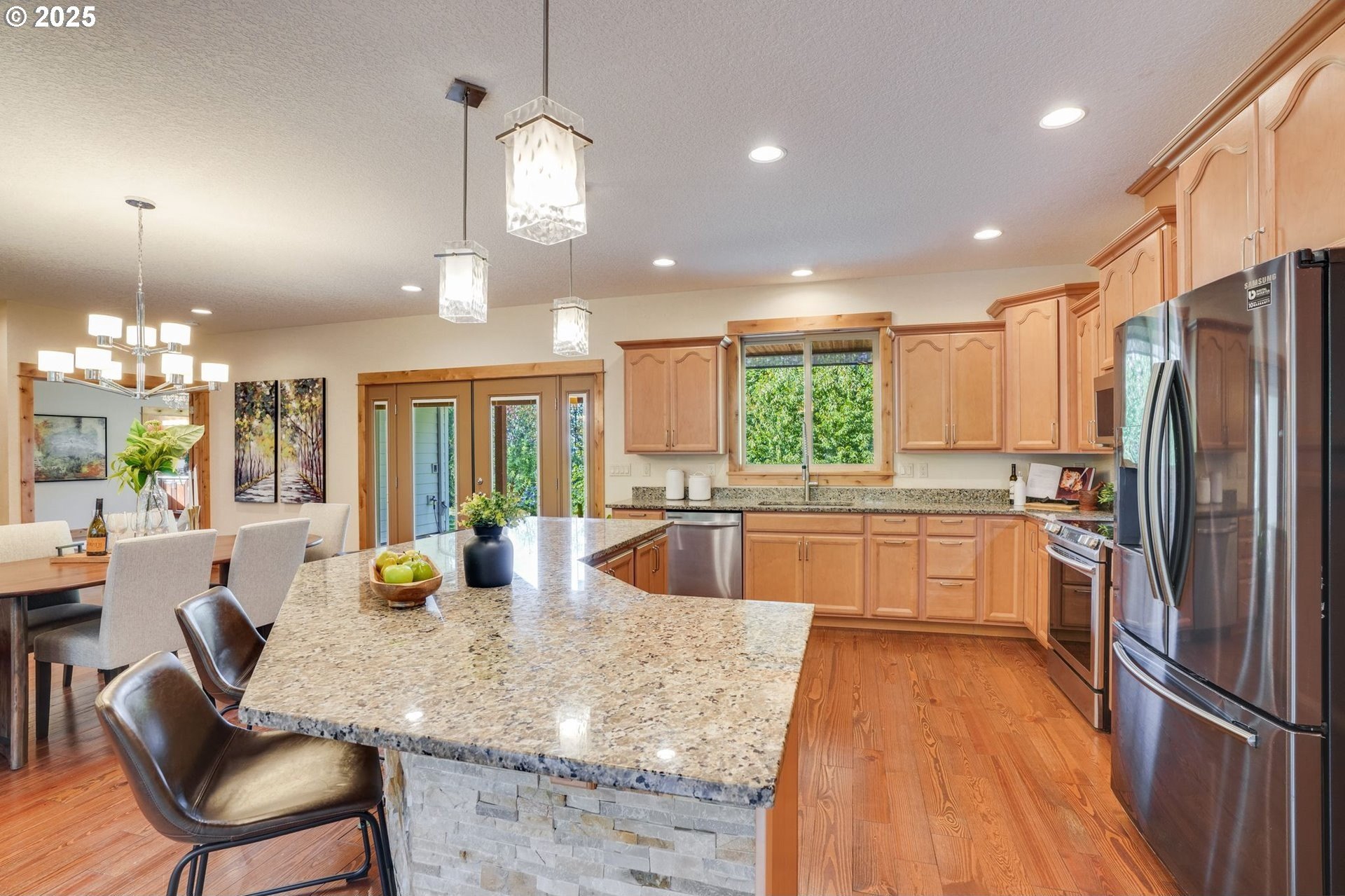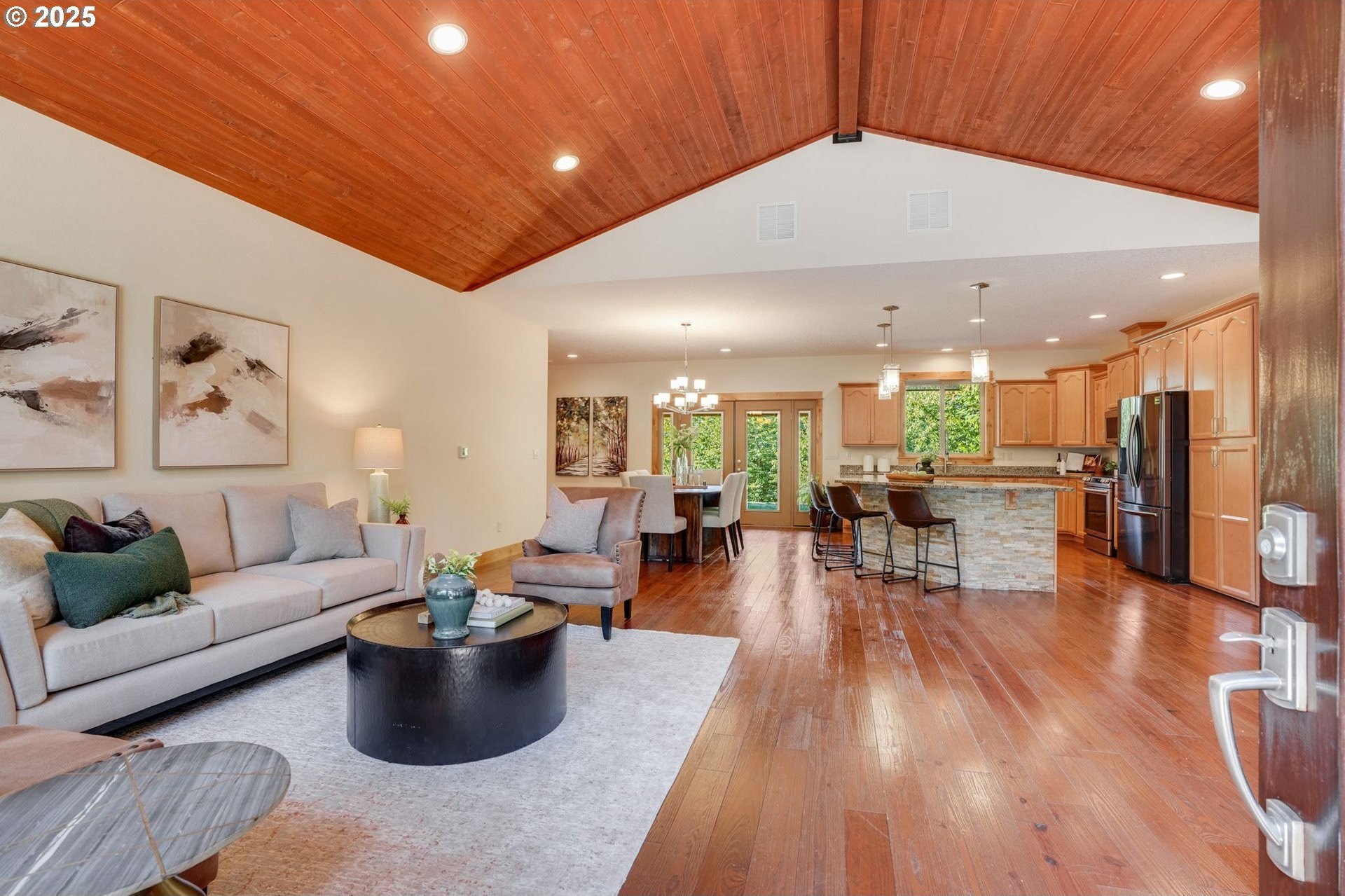 Tucked away on 5.3 private acres in the middle of Estacada, welcome to your centrally located retreat! This custom one-level home offers space, comfort, and practicality. Enjoy your private pond and Currin Creek running through the bottom of the property, along with views of your wooded surroundings. Inside, this home was lovingly prepared for long-term living with wide halls, 3-foot doors, and a smart layout to make daily life feel easy. The kitchen, complete with a large island, granite countertops, and soft close drawers, opens to a large living area with vaulted ceilings and filled with natural light. Imagine entertaining family and friends! The primary bedroom is on one side of the home, complete with en suite bath, walk in closet, and French doors to the back patio. Don't miss the vanity with marble countertops and heated tile floors in the primary bath! The guest room and second bath are located on the other side of the home, giving family or guests a space of their own. Convert the bonus/media room to a third bedroom to suit your needs! Step outside to a covered patio that works for everything from sipping morning coffee, relaxing with friends, and year-round outdoor living! The 40x48 shop includes 200-amp service, 50-amp RV hookup, two 16-foot roll-up doors, and room for ATVs, gear, or your next chapter. Finally, add an attached or detached 900 sq ft ADU (acceptable per Clackamas County). Buyer to do due diligence. If you’ve been looking for privacy, space, and flexibility for your life without giving up town access, this charming home might be for you!