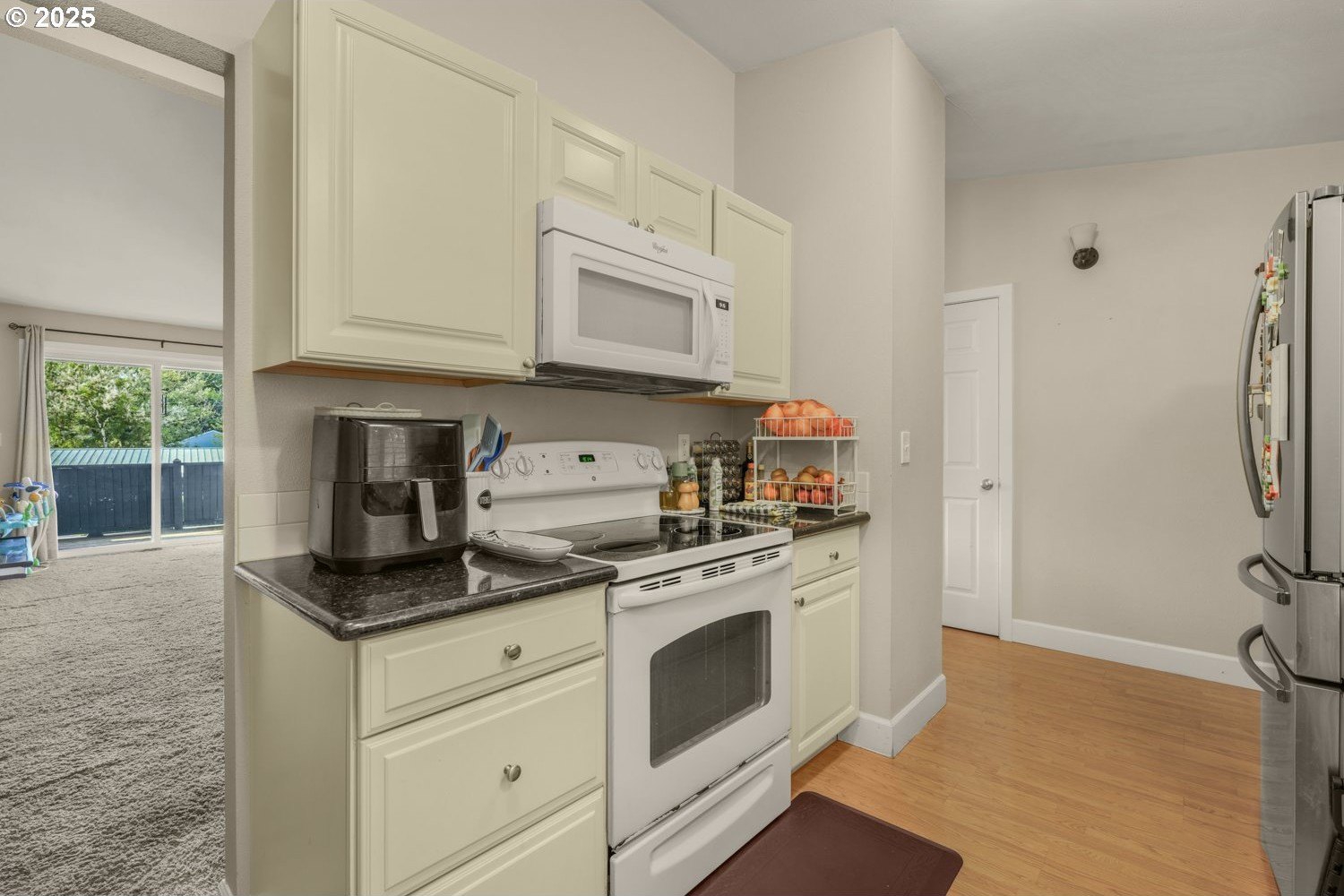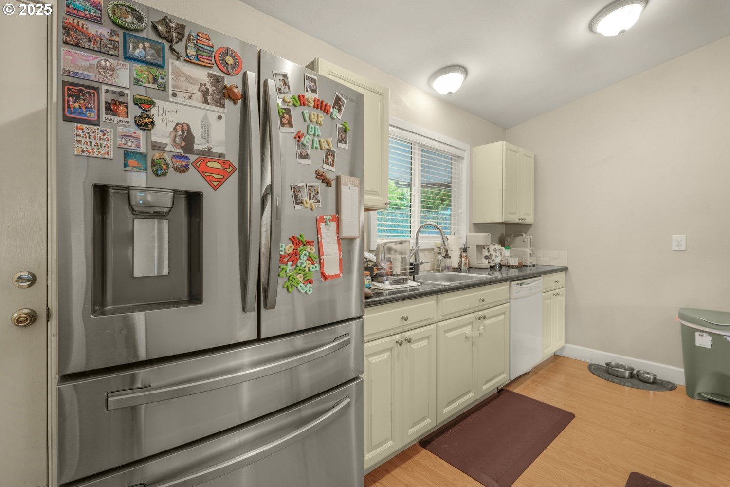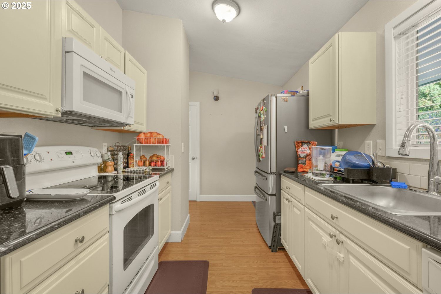 Welcome home to this charming, move in ready single-level 2 bedroom, 1 bath condo. The home features a spacious living room with vaulted ceilings, cozy wood-burning fireplace, and sliding doors leading to your private deck where you can enjoy your morning coffee. The kitchen includes all appliances, freshly painted cabinets, and updated countertops. Both bedrooms also offer vaulted ceilings, adding to the open and airy feel.Convenience is built in with in-unit laundry (washer & dryer included) and storage, including your assigned parking space (#13) and on-site storage unit (#13). HOA dues cover water, sewer, garbage, landscaping, exterior maintenance, plus pool access, making for worry-free living. Enjoy easy access to Hwy 26, Hwy 217, Nike, and Intel, with OHSU and other top-rated schools nearby. Close to restaurants, shopping, parks, and more, this condo offers both comfort and convenience in a fantastic location!