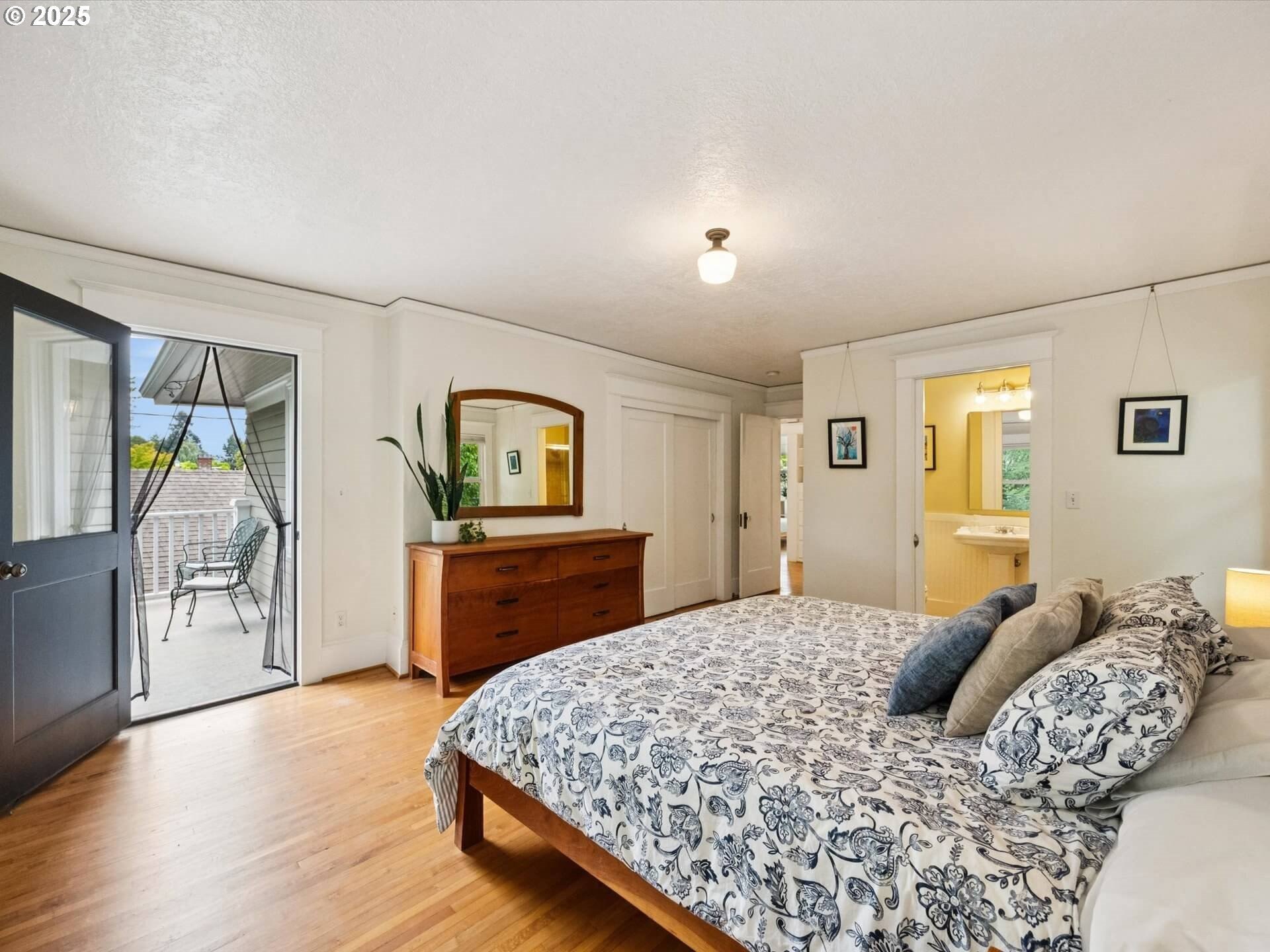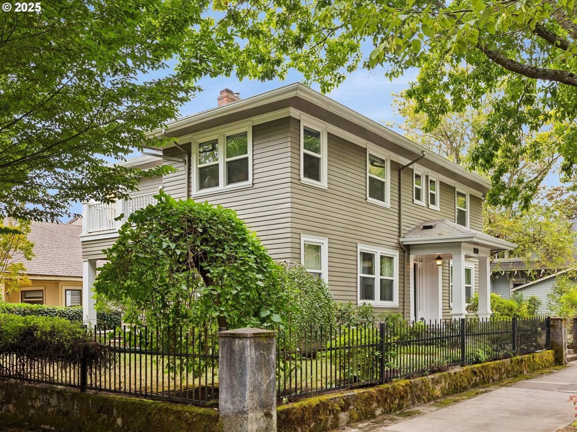 Irvington Opportunity: This early 20th-century American Foursquare offers over 3,200 sq. ft. of timeless character and modern updates in one of Portland’s most sought-after neighborhoods. A gracious formal entry opens to elegant living and dining rooms with bi-fold French doors, hardwood floors, and a fireplace enhanced by contemporary sconces. The spacious kitchen features a large island, gas cooktop, new double ovens, and stainless appliances. Upstairs, four bedrooms and two full baths include a primary ensuite with private balcony. Flexible family room (or 5th bedroom) on the main with private patio, plus a generous basement with exterior access. Double-pane windows, new water main, PEX plumbing, upgraded insulation, and a rare two-car garage complete this exceptional home. [Home Energy Score = 1. HES Report at https://rpt.greenbuildingregistry.com/hes/OR10241612]