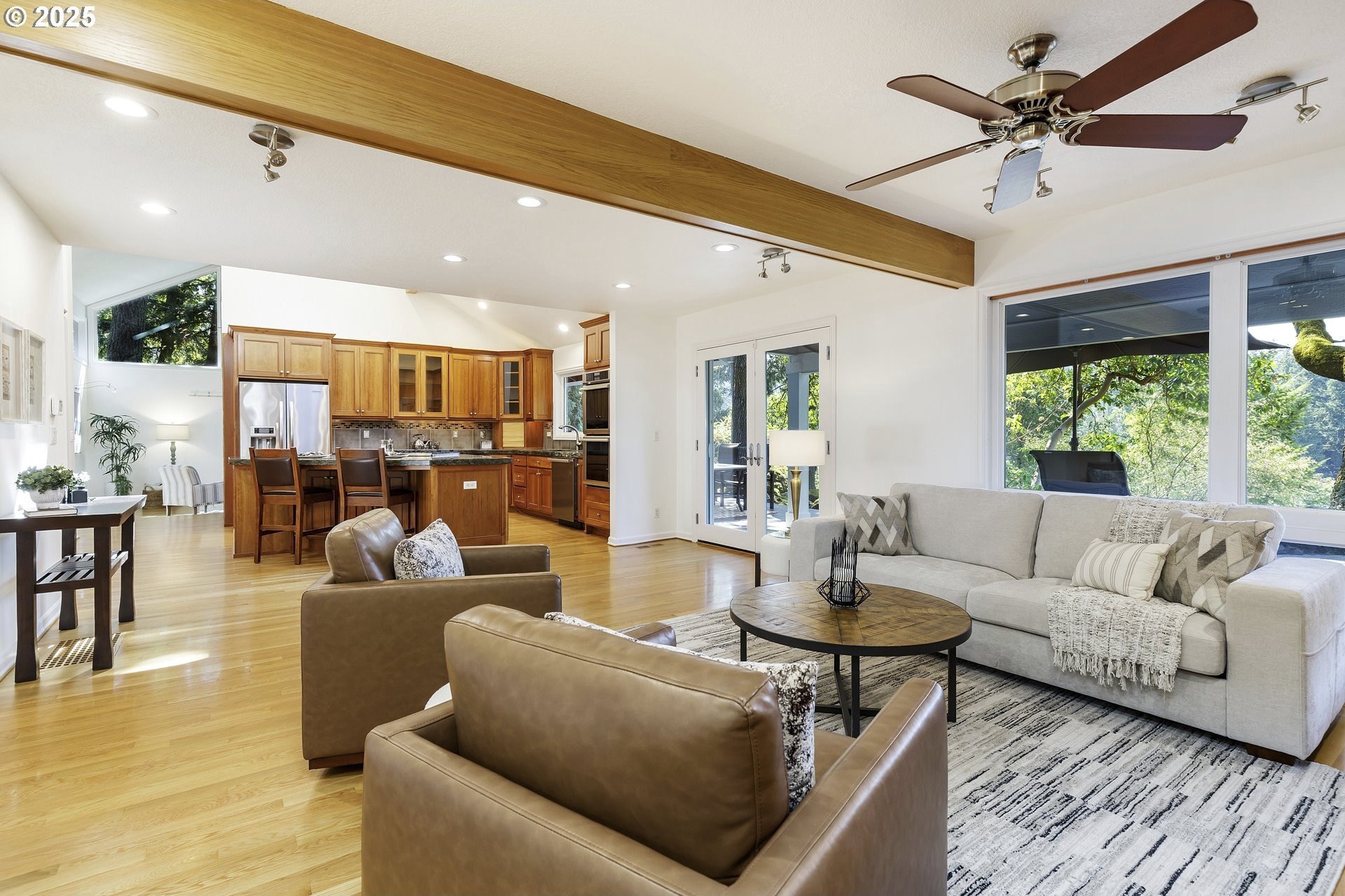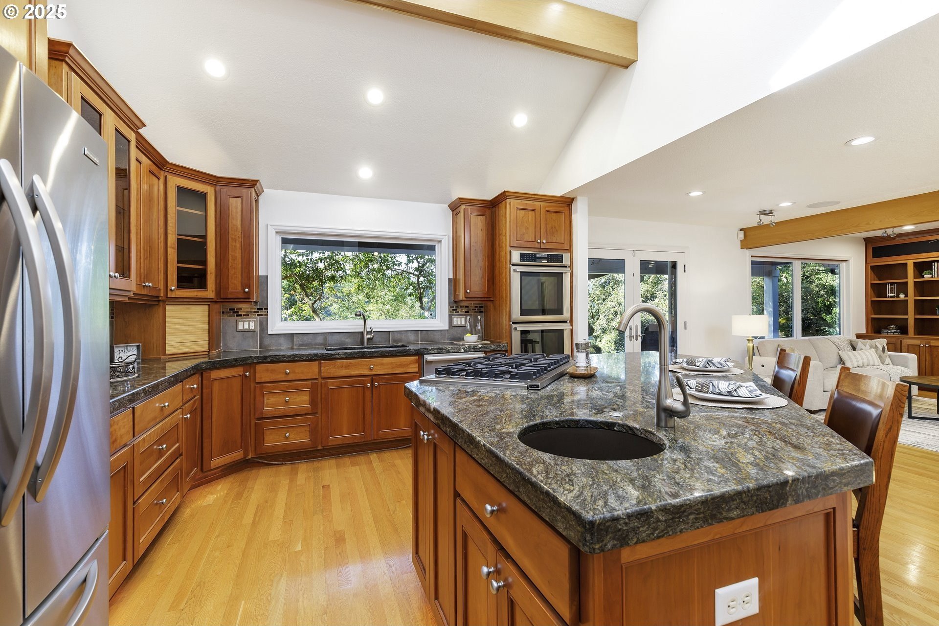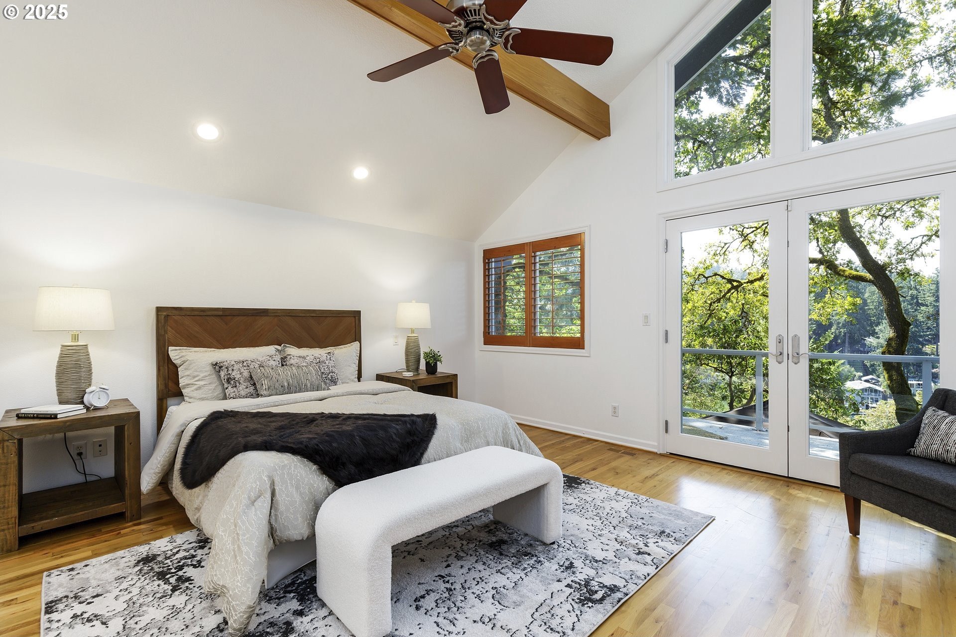 OPEN SAT 9/6 11-2 AND SUN 9/7 12-2. Enjoy serene privacy and breathtaking lake views from this beautifully crafted home, ideally located in one of Lake Oswego’s most desirable neighborhoods. Just minutes from downtown Lake Oswego and all that it has to offer including lake front dining, boutique shopping, parks (George Rogers & Foothills Park), theater, LO farmers market and cultural attractions (Lakewood Center for the Arts!). Inside, quality craftsmanship is evident with hardwood floors throughout all levels and multiple skylights bringing in the natural light. Enjoy a gourmet kitchen with granite countertops, cherry cabinetry, and a butlers pantry. The flexible floor plan includes four bedrooms, with one on the main level complete with a private ensuite bathroom — perfect as a guest suite, or office/den. Upstairs, the primary suite has a private balcony overlooking the lake. All bathrooms have been tastefully remodeled with high-end finishes and California Closets in all upper bedrooms. Other amenities include a tankless water heater and full house generator installed in 2018, a newer HVAC system in 2023, & a 240 volt electric car charger in garage. Great storage in the garage and throughout the home. The professionally landscaped yard is designed for low maintenance. Enjoy the possibility of five swim and boat easements. This is Lake Oswego living at its finest!